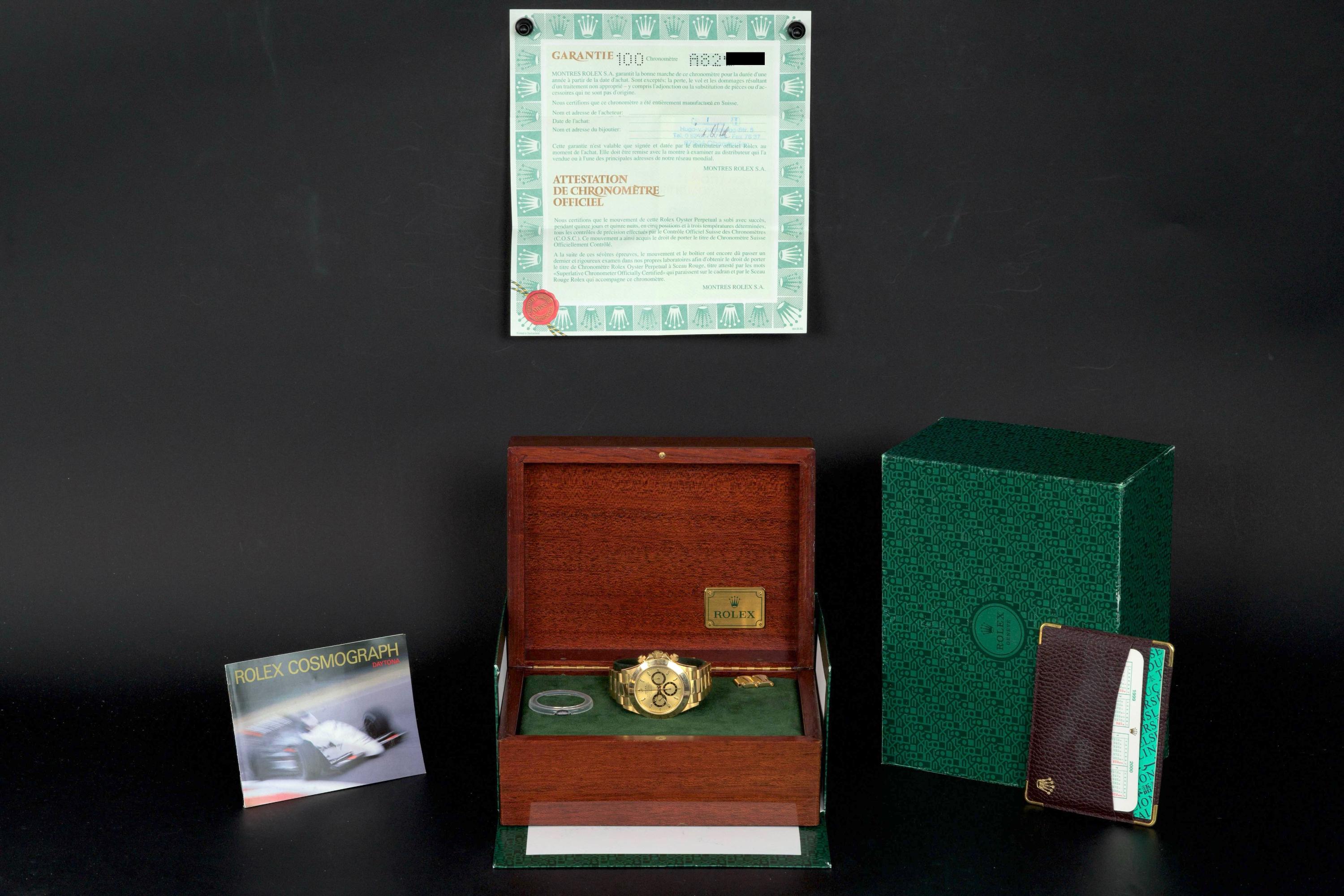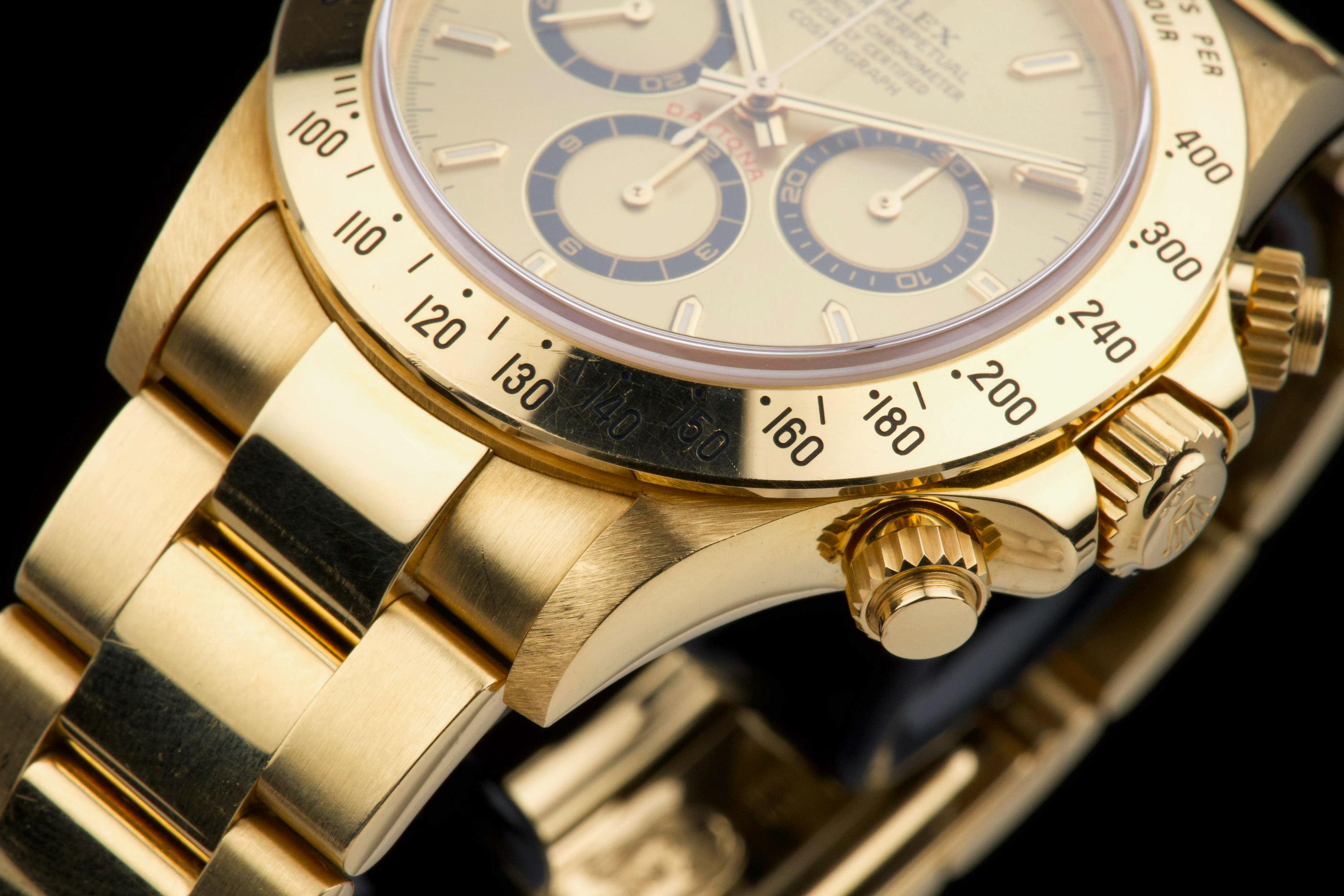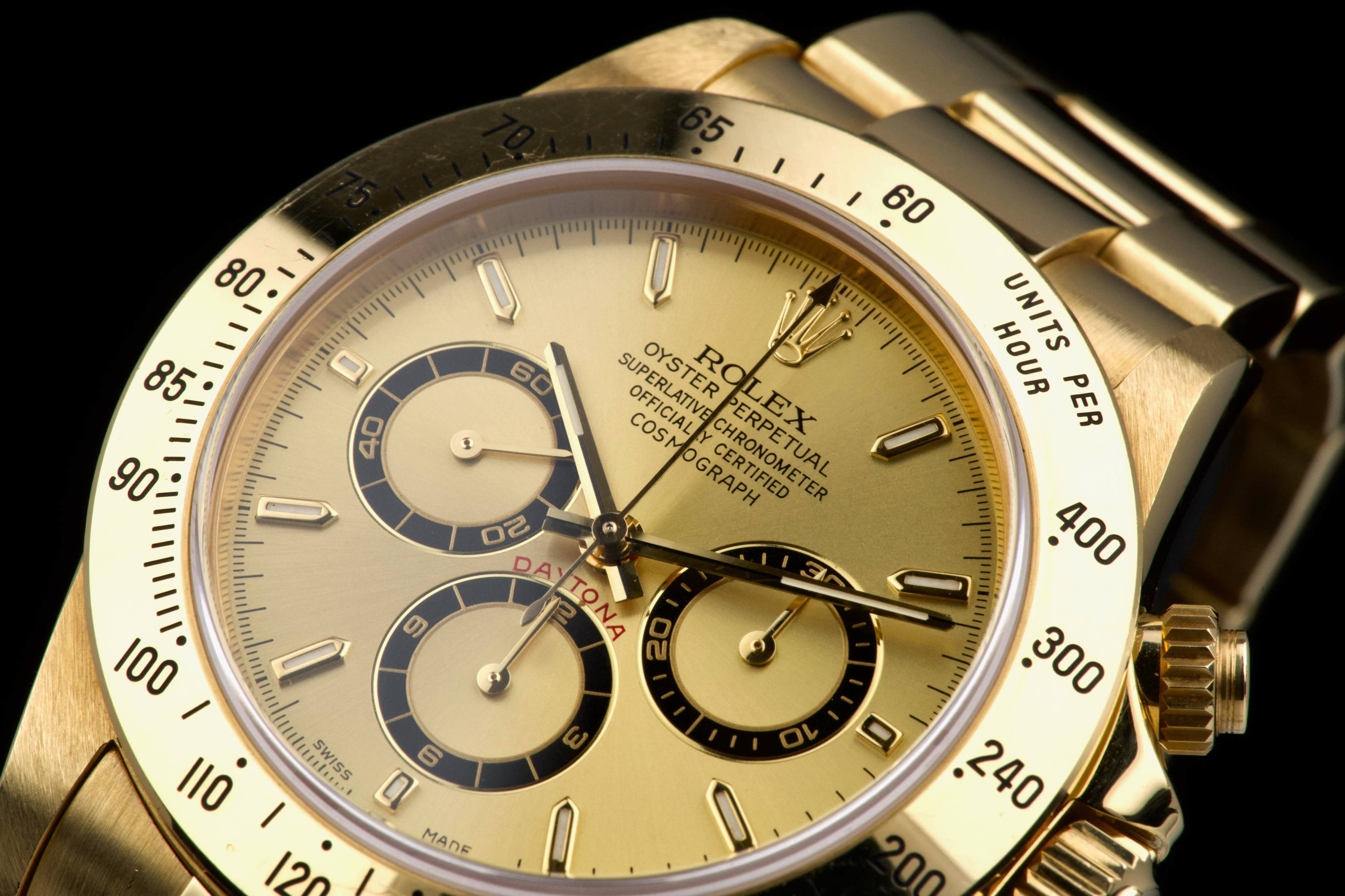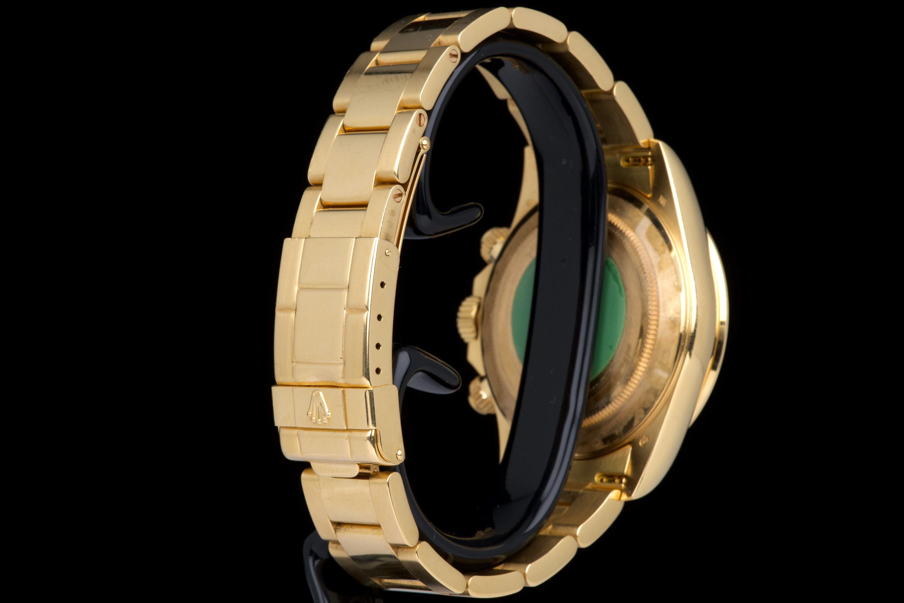 The present Rolex Cosmograph Daytona reference 16528, dating to 2000 and bearing an A-serial, is an exceptional and remarkably well-preserved example offered here as a complete full set. Executed in 18K yellow gold, this watch stands out for its outstanding originality and unpolished condition—attributes that are increasingly rare for Daytonas of this era. The case is unpolished and remains in superb overall condition, showing only minimal signs of wear consistent with careful use. Importantly, the original green Rolex sticker is still present on the caseback, a strong indicator of the watch’s preservation. The bezel is likewise in excellent condition and has never been polished, retaining crisp definition and sharp edges. The watch is fitted with its original champagne luminova dial, preserved in excellent condition, and paired with matching original hands. The harmonious tone of the dial and hands, combined with the warmth of the yellow-gold case, gives the watch a particularly elegant and cohesive appearance. At its heart beats the celebrated Rolex calibre 4030, based on the legendary Zenith El Primero chronograph movement—one of the most respected automatic chronograph calibres ever produced, extensively reworked by Rolex to meet its own exacting standards. The original yellow-gold Oyster bracelet shows no stretch whatsoever, an outstanding and highly desirable feature. The clasp bears the correct code U11, consistent with the production period. While no service history accompanies the watch, it is running correctly at the time of cataloguing. Delivered as a full set, this unpolished Daytona 16528 represents a rare opportunity to acquire a late-production El Primero-powered Daytona in exceptional, near-time-capsule condition, combining strong originality, minimal wear, and complete accessories—an ideal example for the discerning collector.