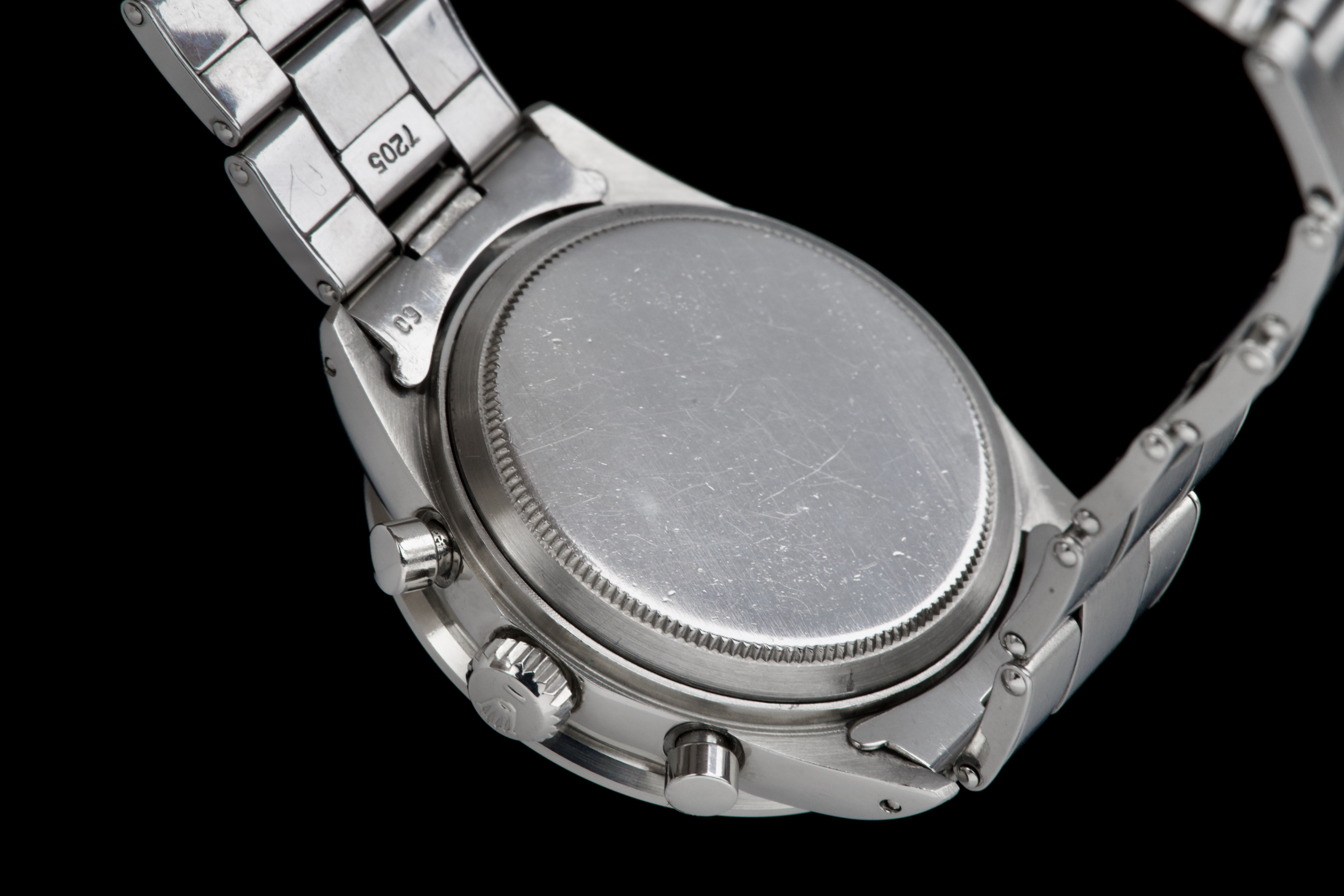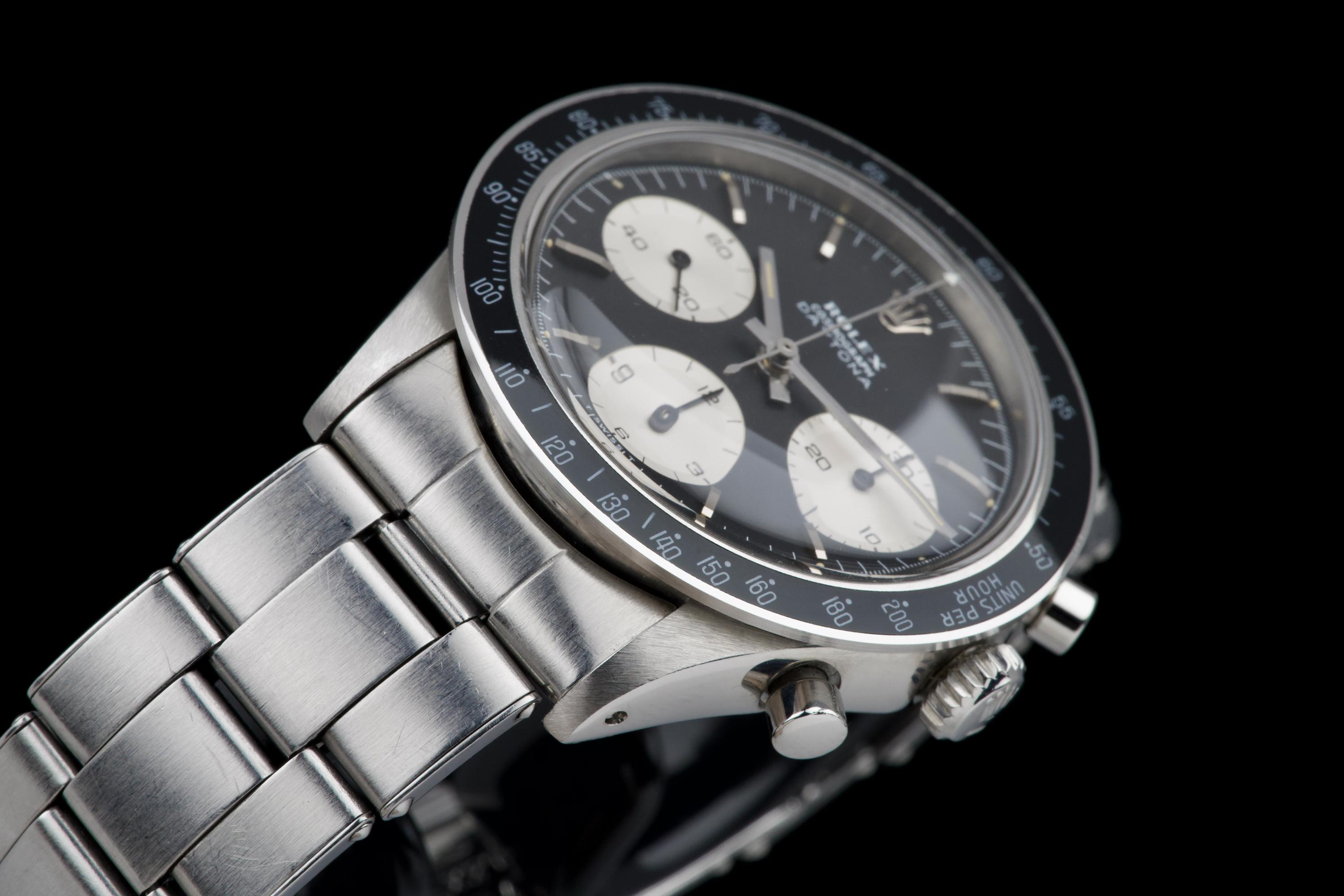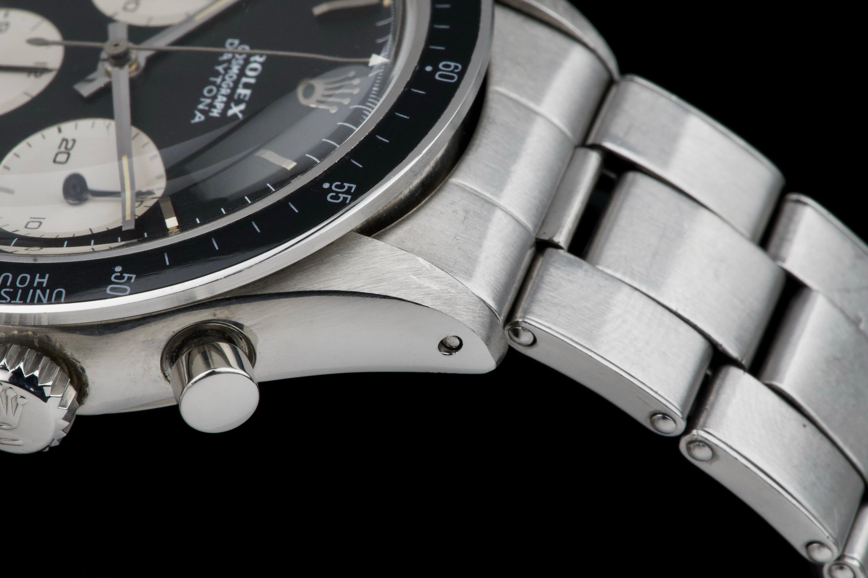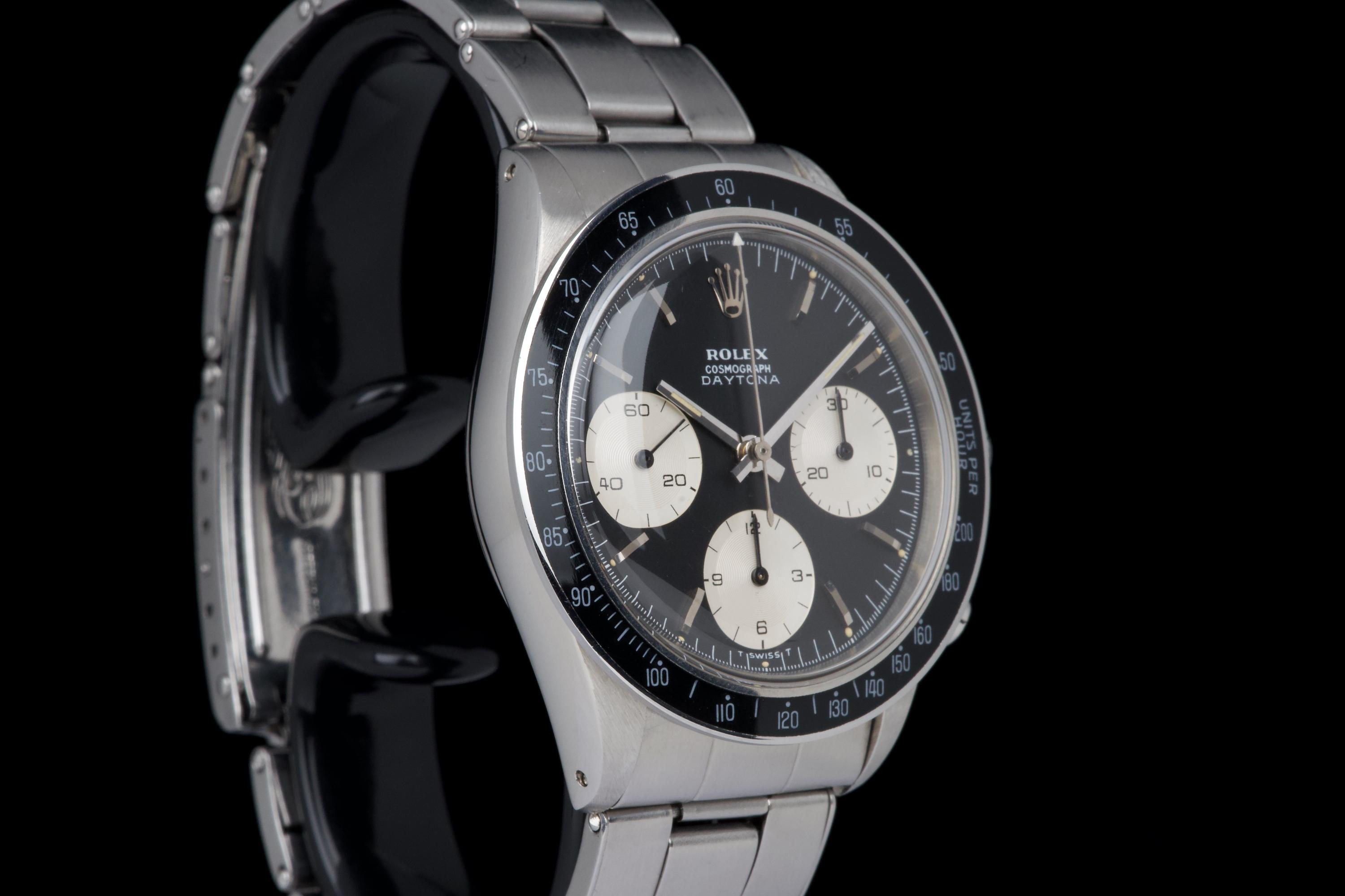An exceptionally well-preserved and extremely rare example of the Rolex Cosmograph Daytona reference 6241, produced in 1968 and fitted with the coveted black “Big Logo” dial. The dial is in remarkable condition, with only a microscopic mark inside the 3 o’clock subdial, visible under magnification but not to the naked eye. The luminous plots at 3 and 9 o’clock are partially missing — a common and reassuring trait for untouched Daytona dials of this era, confirming that the lume has never been redone. The hands are perfectly matching and in superb condition; under UV light, all luminous material (dial and hands) glows briefly and fades uniformly, exactly as correct vintage tritium should. The original Mark 1 bakelite bezel is outstanding — free of cracks, chips, or notable wear, which is extraordinarily rare for a 1960s Daytona. The stainless-steel case is in extraordinary condition, appearing unpolished; if it was ever polished, it was done with extreme restraint. The serial and reference numbers between the lugs are deep, crisp, and perfectly legible, confirming a beautifully preserved case. The caseback is correctly stamped 6241 and displays two Rolex Geneva service engravings, a very positive sign of proper historical maintenance. Inside, the Valjoux-based Rolex caliber 722 is clean, functioning perfectly, and has been checked by our watchmaker. The watch is fitted with a riveted 7205 bracelet with 60 endlinks, showing very minimal stretch for its age. The clasp is stamped 1.67, consistent with the period. We handle many vintage Daytonas, but this example stands out dramatically. Its combination of pump pushers, black non–Paul Newman Big Logo dial, and mint MK1 bakelite bezel makes it one of the most elegant and desirable vintage chronographs ever produced — a reference 6241 in truly remarkable collector condition.