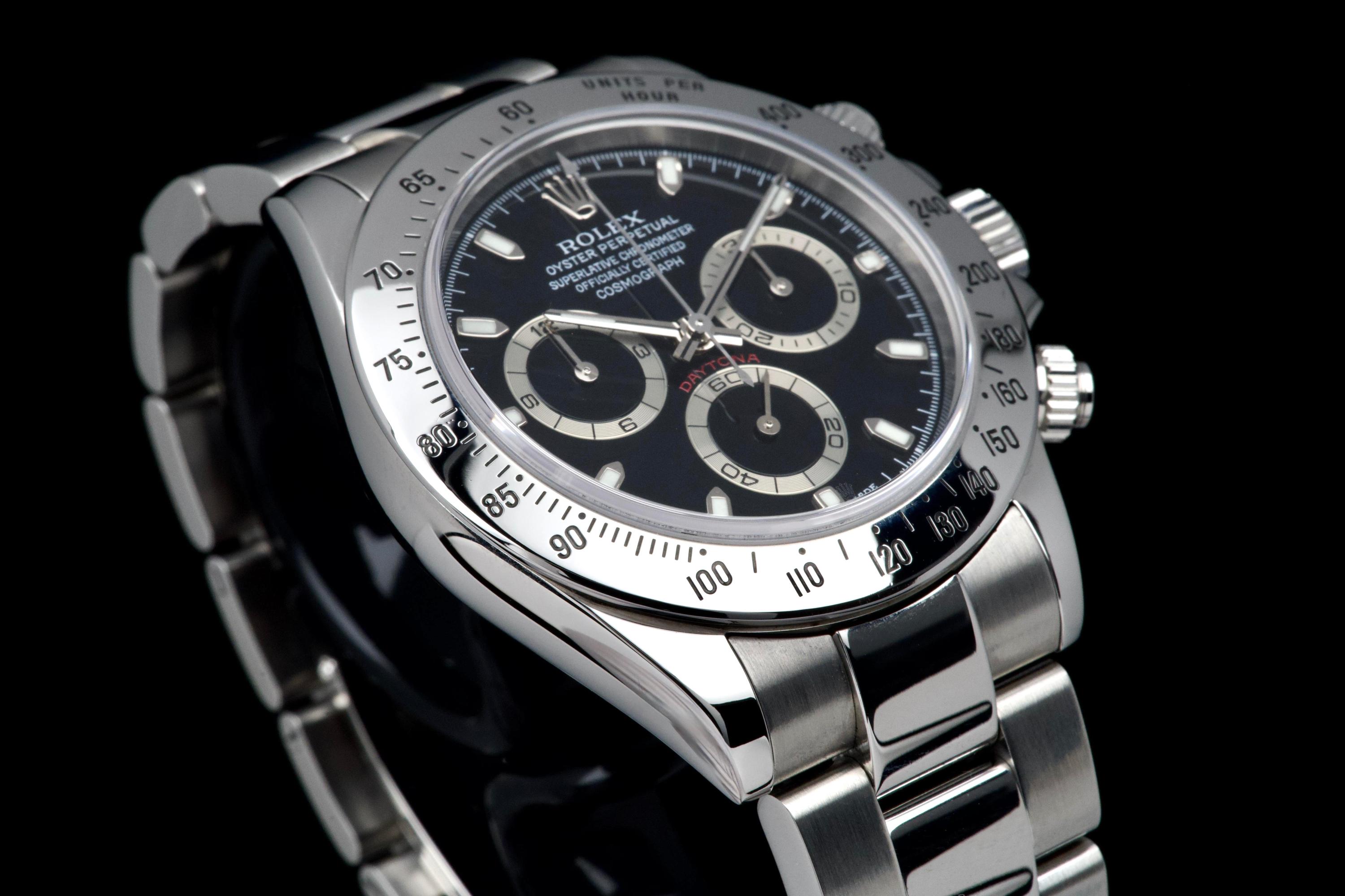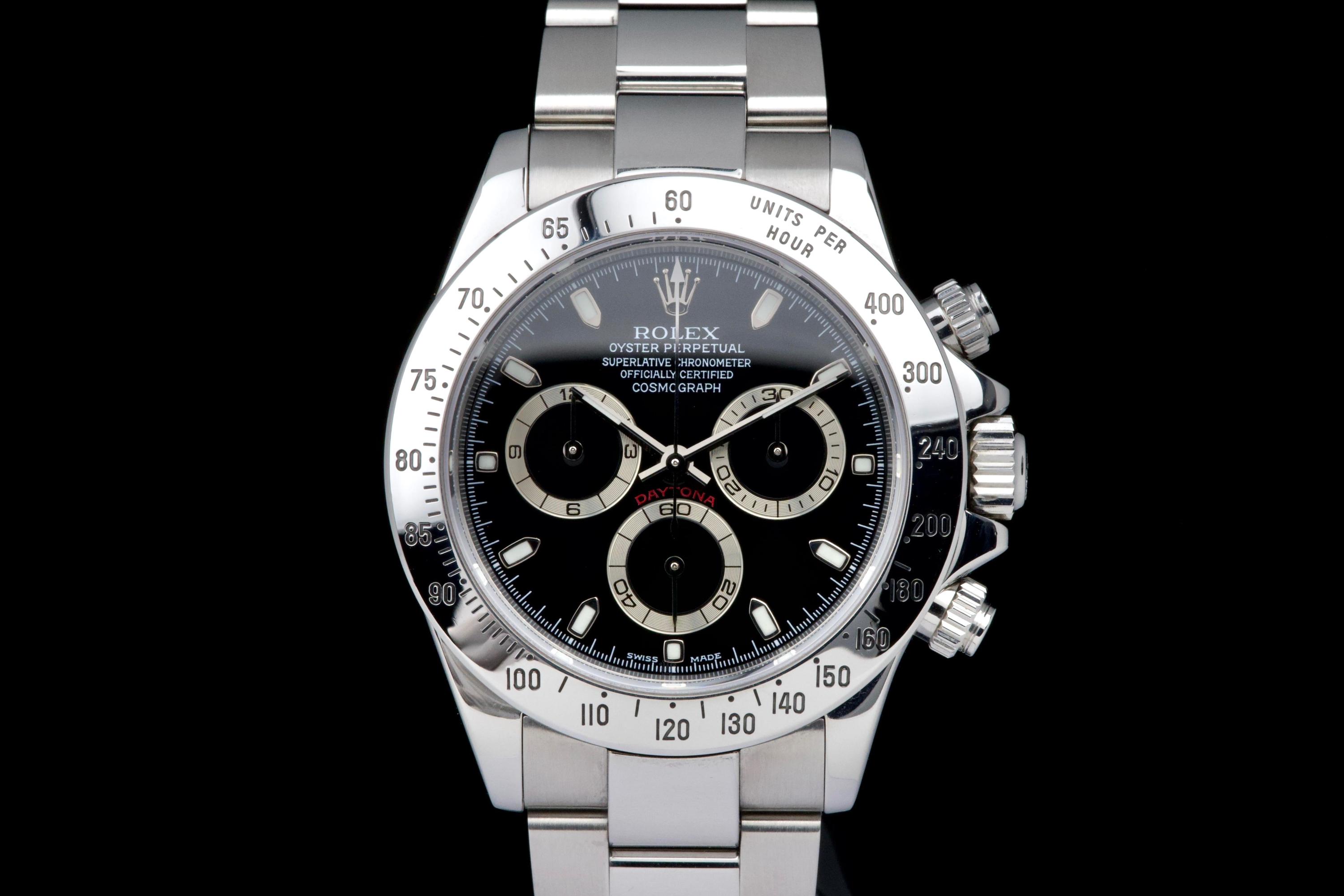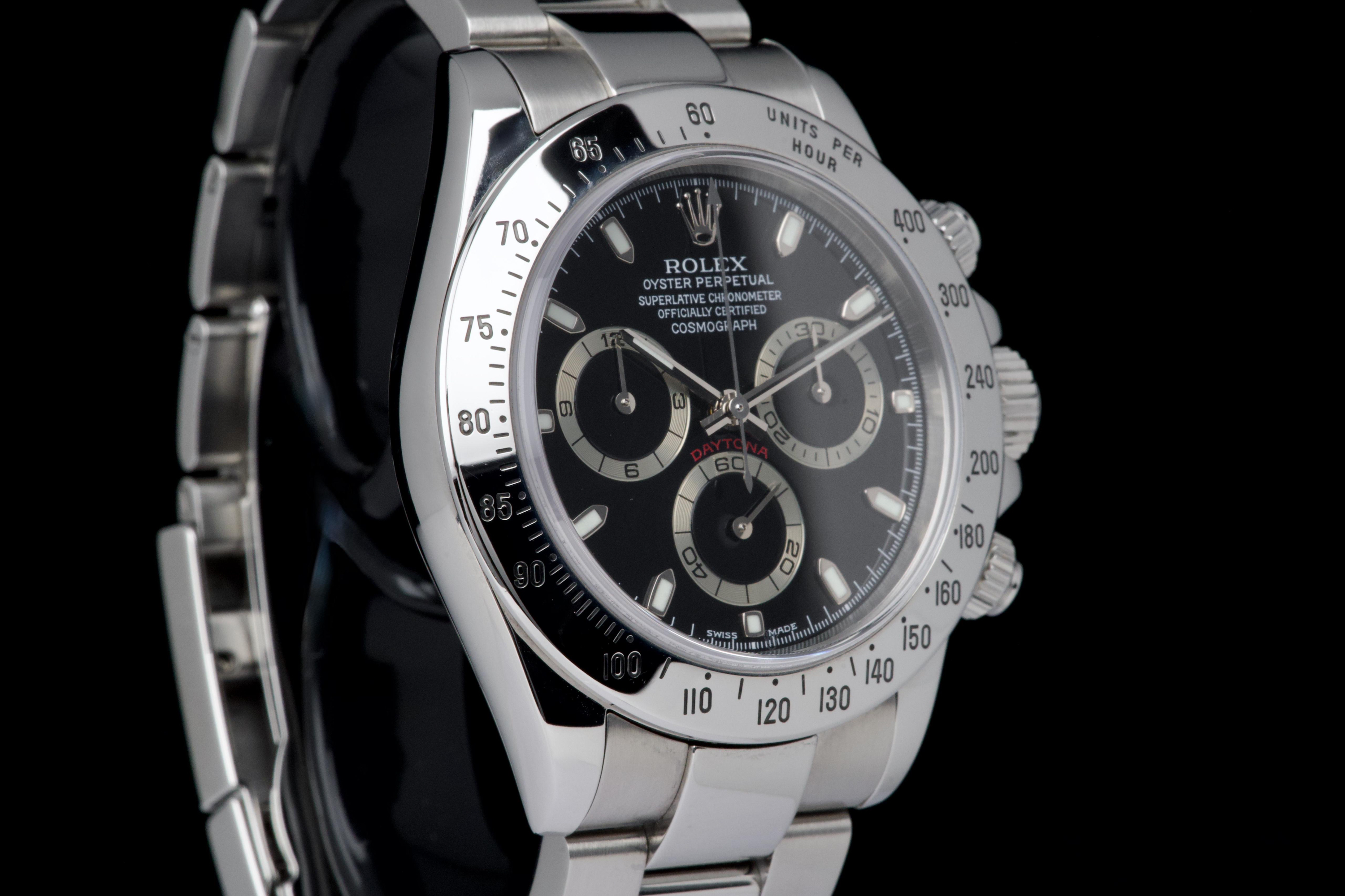 The present Rolex Cosmograph Daytona reference 116520, one of the most emblematic modern chronographs by Rolex, dates to circa 2003 and is offered here as a complete full set. The watch features a 40 mm stainless steel Oyster case with a balanced and sporty profile, combining robustness with timeless design. Its engraved tachymeter bezel and screw-down pushers reinforce the model’s strong racing heritage while ensuring durability and functionality. It is fitted with a black dial featuring contrasting chronograph subdials, offering excellent legibility and a clean, highly recognizable aesthetic. The applied hour markers and luminous hands further enhance visibility in all conditions. Powered by the in-house automatic calibre 4130, the watch delivers outstanding chronometric performance, known for its reliability, robustness, and efficient architecture, with an approximate power reserve of 72 hours. The watch has recently been serviced and polished by our watchmaker and is presented in very good overall condition, showing a clean and refreshed appearance. Offered with its full original set including box, warranty papers, and accessories, this Daytona 116520 represents an excellent opportunity to acquire a highly sought-after Rolex chronograph, combining iconic design, everyday usability, and strong collector appeal.