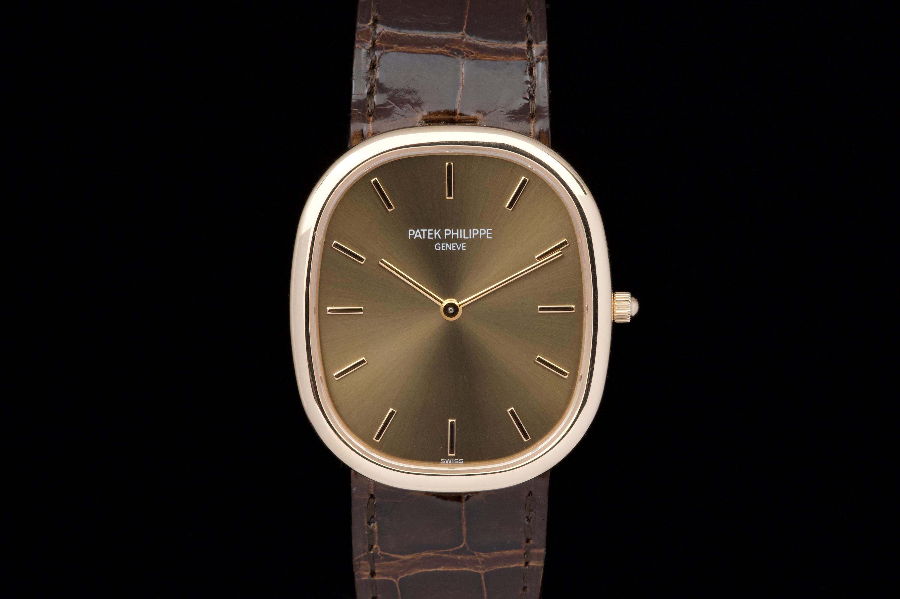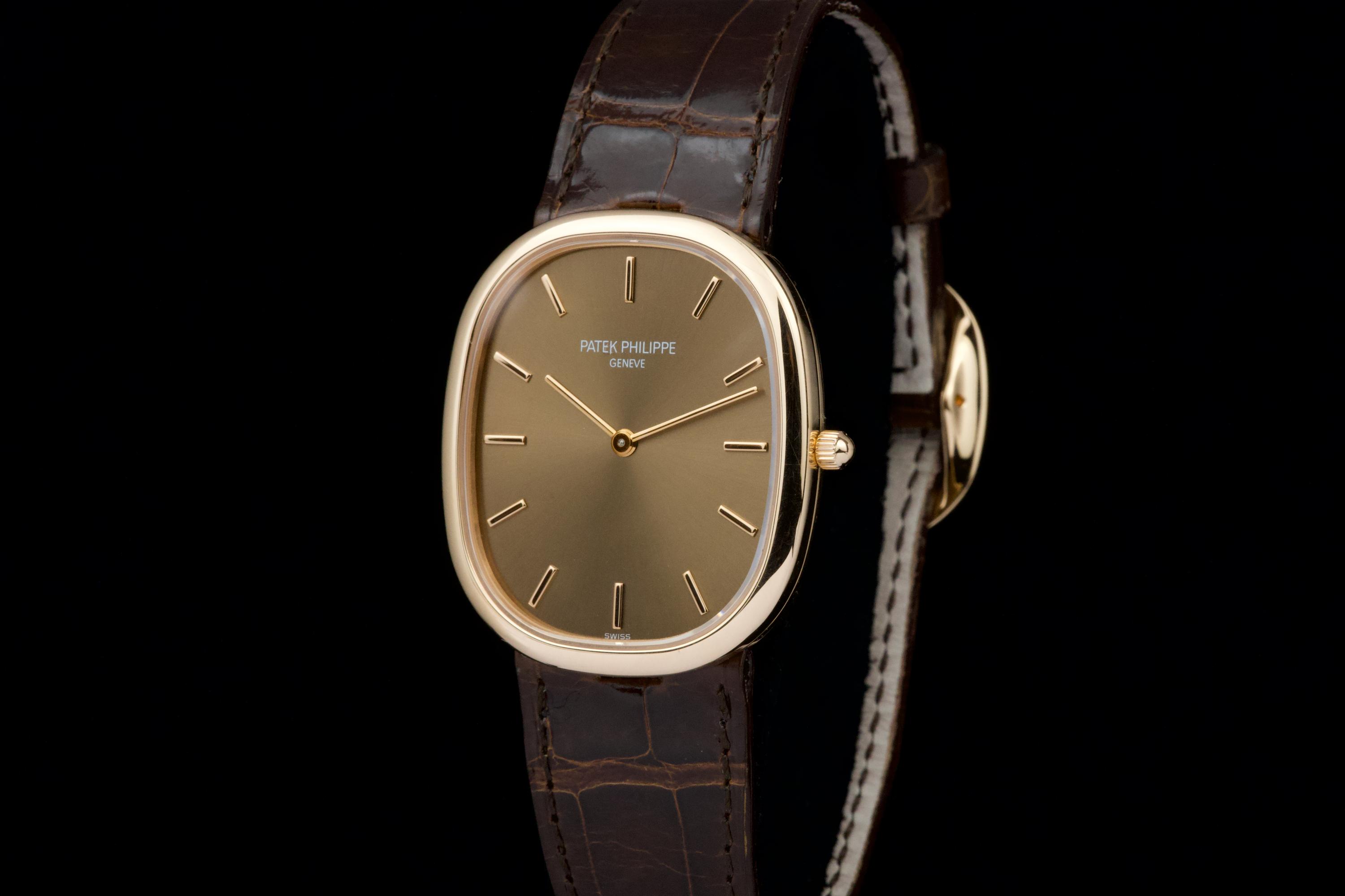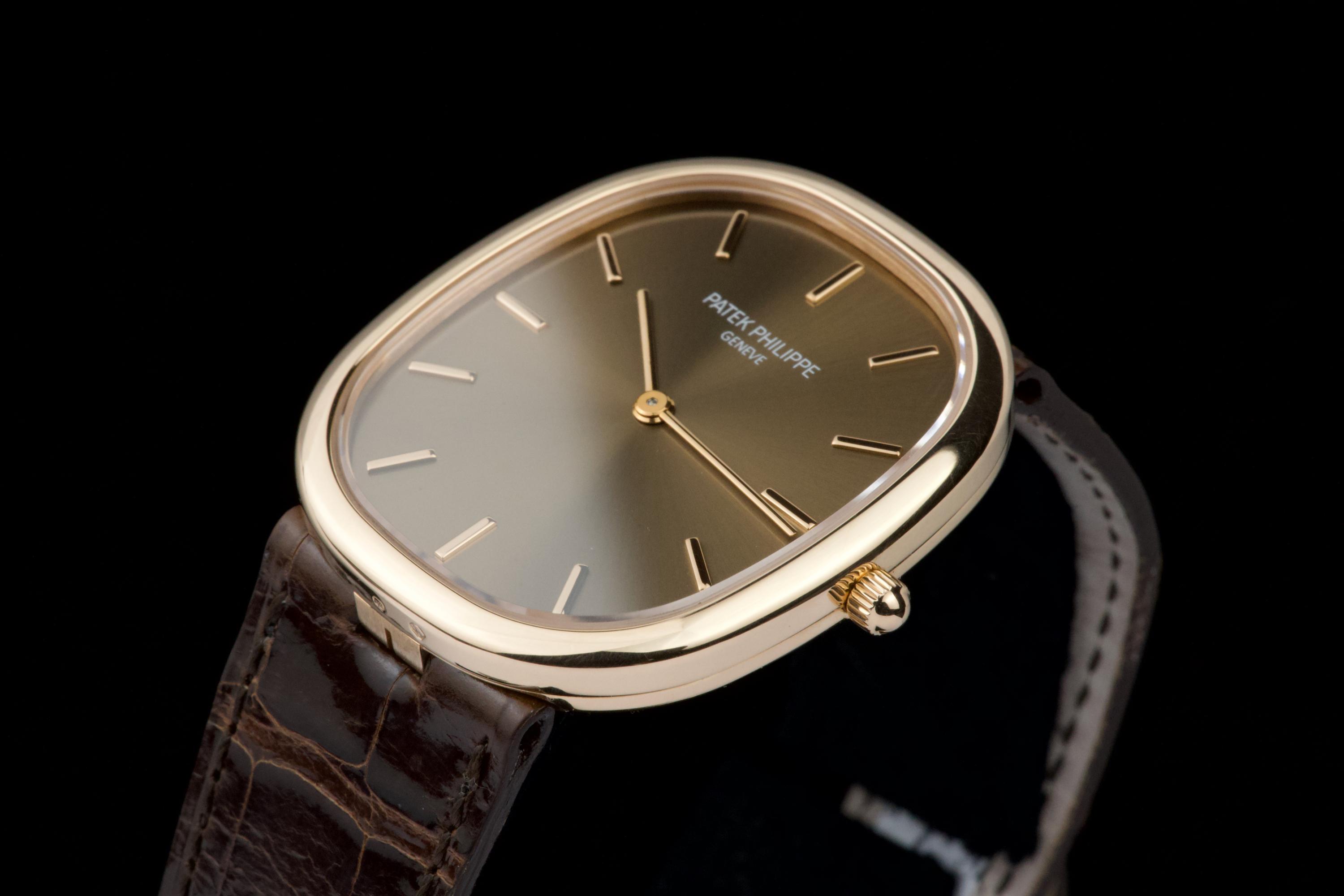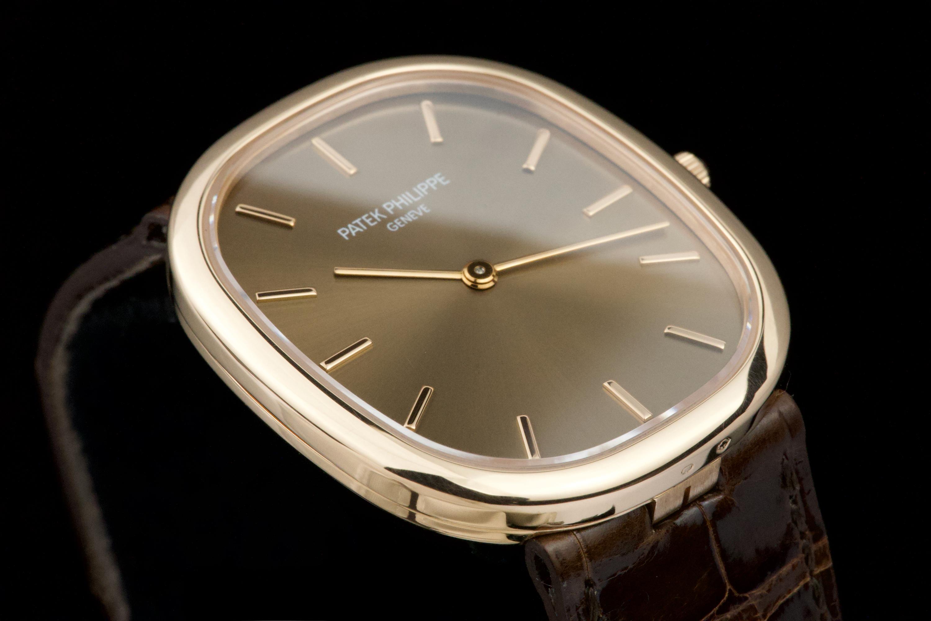A superb example of the Patek Philippe Ellipse reference 3738/100R-001 in 18K rose gold, featuring the elegant brown sunburst dial. Originally sold in Japan in 2006, this watch benefits from an excellent and well-documented history. It comes with Patek Philippe Japan service papers from 2017, confirming a complete service. The watch appears to have been very lightly worn since. In 2025, the leather strap was replaced by Patek Japan (invoice included) and is presented here in unworn condition. Fitted with its original rose-gold Patek Philippe tang buckle. The 31 × 35 mm rose-gold case is in magnificent condition, with crisp lines and a flawless presentation. Complete with its full original 2006 set, including box, papers, booklets, and accessories. A beautifully preserved Ellipse with impeccable provenance — elegant, rare, and perfectly maintained.
