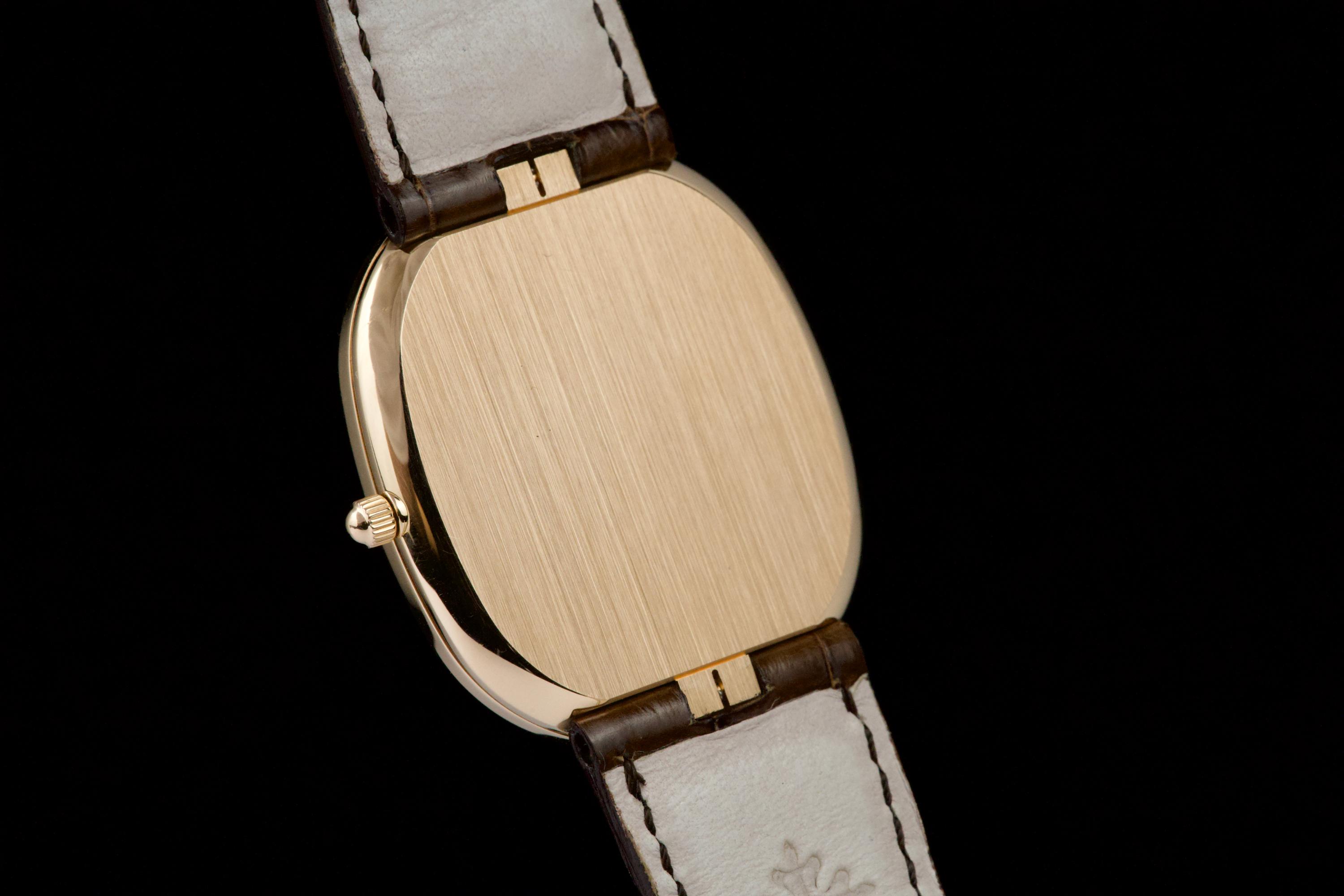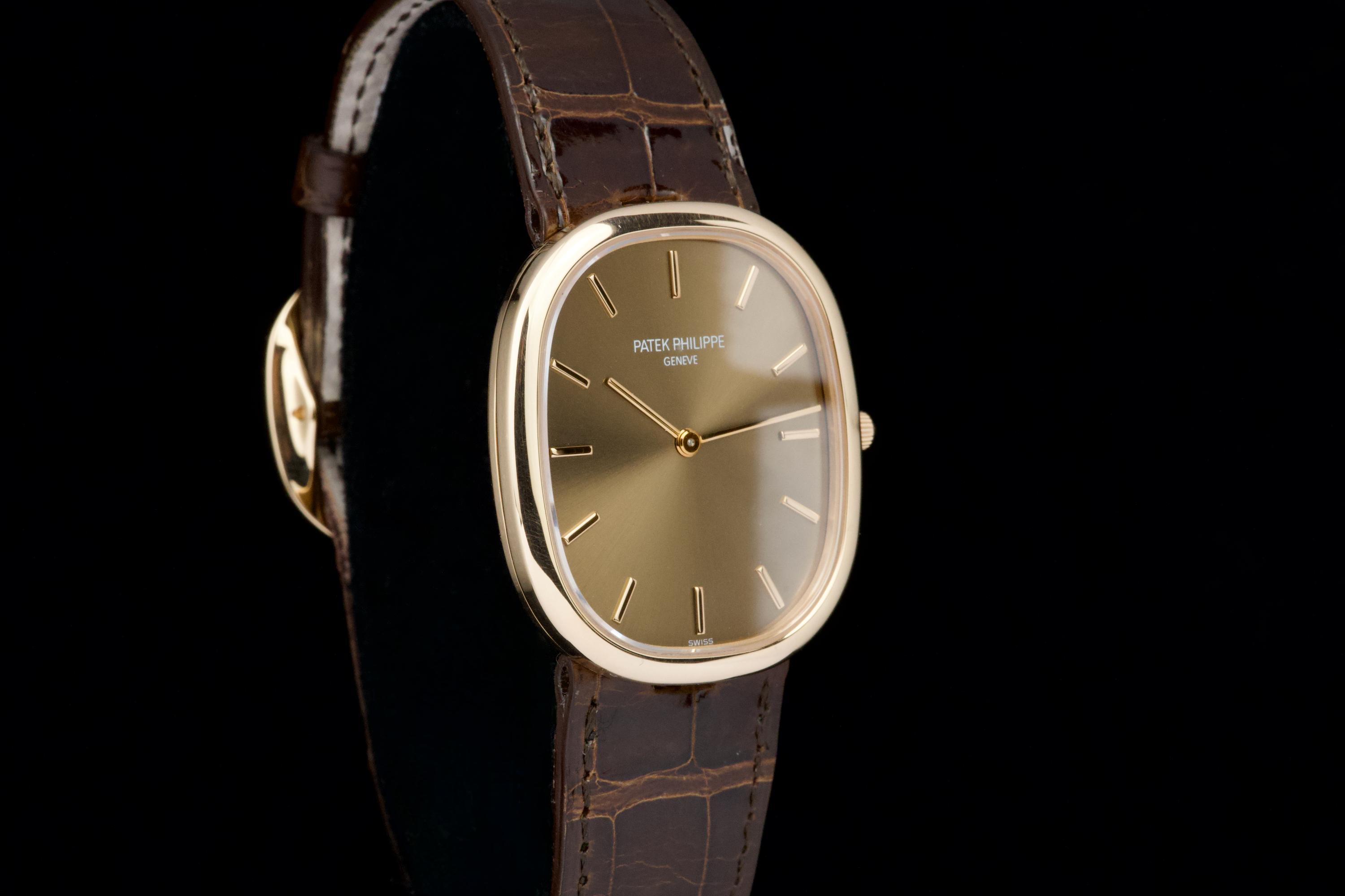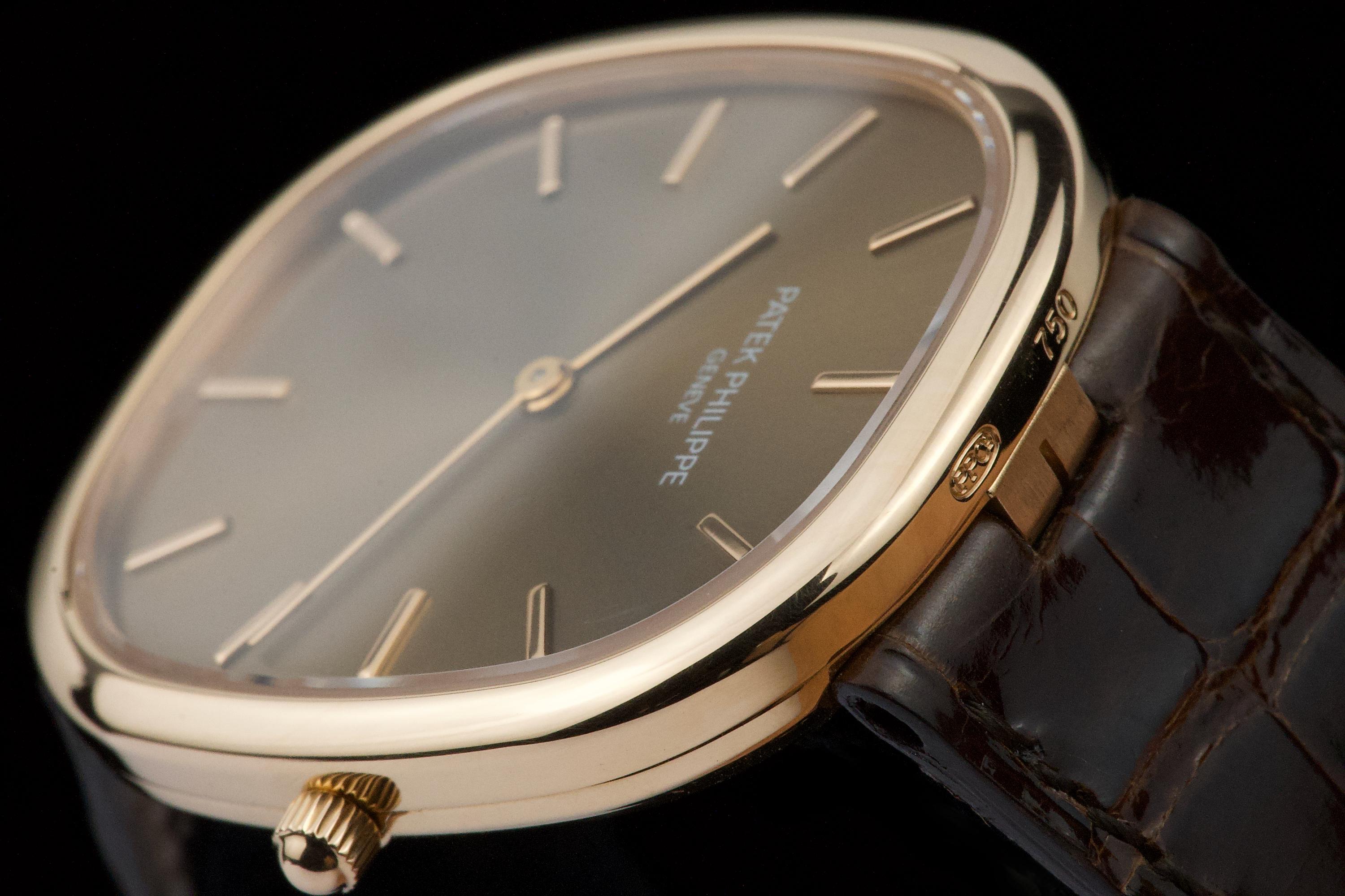 A superb example of the Patek Philippe Ellipse reference 3738/100R-001 in 18K rose gold, featuring the elegant brown sunburst dial. Originally sold in Japan in 2006, this watch benefits from an excellent and well-documented history. It comes with Patek Philippe Japan service papers from 2017, confirming a complete service. The watch appears to have been very lightly worn since. In 2025, the leather strap was replaced by Patek Japan (invoice included) and is presented here in unworn condition. Fitted with its original rose-gold Patek Philippe tang buckle. The 31 × 35 mm rose-gold case is in magnificent condition, with crisp lines and a flawless presentation. Complete with its full original 2006 set, including box, papers, booklets, and accessories. A beautifully preserved Ellipse with impeccable provenance — elegant, rare, and perfectly maintained.
