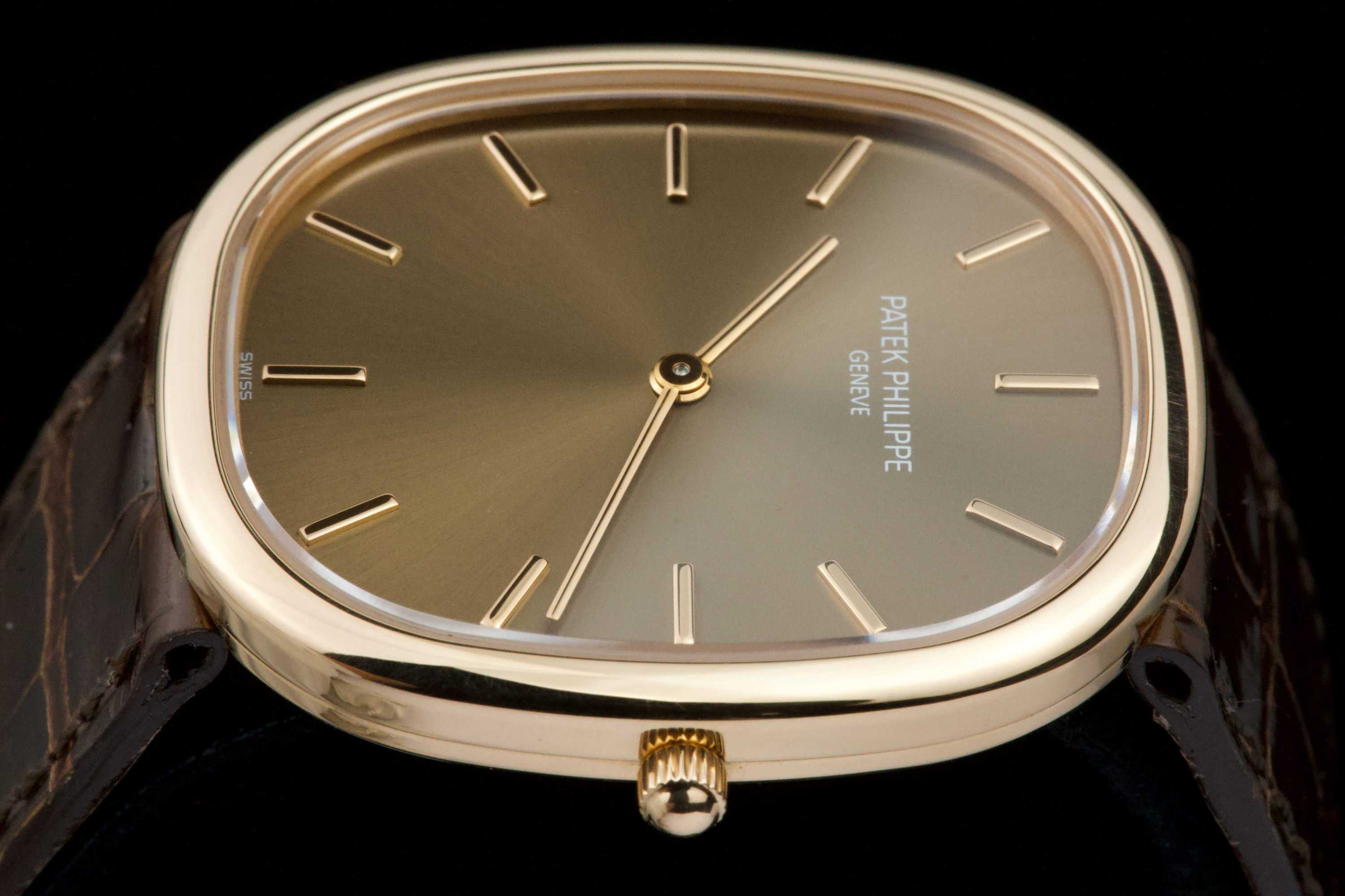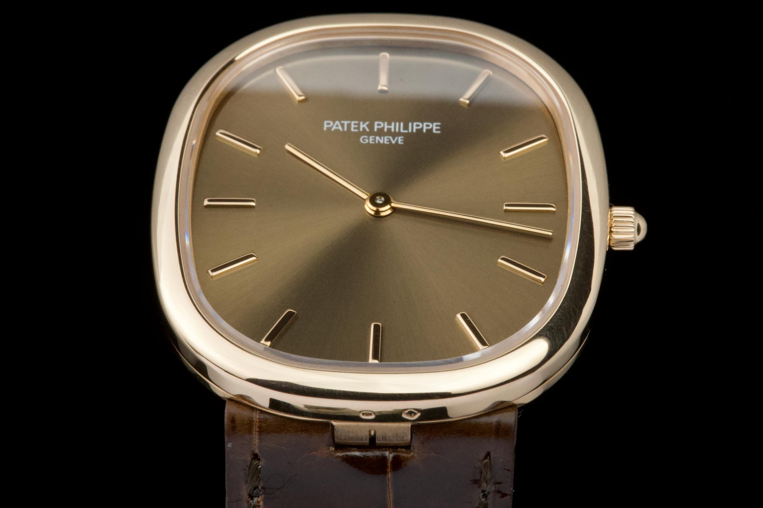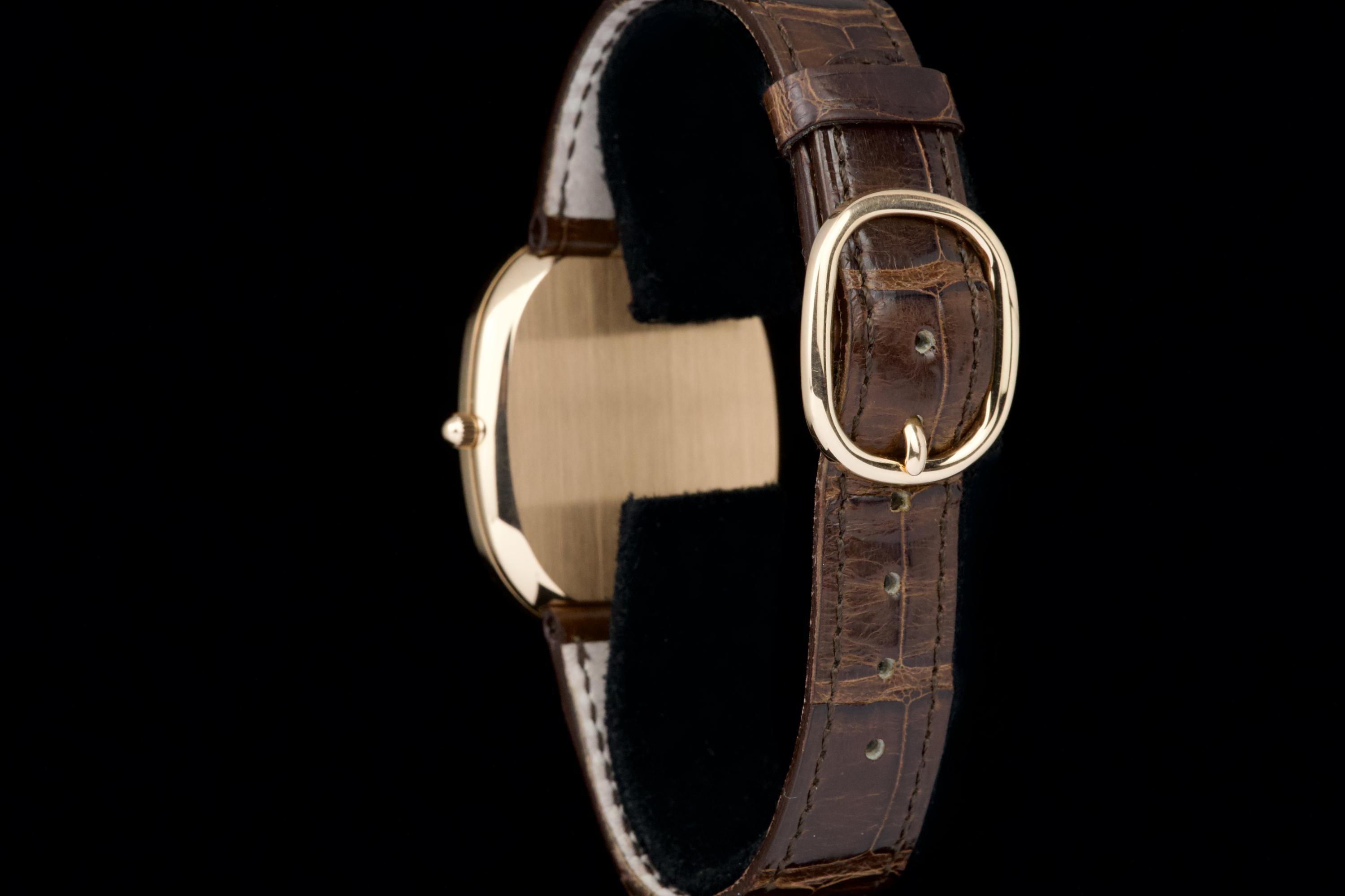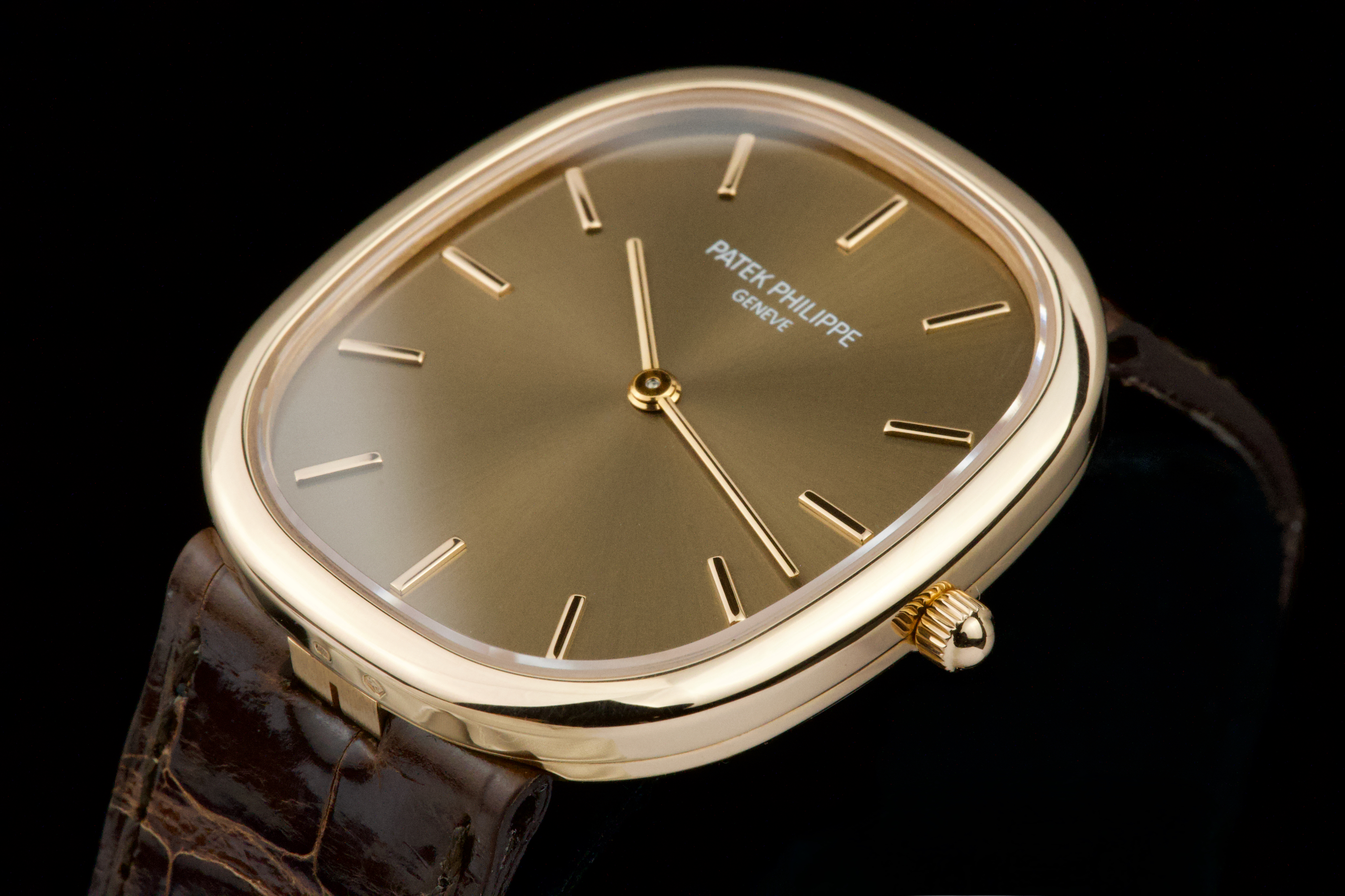 A superb example of the Patek Philippe Ellipse reference 3738/100R-001 in 18K rose gold, featuring the elegant brown sunburst dial. Originally sold in Japan in 2006, this watch benefits from an excellent and well-documented history. It comes with Patek Philippe Japan service papers from 2017, confirming a complete service. The watch appears to have been very lightly worn since. In 2025, the leather strap was replaced by Patek Japan (invoice included) and is presented here in unworn condition. Fitted with its original rose-gold Patek Philippe tang buckle. The 31 × 35 mm rose-gold case is in magnificent condition, with crisp lines and a flawless presentation. Complete with its full original 2006 set, including box, papers, booklets, and accessories. A beautifully preserved Ellipse with impeccable provenance — elegant, rare, and perfectly maintained.