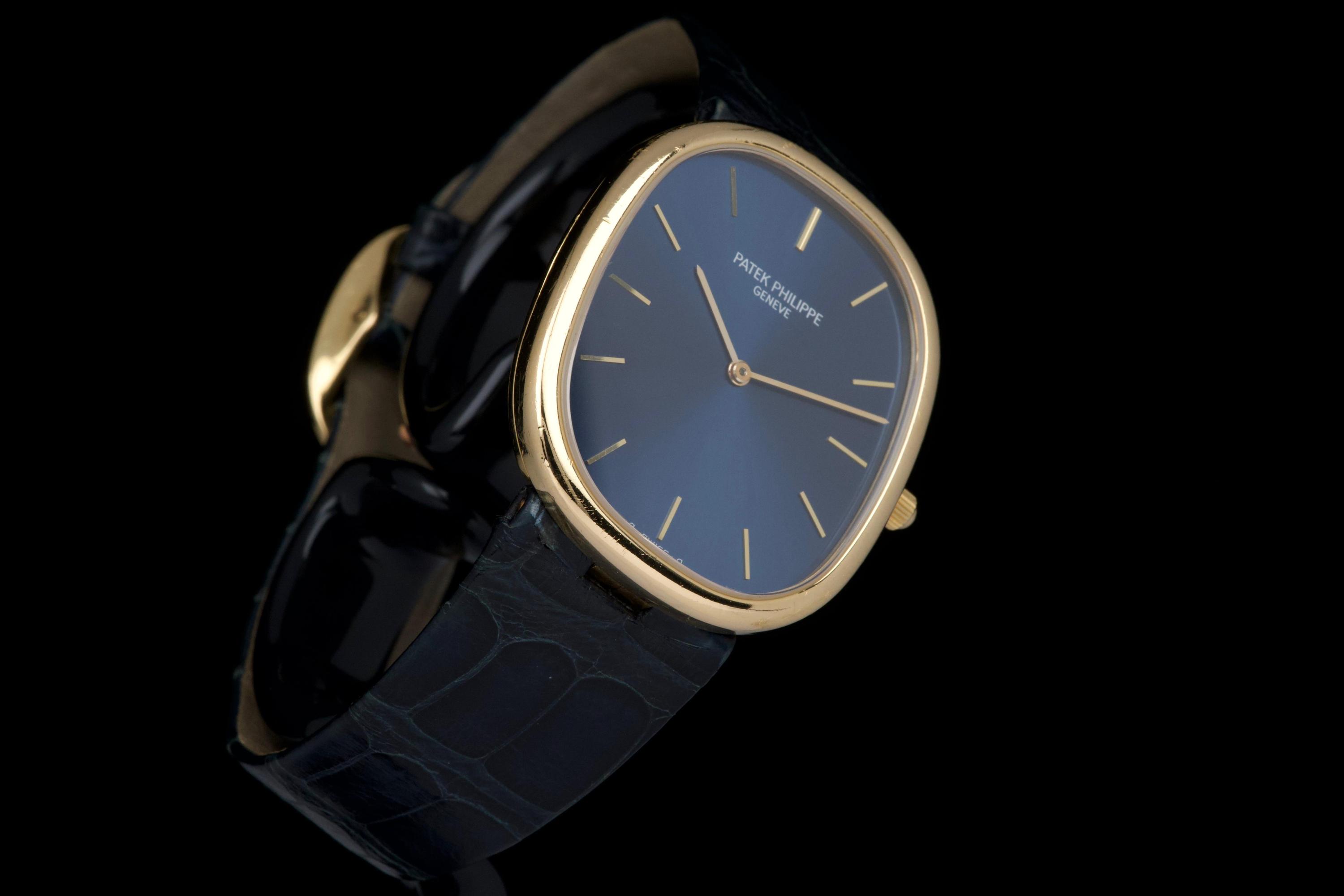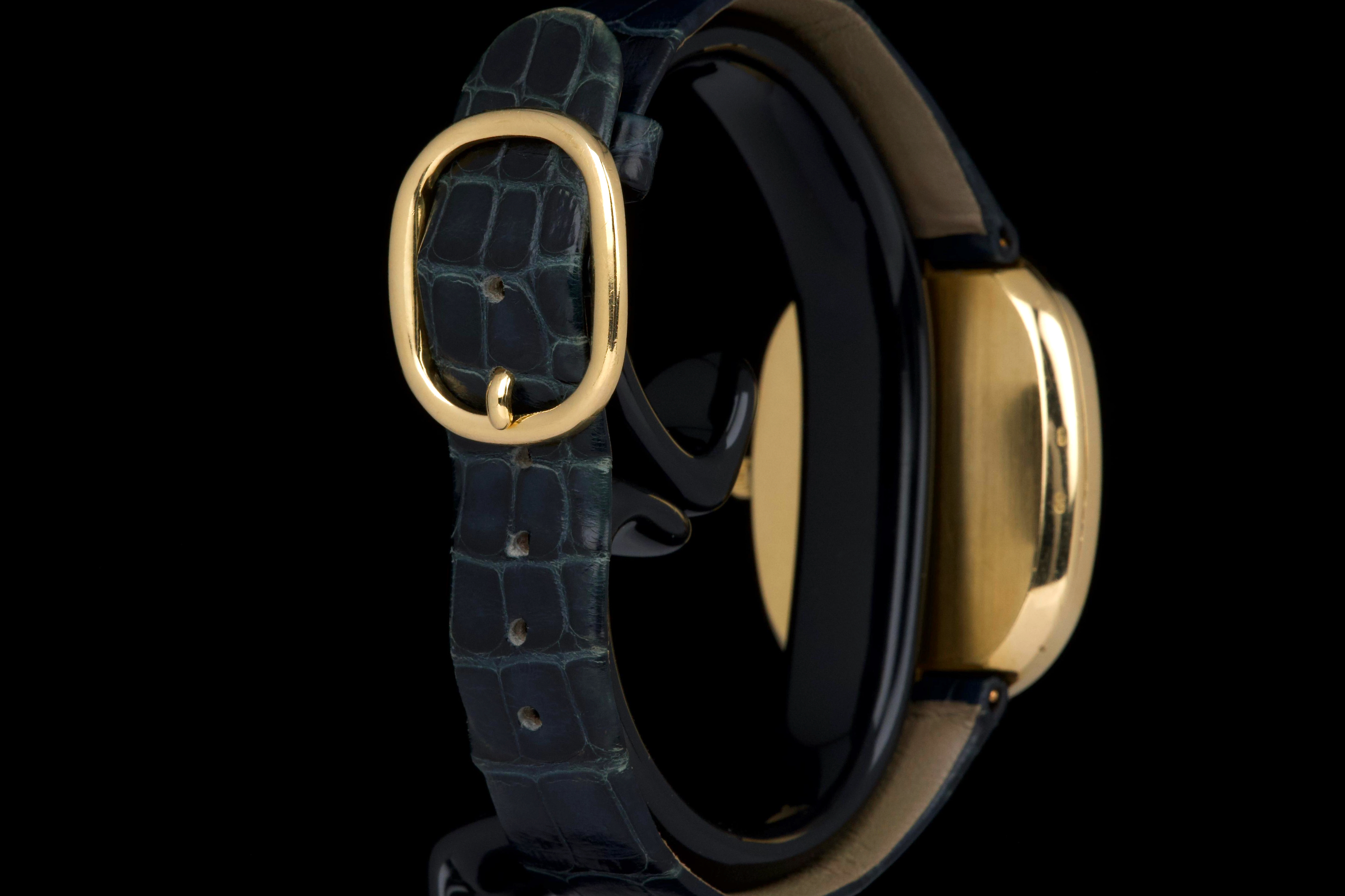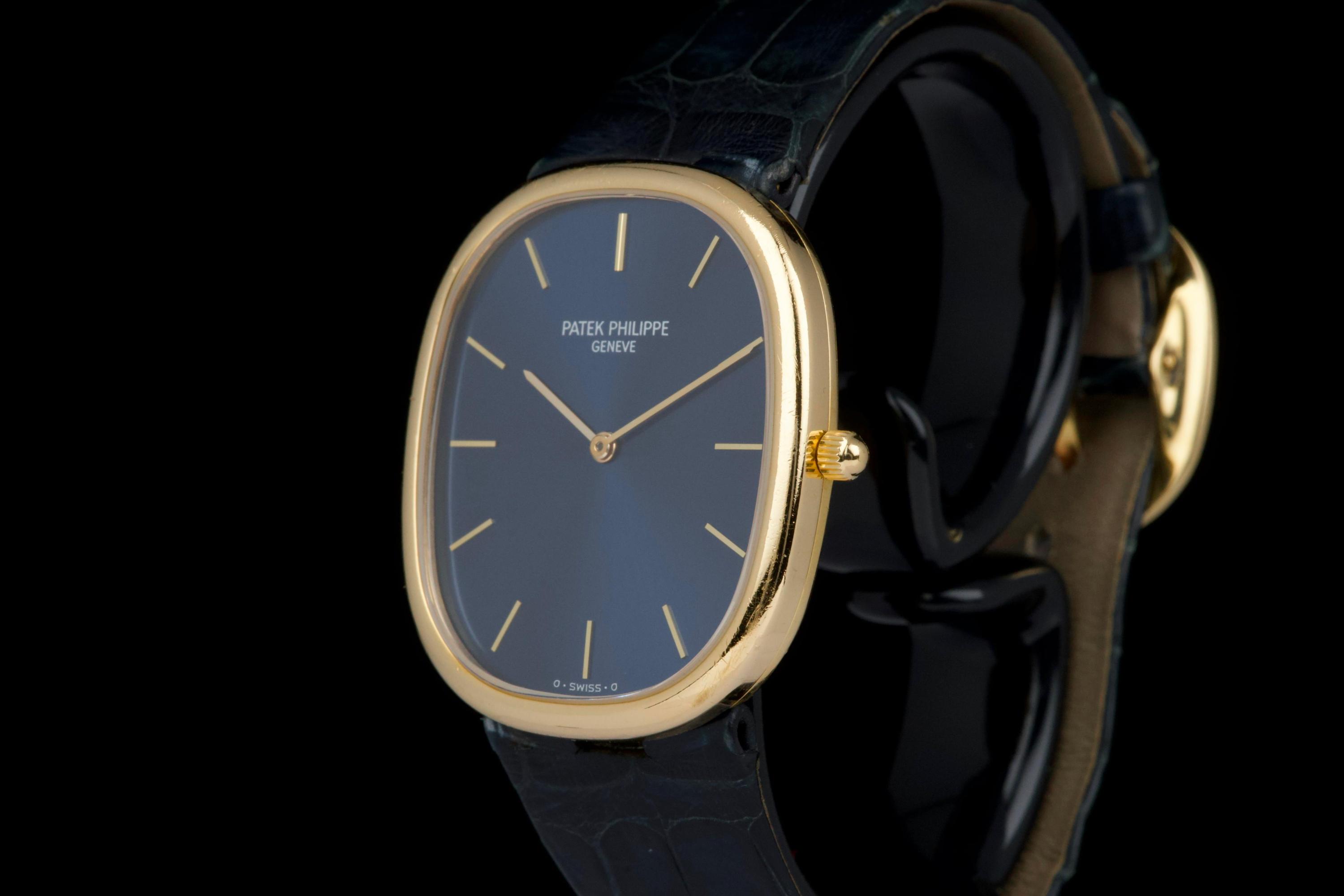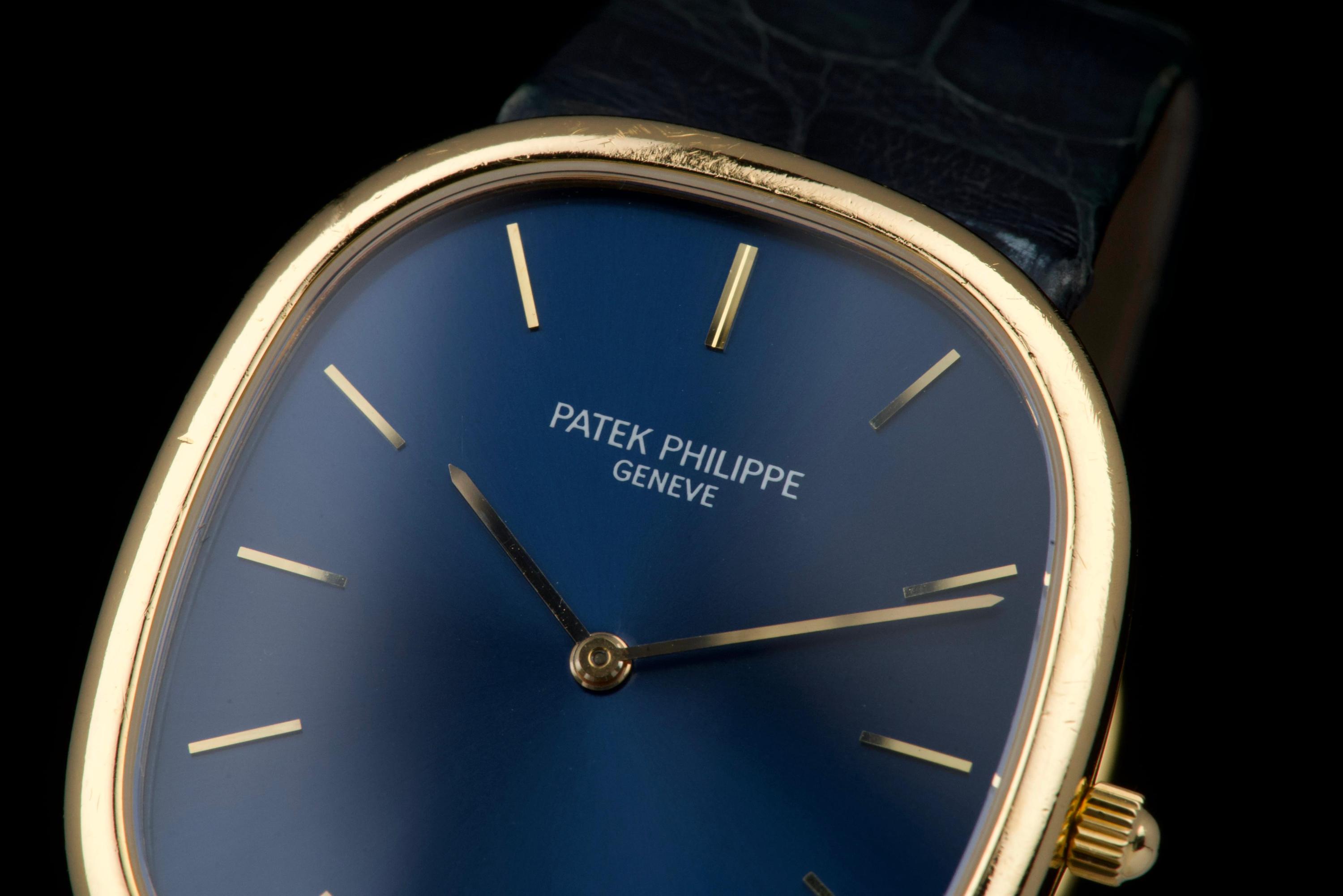The present Patek Philippe Golden Ellipse reference 3738, executed in yellow gold and dating to the 1980s, is an elegant and honest example of one of the manufacture’s most distinctive and enduring dress watch designs. With its harmonious proportions inspired by the golden ratio, the Ellipse remains a timeless icon within Patek Philippe’s catalogue. This example measures approximately 31 x 35 mm, offering the refined and discreet dimensions characteristic of the period. The case has been polished in the past and is preserved in good overall condition. It displays surface scratches consistent with normal use and age—entirely expected for a watch approaching forty years old. Importantly, the gold hallmarks remain visible on the case, a reassuring indicator of honest wear and preservation. The watch is fitted with a superb sunburst blue dial, which is preserved in perfect condition and remains a defining highlight of the piece. The hands match beautifully, creating a harmonious and well-balanced aesthetic. The sapphire crystal shows a small chip at approximately 9 o’clock, a minor imperfection that does not detract from the overall presentation. The watch is fitted with a navy blue Patek Philippe crocodile leather strap, paired with an original-style yellow-gold Ellipse ardillon buckle, maintaining correct period coherence. The movement has been fully serviced by our watchmaker and is running accurately at the time of cataloguing. Offered without box or papers, this Golden Ellipse 3838 represents a charming and attractively priced opportunity to acquire a classic Patek Philippe dress watch from the 1980s—combining a flawless original dial, recent servicing, and the timeless elegance that defines the Ellipse line.