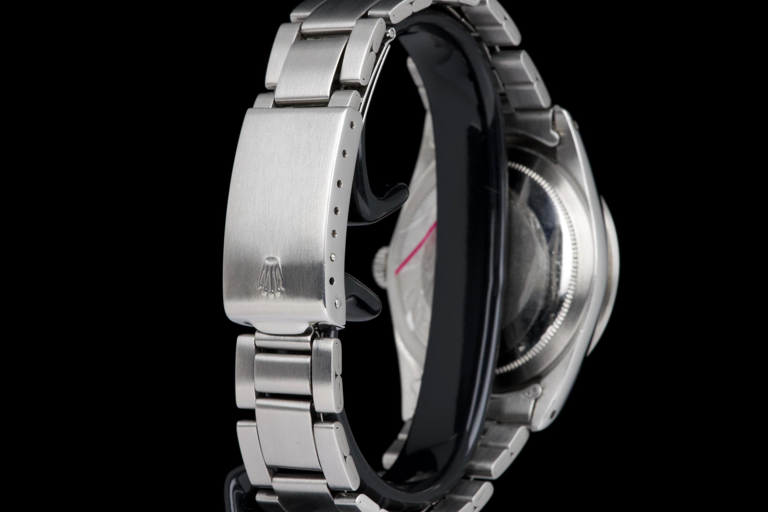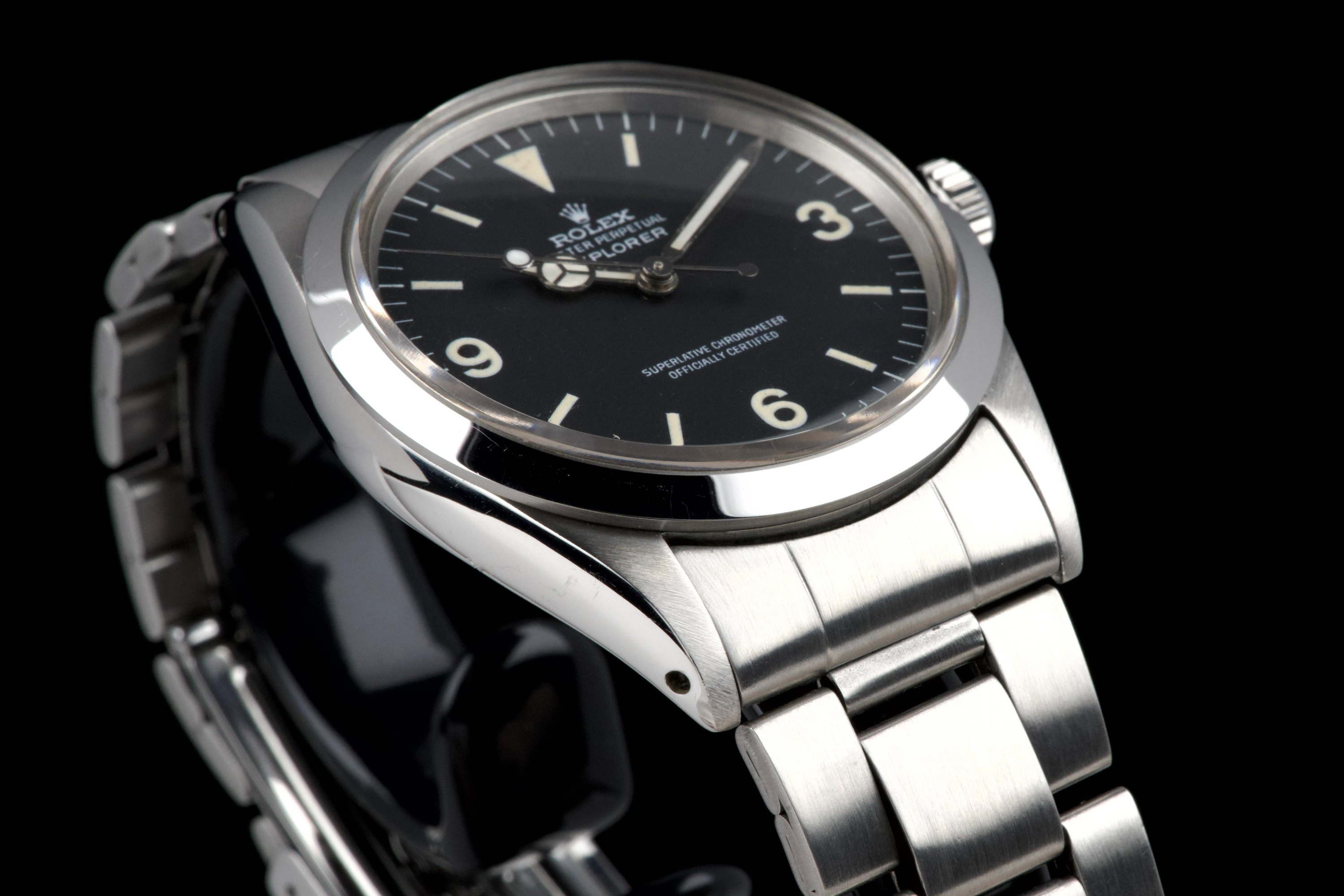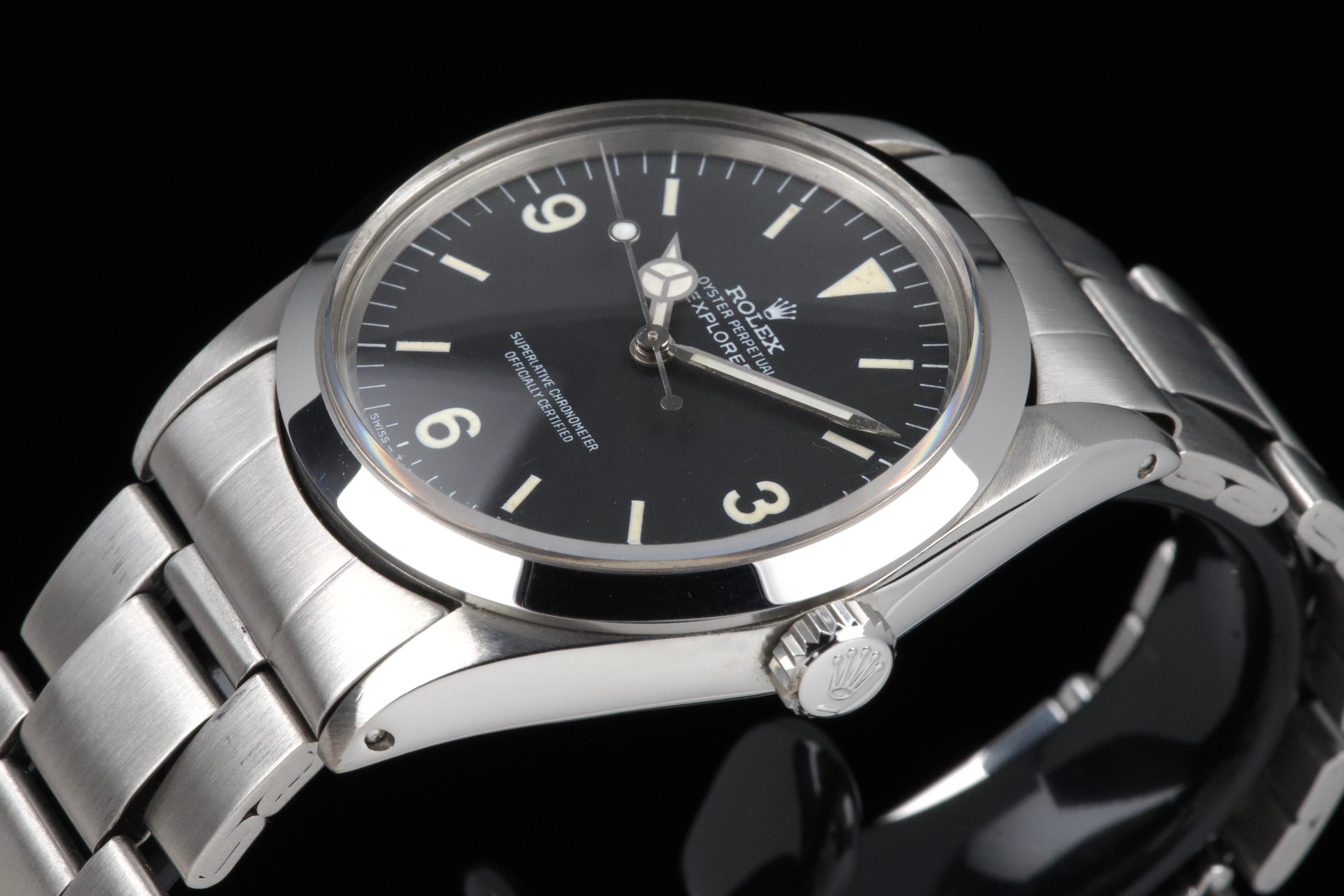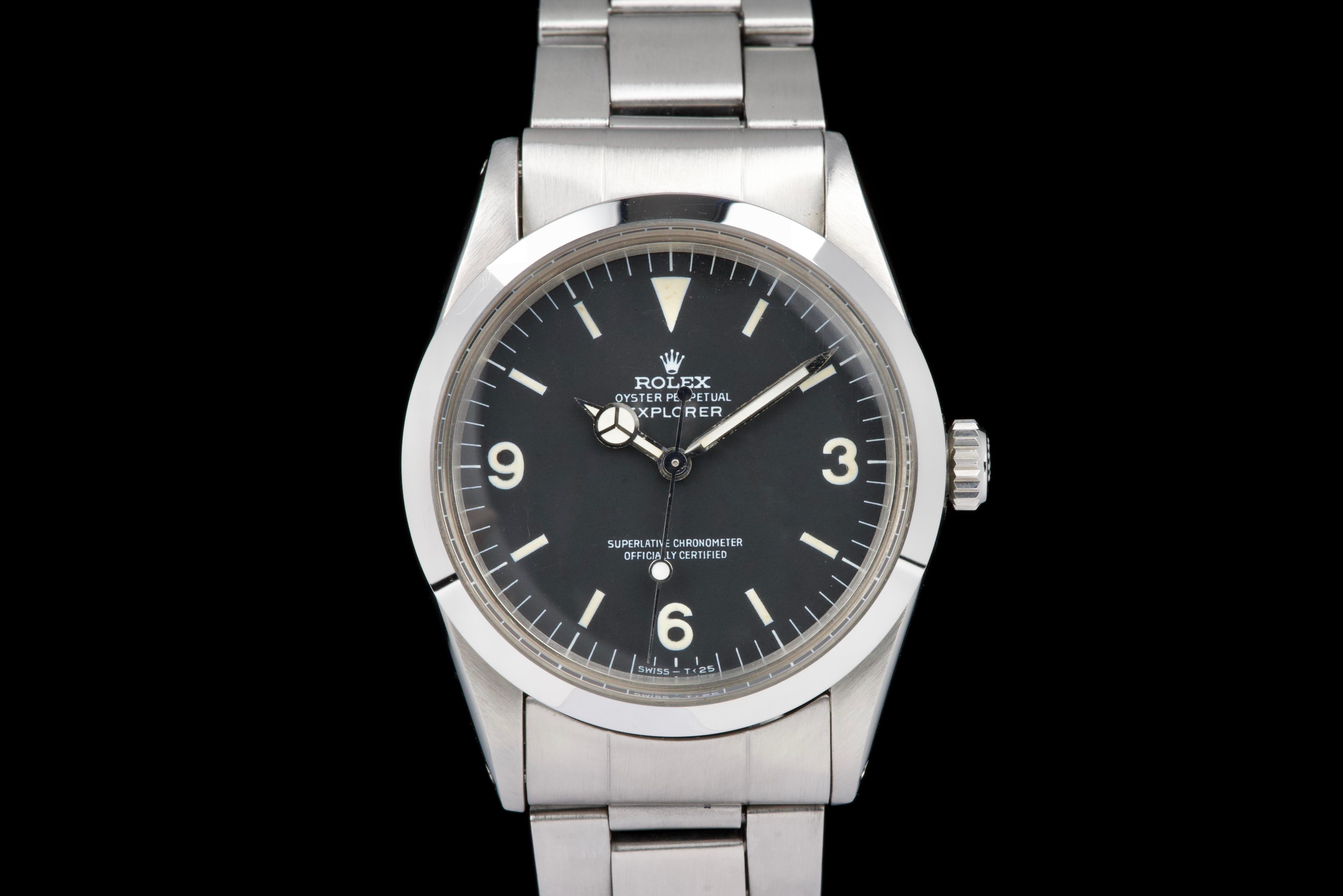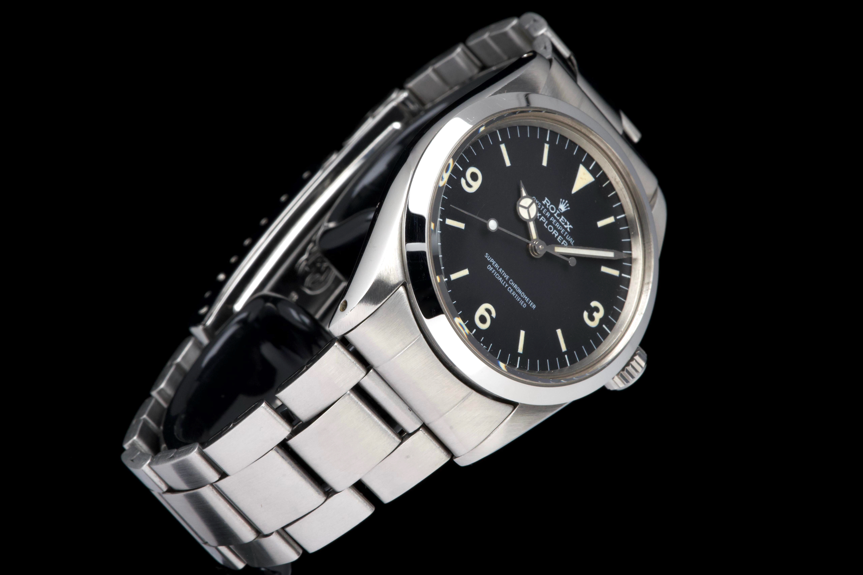 The present Rolex Explorer reference 1016, bearing the serial number 3480XXX and dating to 1972, is a highly attractive and honest example of this iconic 36 mm tool watch. The stainless-steel case has been polished in the past and shows light wear consistent with careful use, while retaining pleasing proportions and a flat, well-defined bezel. The serial and reference numbers between the lugs remain clearly legible, and the caseback is correctly stamped “1.72,” in line with the production period. The watch is fitted with a particularly appealing tritium Mk1 “frog foot” dial, preserved in very fine condition. The luminous material on the hour markers and the signature 3/6/9 numerals has aged to a warm, slightly creamy patina, giving the watch a beautifully balanced and period-correct appearance. The original hour and minute hands remain intact and match the dial well. The seconds hand is a later service replacement with luminova. Inside, the watch is powered by the Rolex calibre 1570, which has been checked by our watchmaker and is functioning correctly at the time of cataloguing. The watch is paired with its original folded Oyster bracelet reference 7836 with 358 endlinks. The bracelet shows noticeable stretch, entirely normal and expected for a bracelet of this age. The clasp is not date-stamped, a detail often encountered on early 1970s Rolex bracelets. With its attractive Mk1 “frog foot” dial, correct early 1970s configuration, strong case details, and honest overall condition, this Explorer 1016 represents a compelling opportunity to acquire a classic Rolex sports watch that perfectly embodies the understated and utilitarian spirit of the model.