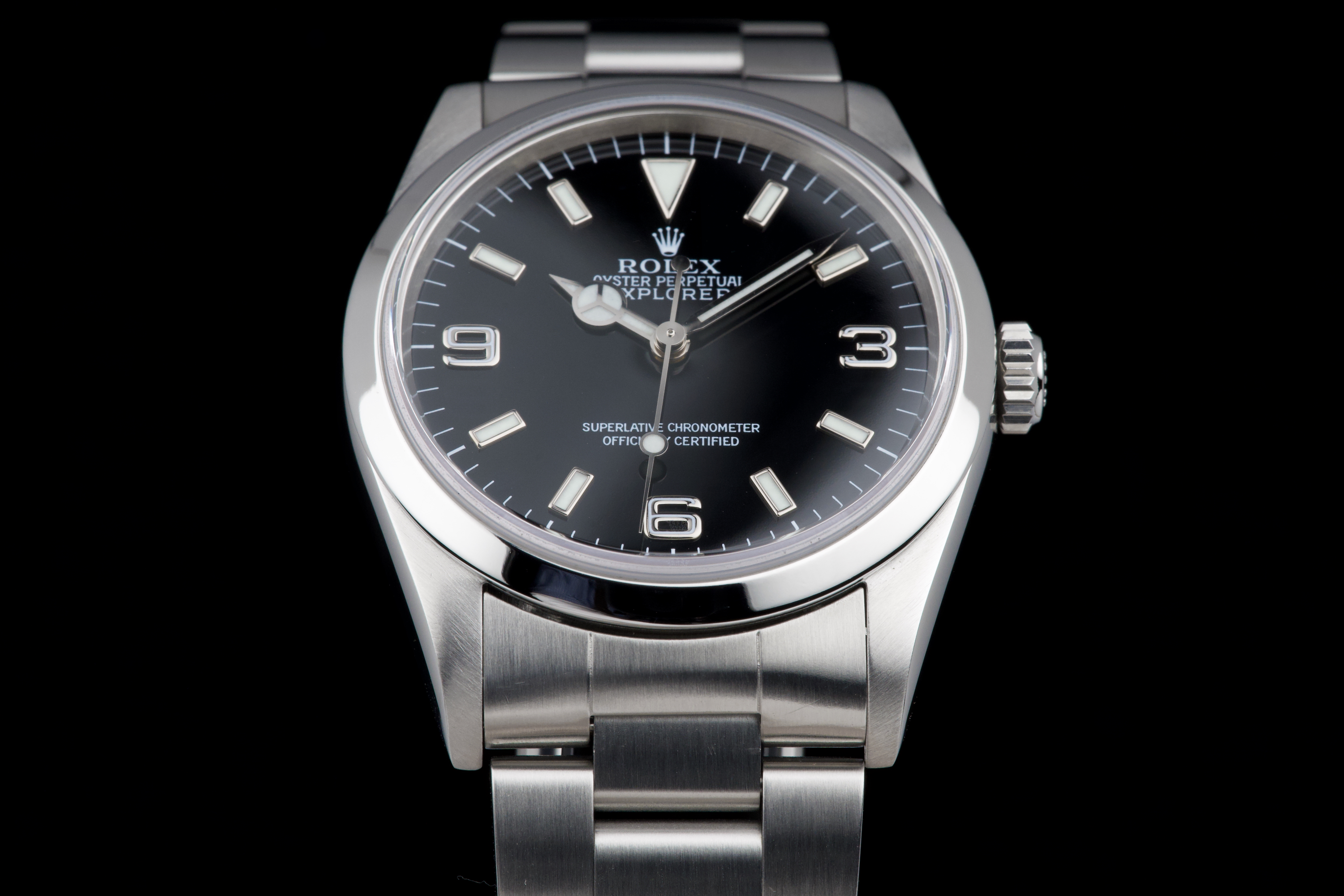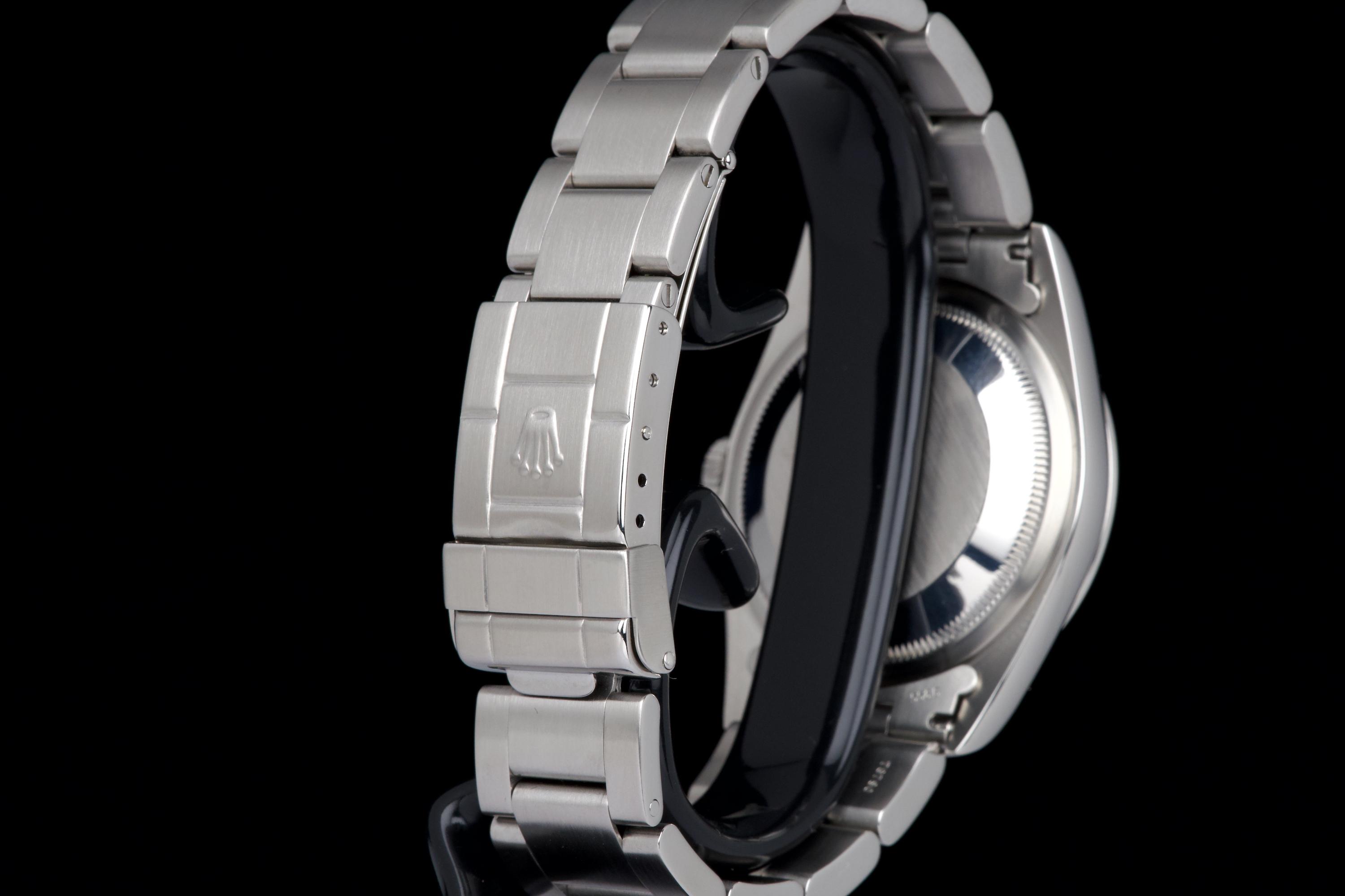 A beautiful example of the Rolex Explorer I reference 14270, featuring the rare transitional “Swiss Only” luminova dial, produced for a very short period in the late 1990s. Originally sold in 1999, this watch no longer retains its original box and papers but was officially sold by Bucherer as a Certified Pre-Owned (CPO) piece in 2021. It therefore comes with the Bucherer leather presentation box and Bucherer CPO international warranty card. The stainless steel case has been polished in the past and remains in perfect condition, with crisp lines and minimal wear. The black “Swiss Only” dial and matching luminova hands are flawless, displaying strong contrast and perfect printing. The original Oyster bracelet reference 78790 with 558B endlinks is in excellent condition, showing minimal stretch, claspcode X11. The automatic movement has been fully checked by our watchmaker and is running perfectly. A superb example of the transitional Explorer 14270 “Swiss Only,” combining perfect aesthetics, originality, and recent Bucherer CPO provenance — one of the most collectible configurations of the late 1990s Explorer I.