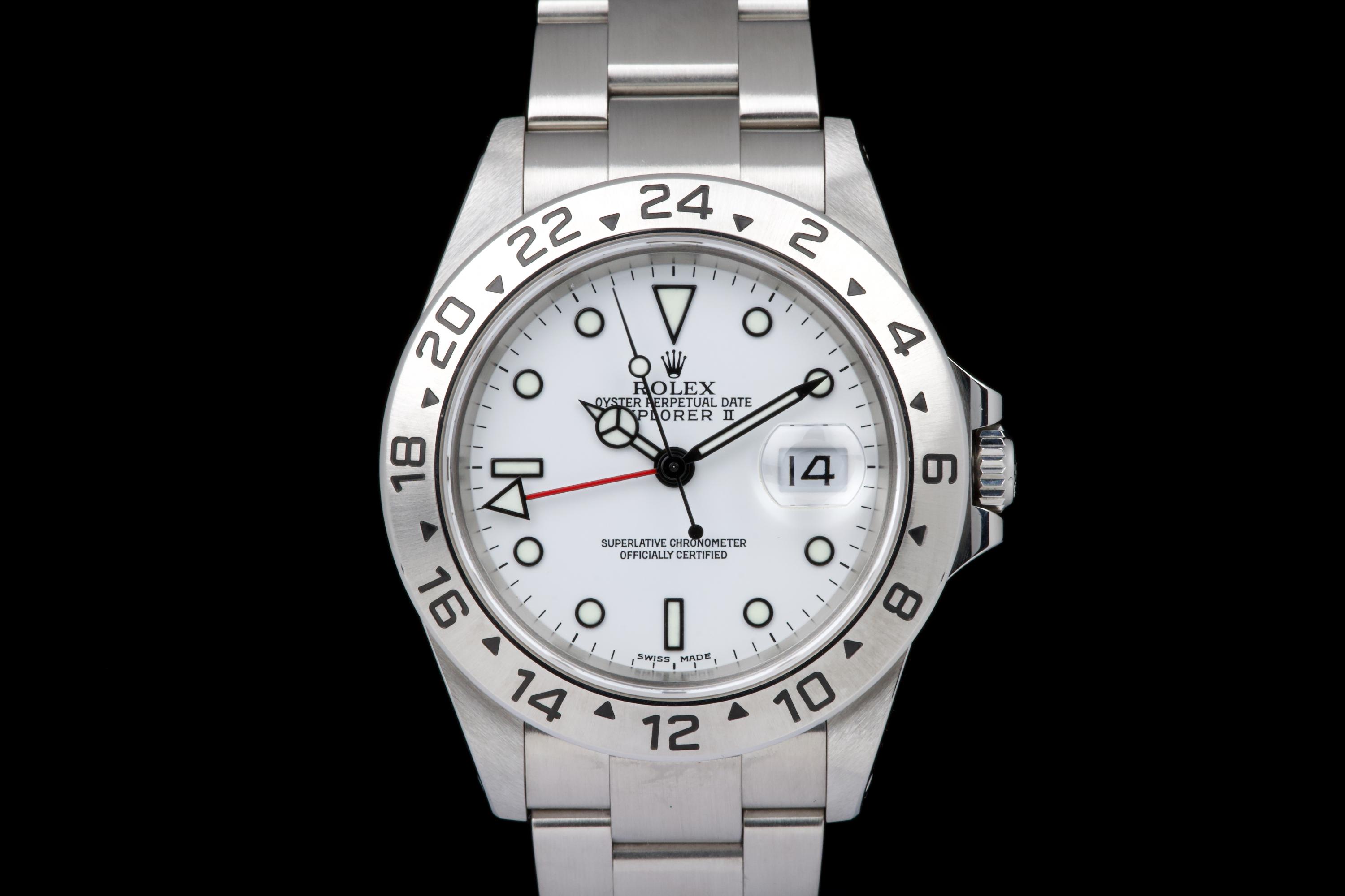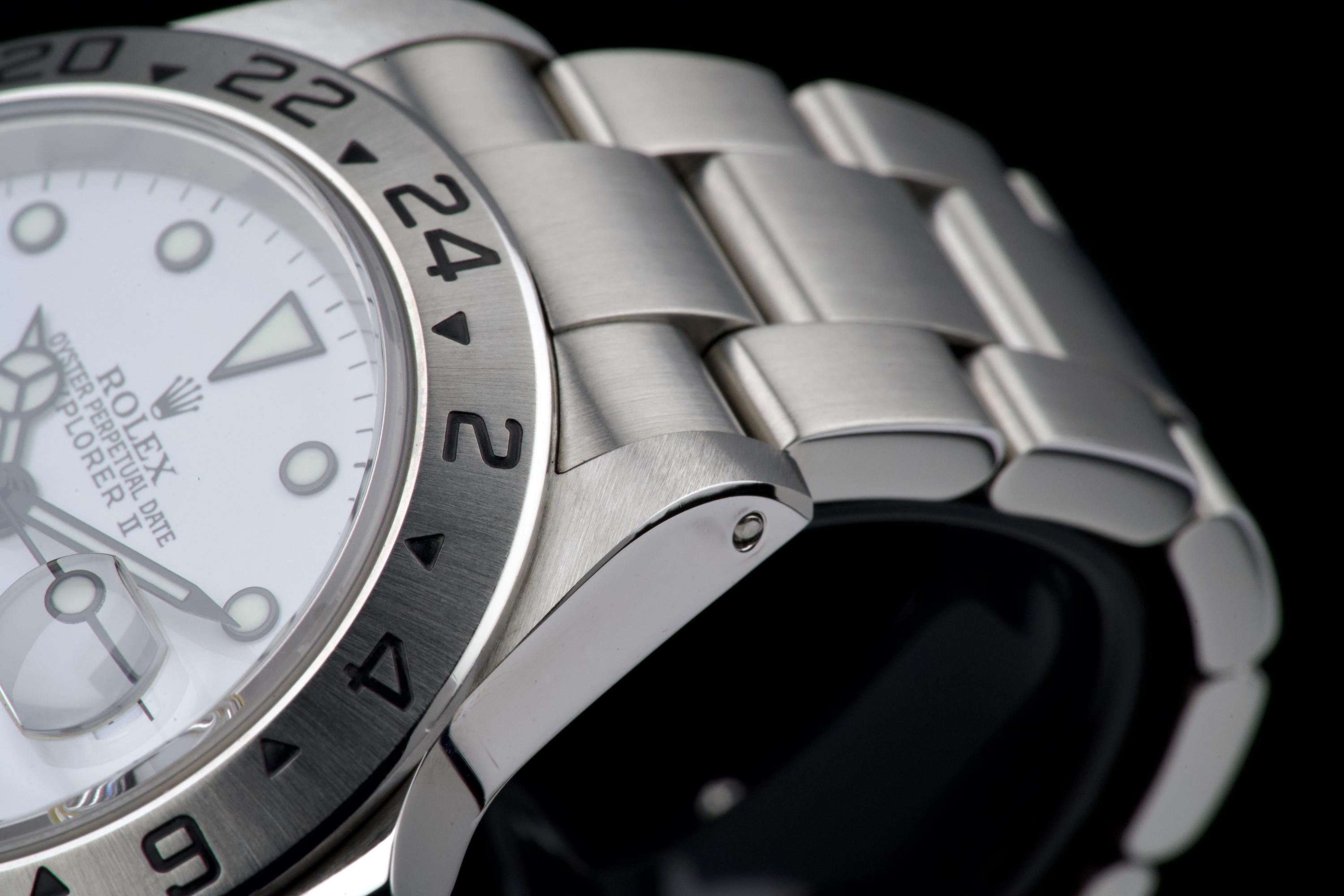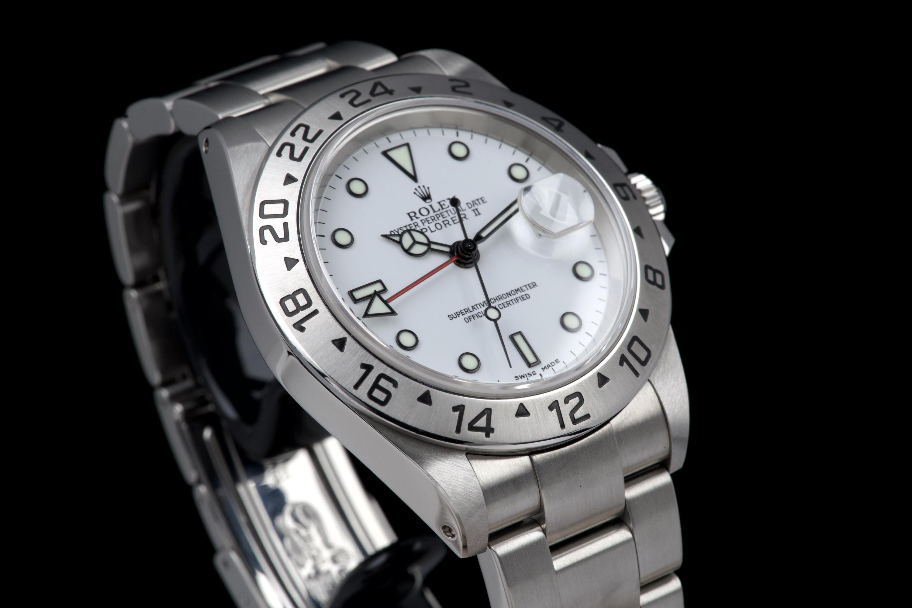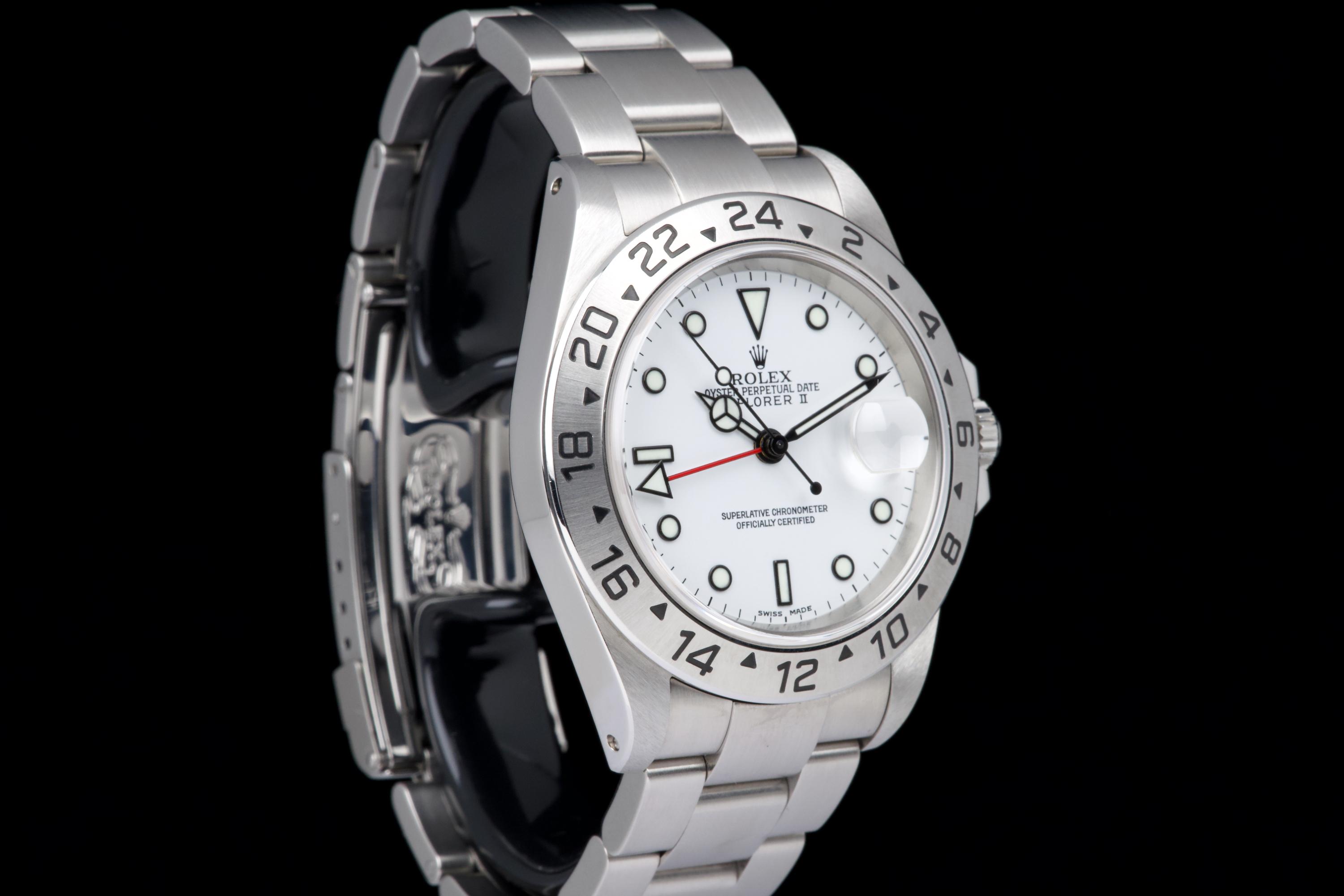 A beautiful example of the Rolex Explorer II “Polar”, featuring the bright white Luminova dial, confirmed as original on the accompanying papers. The watch has been recently polished and is presented in excellent overall condition, showing extremely light wear from use. The stainless steel bezel retains its original factory brushing, and the case remains sharp and clean. Fitted with the Oyster bracelet reference 78790A with solid endlinks, claspcode DE2, and showing very light stretch only. The movement has been serviced by our watchmaker and runs perfectly. Complete with its full 2001 set, including box, warranty papers, and booklets. A superb and crisp example of the classic Explorer II “Polar” — timeless, versatile, and ready to wear.