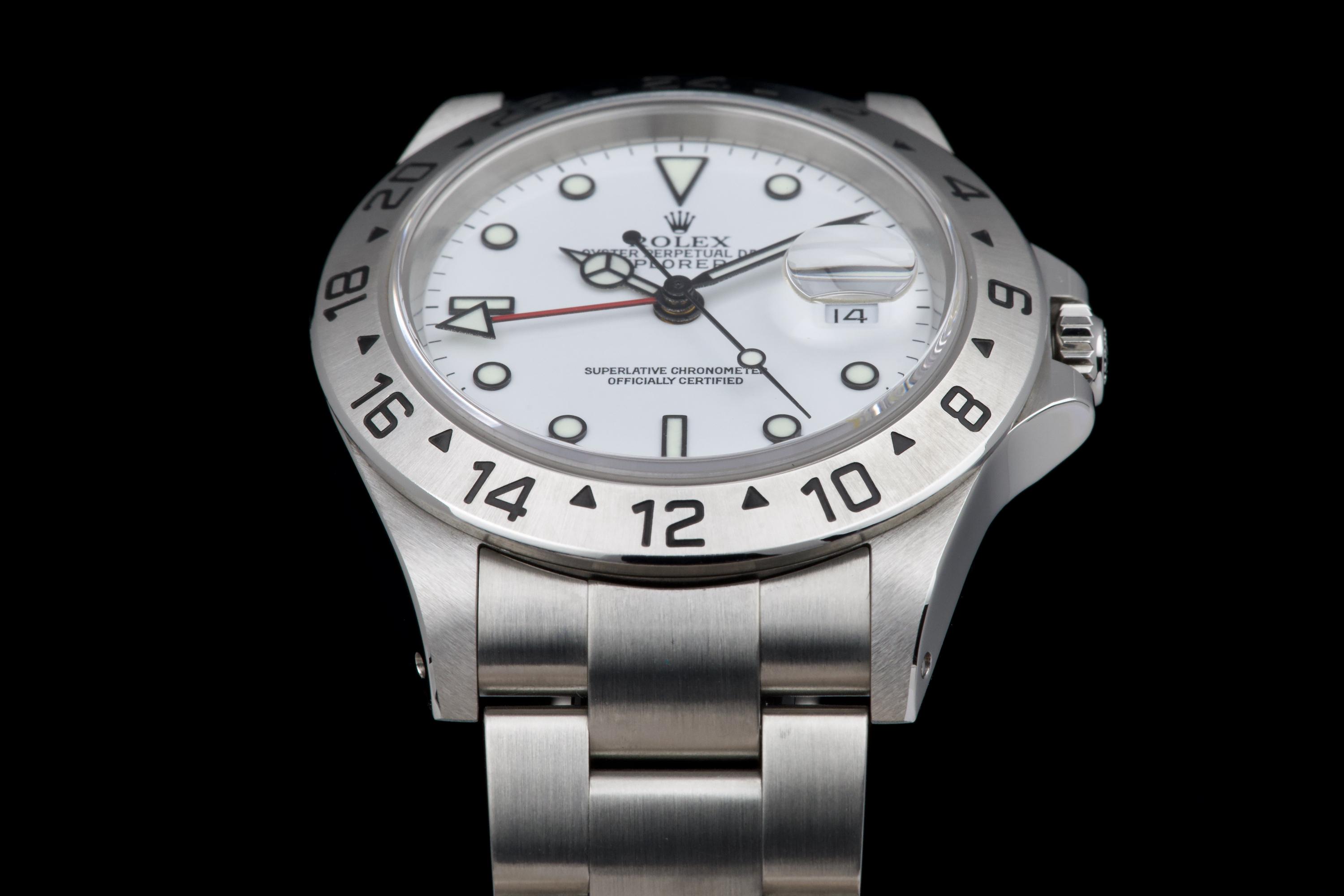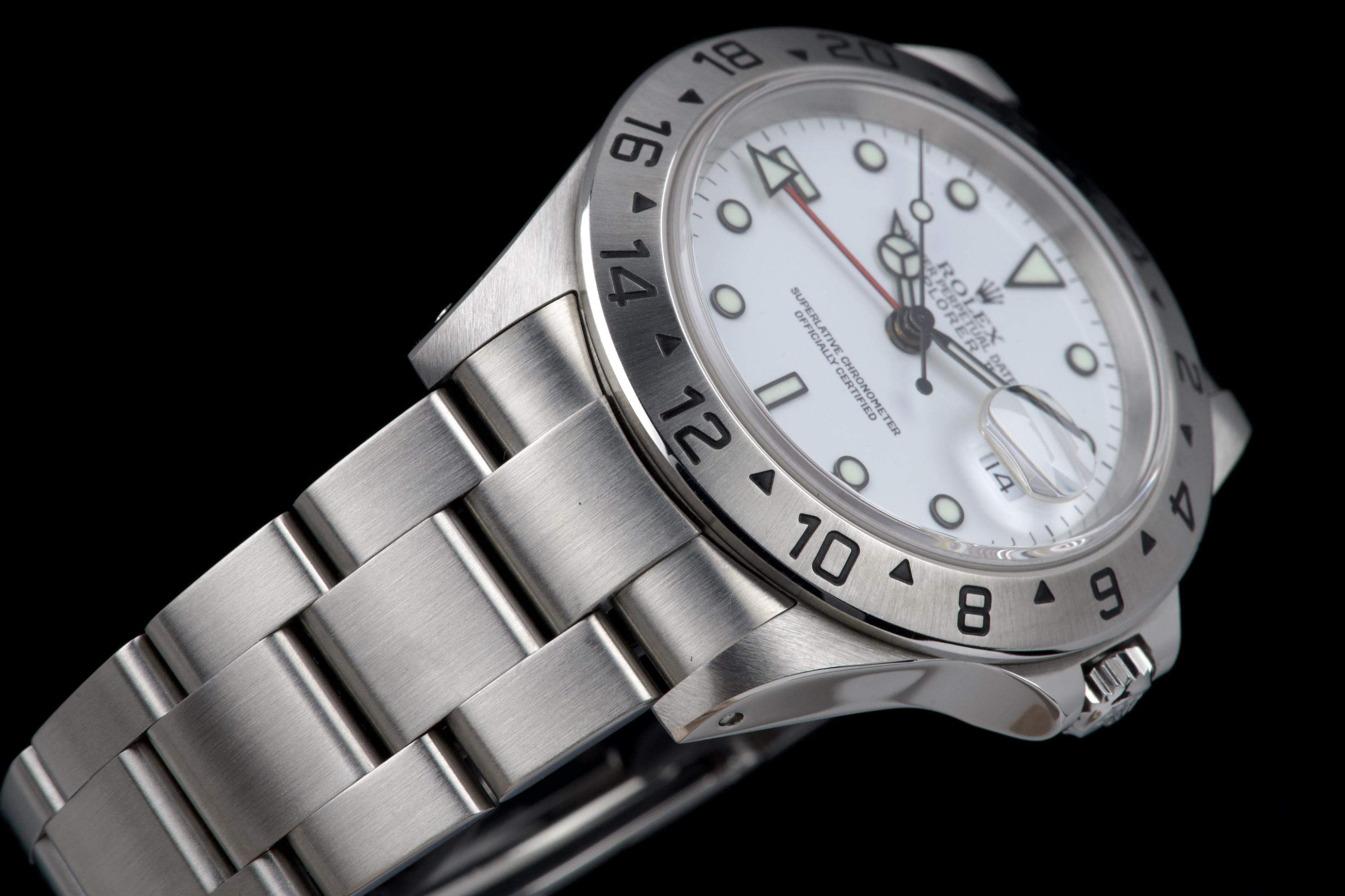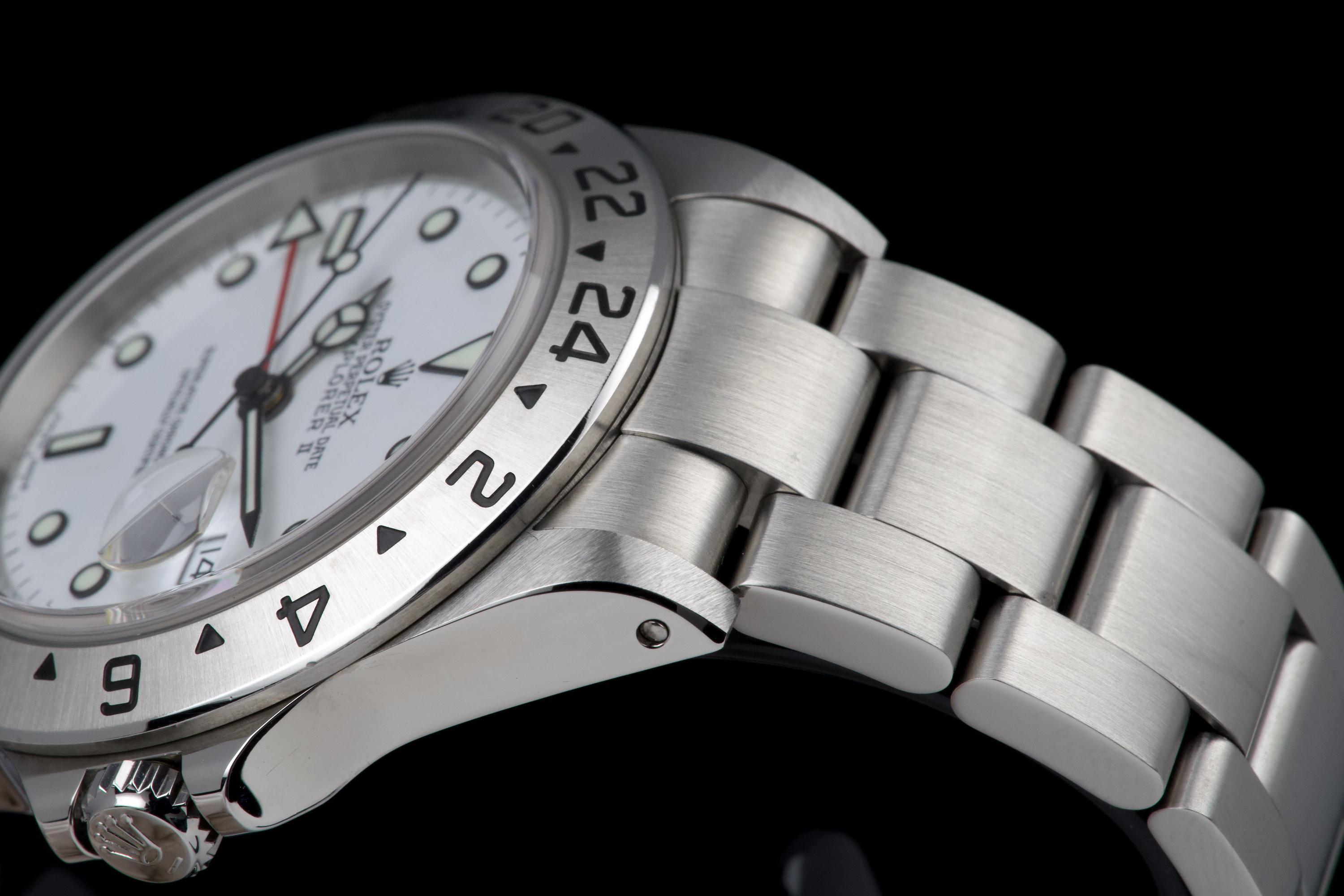 A beautiful example of the Rolex Explorer II “Polar”, featuring the bright white Luminova dial, confirmed as original on the accompanying papers. The watch has been recently polished and is presented in excellent overall condition, showing extremely light wear from use. The stainless steel bezel retains its original factory brushing, and the case remains sharp and clean. Fitted with the Oyster bracelet reference 78790A with solid endlinks, claspcode DE2, and showing very light stretch only. The movement has been serviced by our watchmaker and runs perfectly. Complete with its full 2001 set, including box, warranty papers, and booklets. A superb and crisp example of the classic Explorer II “Polar” — timeless, versatile, and ready to wear.