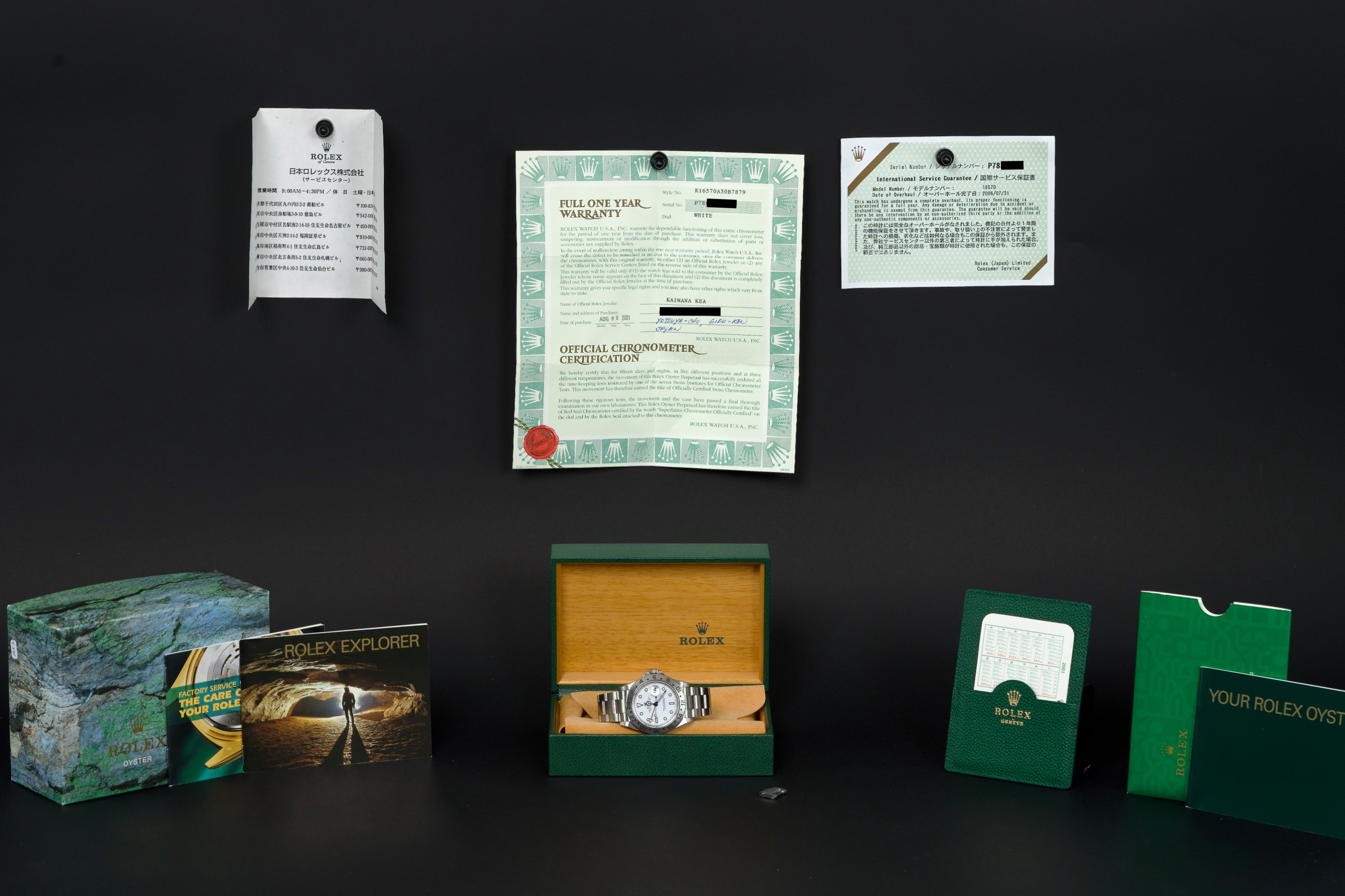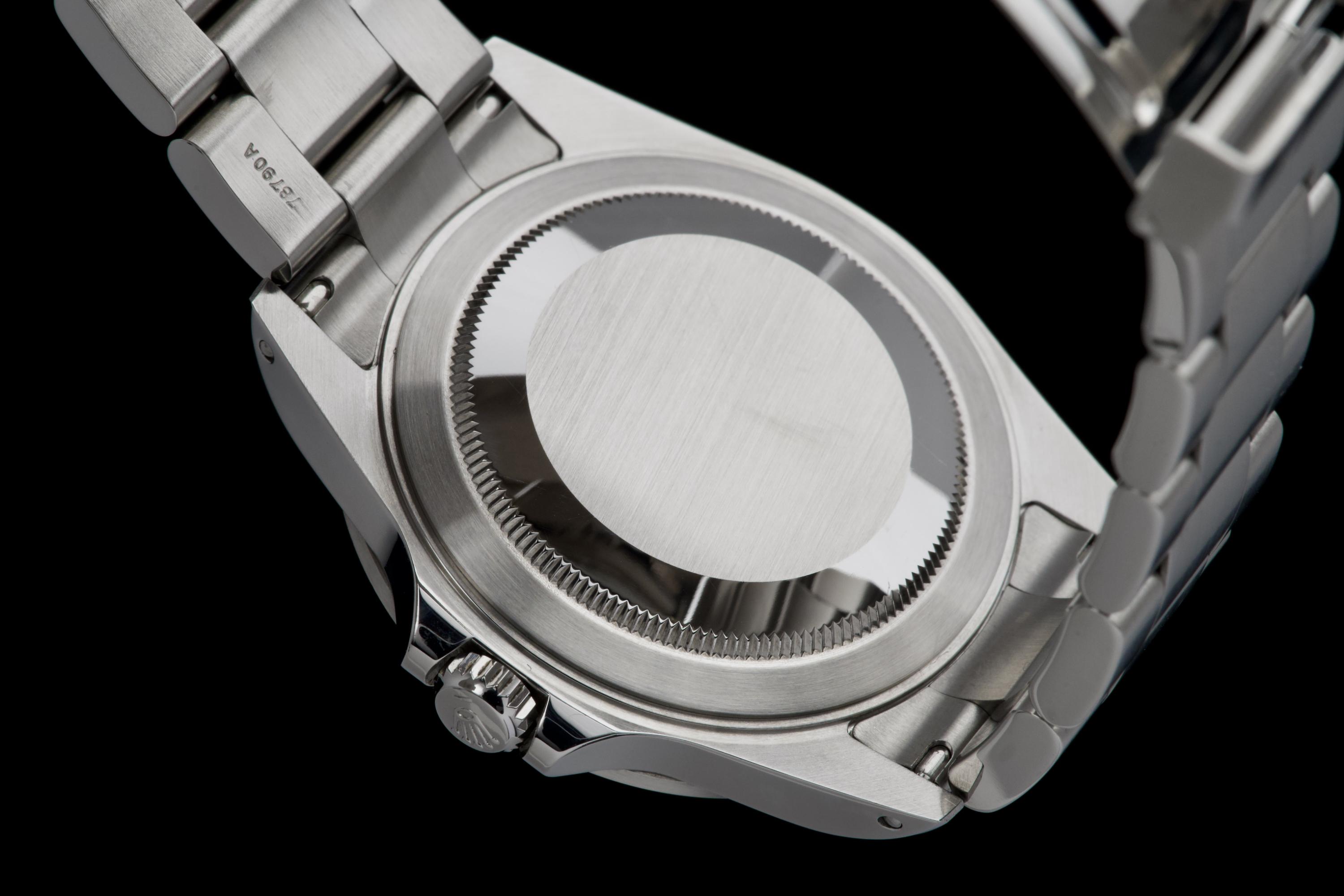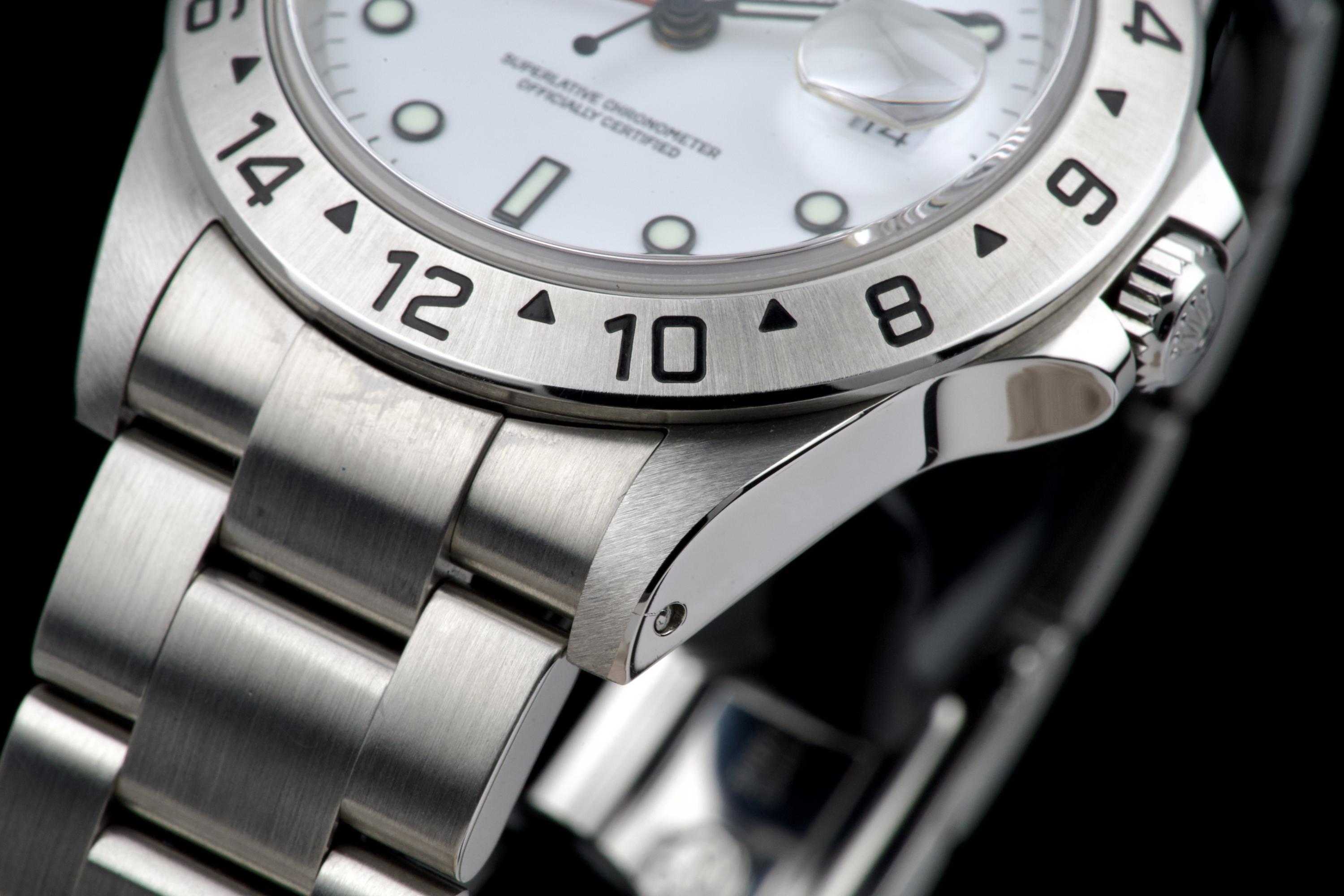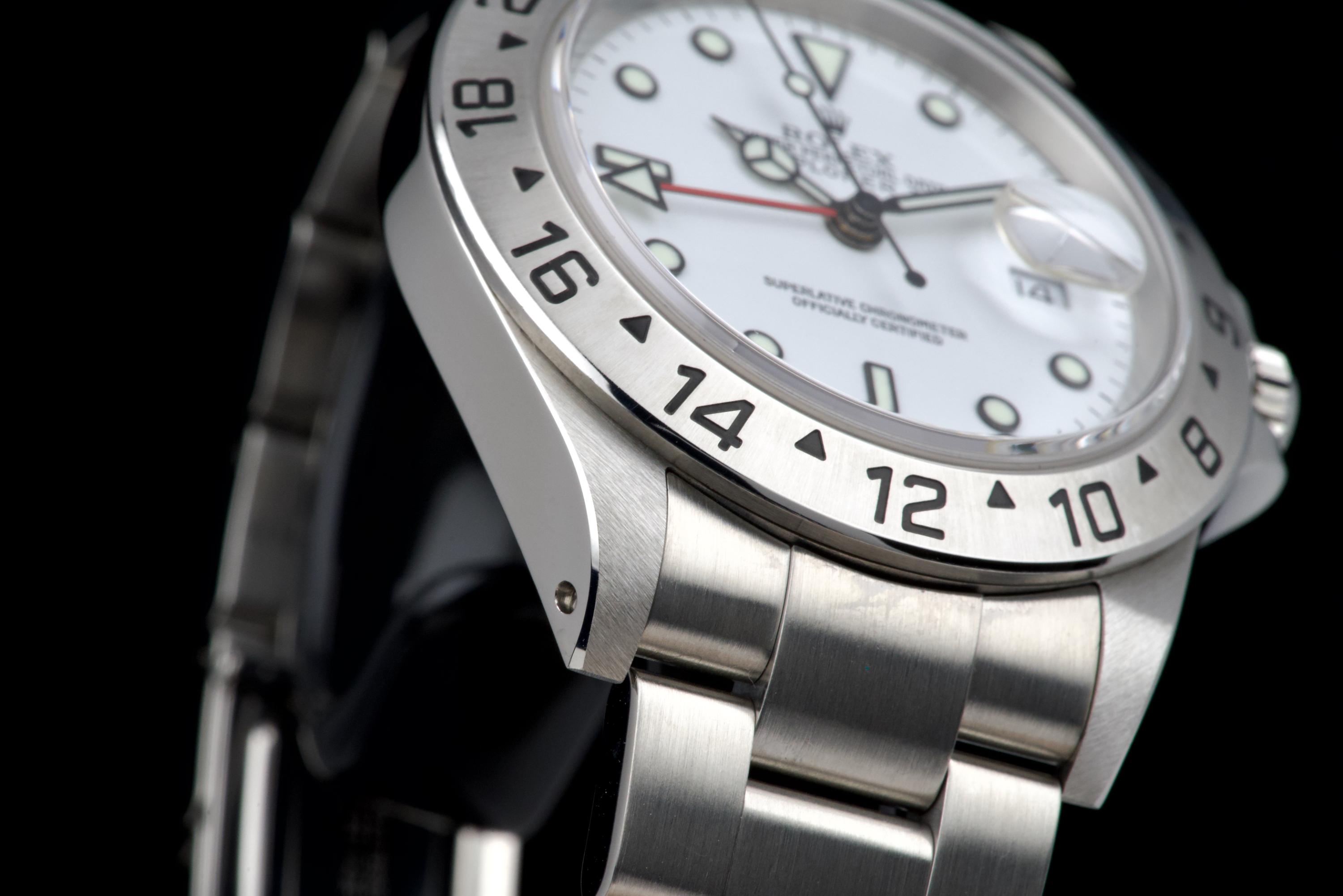 A beautiful example of the Rolex Explorer II “Polar”, featuring the bright white Luminova dial, confirmed as original on the accompanying papers. The watch has been recently polished and is presented in excellent overall condition, showing extremely light wear from use. The stainless steel bezel retains its original factory brushing, and the case remains sharp and clean. Fitted with the Oyster bracelet reference 78790A with solid endlinks, claspcode DE2, and showing very light stretch only. The movement has been serviced by our watchmaker and runs perfectly. Complete with its full 2001 set, including box, warranty papers, and booklets. A superb and crisp example of the classic Explorer II “Polar” — timeless, versatile, and ready to wear.