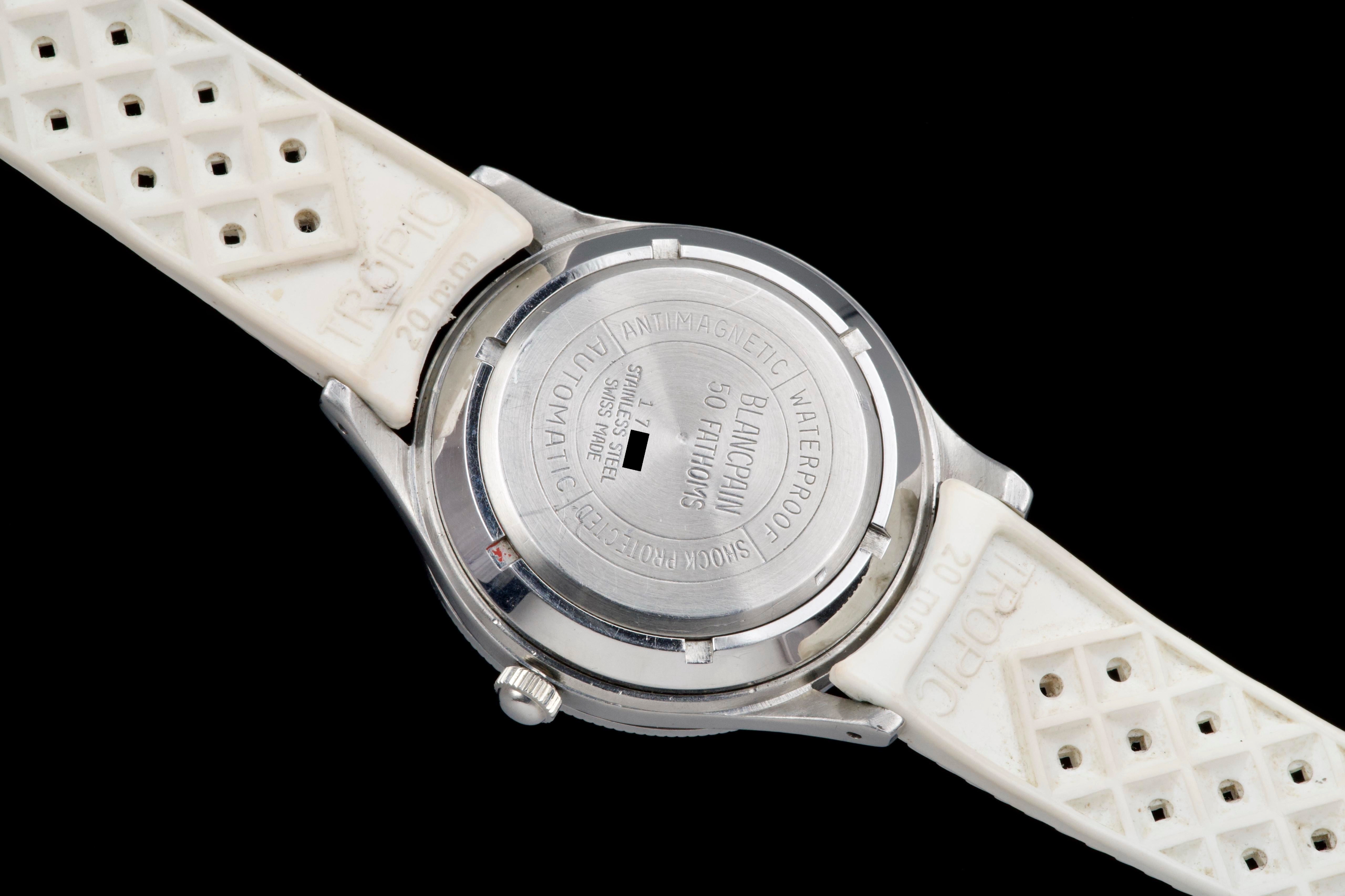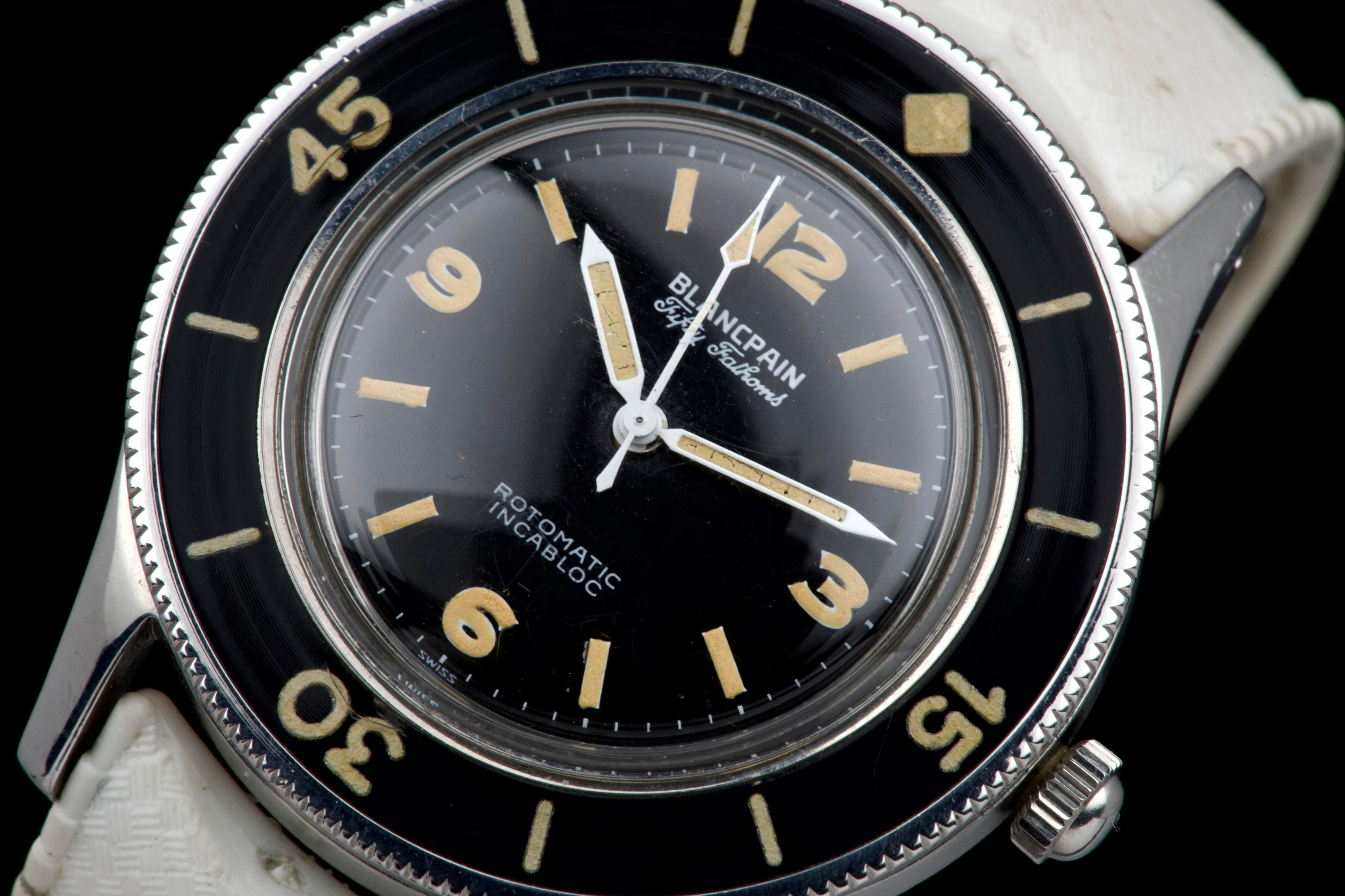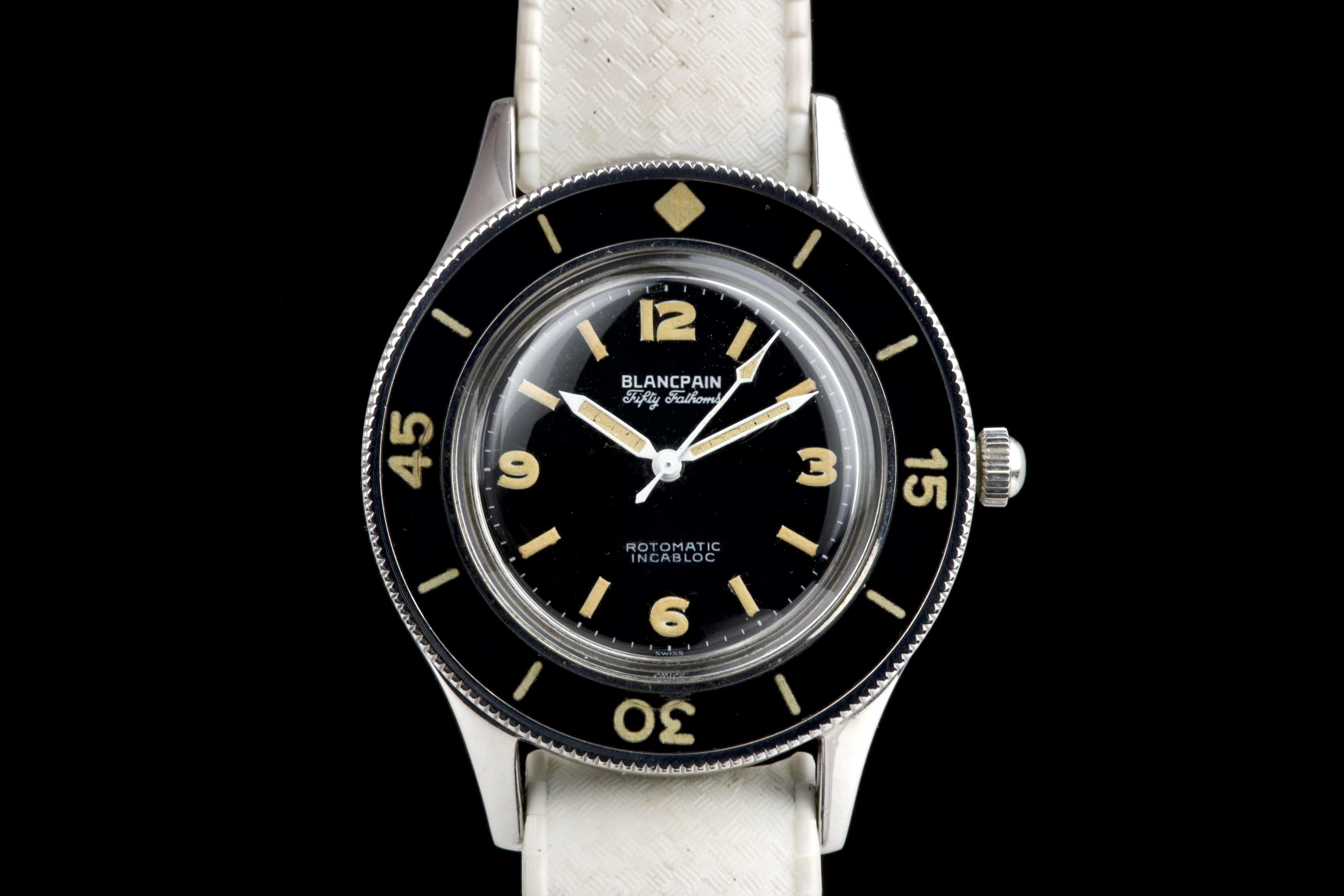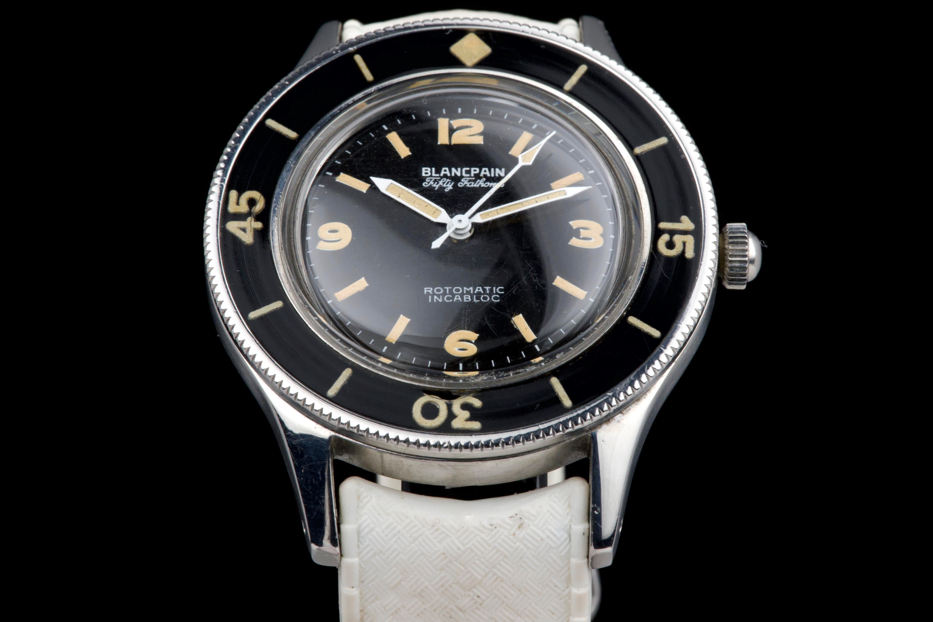 A very rare and early Blancpain Fifty Fathoms, dating to circa 1957, representing one of the foundational models in the history of dive watches. Originally developed in collaboration with the French Navy’s combat diver unit, the Fifty Fathoms set the standard for modern tool watches. This example features a desirable 41 mm stainless steel case, in strong overall condition, preserving the robust proportions of this early diver. The watch is fitted with its original glossy black dial, with white printing and bold Arabic radium hour markers, all preserved in beautiful and highly collectible condition. Finding such well-preserved original dials is increasingly difficult. The original hands retain their radium lume, well matched with the hour markers, though showing minor cracking consistent with age. The watch is also fitted with its original bakelite bezel, which remains in excellent condition. Powering the watch is the automatic Blancpain calibre 1361N, which has been checked by our watchmaker and is running well. The watch will be delivered with a Blancpain Heritage report, confirming its authenticity and correct configuration. An important and highly collectible early Fifty Fathoms, combining military history, originality, and strong overall condition—an essential piece for any serious vintage diver collection.