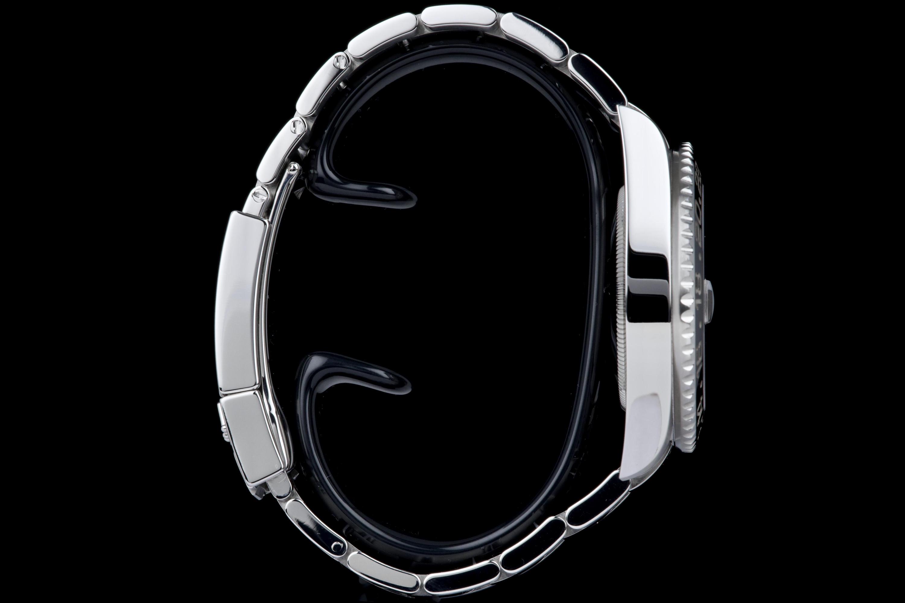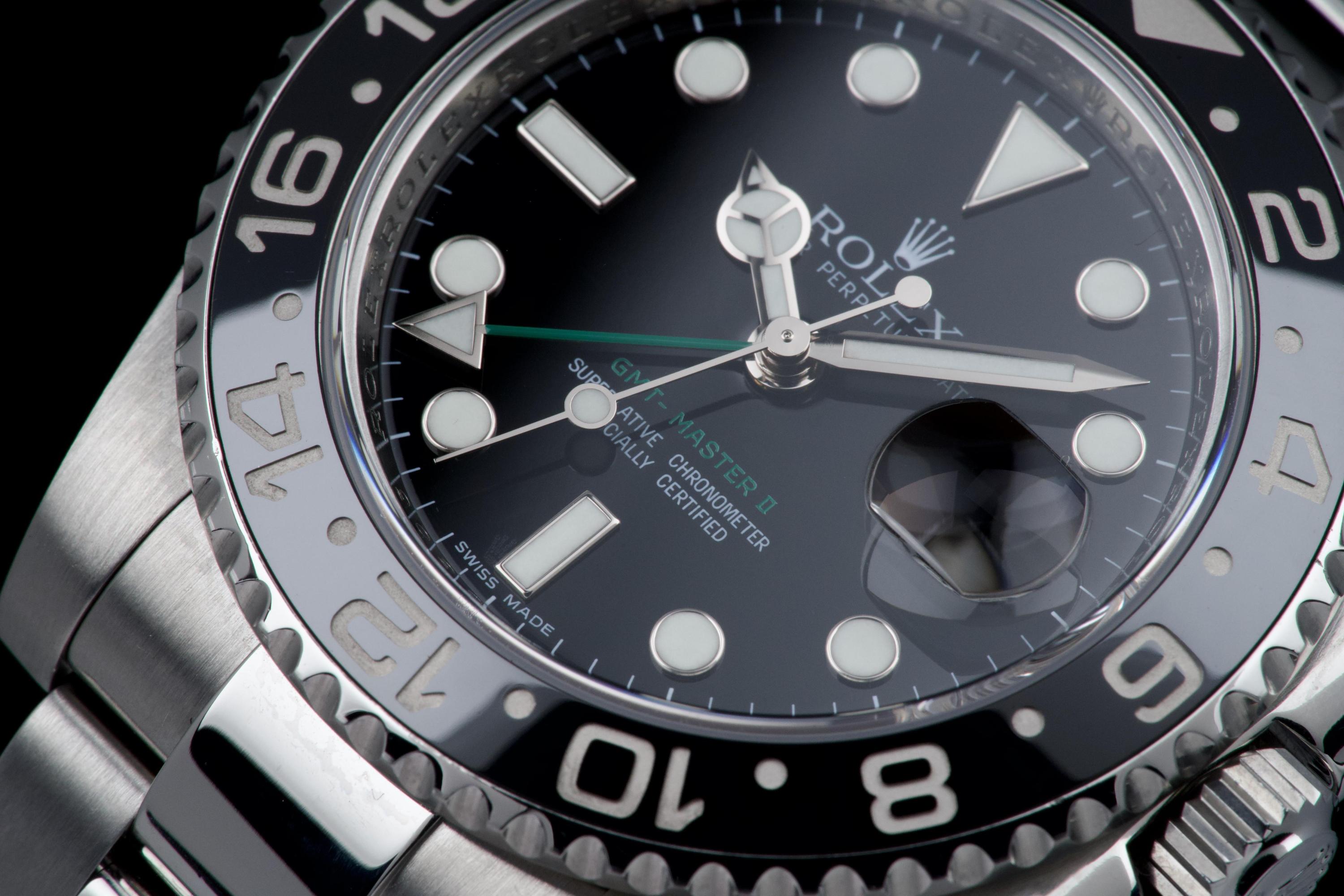 Rolex GMT-Master II, reference 116710LN, stainless steel wristwatch with date, black Cerachrom bezel and bracelet, full set, circa 2009. An iconic travel watch from Rolex’s professional line, the present GMT-Master II reference 116710LN is offered in excellent condition and accompanied by its original accessories. Produced in 2009, the model features the classic black dial paired with a black Cerachrom bezel insert, a highly durable ceramic material resistant to scratches and fading. The watch is housed in a 40 mm stainless steel Oyster case with crown guards and a Triplock screw-down crown, ensuring robustness and water resistance suitable for everyday wear. The black dial is fitted with applied luminous hour markers and Mercedes hands, complemented by the characteristic green 24-hour hand allowing the wearer to track a second time zone. A sapphire crystal with Cyclops magnifier is positioned above the date aperture at 3 o’clock. Powering the watch is Rolex’s reliable automatic GMT movement, designed for precision and practicality when travelling, with an independently adjustable local hour hand. The watch is presented on its original stainless steel Oyster bracelet with Oysterlock clasp. It was fully serviced and carefully polished by Rolex in 2026, ensuring excellent mechanical performance and a very attractive overall presentation. Originally sold in 2009, the watch is offered as a full set, including its original box, warranty card and accessories; however, the outer box is missing. Combining technical robustness with timeless design, this GMT-Master II 116710LN represents an excellent opportunity to acquire a well-maintained example of one of Rolex’s most recognizable modern sports watches.