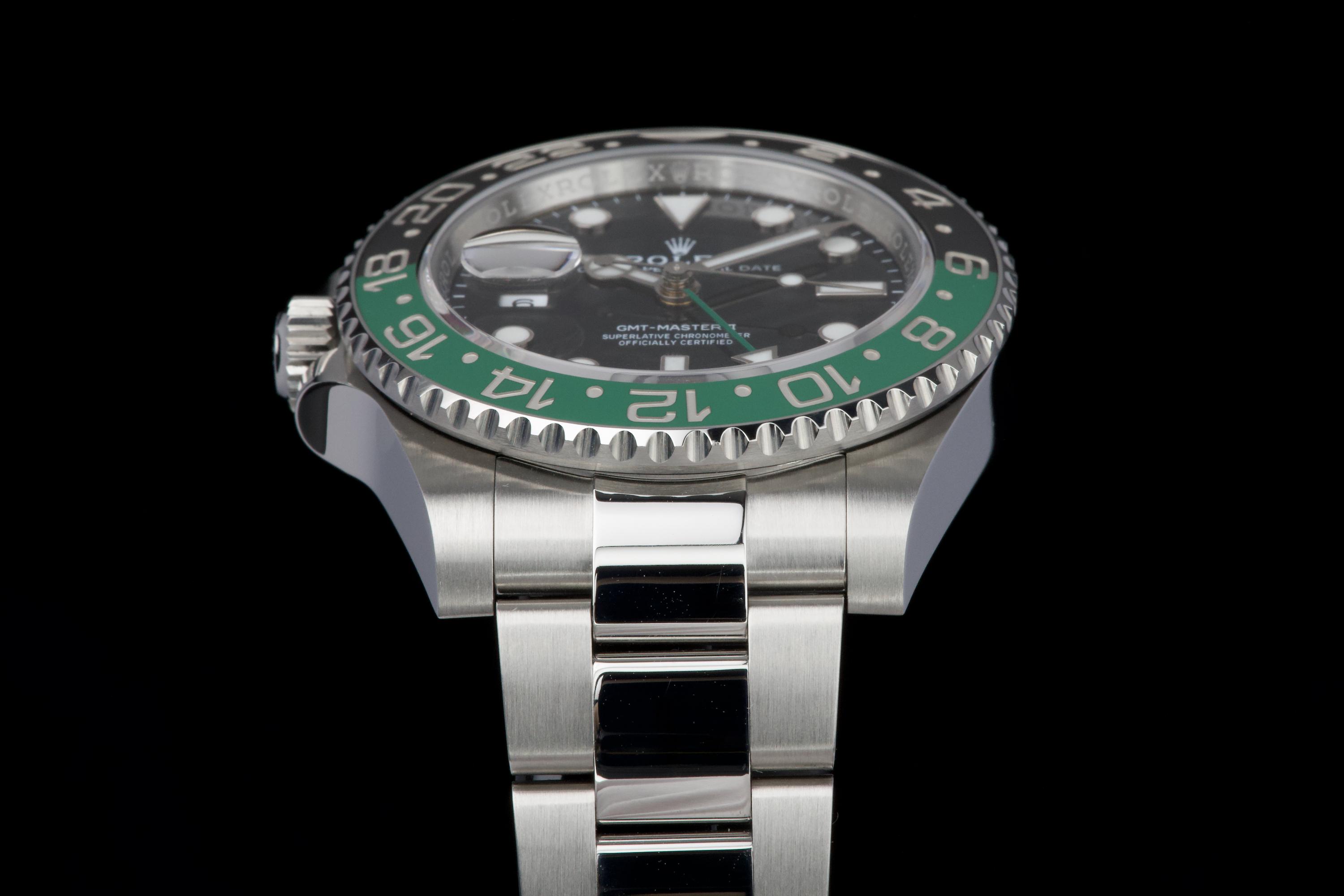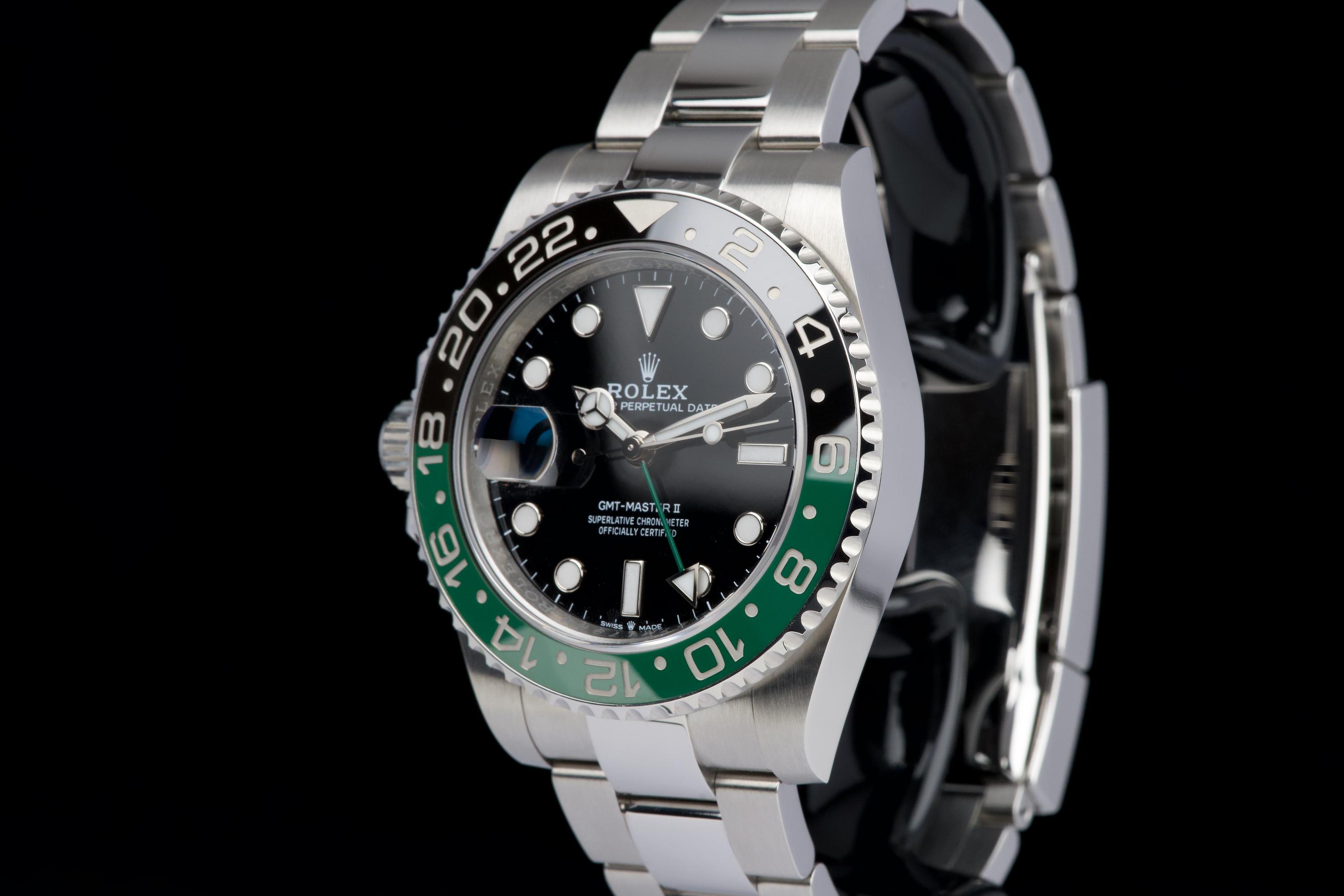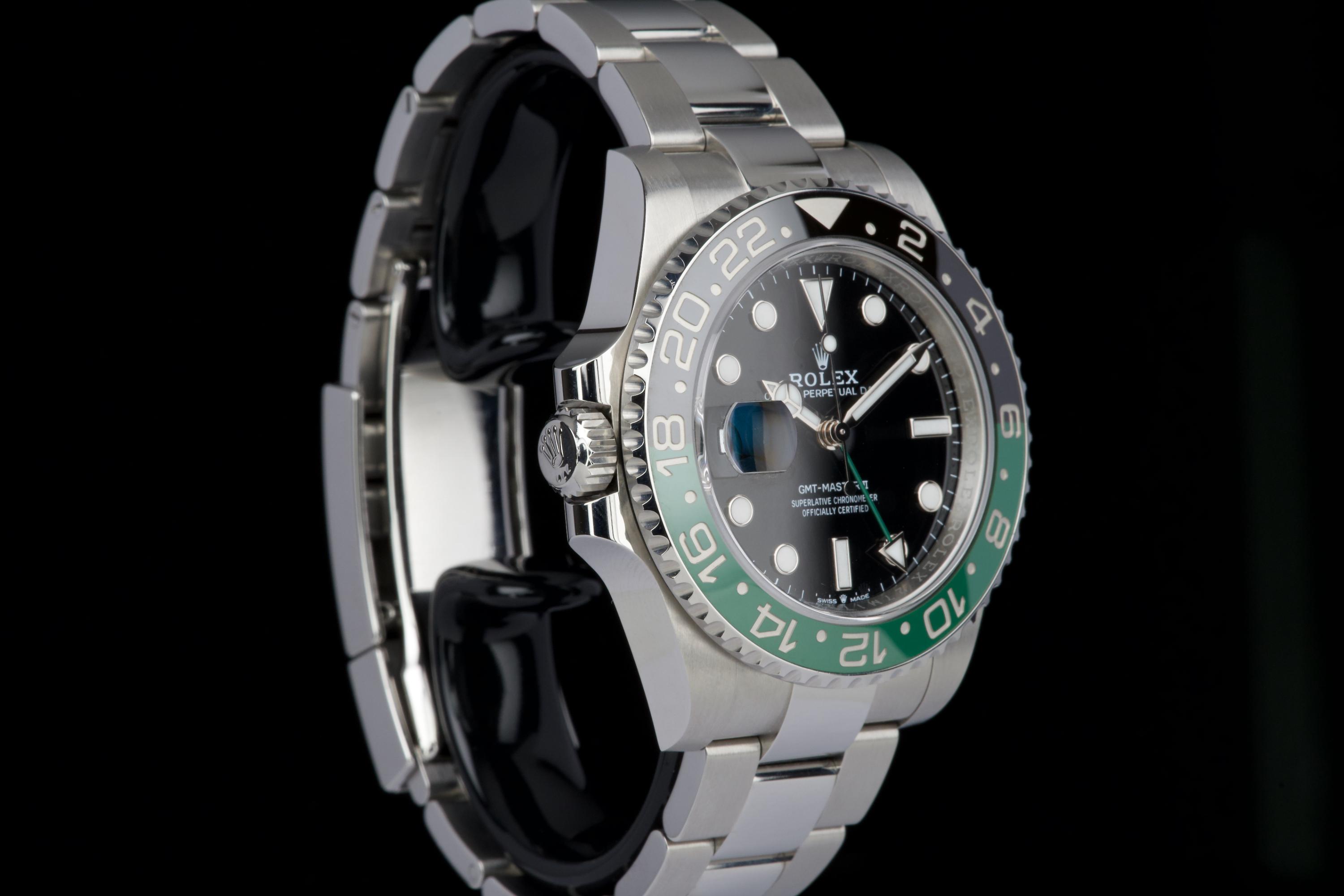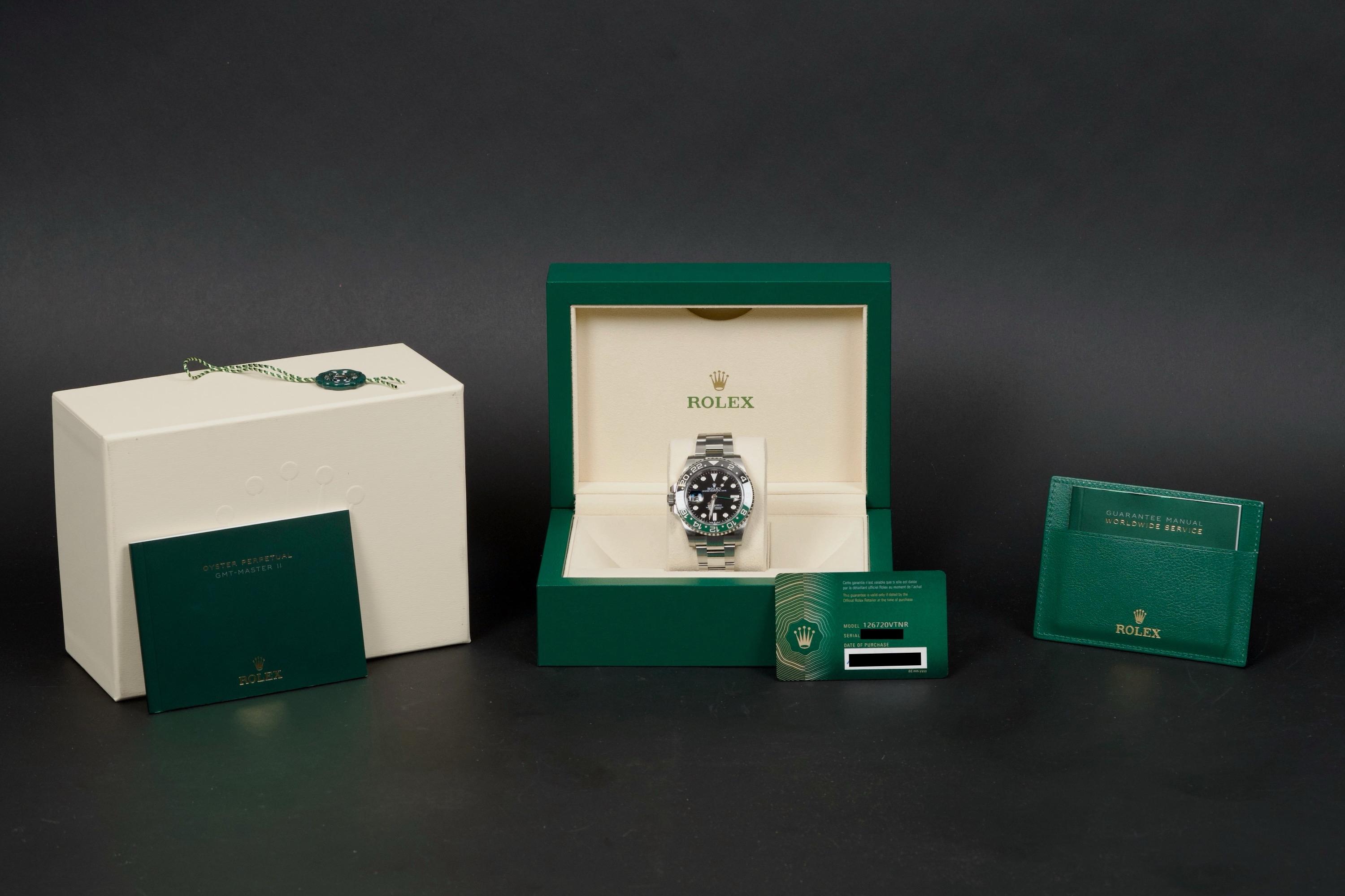 The present Rolex GMT-Master II reference 126720VTNR, offered here as a complete full set and dating to 2023, is a striking and highly sought-after modern interpretation of Rolex’s iconic travel watch. Instantly recognizable for its left-handed configuration, with the crown positioned on the left side of the case, this reference has become one of the most distinctive contemporary GMT-Master II models. The watch is fitted with its original Oyster bracelet and shows only very light wear from use, presenting in excellent overall unpolished condition with clean surfaces and sharp lines throughout the case and bracelet. The black dial and black-and-green Cerachrom bezel remain flawless, offering a bold yet balanced aesthetic that defines this reference. Delivered as a full set, this GMT-Master II 126720VTNR represents an appealing opportunity to acquire a modern Rolex sports watch in outstanding condition, combining contemporary design, technical reliability, and strong collectability.