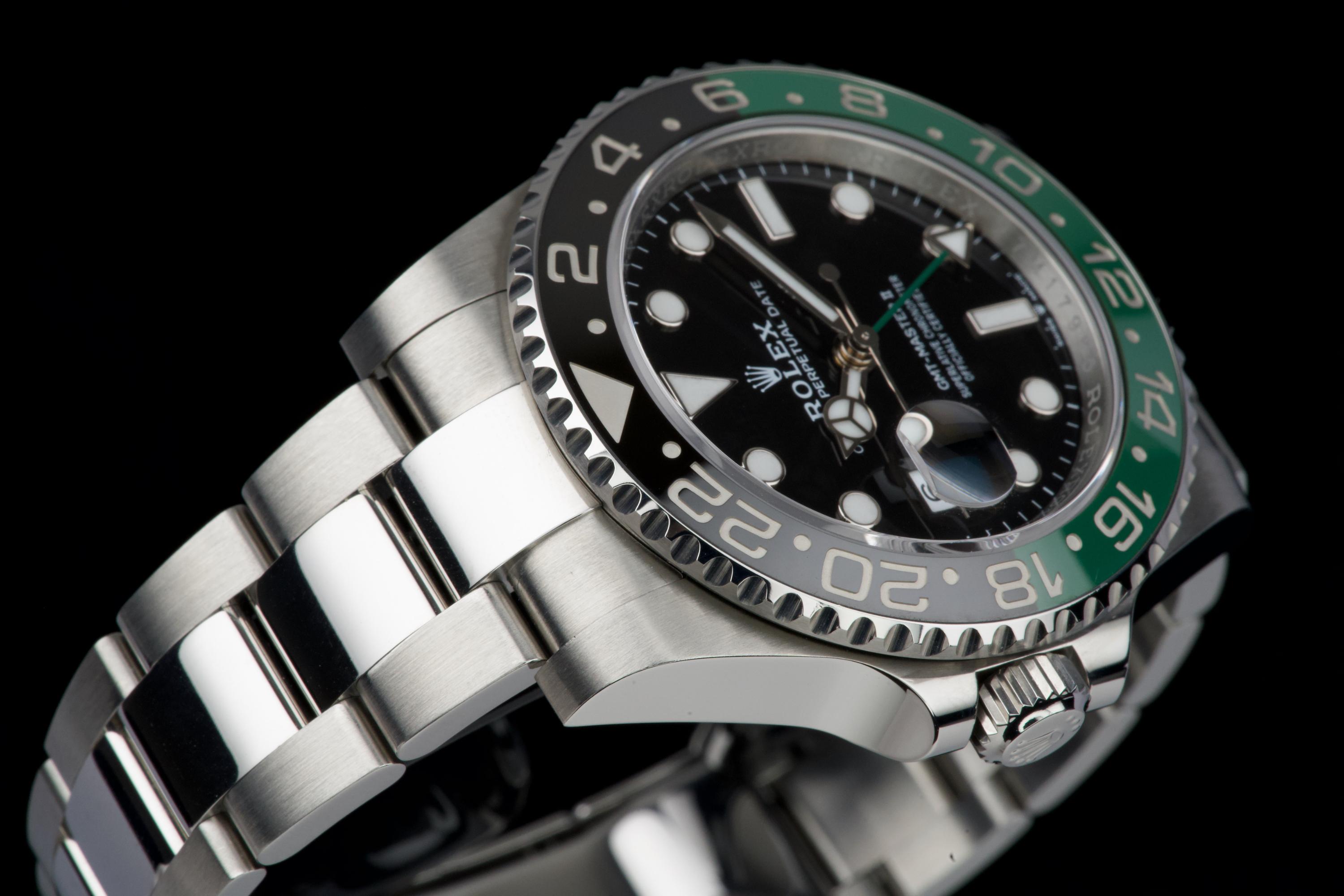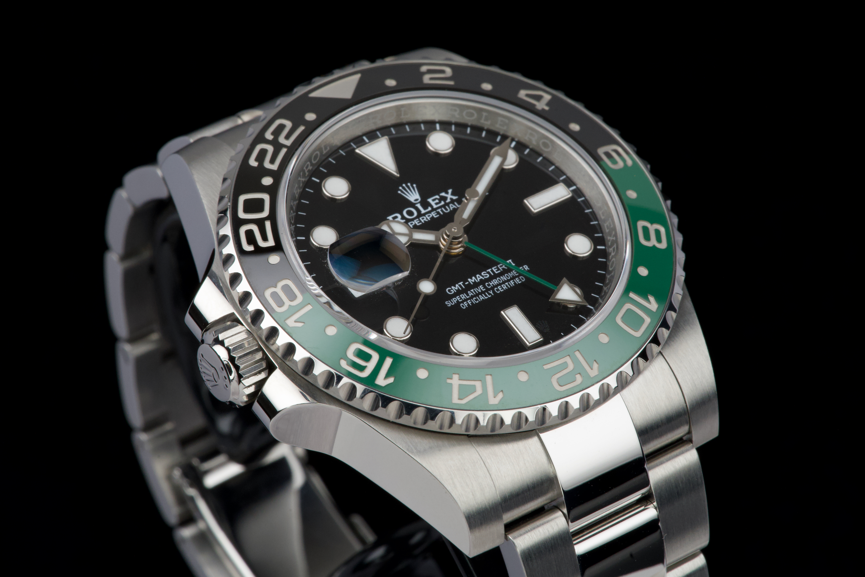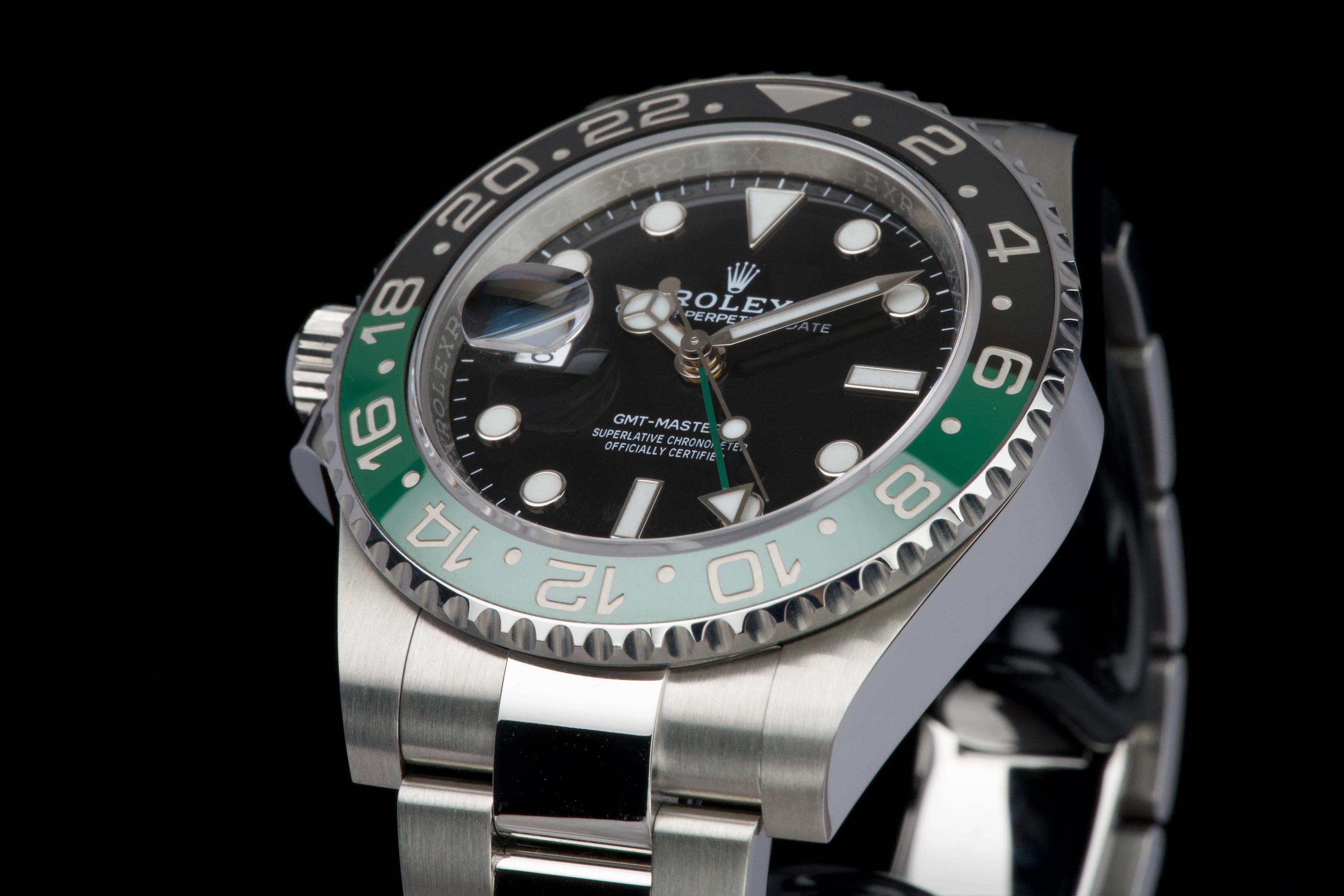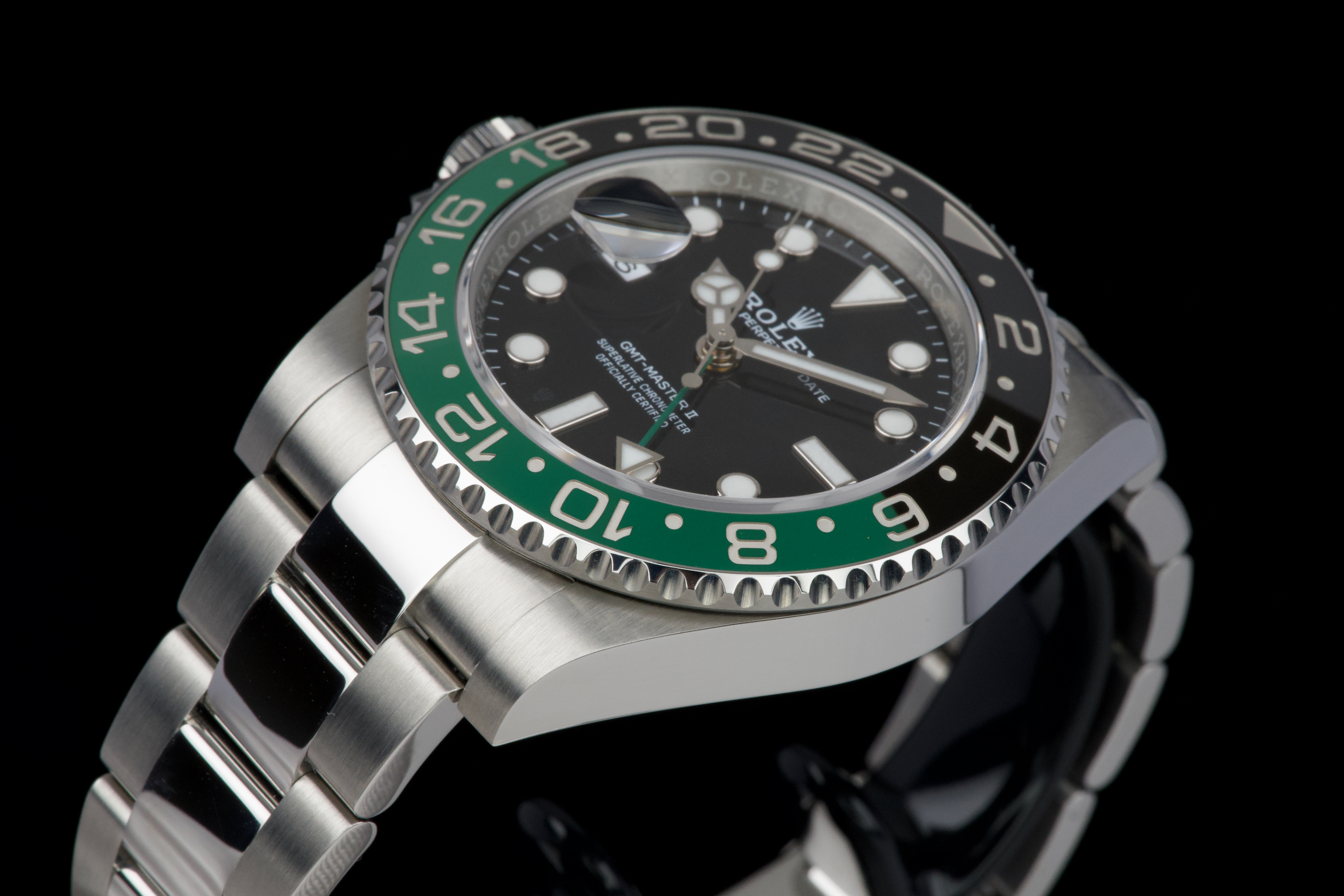 The present Rolex GMT-Master II reference 126720VTNR, offered here as a complete full set and dating to 2023, is a striking and highly sought-after modern interpretation of Rolex’s iconic travel watch. Instantly recognizable for its left-handed configuration, with the crown positioned on the left side of the case, this reference has become one of the most distinctive contemporary GMT-Master II models. The watch is fitted with its original Oyster bracelet and shows only very light wear from use, presenting in excellent overall unpolished condition with clean surfaces and sharp lines throughout the case and bracelet. The black dial and black-and-green Cerachrom bezel remain flawless, offering a bold yet balanced aesthetic that defines this reference. Delivered as a full set, this GMT-Master II 126720VTNR represents an appealing opportunity to acquire a modern Rolex sports watch in outstanding condition, combining contemporary design, technical reliability, and strong collectability.