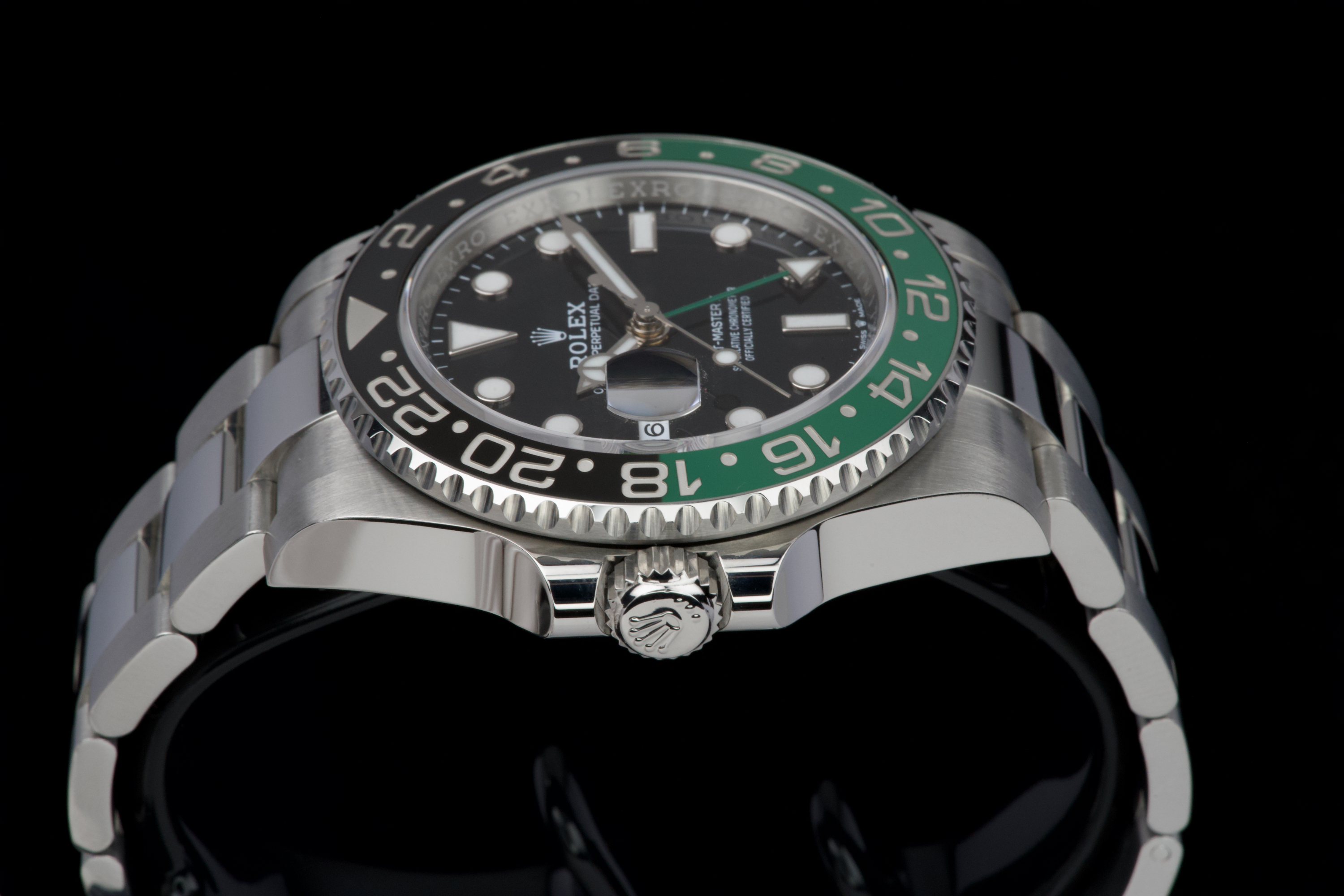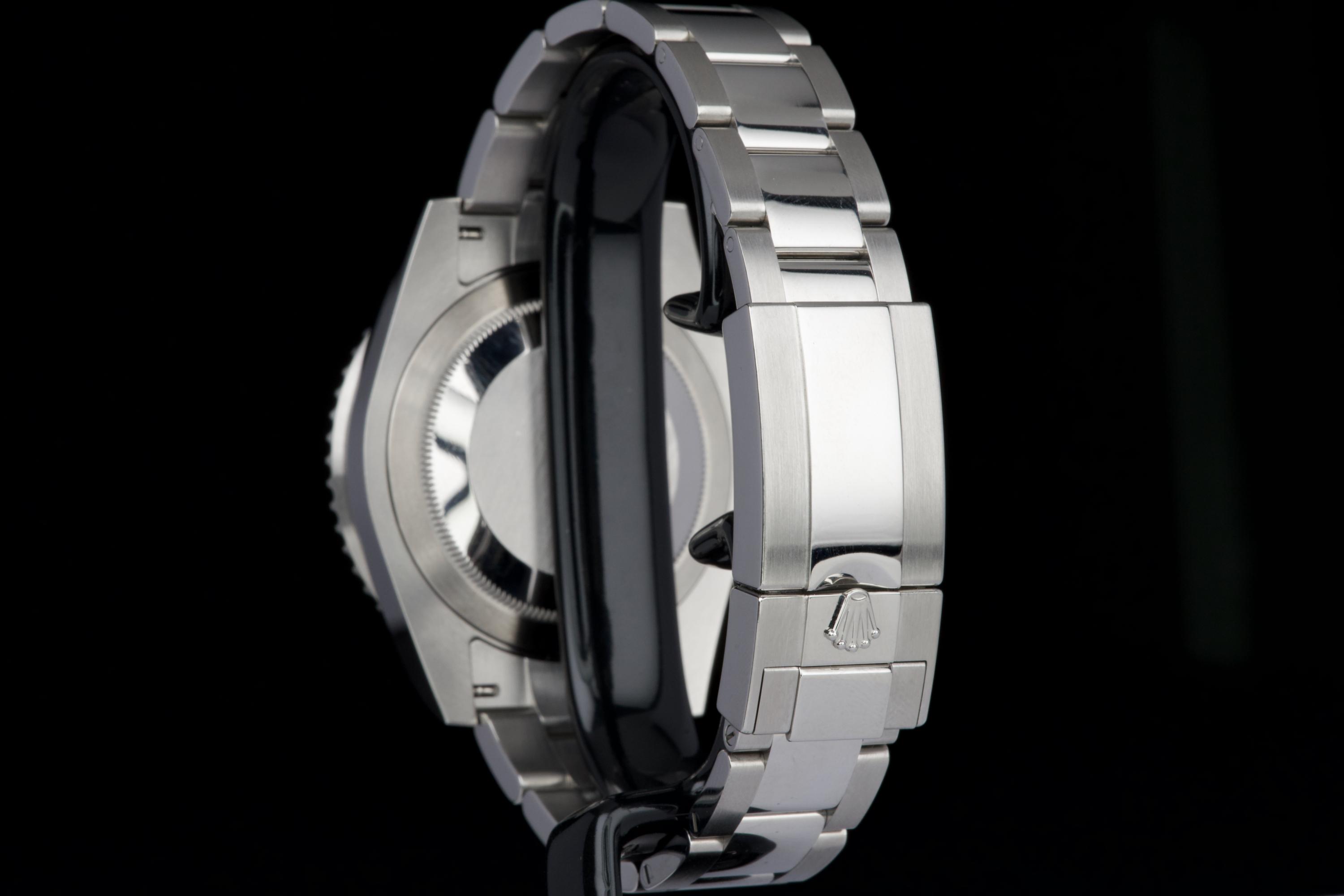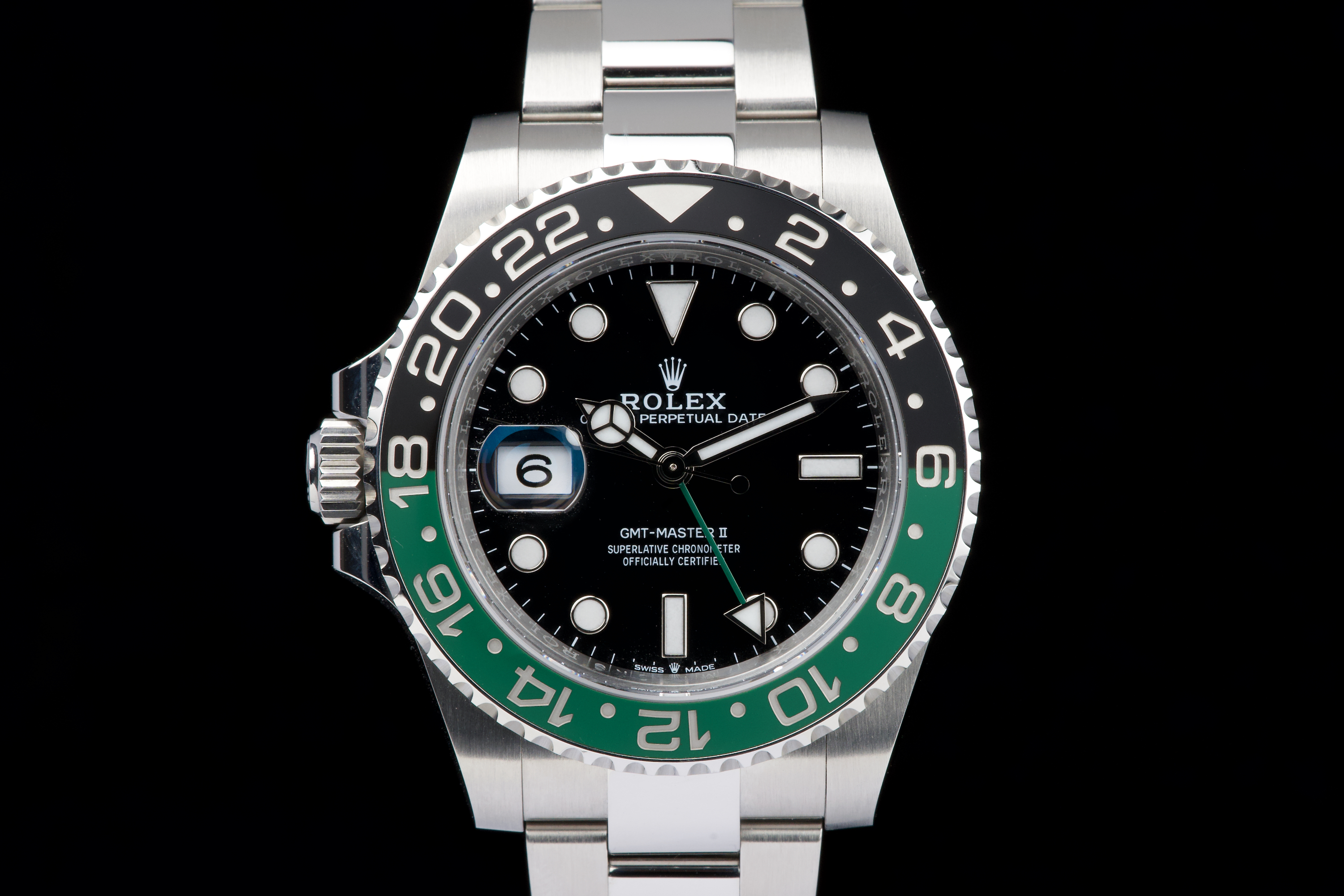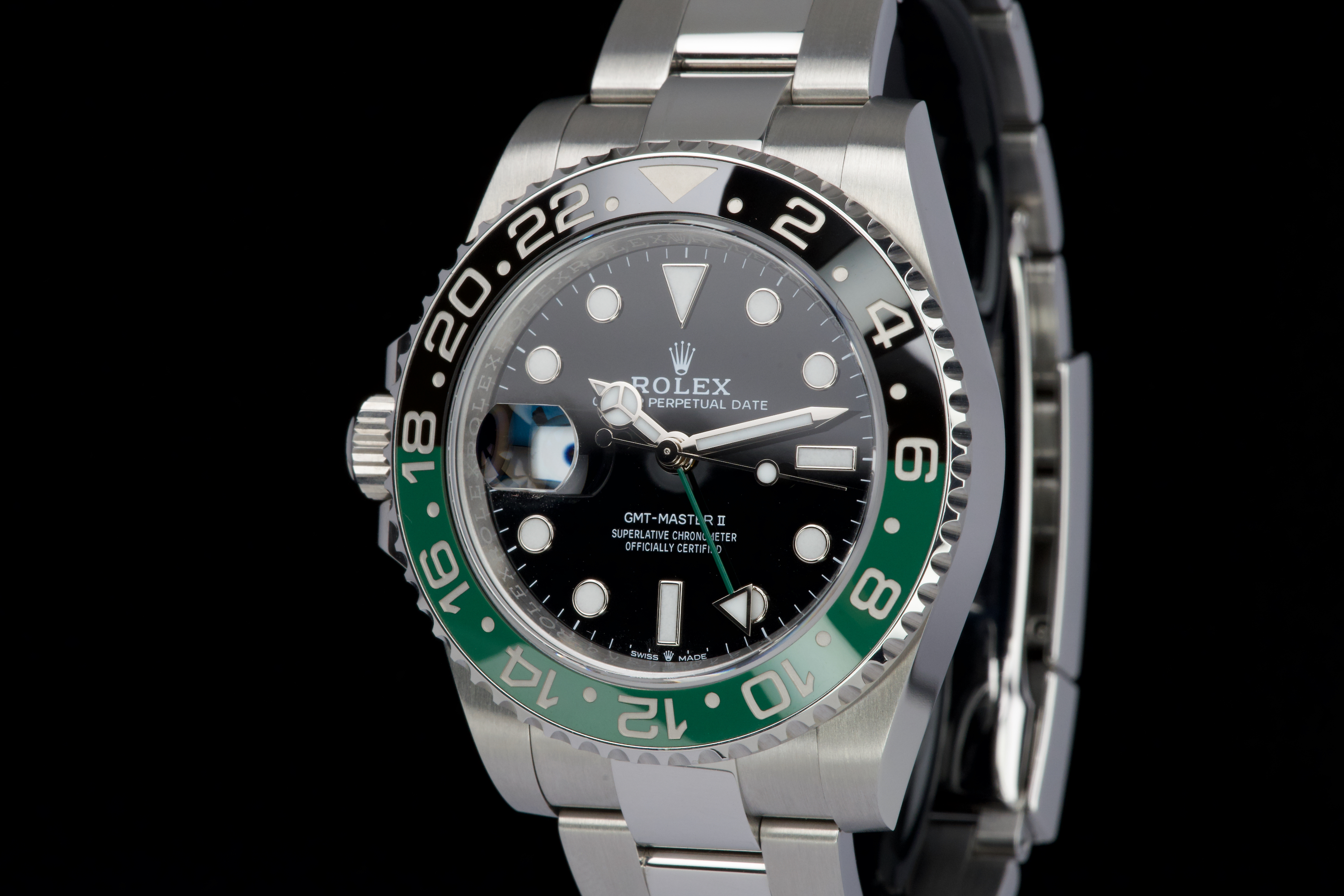 The present Rolex GMT-Master II reference 126720VTNR, offered here as a complete full set and dating to 2023, is a striking and highly sought-after modern interpretation of Rolex’s iconic travel watch. Instantly recognizable for its left-handed configuration, with the crown positioned on the left side of the case, this reference has become one of the most distinctive contemporary GMT-Master II models. The watch is fitted with its original Oyster bracelet and shows only very light wear from use, presenting in excellent overall unpolished condition with clean surfaces and sharp lines throughout the case and bracelet. The black dial and black-and-green Cerachrom bezel remain flawless, offering a bold yet balanced aesthetic that defines this reference. Delivered as a full set, this GMT-Master II 126720VTNR represents an appealing opportunity to acquire a modern Rolex sports watch in outstanding condition, combining contemporary design, technical reliability, and strong collectability.