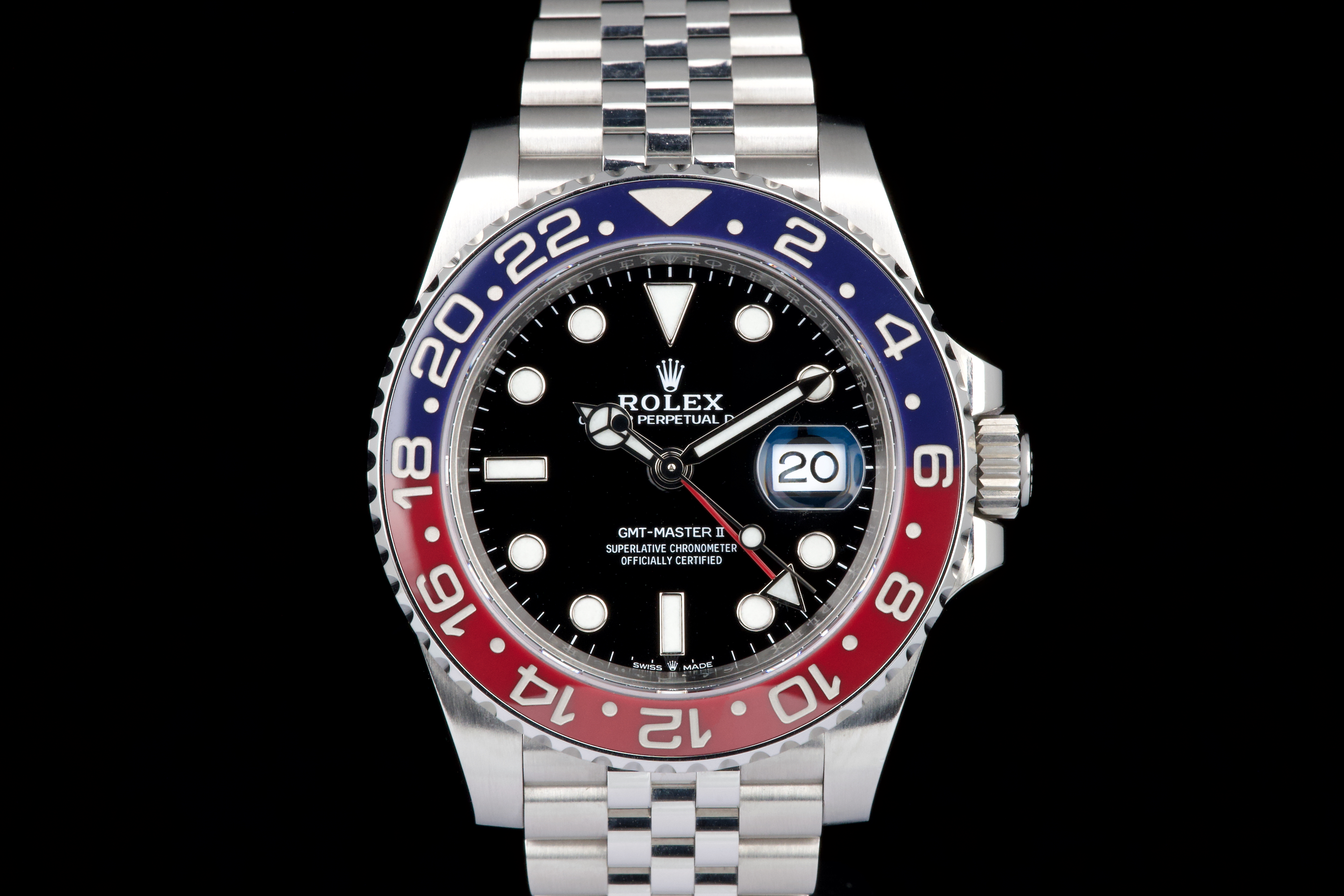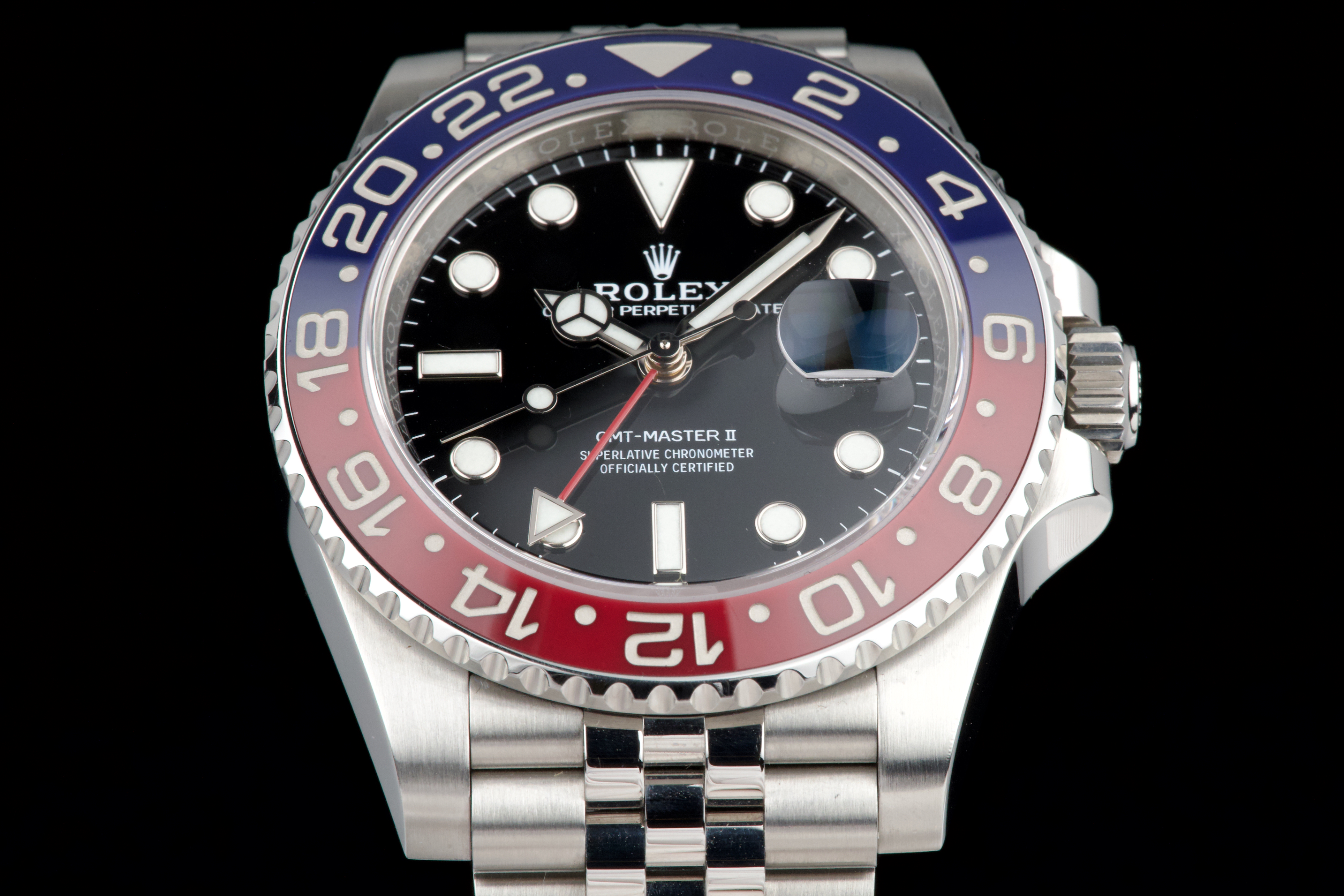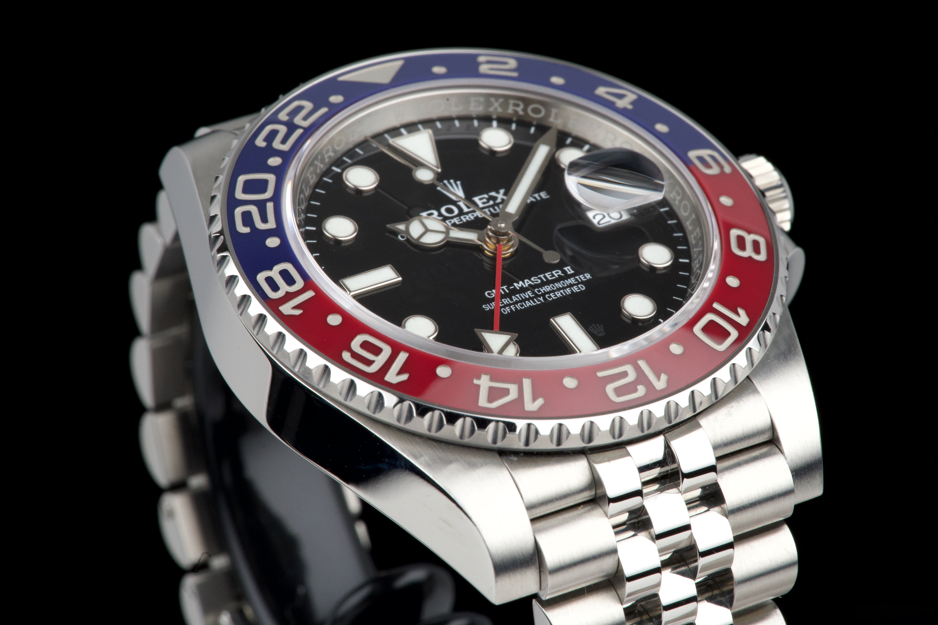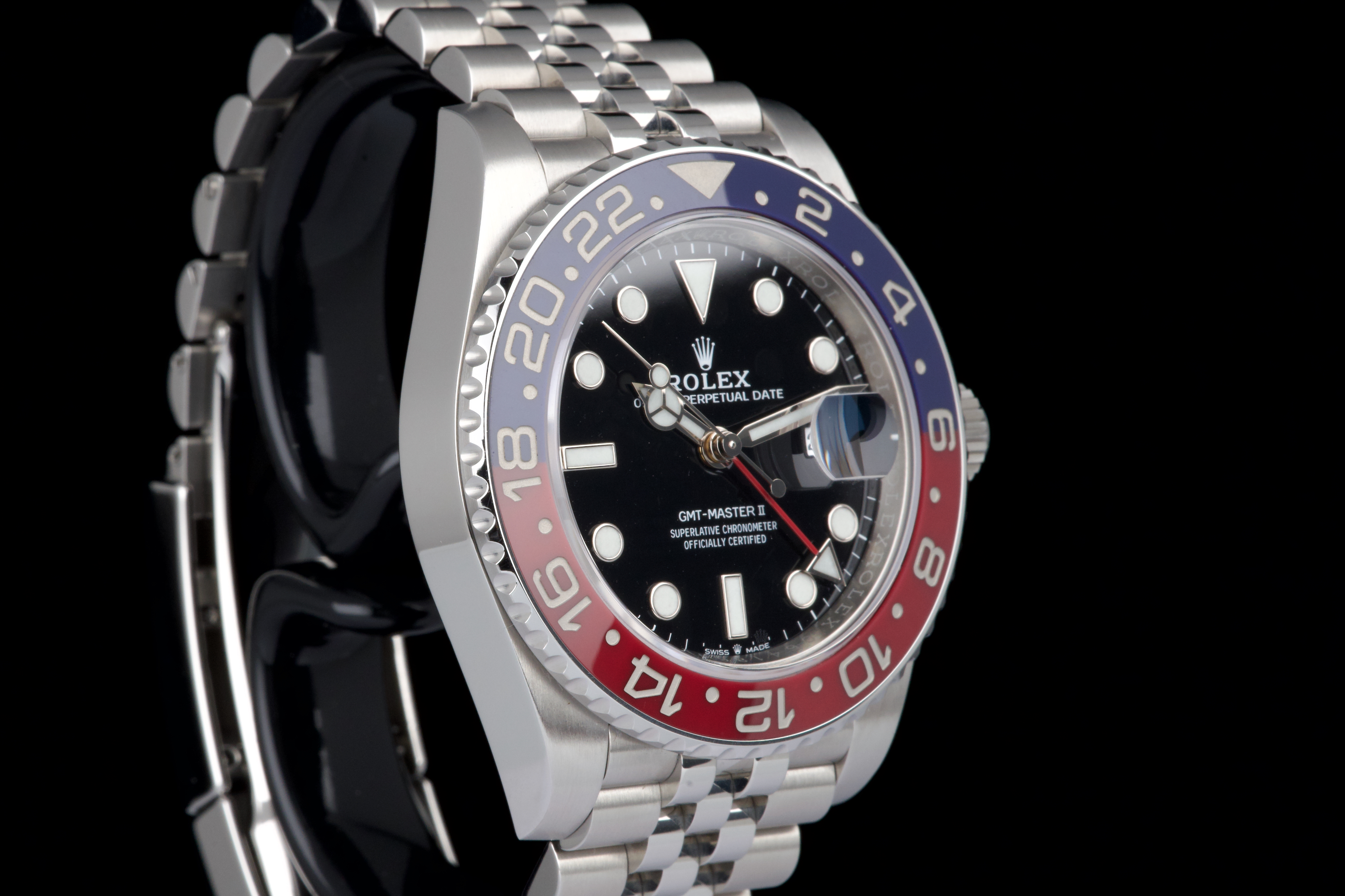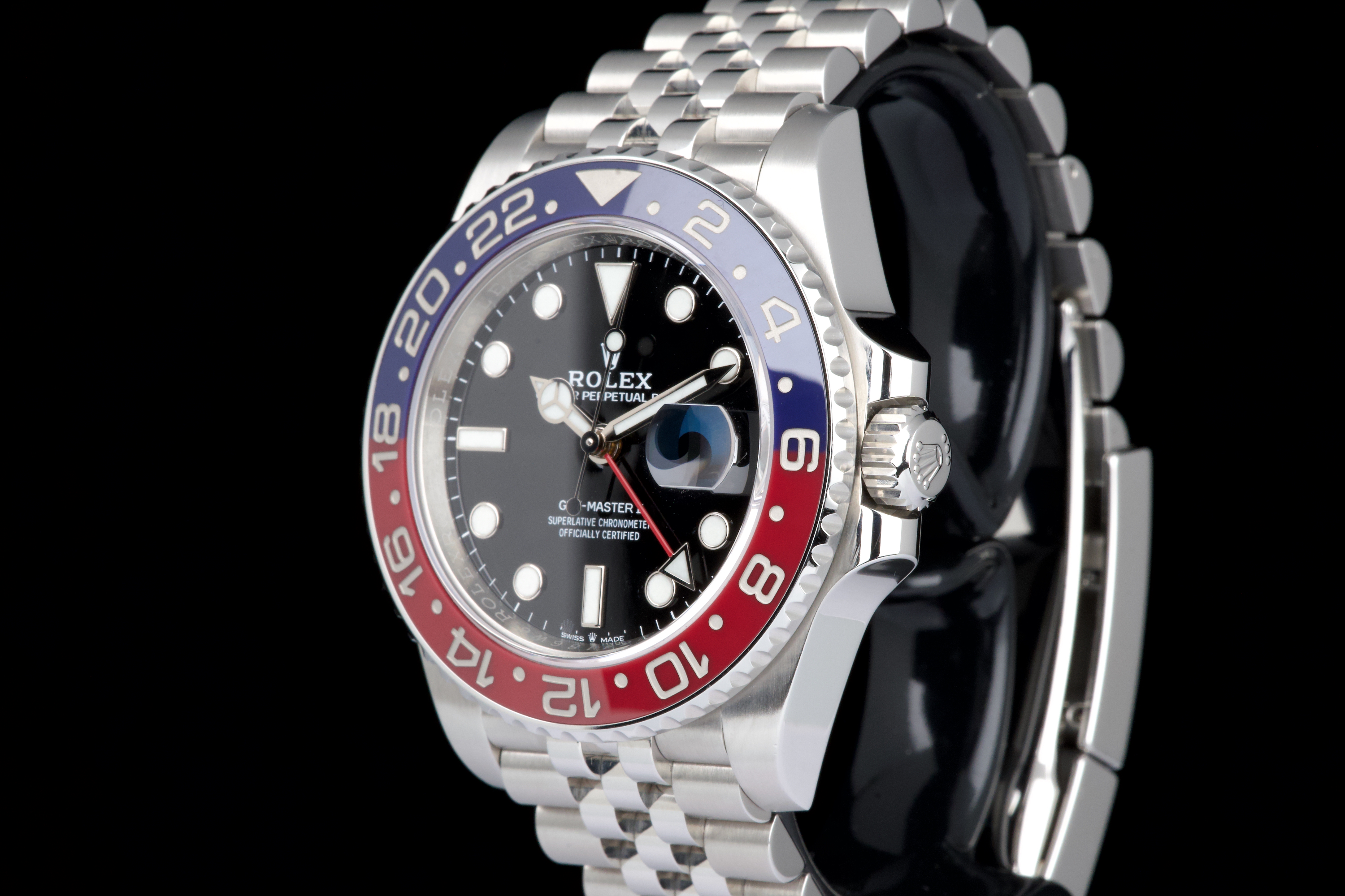The present Rolex GMT-Master II “Pepsi” reference 126710BLRO, dating to 2018, is offered here as a complete full set from its original owner, with Swiss papers, and belongs to the desirable Mk1 configuration of the reference. The watch has just been fully serviced and professionally polished by Rolex, and is presented in perfect overall condition, with a crisp case, clean bracelet, and flawless appearance throughout. As an early Mk1 example, it features the first execution of the modern blue and red Cerachrom “Pepsi” bezel, a detail particularly appreciated by collectors. The watch is fitted with the elegant and comfortable Jubilee bracelet, enhancing both wearability and its classic aesthetic. Powered by Rolex’s in-house calibre 3285, the watch offers dual time-zone functionality, excellent precision, and a 70-hour power reserve. Delivered as a full set from 2018 and freshly serviced by the manufacture, this GMT-Master II “Pepsi” Mk1 represents an outstanding opportunity to acquire an early and highly collectible example of one of Rolex’s most iconic contemporary models.