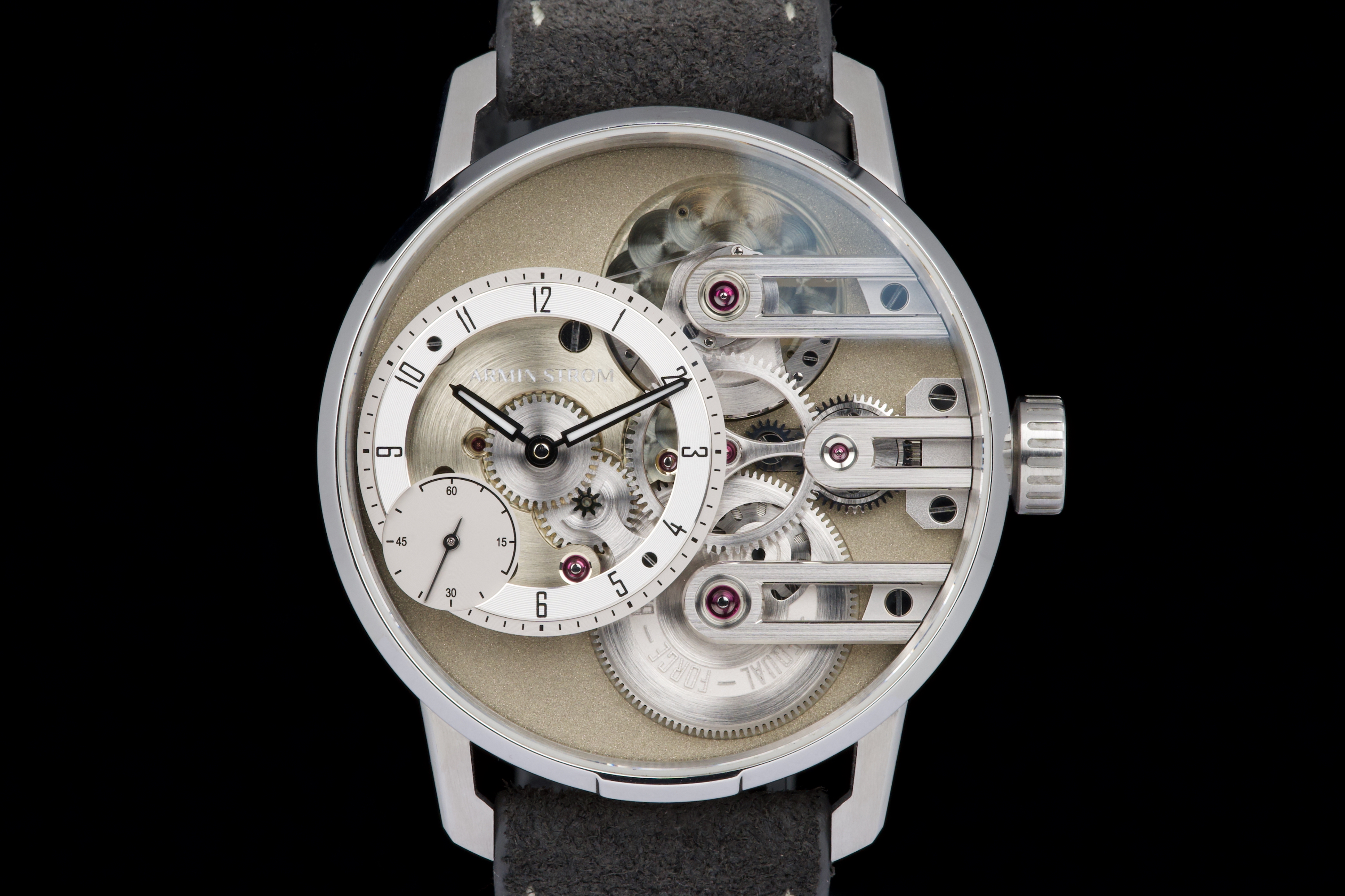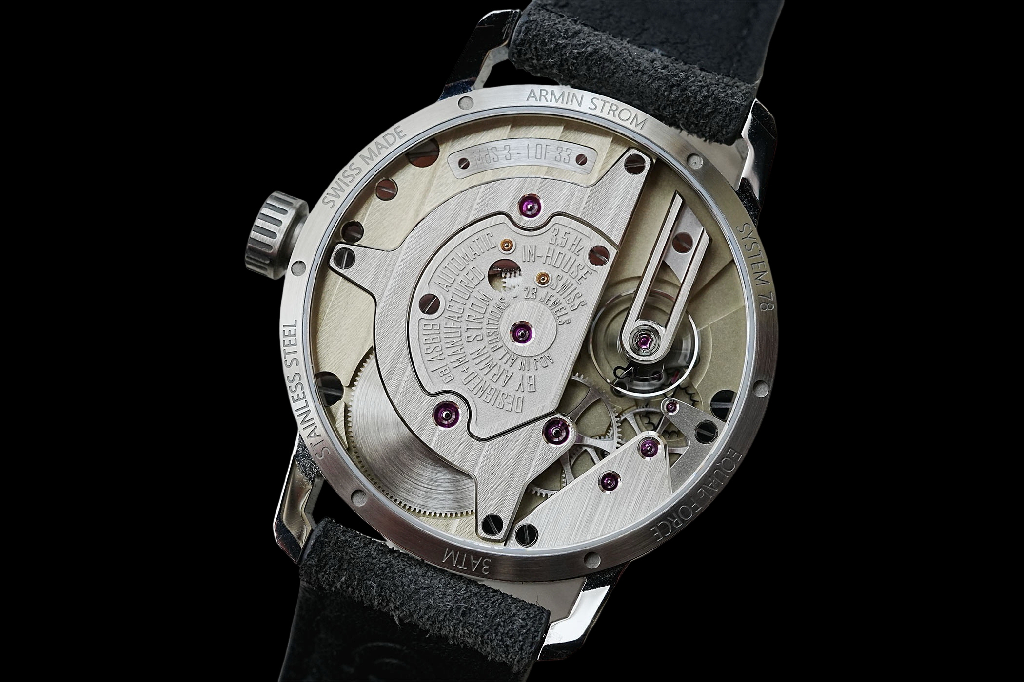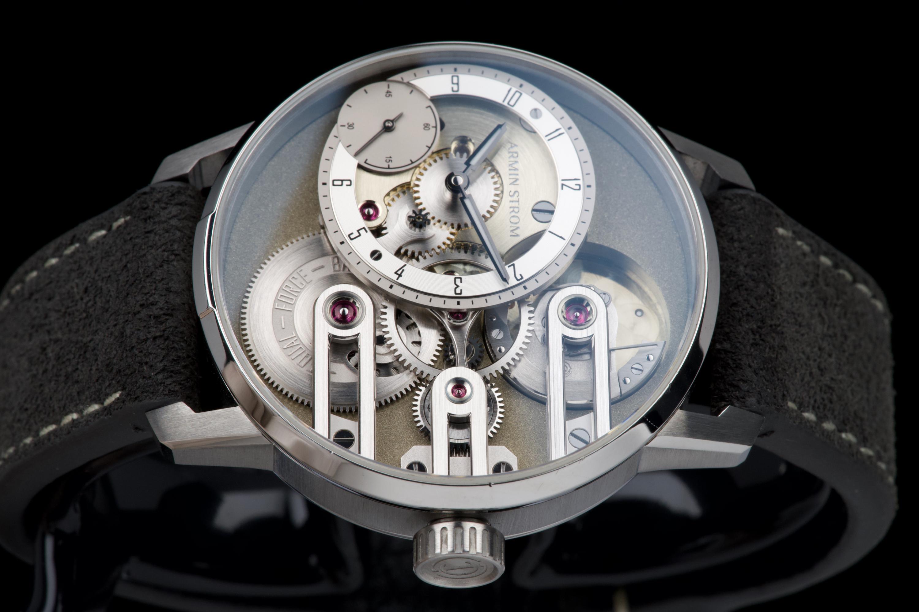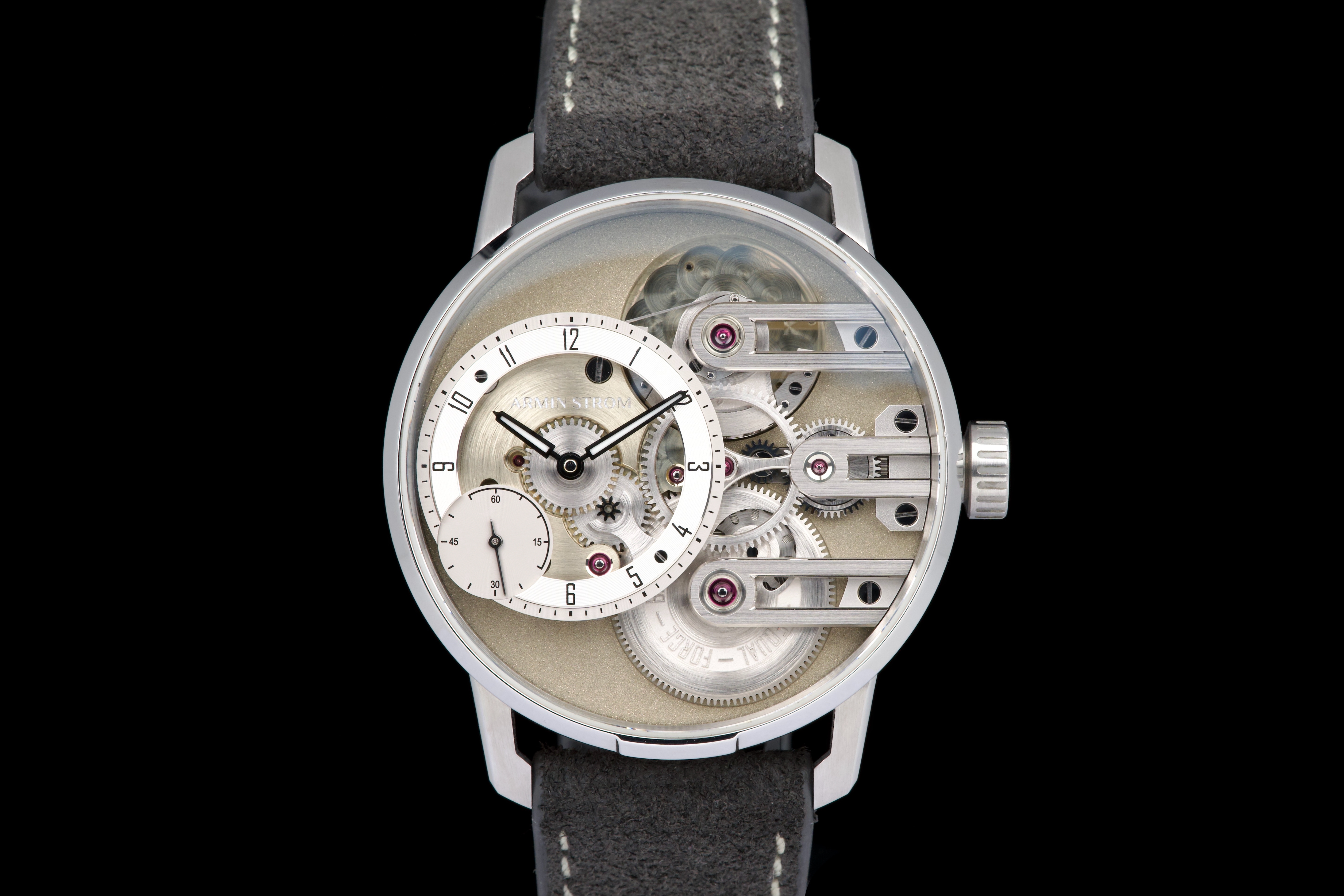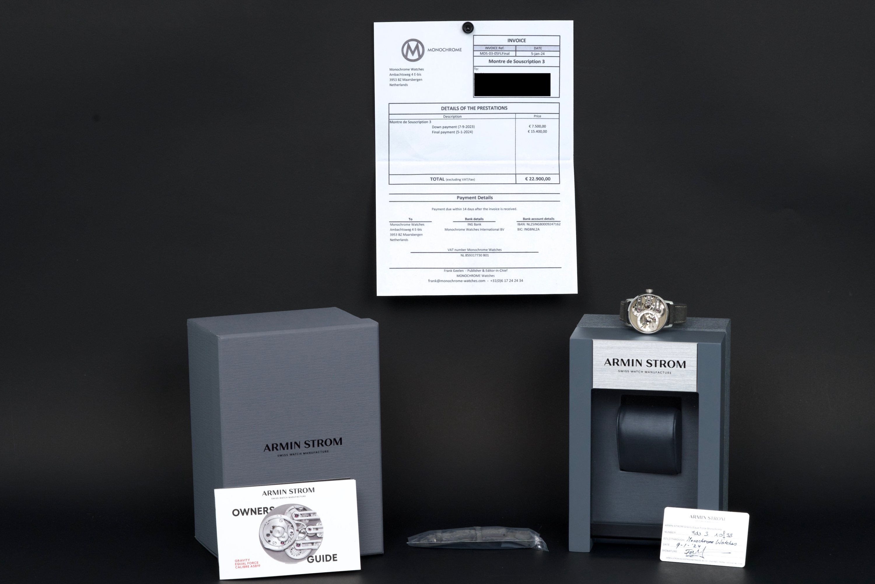 A superb example of the Armin Strom Gravity Equal Force “Monochrome” Souscription 3, coming from its original owner and complete with its full 2024 set. Limited in production (33 pieces) and part of the collaboration series with Monochrome Watches, this edition features a stainless steel case with a grey openworked dial showcasing Armin Strom’s distinctive micro-mechanical aesthetic. The watch shows light wear from careful use and remains in excellent overall condition. Powered by the in-house automatic caliber ASB19 with equal force transmission and visible micro-rotor. A rare and technically fascinating modern independent timepiece — combining contemporary design, exceptional finishing, and true horological innovation.