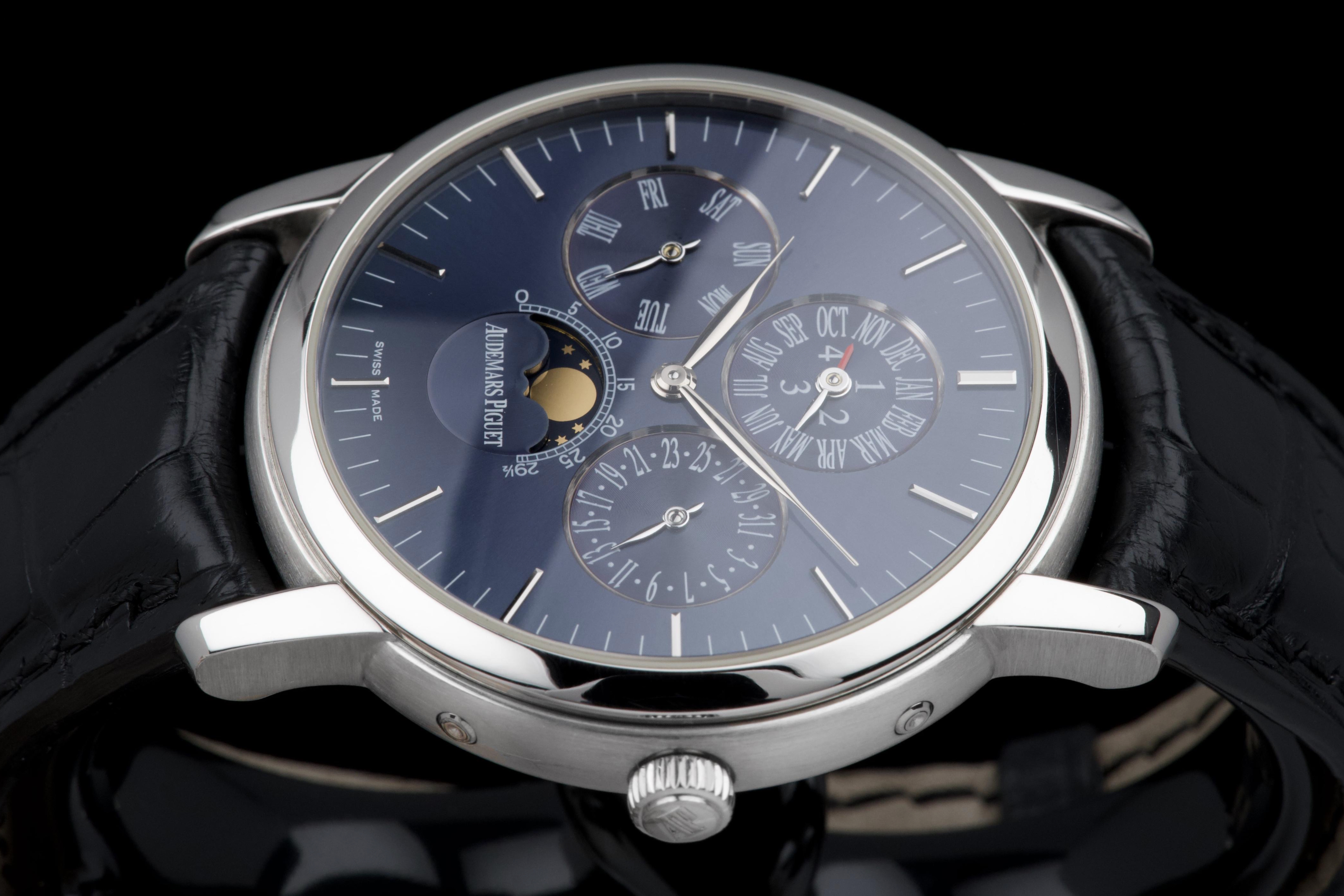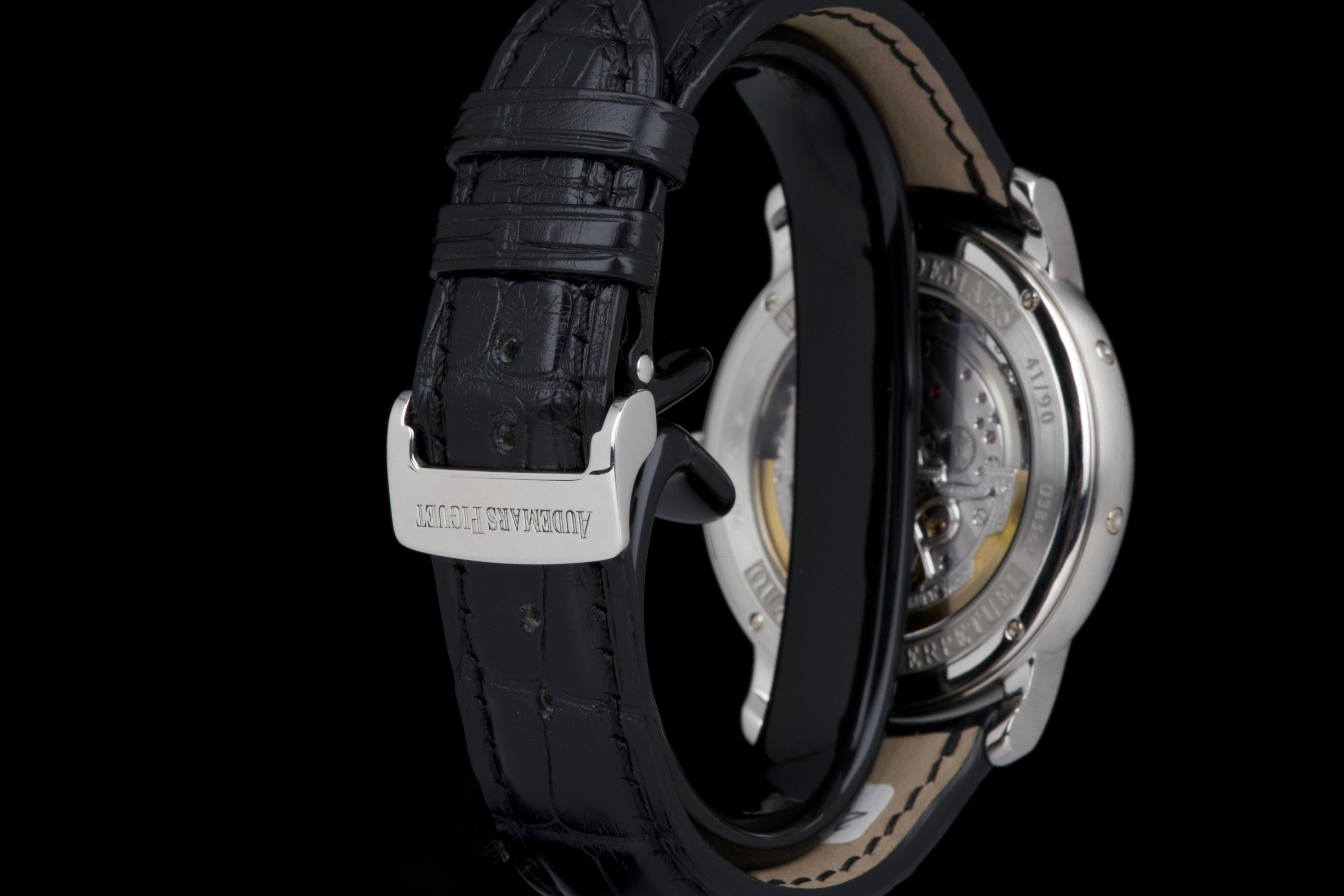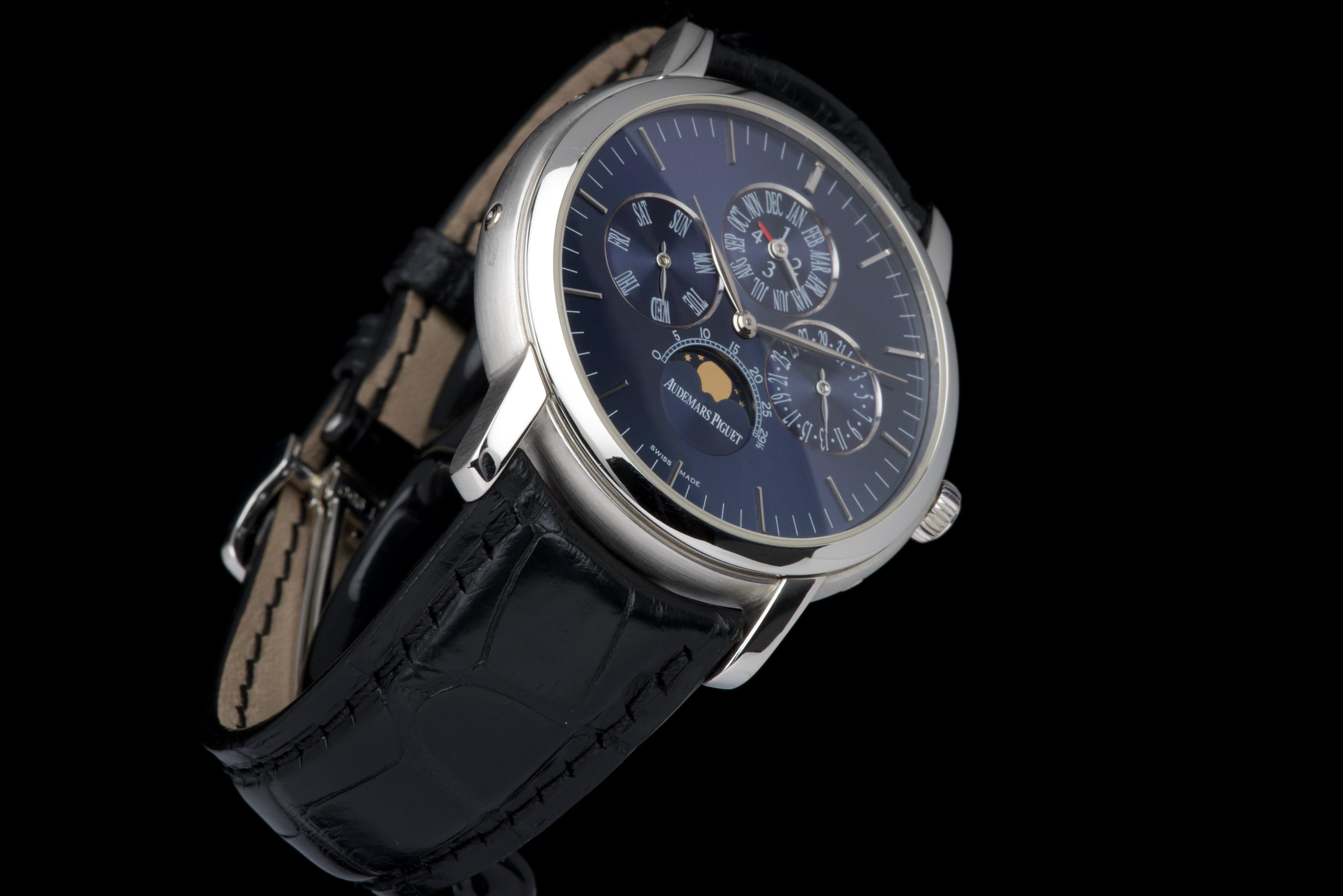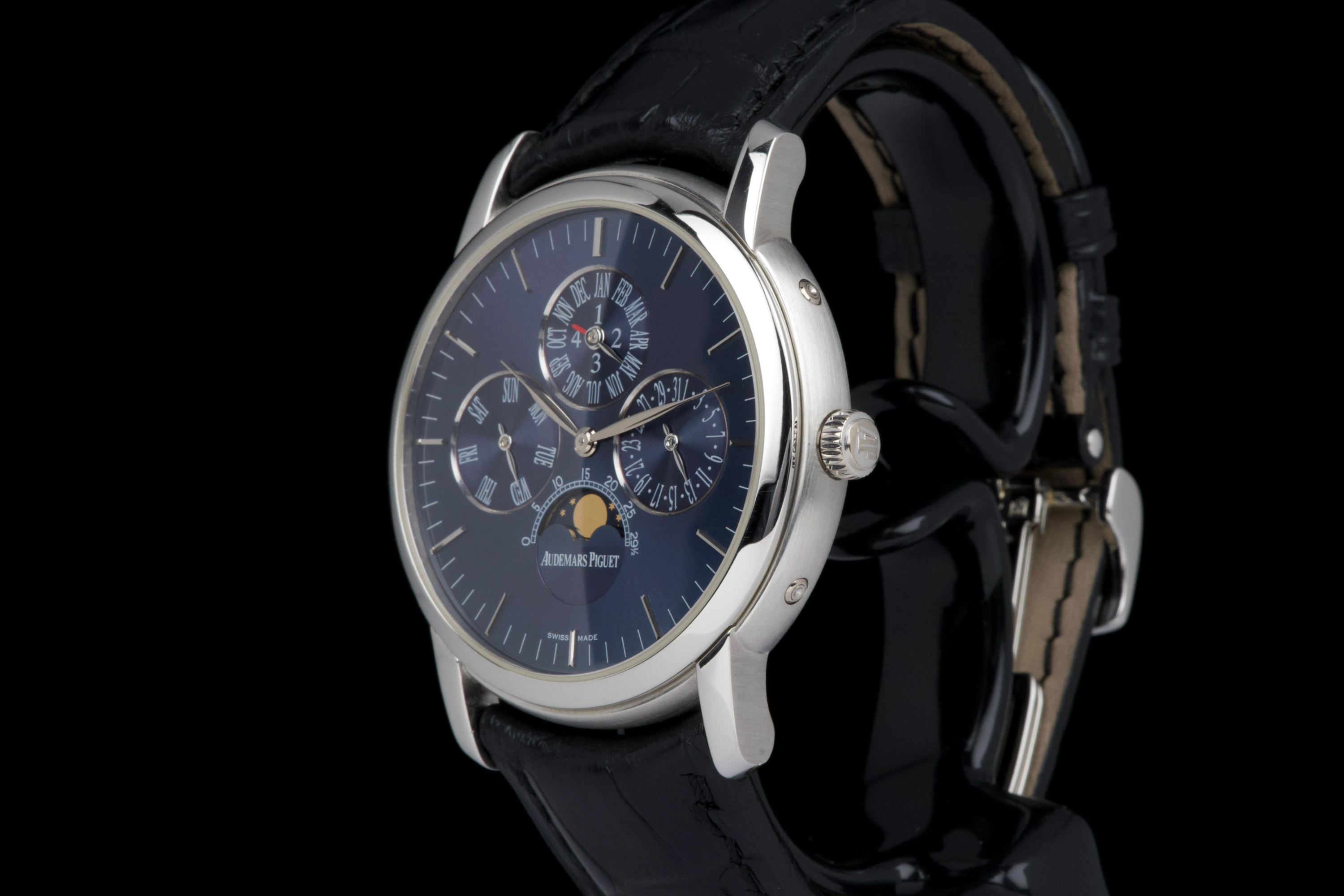The present Audemars Piguet Jules Audemars Quantième Perpétuel reference 26000PT, dating to 2008, is an exceptionally rare and refined example of the manufacture’s classical high complications, produced in a limited edition of only 90 pieces. Executed in platinum and measuring 40.5 mm in diameter, this discreet yet highly sophisticated perpetual calendar embodies Audemars Piguet’s mastery of traditional watchmaking at the highest level. The watch is preserved in excellent overall condition and has been lightly polished in the past, while retaining strong proportions and an elegant presence on the wrist. It is fitted with a black Audemars Piguet alligator leather strap, paired with a platinum deployant clasp, completing the ensemble with period-correct coherence and refinement. Although no service history accompanies the watch, it is in perfect working condition at the time of cataloguing. Importantly, the watch is accompanied by a Certificate of Authenticity issued by Audemars Piguet in 2022, providing valuable confirmation of its originality and configuration. Produced in extremely limited numbers and offered with official manufacturer documentation, this Jules Audemars Perpetual Calendar represents a rare opportunity to acquire a discreet, highly collectible platinum complicated watch from Audemars Piguet’s modern era.