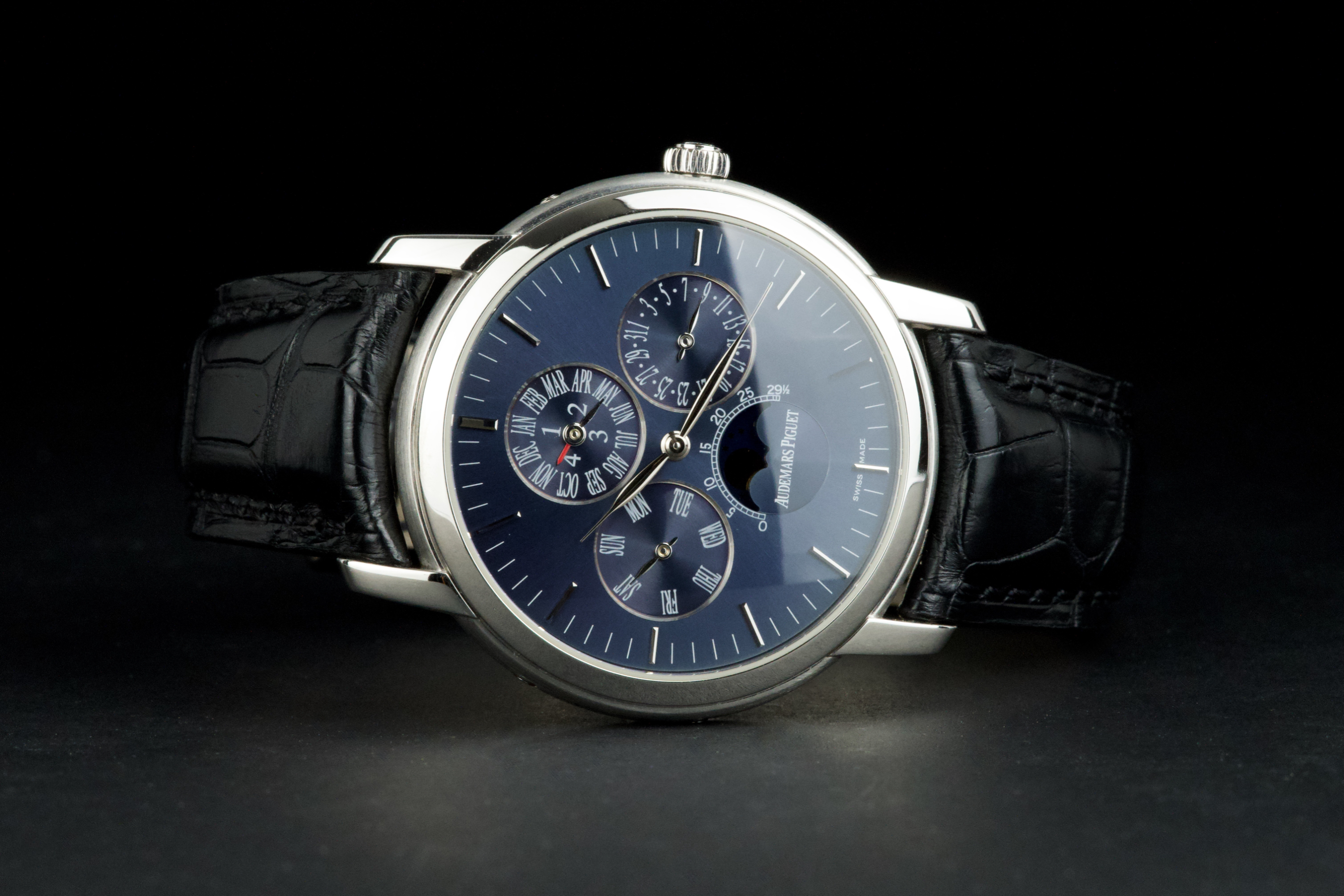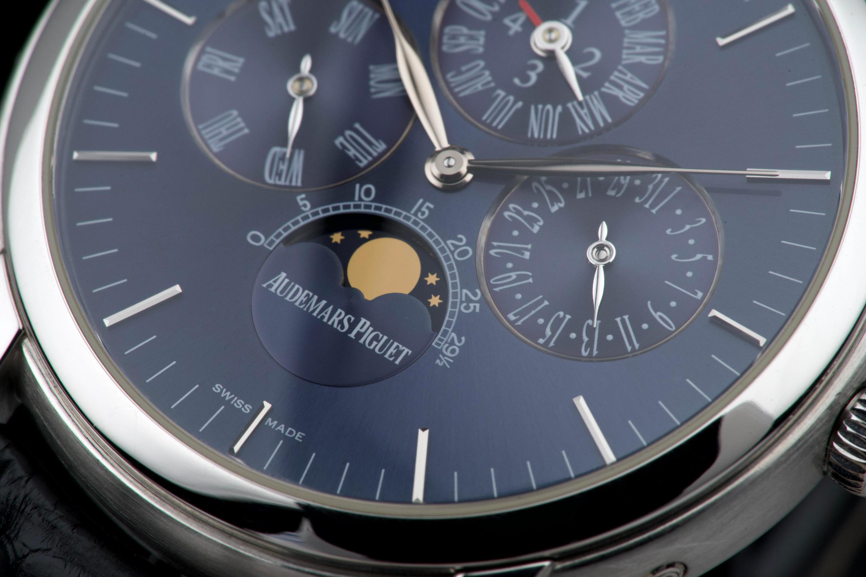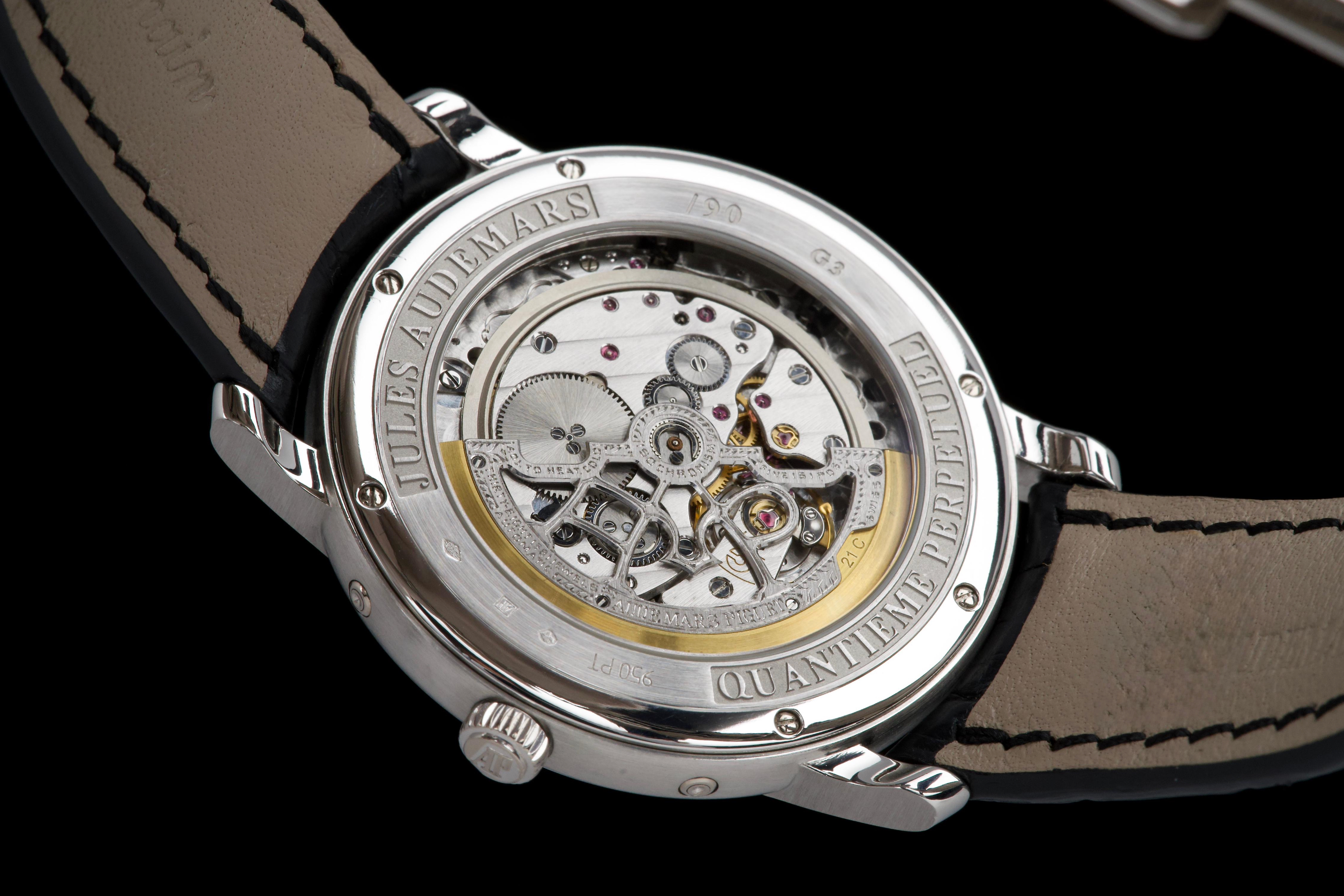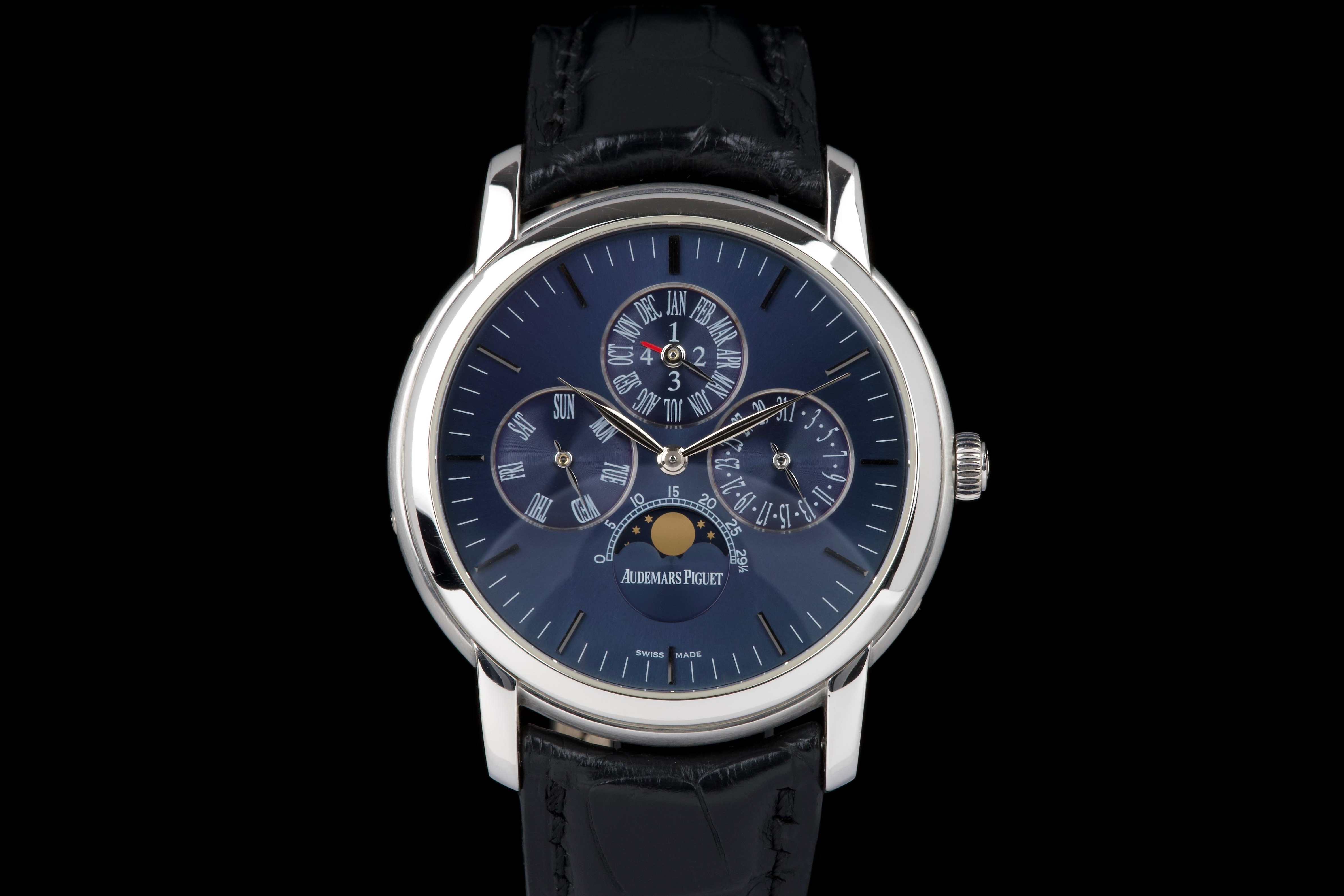 The present Audemars Piguet Jules Audemars Quantième Perpétuel reference 26000PT, dating to 2008, is an exceptionally rare and refined example of the manufacture’s classical high complications, produced in a limited edition of only 90 pieces. Executed in platinum and measuring 40.5 mm in diameter, this discreet yet highly sophisticated perpetual calendar embodies Audemars Piguet’s mastery of traditional watchmaking at the highest level. The watch is preserved in excellent overall condition and has been lightly polished in the past, while retaining strong proportions and an elegant presence on the wrist. It is fitted with a black Audemars Piguet alligator leather strap, paired with a platinum deployant clasp, completing the ensemble with period-correct coherence and refinement. Although no service history accompanies the watch, it is in perfect working condition at the time of cataloguing. Importantly, the watch is accompanied by a Certificate of Authenticity issued by Audemars Piguet in 2022, providing valuable confirmation of its originality and configuration. Produced in extremely limited numbers and offered with official manufacturer documentation, this Jules Audemars Perpetual Calendar represents a rare opportunity to acquire a discreet, highly collectible platinum complicated watch from Audemars Piguet’s modern era.