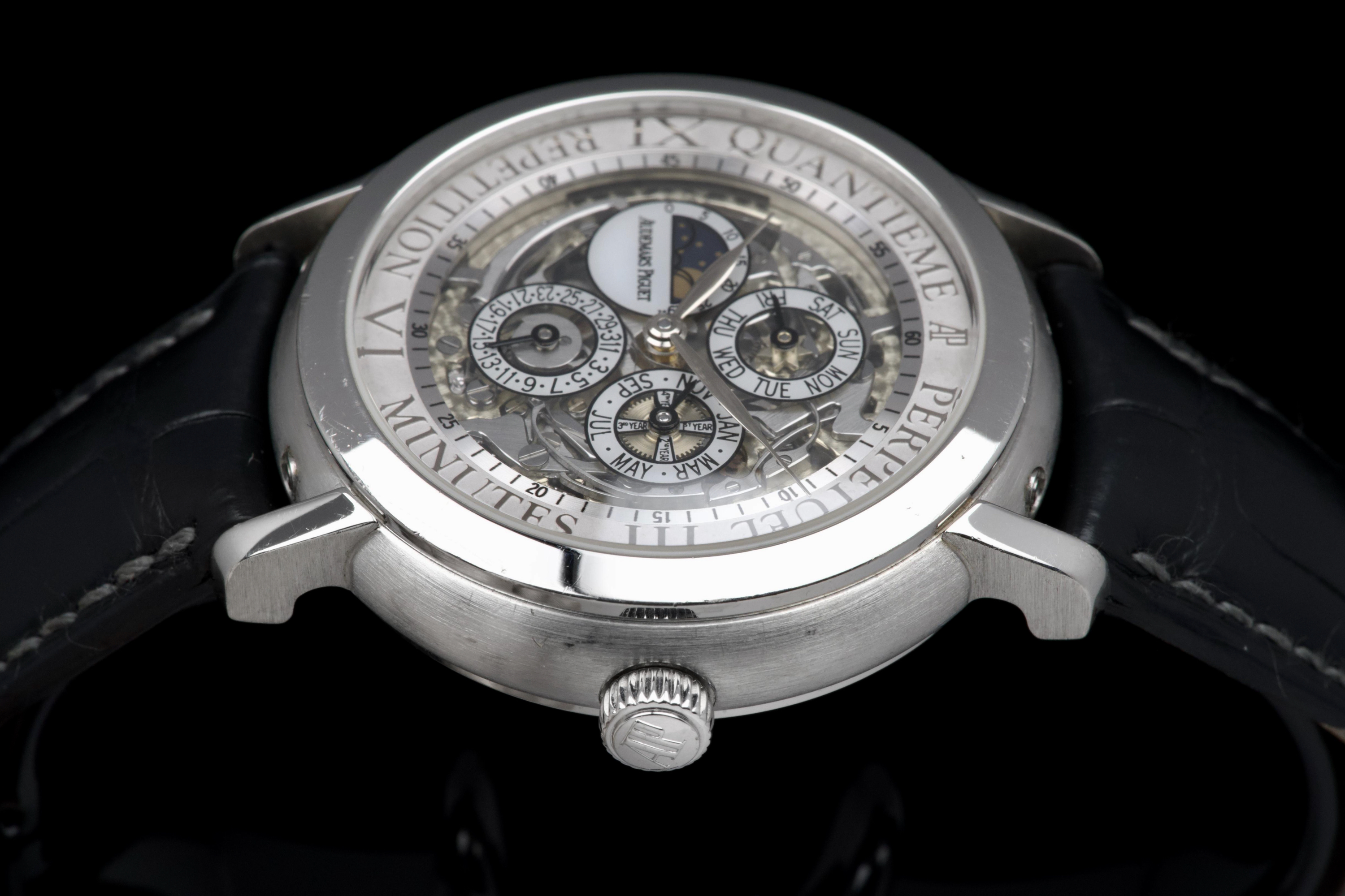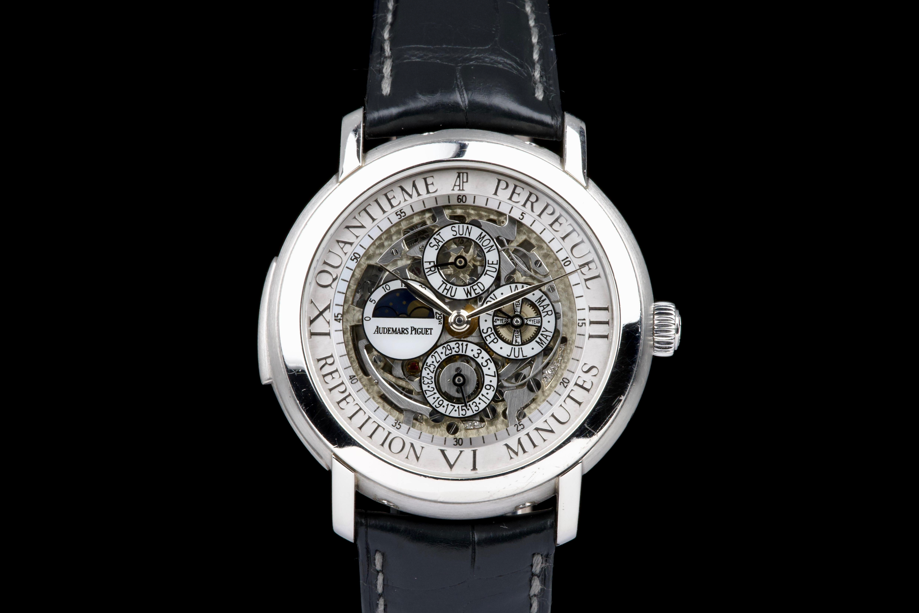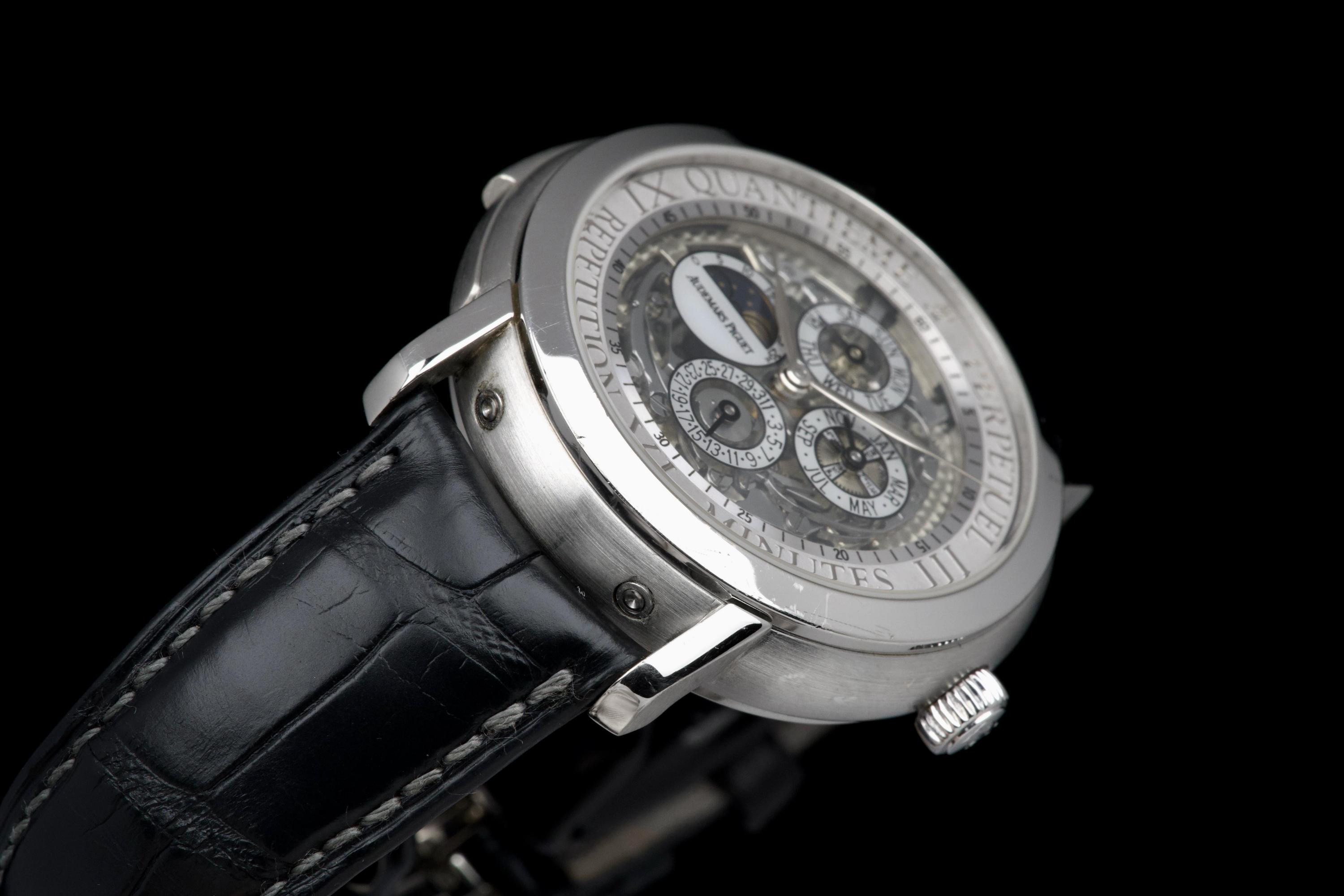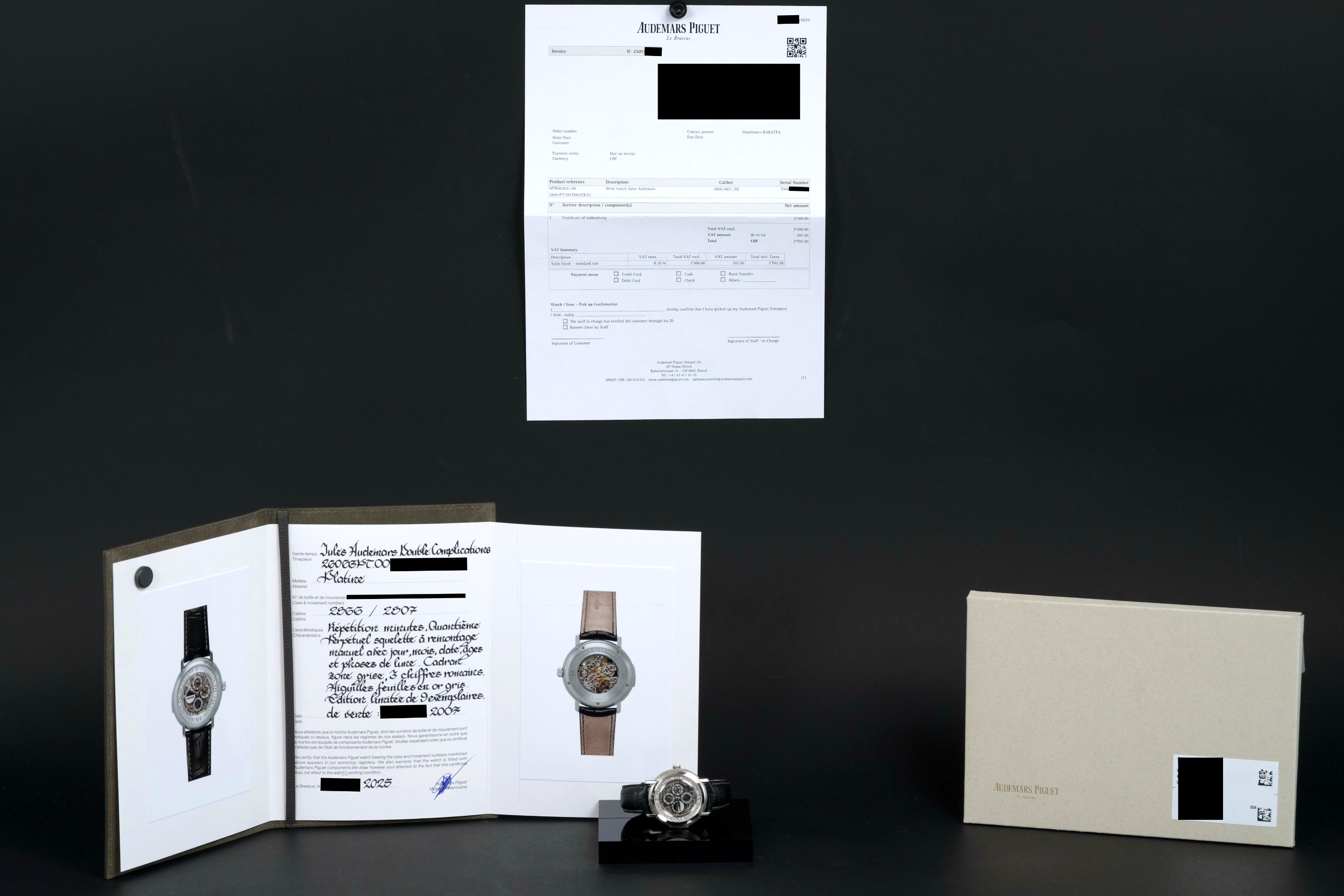 The present Audemars Piguet Jules Audemars Minute Repeater Perpetual Calendar Skeleton, dating to 2007, is an extraordinary and exceptionally rare high complication, produced in a limited edition of only nine pieces worldwide. Executed in platinum and measuring 39 mm in diameter, this watch represents one of the most technically ambitious and visually striking creations of Audemars Piguet’s modern era. The platinum case is preserved in good overall condition and shows signs of wear consistent with careful use, lending the watch an honest and lived-in presence. The watch is powered by a manual-winding movement combining a minute repeater with a perpetual calendar, both fully skeletonized. This openworked architecture reveals the extraordinary complexity of the mechanism, allowing the wearer to admire the meticulous finishing, hand-beveling, and traditional decorative techniques for which Audemars Piguet is renowned. The dial side is distinguished by a refined grey-toned chapter ring, accented by three Roman numerals, framing the skeletonized movement beneath. The leaf-shaped hands in grey gold add elegance and legibility while maintaining harmony with the monochromatic platinum aesthetic. The acoustic performance of the minute repeater is complemented by the visual drama of the openworked perpetual calendar displays, resulting in a watch that is as captivating to observe as it is to hear. The watch is fitted with a black Audemars Piguet crocodile leather strap, secured by a platinum deployant clasp, ensuring both comfort and material coherence. It is accompanied by an Audemars Piguet Certificate of Authenticity issued in 2025, which confirms production of the watch in 2007. Combining extreme rarity, supreme technical complexity, and bold aesthetic presence, this Jules Audemars Minute Repeater Perpetual Calendar Skeleton stands as a truly impressive and museum-worthy creation—an exceptional opportunity to acquire one of the most exclusive platinum complicated wristwatches ever produced by Audemars Piguet.