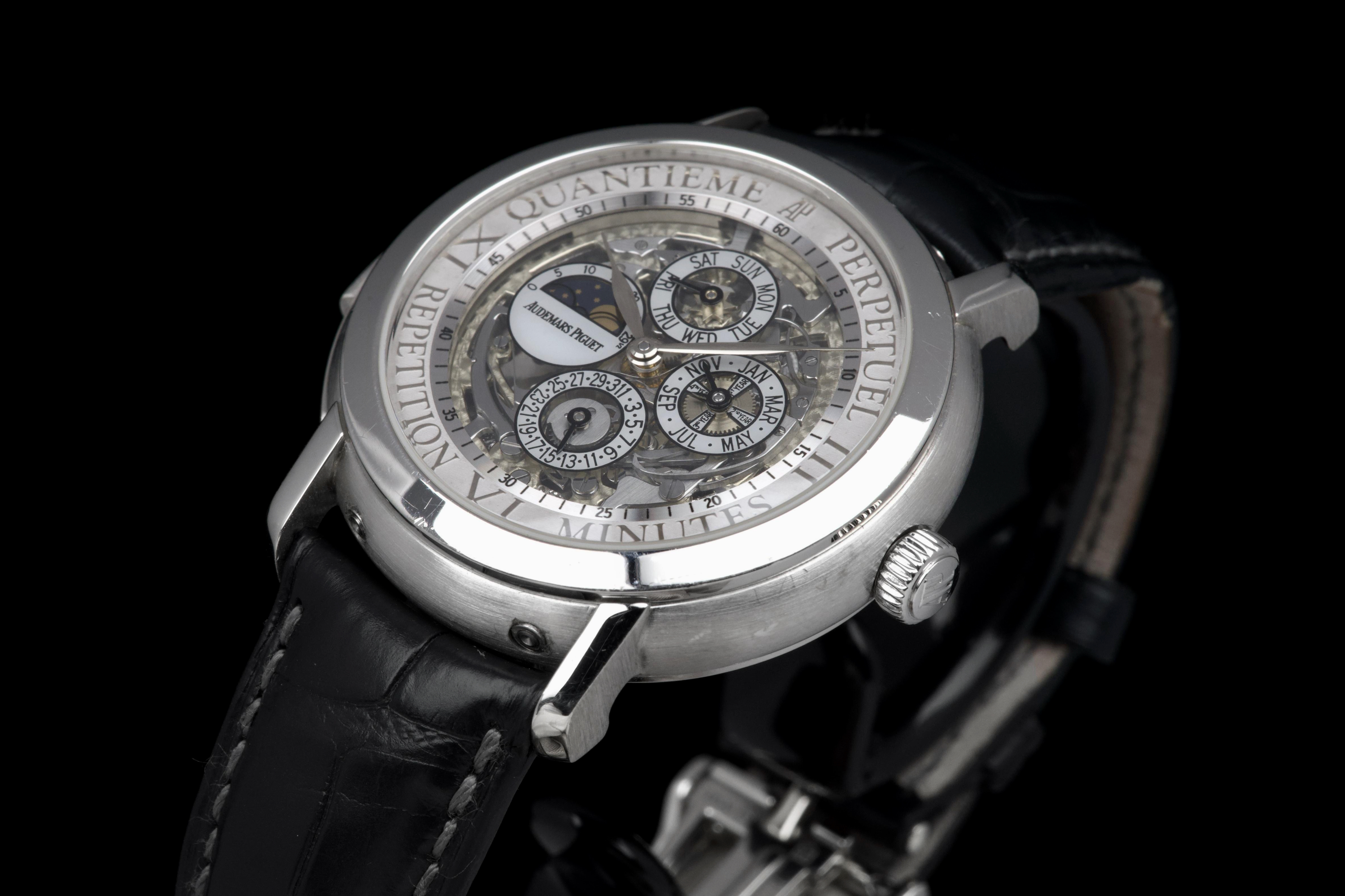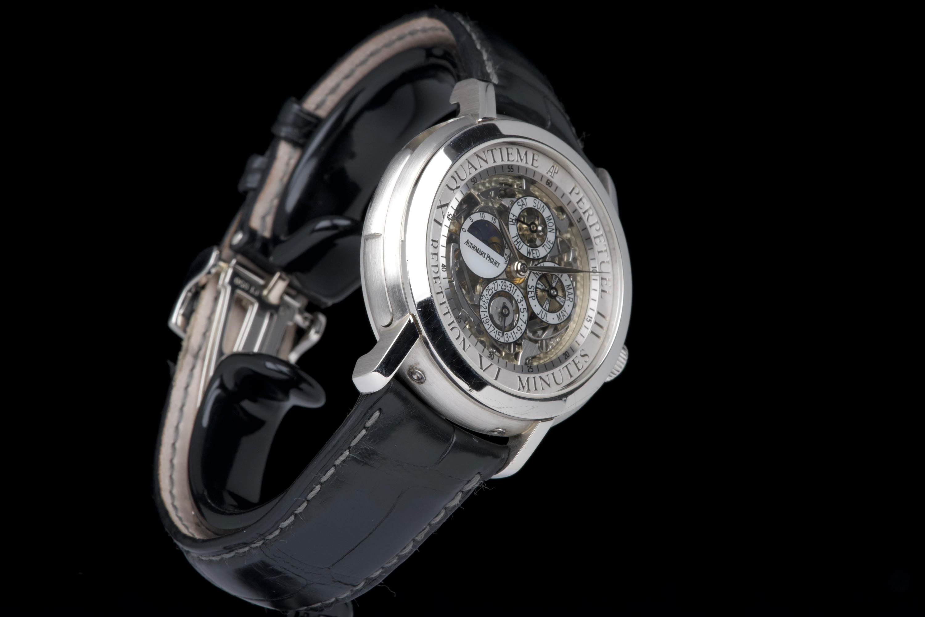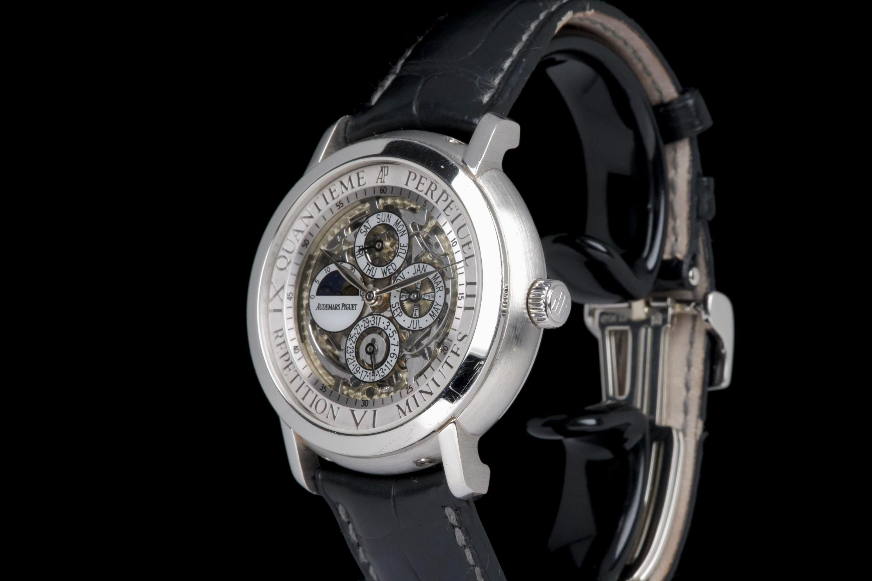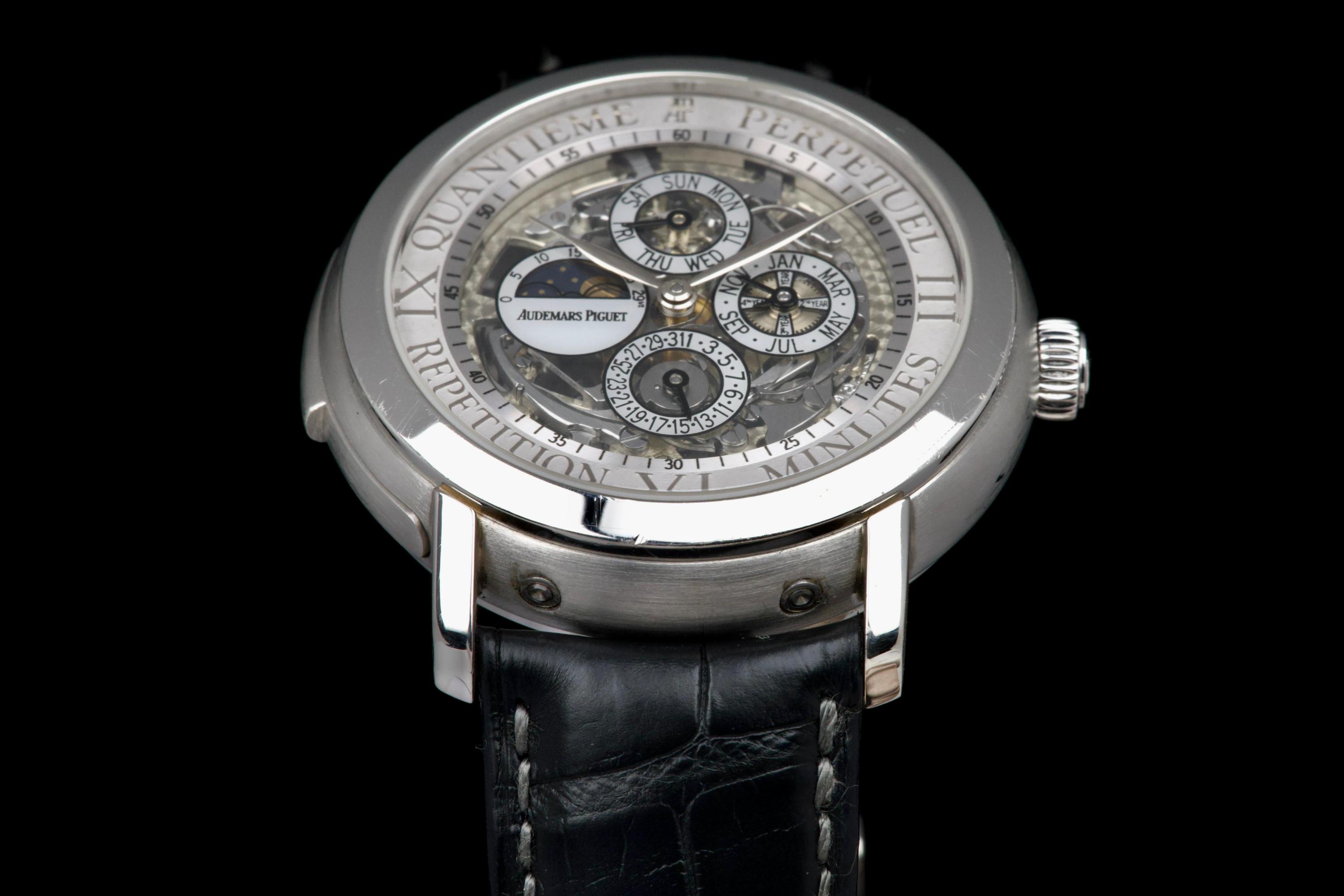 The present Audemars Piguet Jules Audemars Minute Repeater Perpetual Calendar Skeleton, dating to 2007, is an extraordinary and exceptionally rare high complication, produced in a limited edition of only nine pieces worldwide. Executed in platinum and measuring 39 mm in diameter, this watch represents one of the most technically ambitious and visually striking creations of Audemars Piguet’s modern era. The platinum case is preserved in good overall condition and shows signs of wear consistent with careful use, lending the watch an honest and lived-in presence. The watch is powered by a manual-winding movement combining a minute repeater with a perpetual calendar, both fully skeletonized. This openworked architecture reveals the extraordinary complexity of the mechanism, allowing the wearer to admire the meticulous finishing, hand-beveling, and traditional decorative techniques for which Audemars Piguet is renowned. The dial side is distinguished by a refined grey-toned chapter ring, accented by three Roman numerals, framing the skeletonized movement beneath. The leaf-shaped hands in grey gold add elegance and legibility while maintaining harmony with the monochromatic platinum aesthetic. The acoustic performance of the minute repeater is complemented by the visual drama of the openworked perpetual calendar displays, resulting in a watch that is as captivating to observe as it is to hear. The watch is fitted with a black Audemars Piguet crocodile leather strap, secured by a platinum deployant clasp, ensuring both comfort and material coherence. It is accompanied by an Audemars Piguet Certificate of Authenticity issued in 2025, which confirms production of the watch in 2007. Combining extreme rarity, supreme technical complexity, and bold aesthetic presence, this Jules Audemars Minute Repeater Perpetual Calendar Skeleton stands as a truly impressive and museum-worthy creation—an exceptional opportunity to acquire one of the most exclusive platinum complicated wristwatches ever produced by Audemars Piguet.
