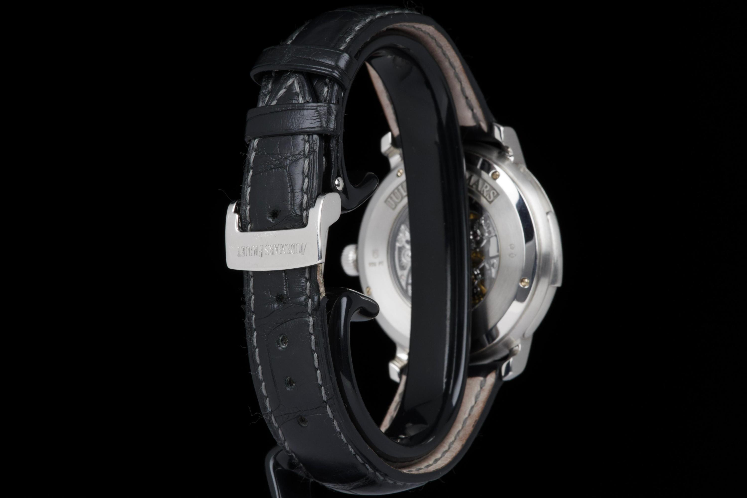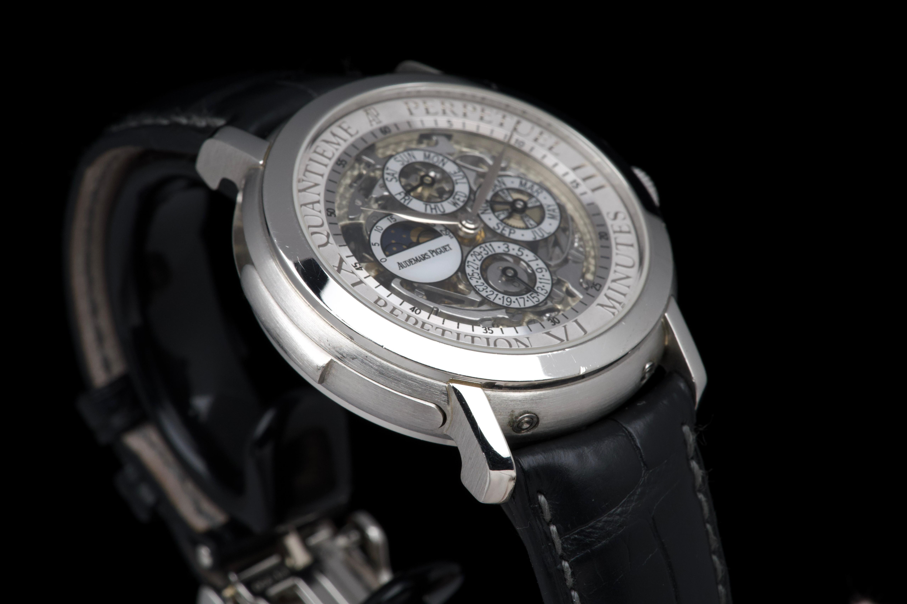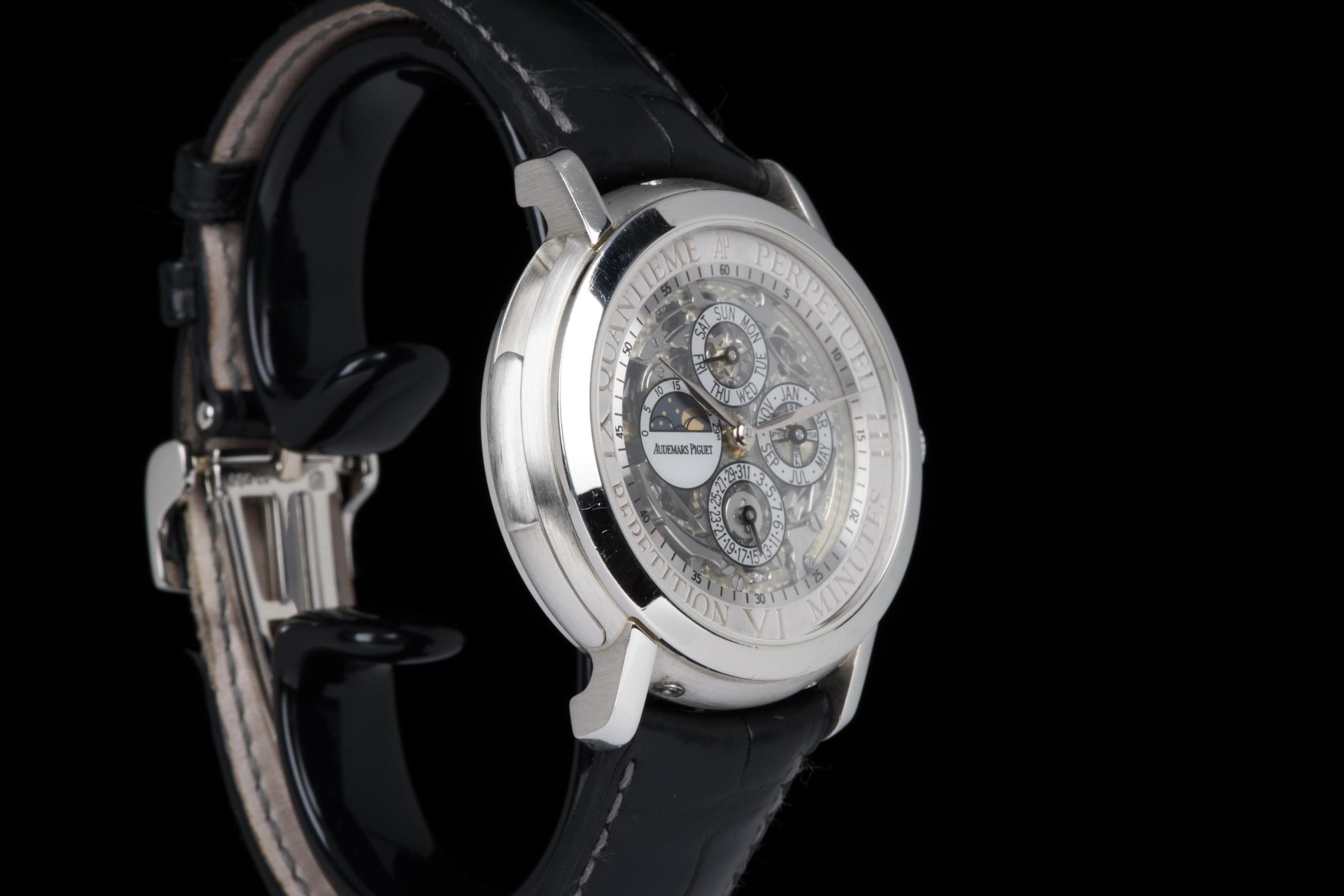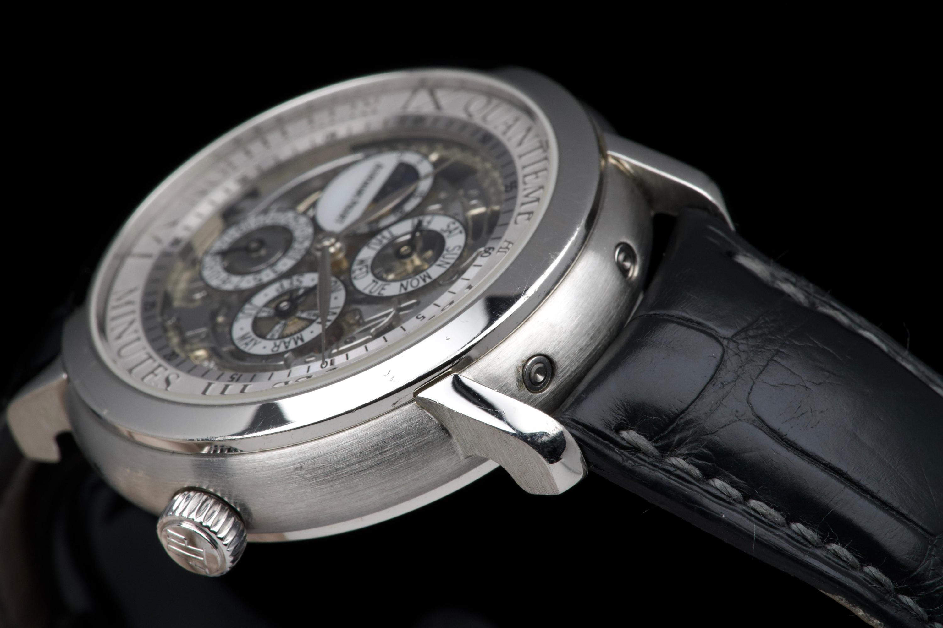 The present Audemars Piguet Jules Audemars Minute Repeater Perpetual Calendar Skeleton, dating to 2007, is an extraordinary and exceptionally rare high complication, produced in a limited edition of only nine pieces worldwide. Executed in platinum and measuring 39 mm in diameter, this watch represents one of the most technically ambitious and visually striking creations of Audemars Piguet’s modern era. The platinum case is preserved in good overall condition and shows signs of wear consistent with careful use, lending the watch an honest and lived-in presence. The watch is powered by a manual-winding movement combining a minute repeater with a perpetual calendar, both fully skeletonized. This openworked architecture reveals the extraordinary complexity of the mechanism, allowing the wearer to admire the meticulous finishing, hand-beveling, and traditional decorative techniques for which Audemars Piguet is renowned. The dial side is distinguished by a refined grey-toned chapter ring, accented by three Roman numerals, framing the skeletonized movement beneath. The leaf-shaped hands in grey gold add elegance and legibility while maintaining harmony with the monochromatic platinum aesthetic. The acoustic performance of the minute repeater is complemented by the visual drama of the openworked perpetual calendar displays, resulting in a watch that is as captivating to observe as it is to hear. The watch is fitted with a black Audemars Piguet crocodile leather strap, secured by a platinum deployant clasp, ensuring both comfort and material coherence. It is accompanied by an Audemars Piguet Certificate of Authenticity issued in 2025, which confirms production of the watch in 2007. Combining extreme rarity, supreme technical complexity, and bold aesthetic presence, this Jules Audemars Minute Repeater Perpetual Calendar Skeleton stands as a truly impressive and museum-worthy creation—an exceptional opportunity to acquire one of the most exclusive platinum complicated wristwatches ever produced by Audemars Piguet.