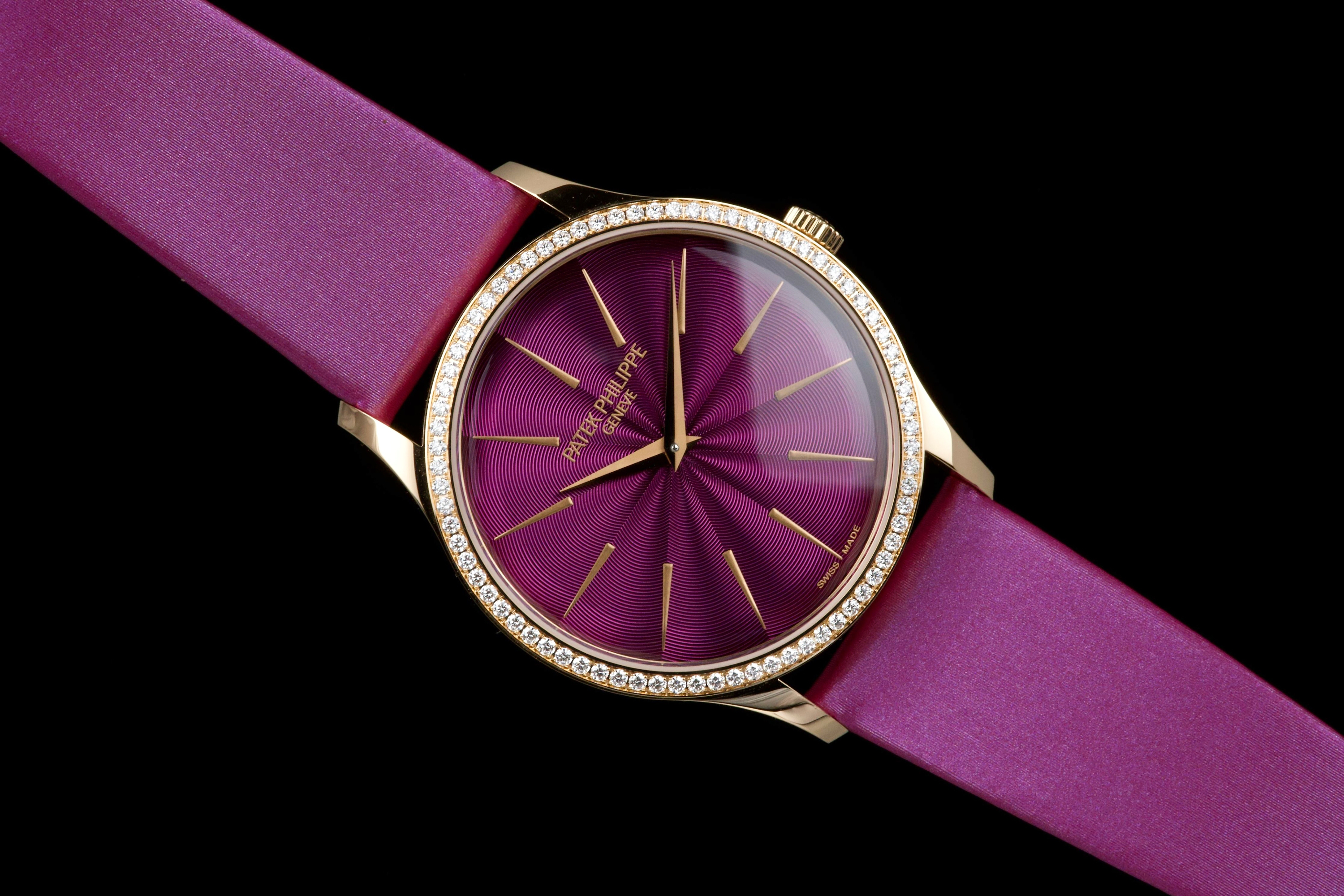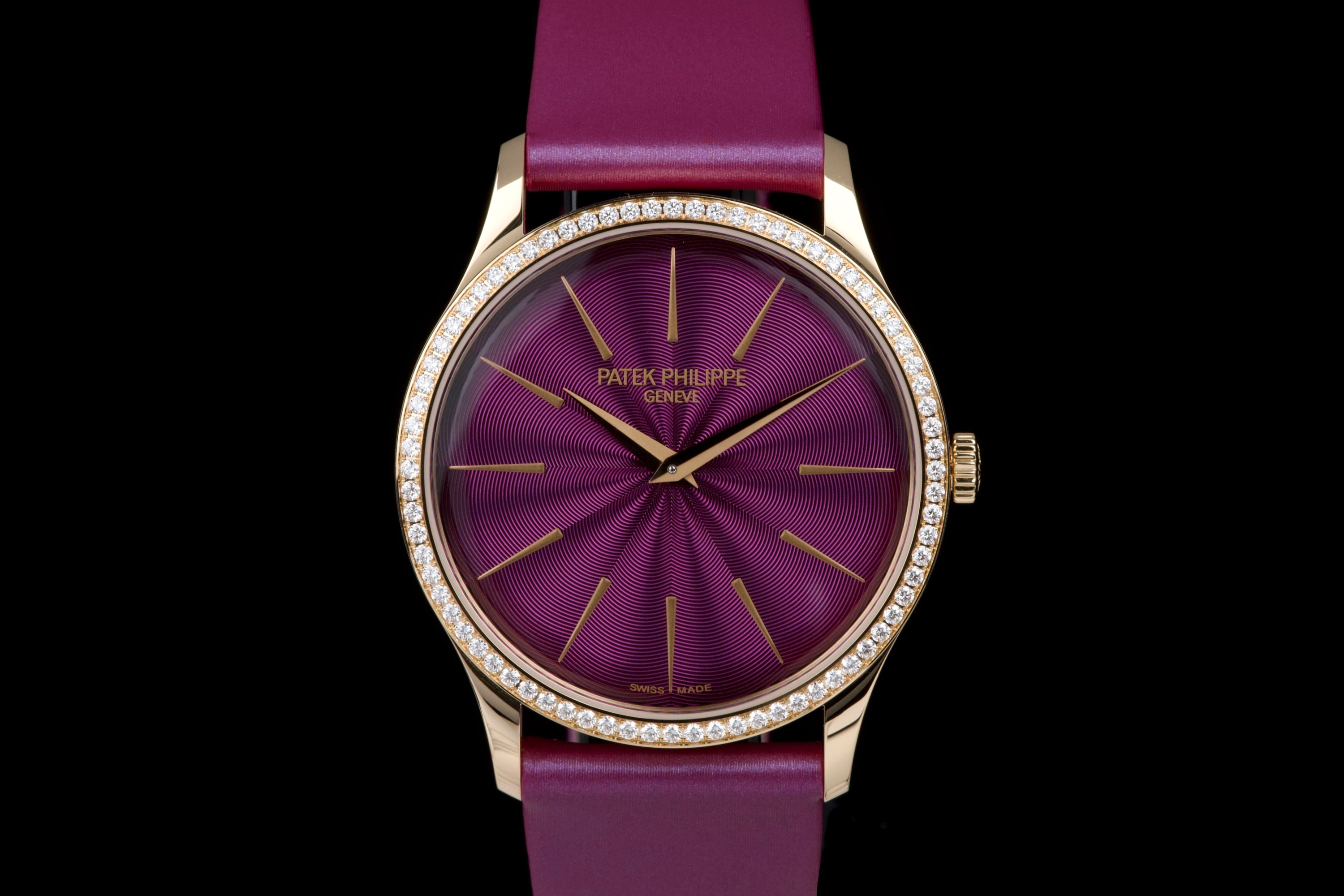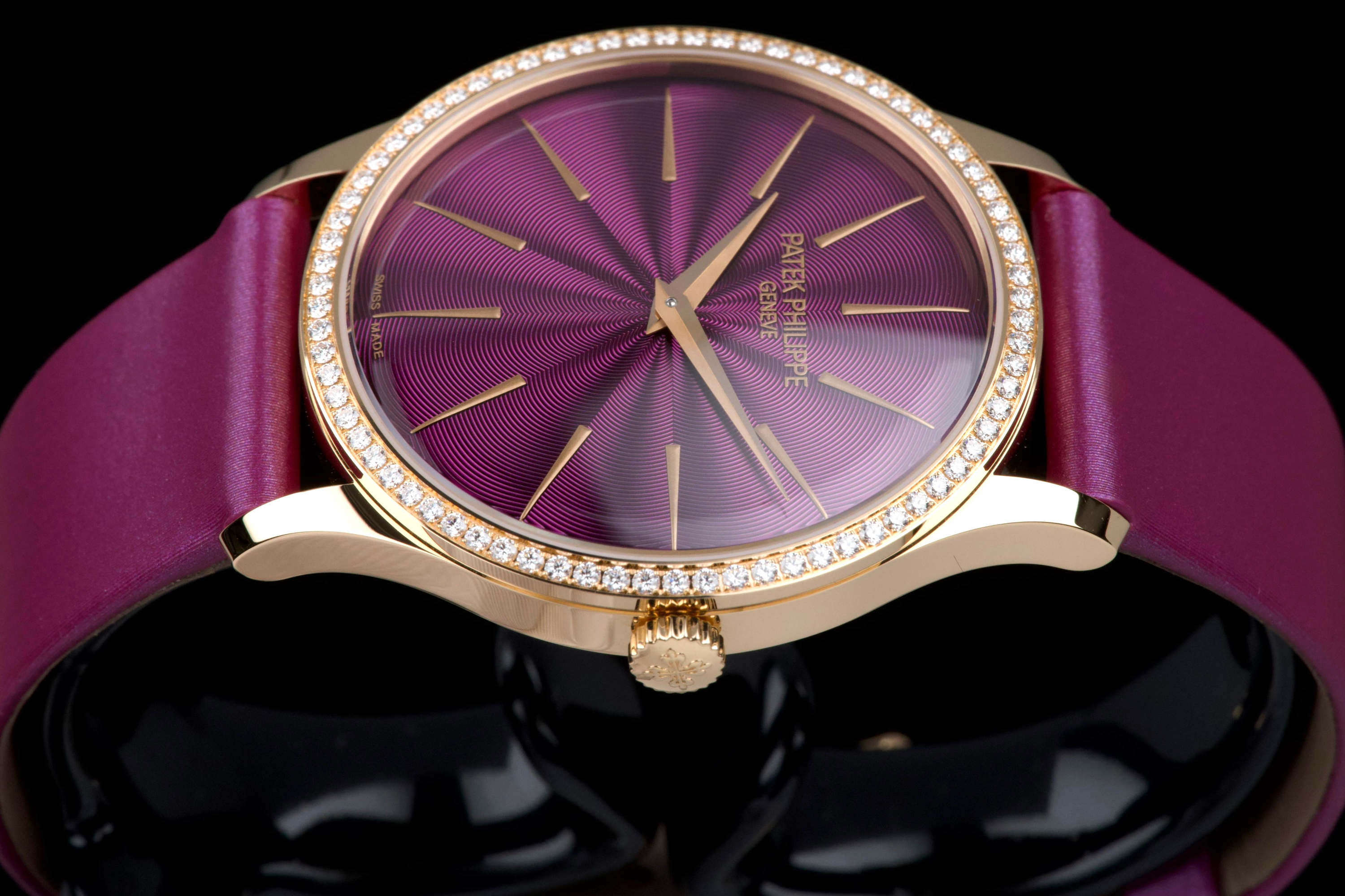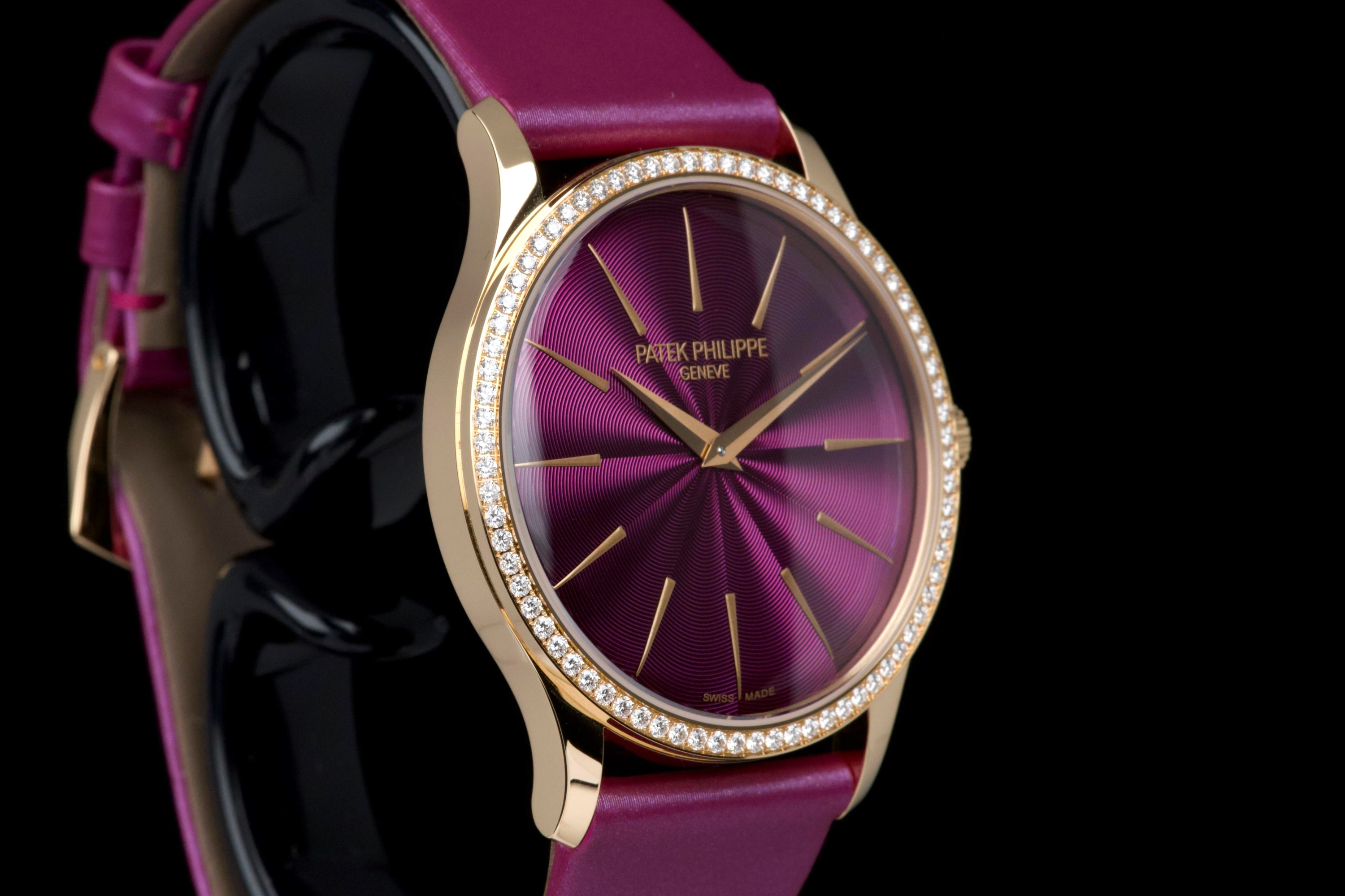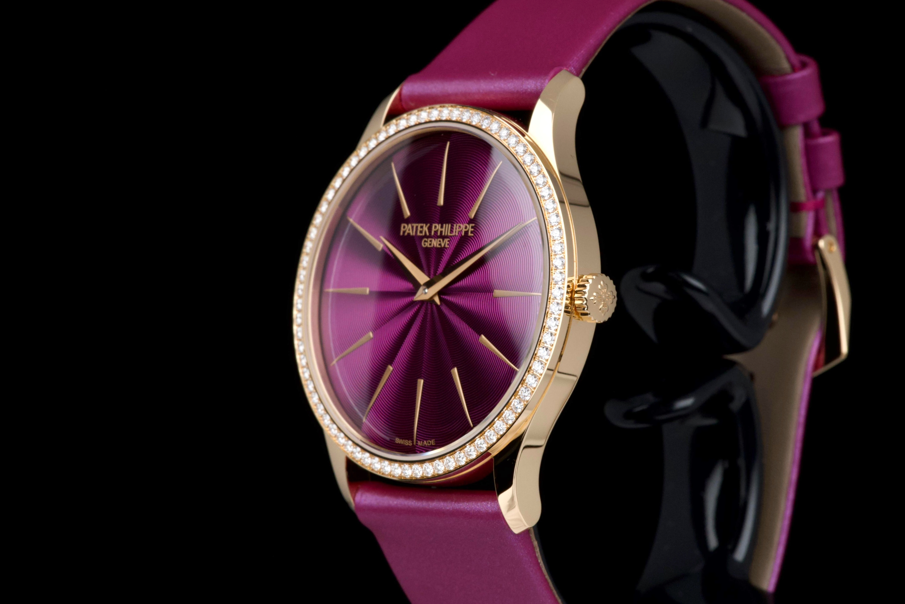 Presented here is an elegant and contemporary example of the Patek Philippe Lady Calatrava reference 4997/200R-001. Crafted in rose gold, this refined timepiece perfectly reflects Patek Philippe’s mastery of classic feminine watchmaking, combining timeless proportions with discreet luxury. This example dates to 2025 and is offered as a full set with its original box, papers, and accessories. Presented in close-to-new condition, the watch shows only the slightest signs of handling, preserving its crisp and refined overall appearance. The beautifully finished dial, enhanced by diamond hour markers and the signature hobnail-patterned bezel, offers a sophisticated and luminous presence on the wrist. A superb opportunity to acquire a nearly unworn example of a modern Lady Calatrava, combining elegance, craftsmanship, and enduring Patek Philippe refinement.