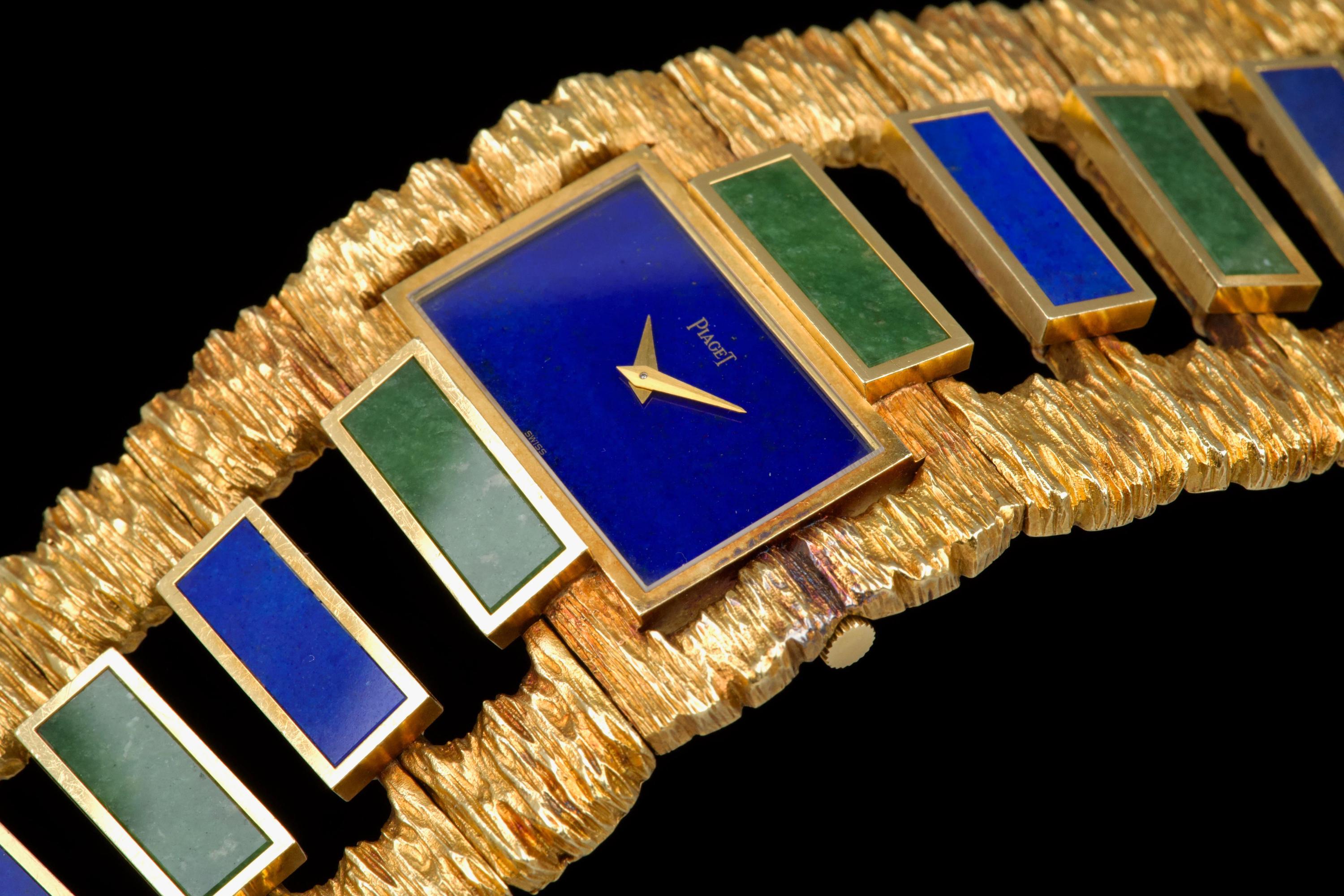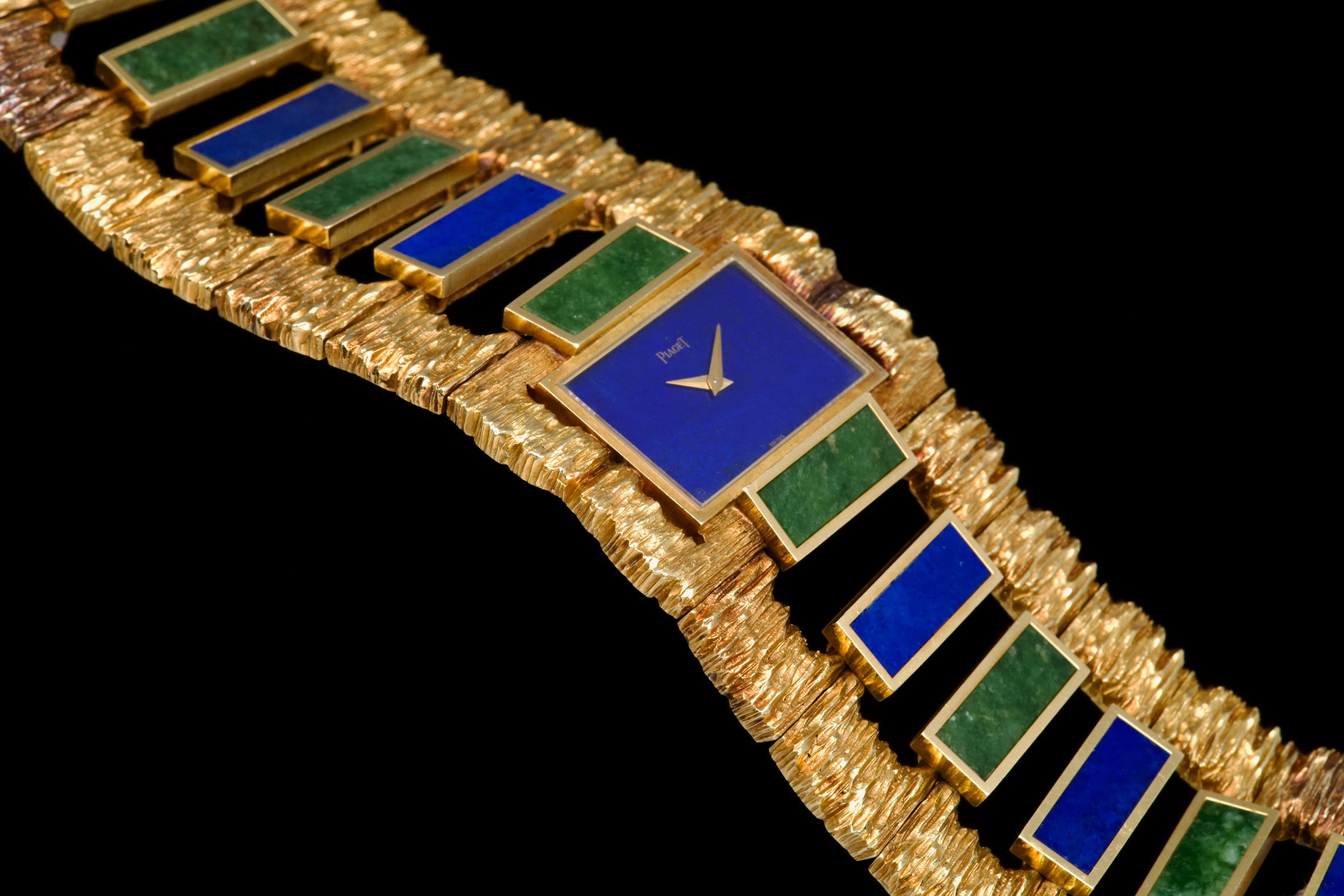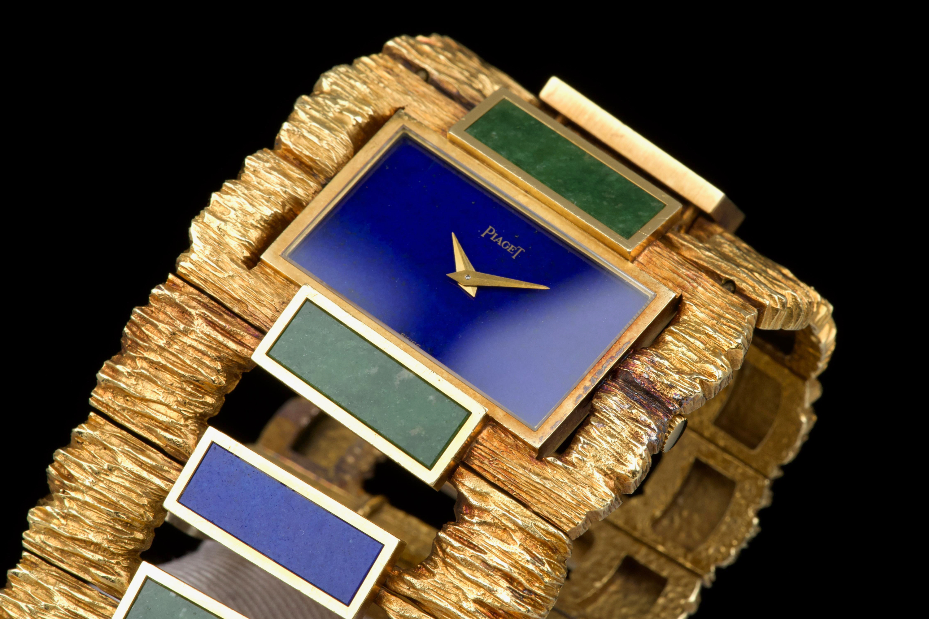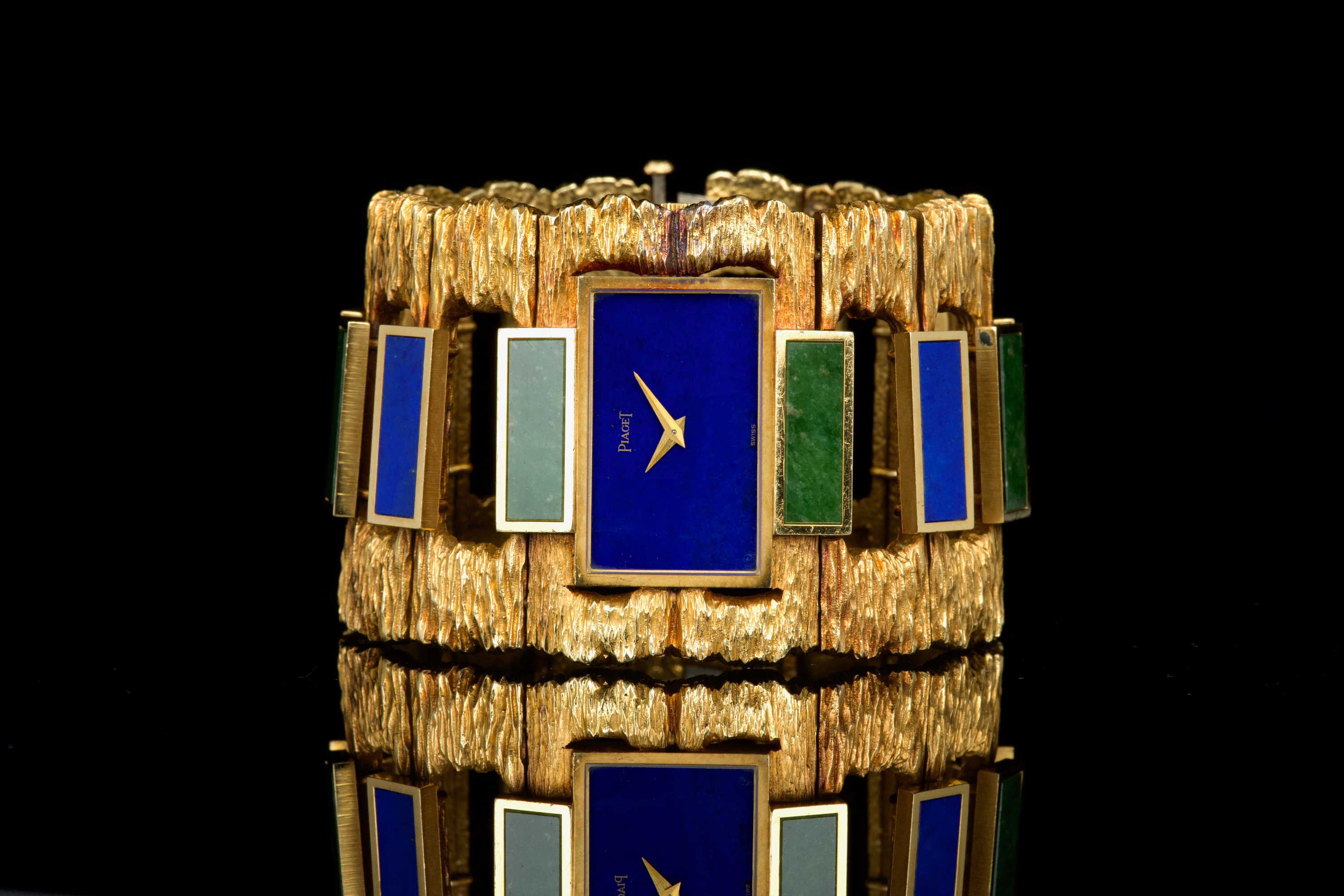 The 1970s marked an era of remarkable creativity and bold experimentation in watch design, and few maisons embodied this spirit more vividly than Piaget. Drawing upon its dual expertise as both jeweller and watchmaker, Piaget produced some of the most daring and exquisite bracelet watches of the period—creations that blurred the line between horology and high jewellery. Worn by artists, celebrities, and members of the international “jet set,” Piaget’s hardstone creations of the 1970s offered a chic and expressive alternative to conventional timepieces. The maison’s masterful use of coloured ornamental stones combined with sculptural integrated gold bracelets resulted in some of the most fascinating and collectible designs ever conceived. The present bracelet watch is a striking and beautifully preserved example of this audacious aesthetic. Crafted in gold and entirely hand-finished with a dramatic bark-like texture, the case and integrated bracelet create a powerful organic presence on the wrist. The bracelet is set with alternating brick links of lapis lazuli and jade, forming a vibrant interplay of deep blue and rich green tones. The lapis dial further enhances the natural inspiration of the piece, harmoniously blending with the textured gold surfaces. Importantly, the hardstone elements are preserved in excellent condition, with no cracks to the stones, a crucial and highly desirable attribute for collectors of such pieces. The watch is preserved in outstanding overall condition, retaining its strong visual impact and sculptural integrity more than four decades after its creation. No service history accompanies the watch. Bold, rare, and unmistakably of its era, this Piaget bracelet watch represents an exceptional opportunity to acquire a museum-worthy example of 1970s design—an ultimate statement piece for the discerning collector of unusual and highly artistic timepieces.