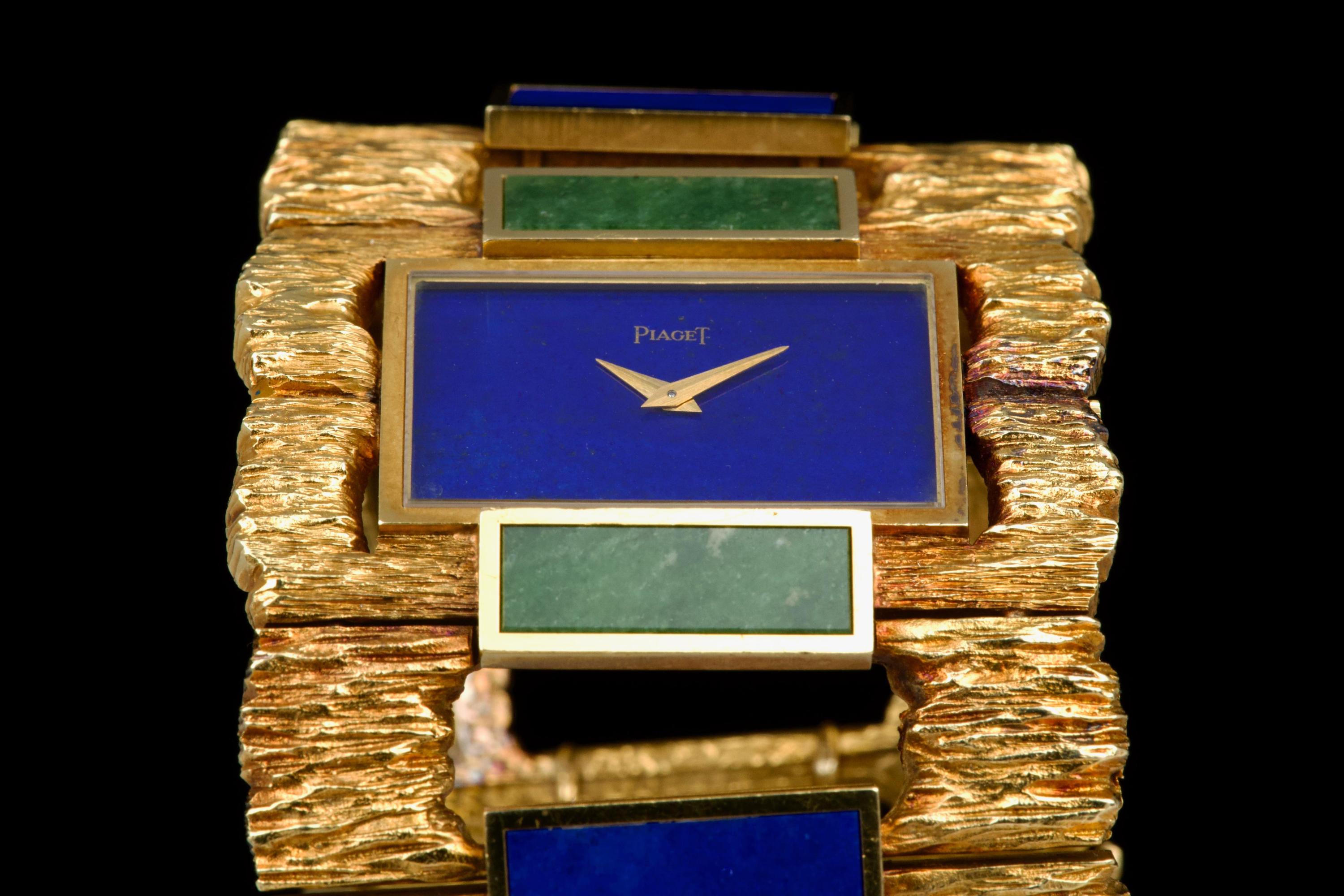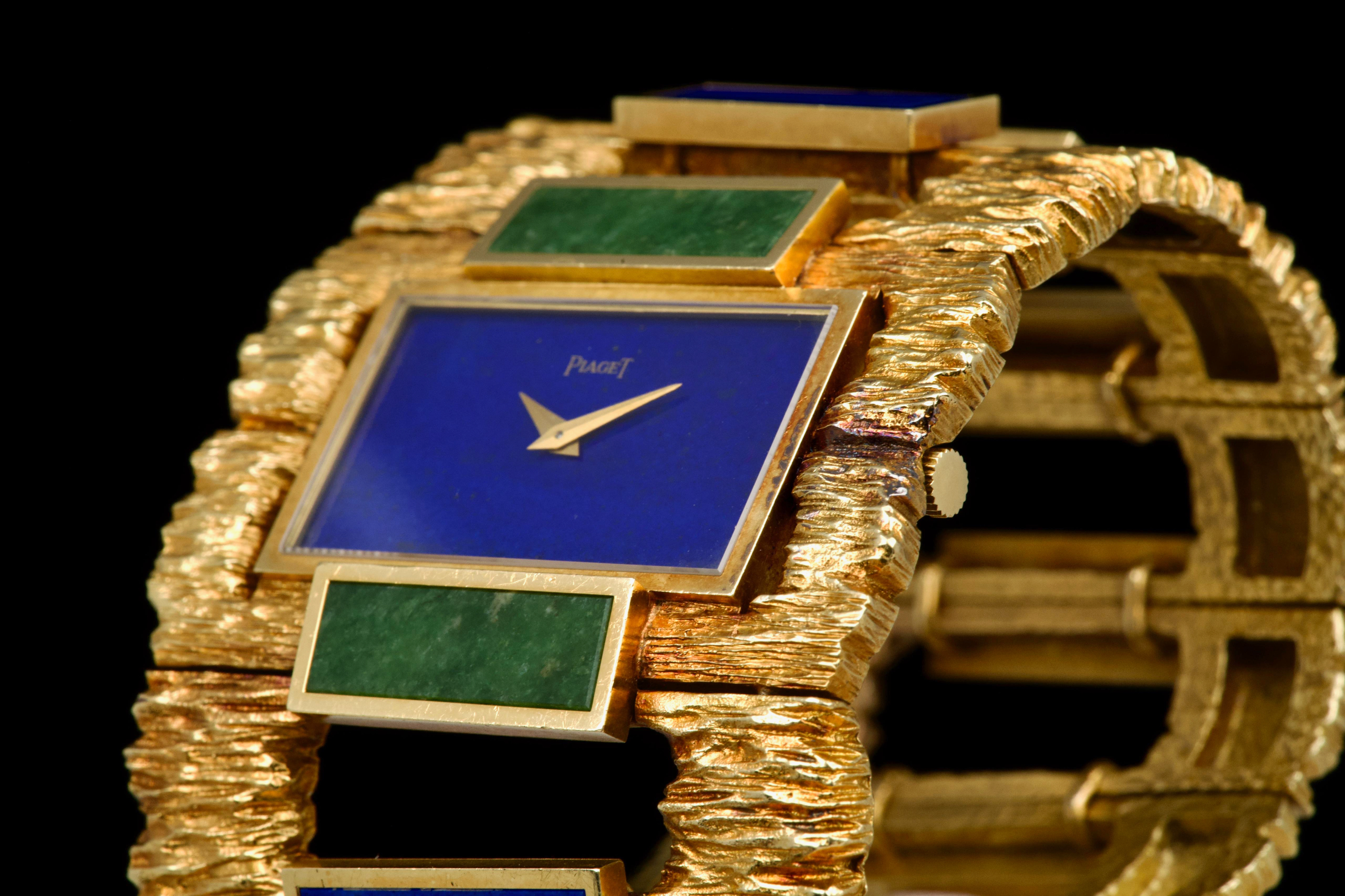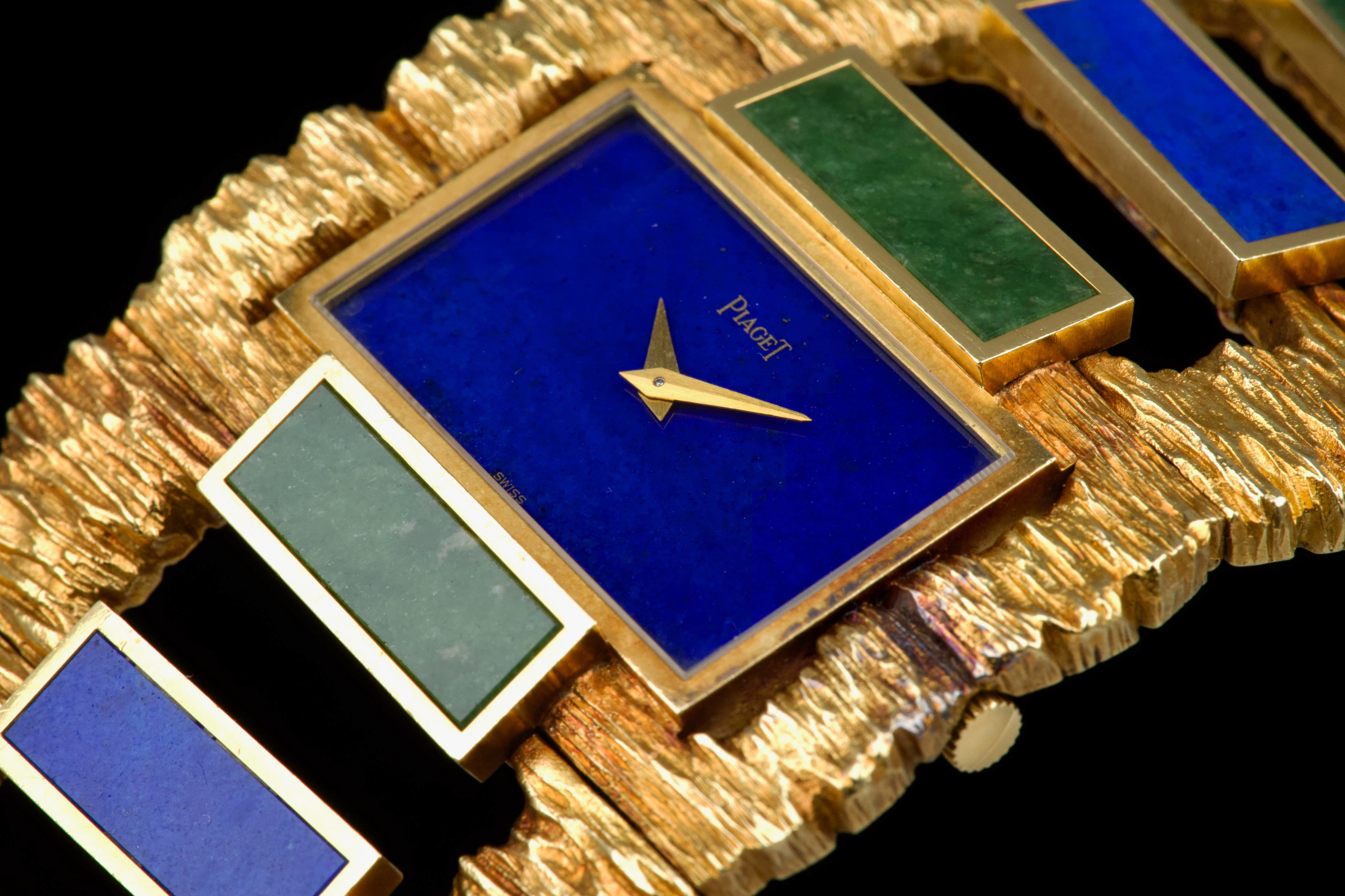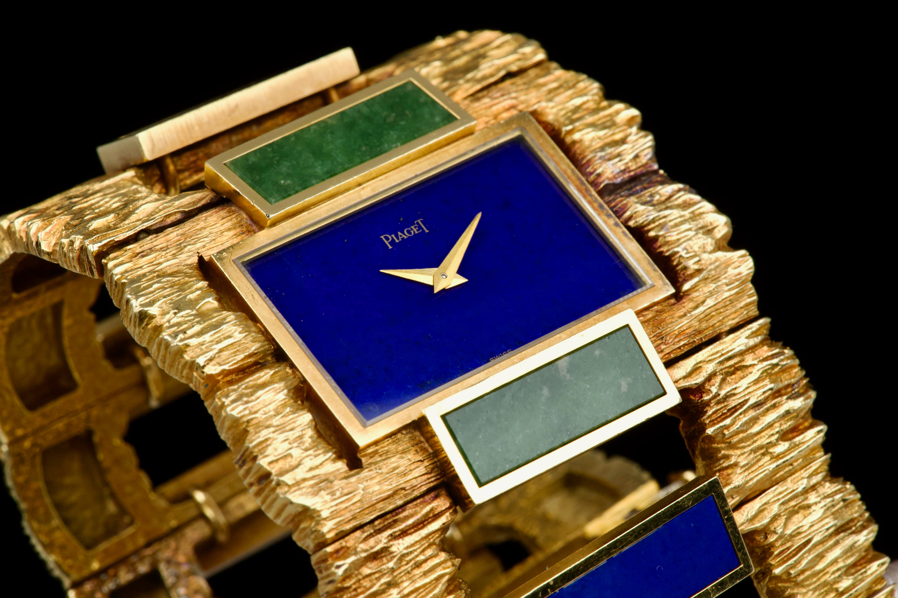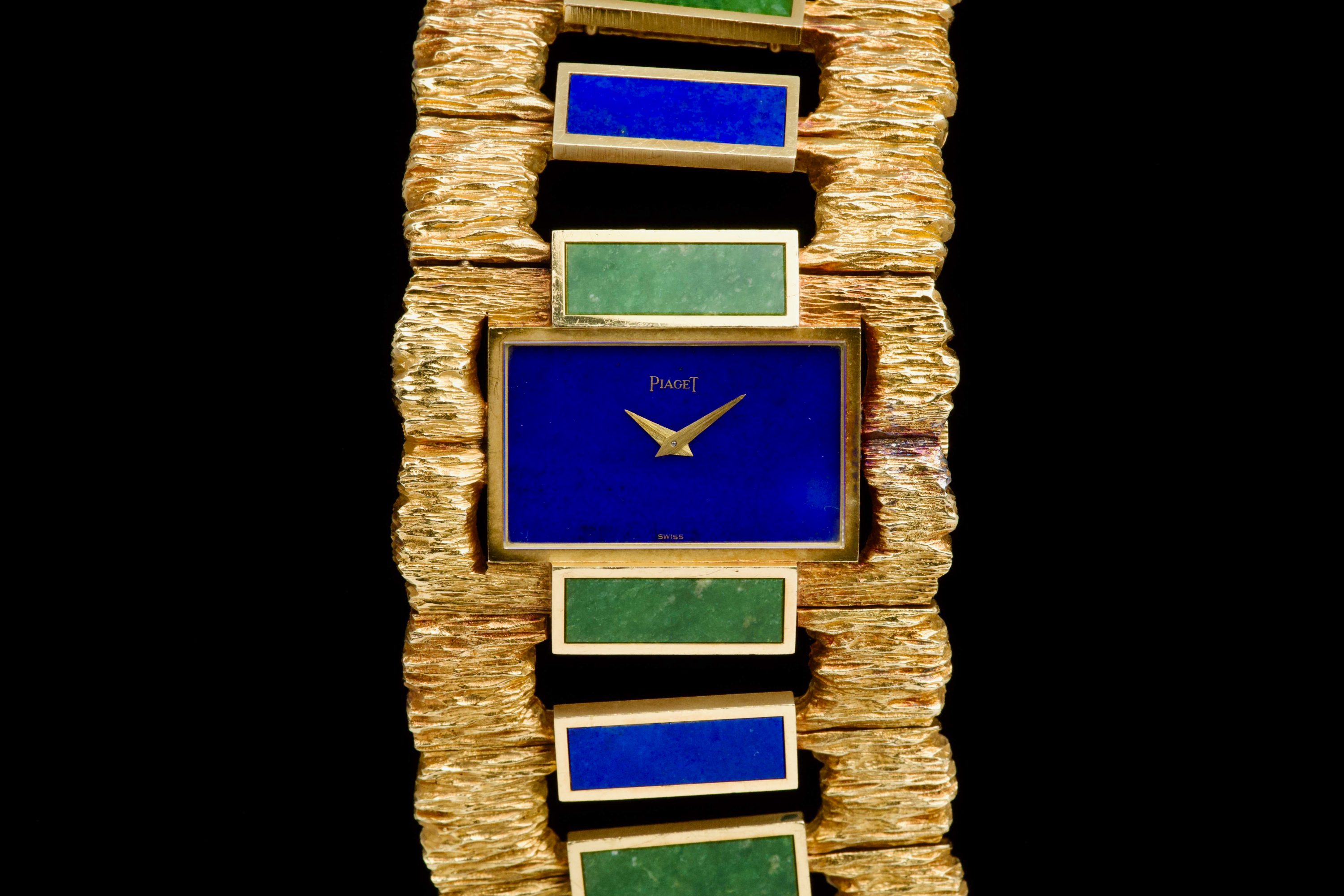 The 1970s marked an era of remarkable creativity and bold experimentation in watch design, and few maisons embodied this spirit more vividly than Piaget. Drawing upon its dual expertise as both jeweller and watchmaker, Piaget produced some of the most daring and exquisite bracelet watches of the period—creations that blurred the line between horology and high jewellery. Worn by artists, celebrities, and members of the international “jet set,” Piaget’s hardstone creations of the 1970s offered a chic and expressive alternative to conventional timepieces. The maison’s masterful use of coloured ornamental stones combined with sculptural integrated gold bracelets resulted in some of the most fascinating and collectible designs ever conceived. The present bracelet watch is a striking and beautifully preserved example of this audacious aesthetic. Crafted in gold and entirely hand-finished with a dramatic bark-like texture, the case and integrated bracelet create a powerful organic presence on the wrist. The bracelet is set with alternating brick links of lapis lazuli and jade, forming a vibrant interplay of deep blue and rich green tones. The lapis dial further enhances the natural inspiration of the piece, harmoniously blending with the textured gold surfaces. Importantly, the hardstone elements are preserved in excellent condition, with no cracks to the stones, a crucial and highly desirable attribute for collectors of such pieces. The watch is preserved in outstanding overall condition, retaining its strong visual impact and sculptural integrity more than four decades after its creation. No service history accompanies the watch. Bold, rare, and unmistakably of its era, this Piaget bracelet watch represents an exceptional opportunity to acquire a museum-worthy example of 1970s design—an ultimate statement piece for the discerning collector of unusual and highly artistic timepieces.