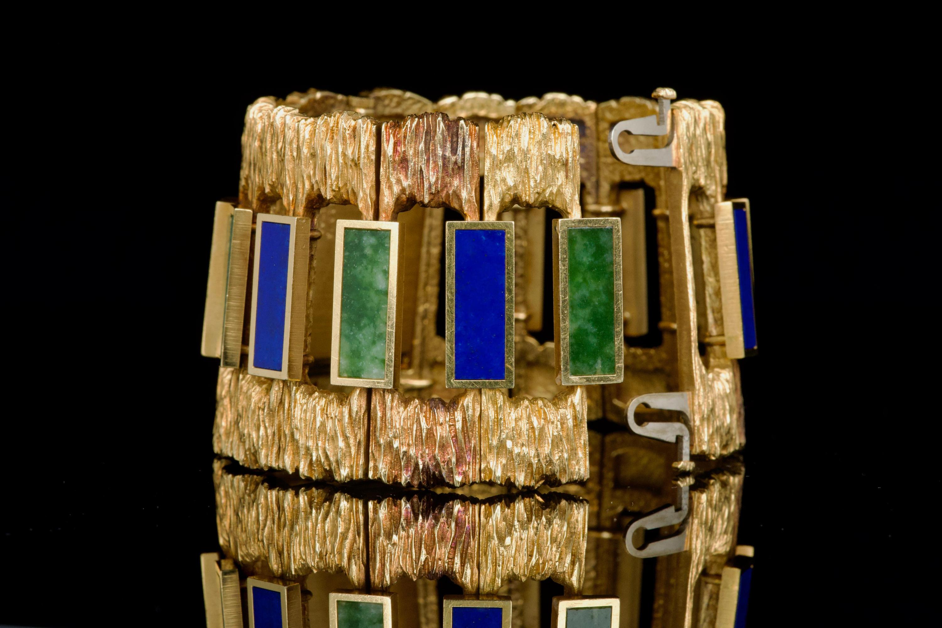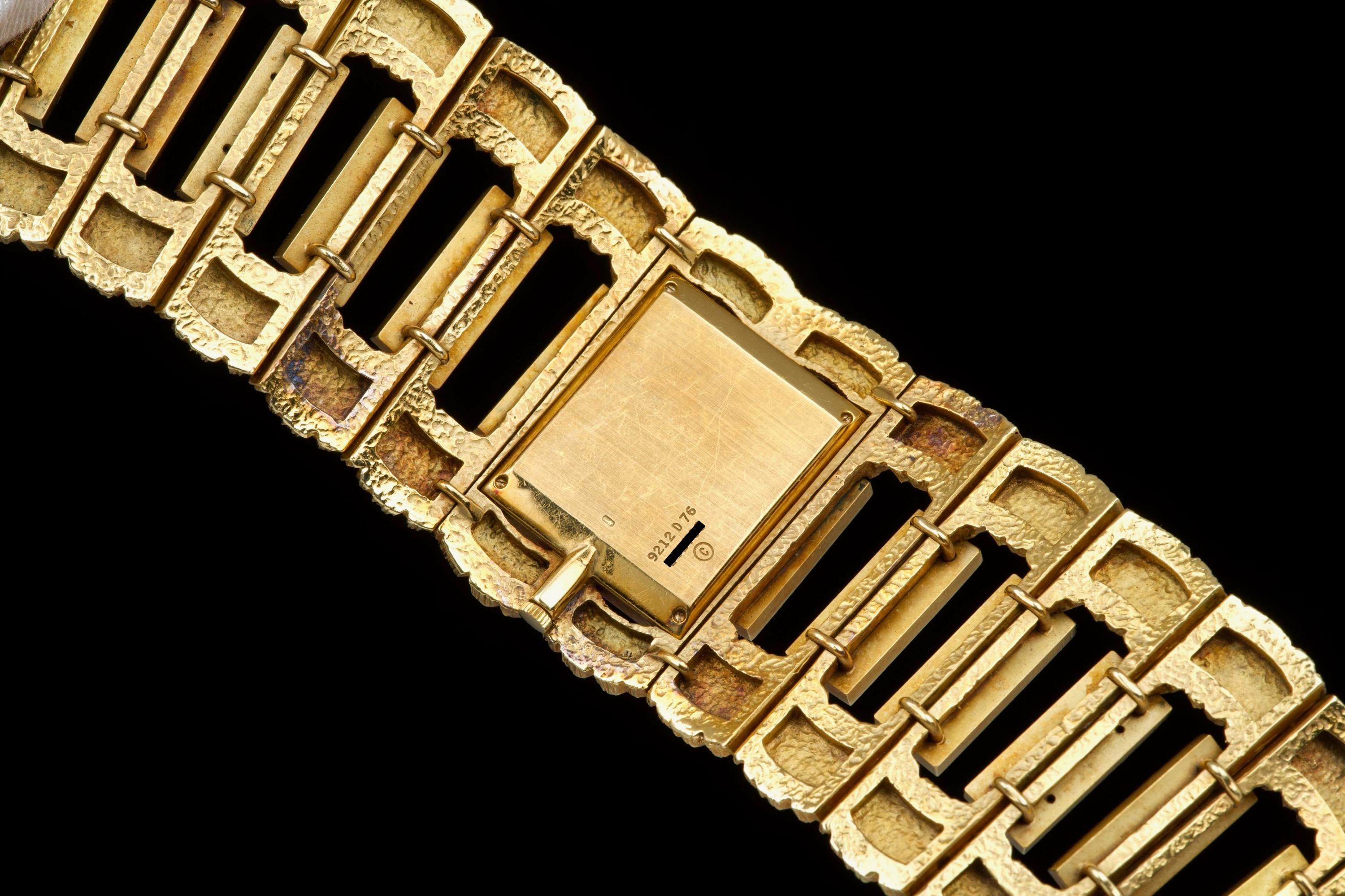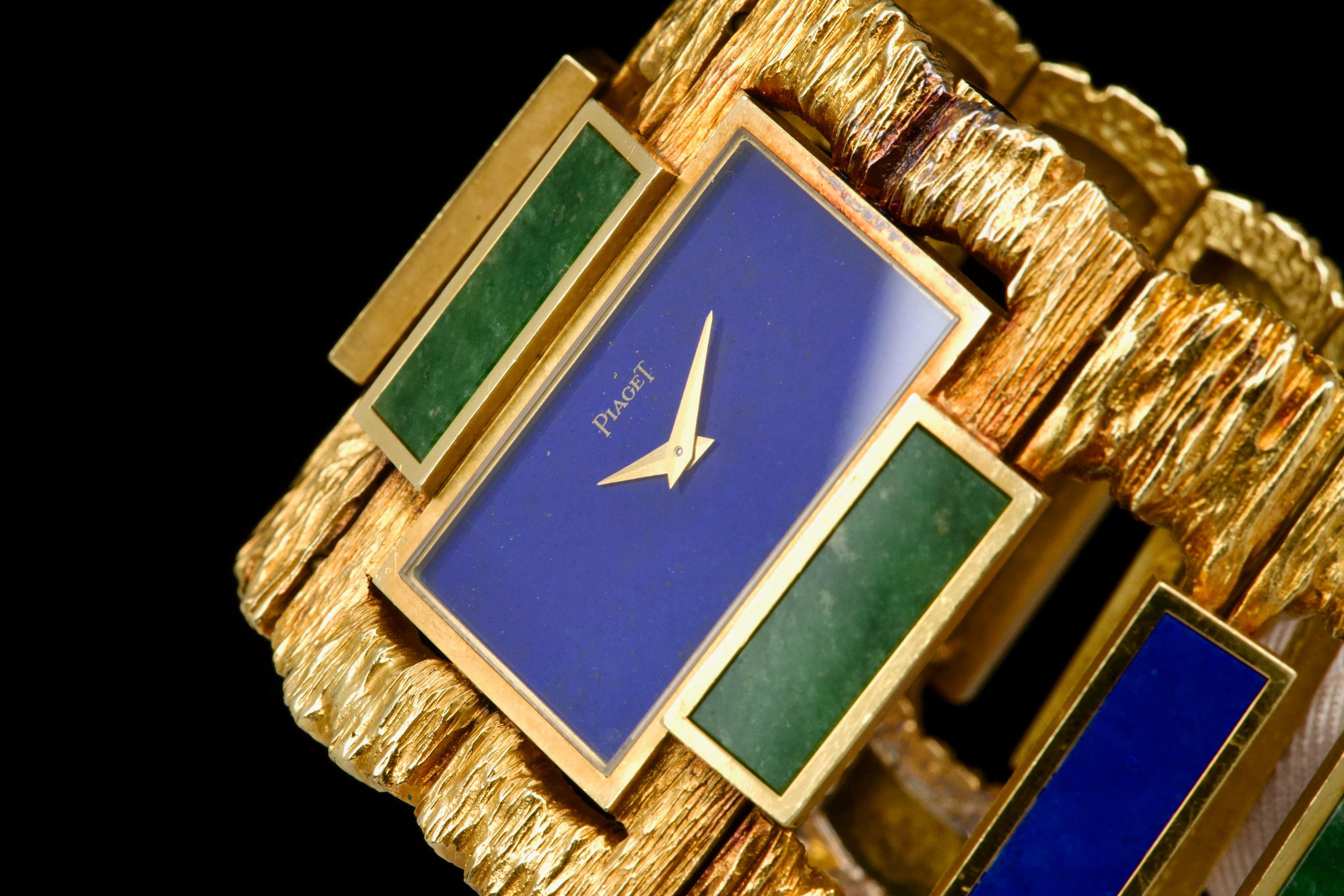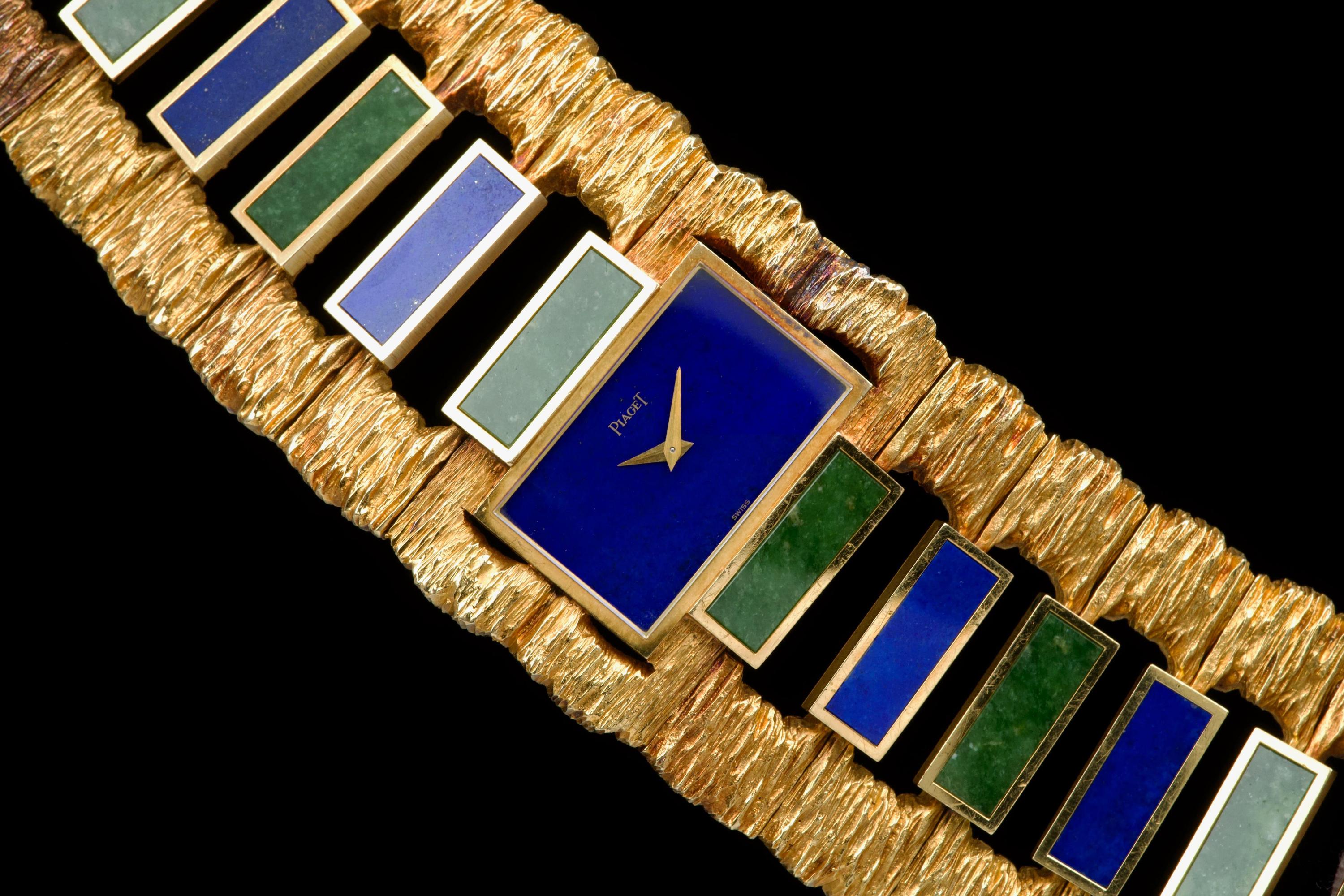 The 1970s marked an era of remarkable creativity and bold experimentation in watch design, and few maisons embodied this spirit more vividly than Piaget. Drawing upon its dual expertise as both jeweller and watchmaker, Piaget produced some of the most daring and exquisite bracelet watches of the period—creations that blurred the line between horology and high jewellery. Worn by artists, celebrities, and members of the international “jet set,” Piaget’s hardstone creations of the 1970s offered a chic and expressive alternative to conventional timepieces. The maison’s masterful use of coloured ornamental stones combined with sculptural integrated gold bracelets resulted in some of the most fascinating and collectible designs ever conceived. The present bracelet watch is a striking and beautifully preserved example of this audacious aesthetic. Crafted in gold and entirely hand-finished with a dramatic bark-like texture, the case and integrated bracelet create a powerful organic presence on the wrist. The bracelet is set with alternating brick links of lapis lazuli and jade, forming a vibrant interplay of deep blue and rich green tones. The lapis dial further enhances the natural inspiration of the piece, harmoniously blending with the textured gold surfaces. Importantly, the hardstone elements are preserved in excellent condition, with no cracks to the stones, a crucial and highly desirable attribute for collectors of such pieces. The watch is preserved in outstanding overall condition, retaining its strong visual impact and sculptural integrity more than four decades after its creation. No service history accompanies the watch. Bold, rare, and unmistakably of its era, this Piaget bracelet watch represents an exceptional opportunity to acquire a museum-worthy example of 1970s design—an ultimate statement piece for the discerning collector of unusual and highly artistic timepieces.