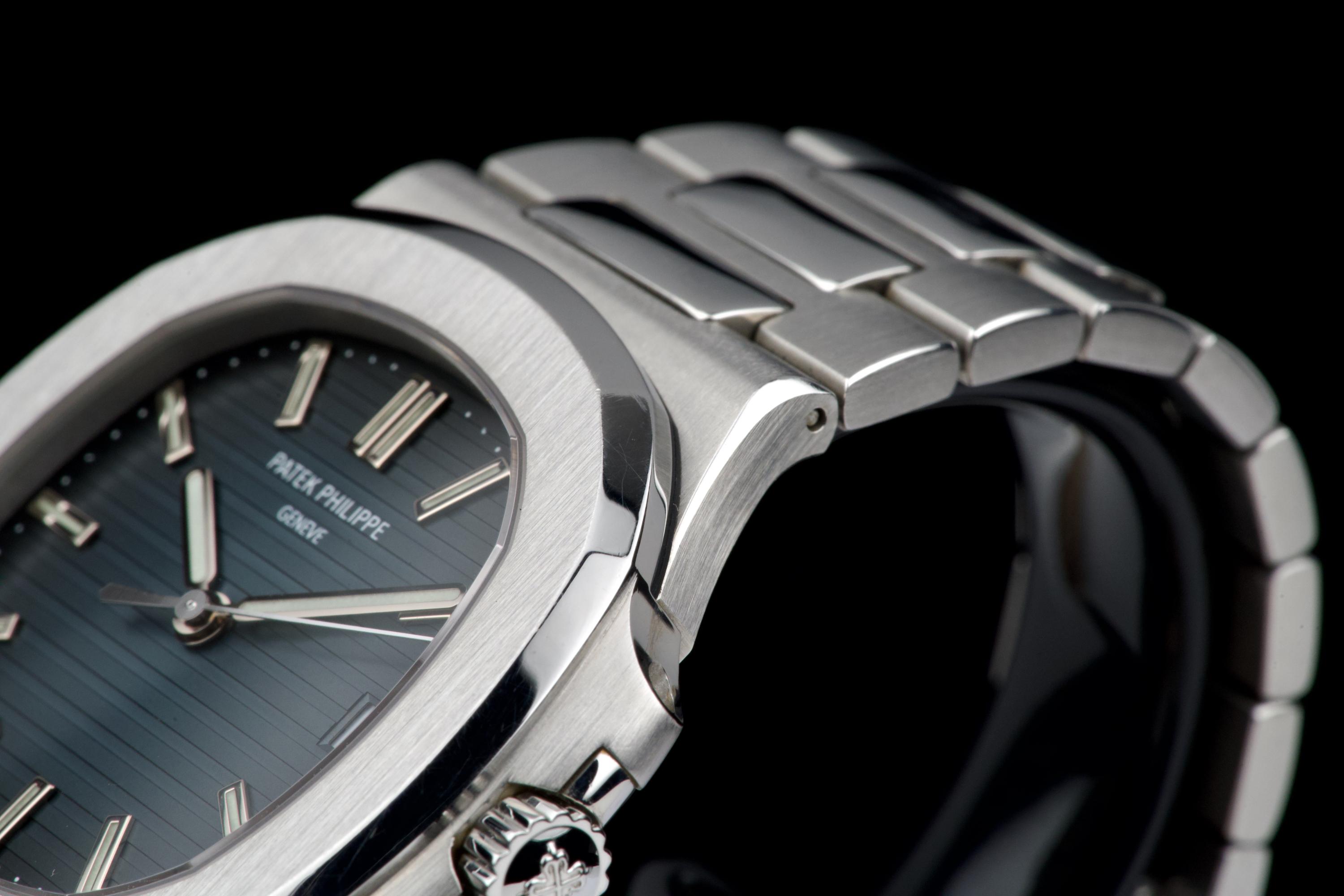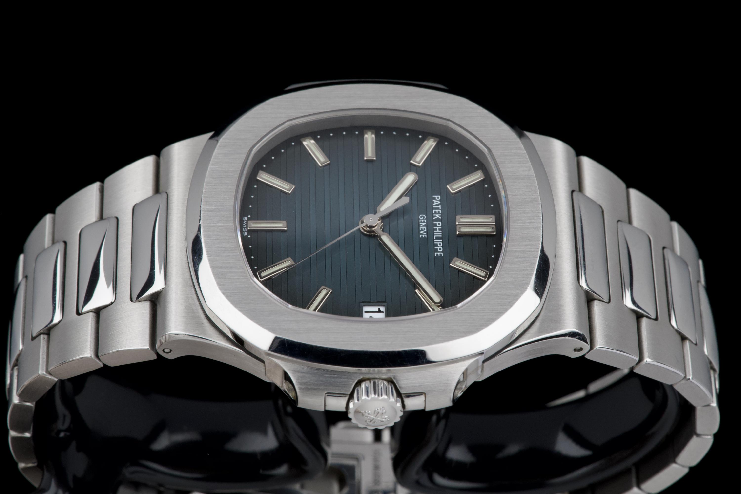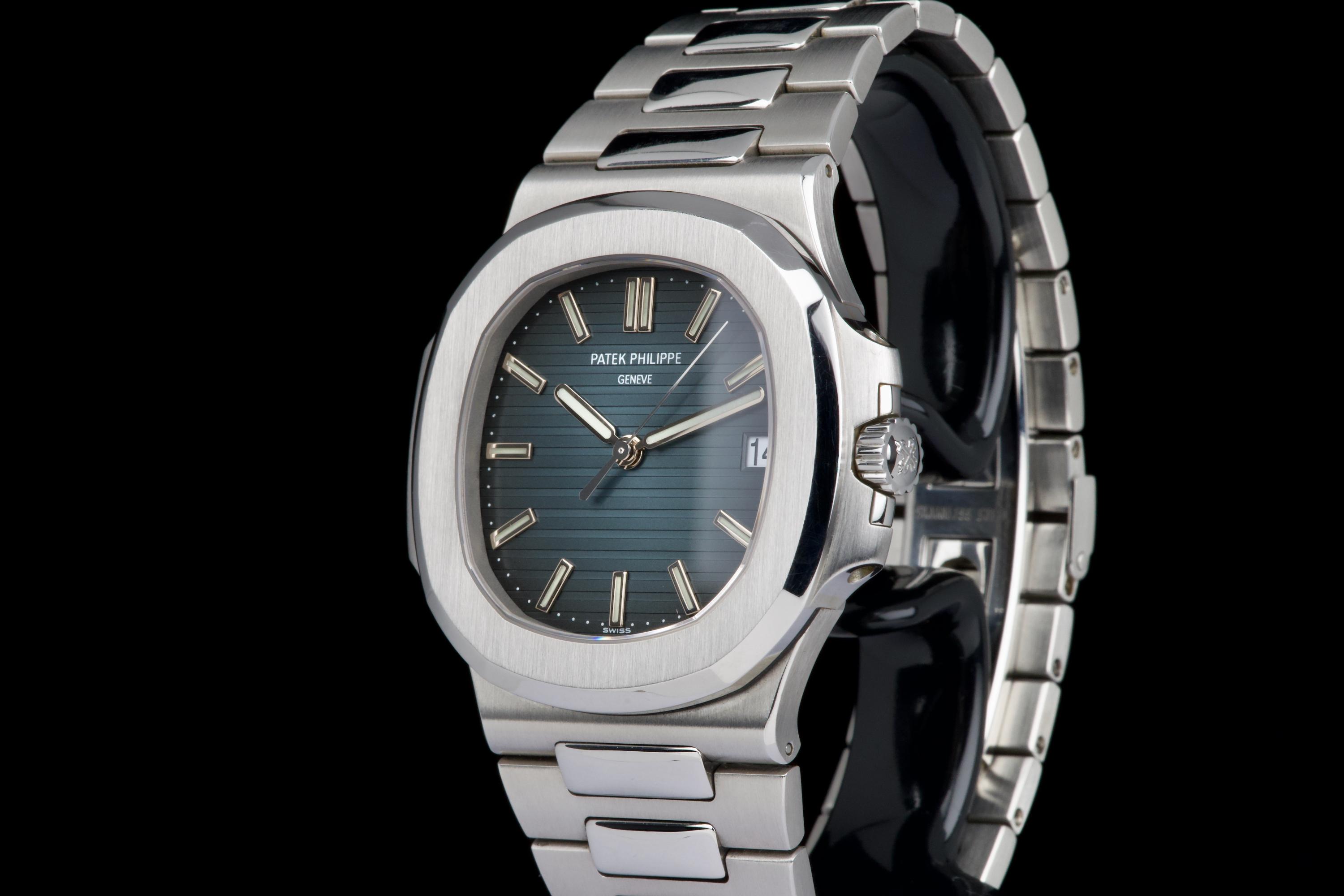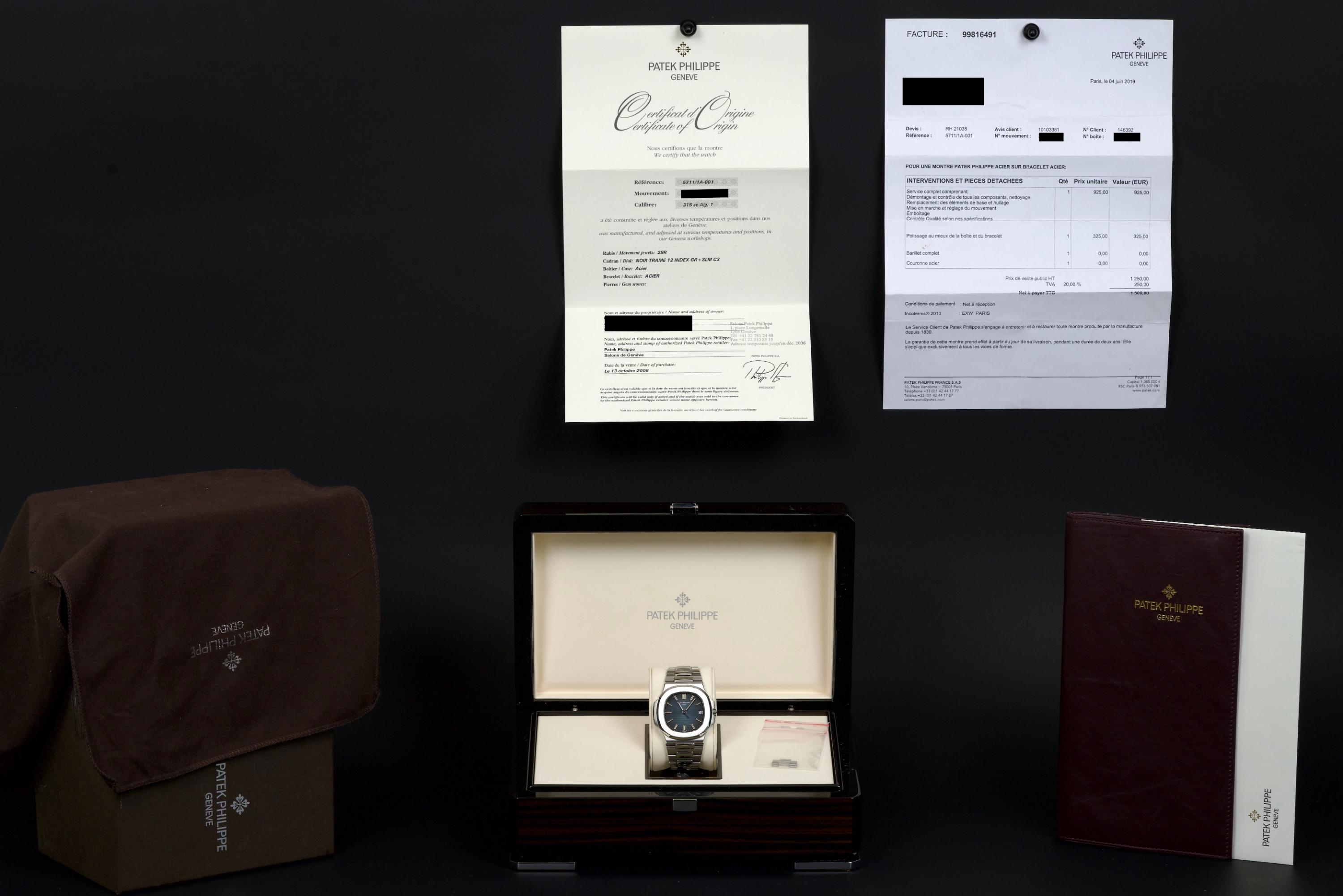 A very early and highly collectible example of the Patek Philippe Nautilus 5711/1A, featuring the first-generation MK1 dial and powered by the caliber 315 SC. Originally sold at the Patek Philippe Salons in Geneva in 2006 — the very first year of production for the reference. The watch was serviced and polished by Patek Philippe in 2019 and now shows only light wear from careful use. The iconic horizontally embossed blue dial is flawless, displaying its rich tone and perfect texture. The stainless steel bracelet shows extremely light stretch and remains tight and well preserved. Complete with its original box, certificate of origin, booklets, and accessories. A rare and historically significant first-series Nautilus 5711, representing the earliest production run of this modern icon.