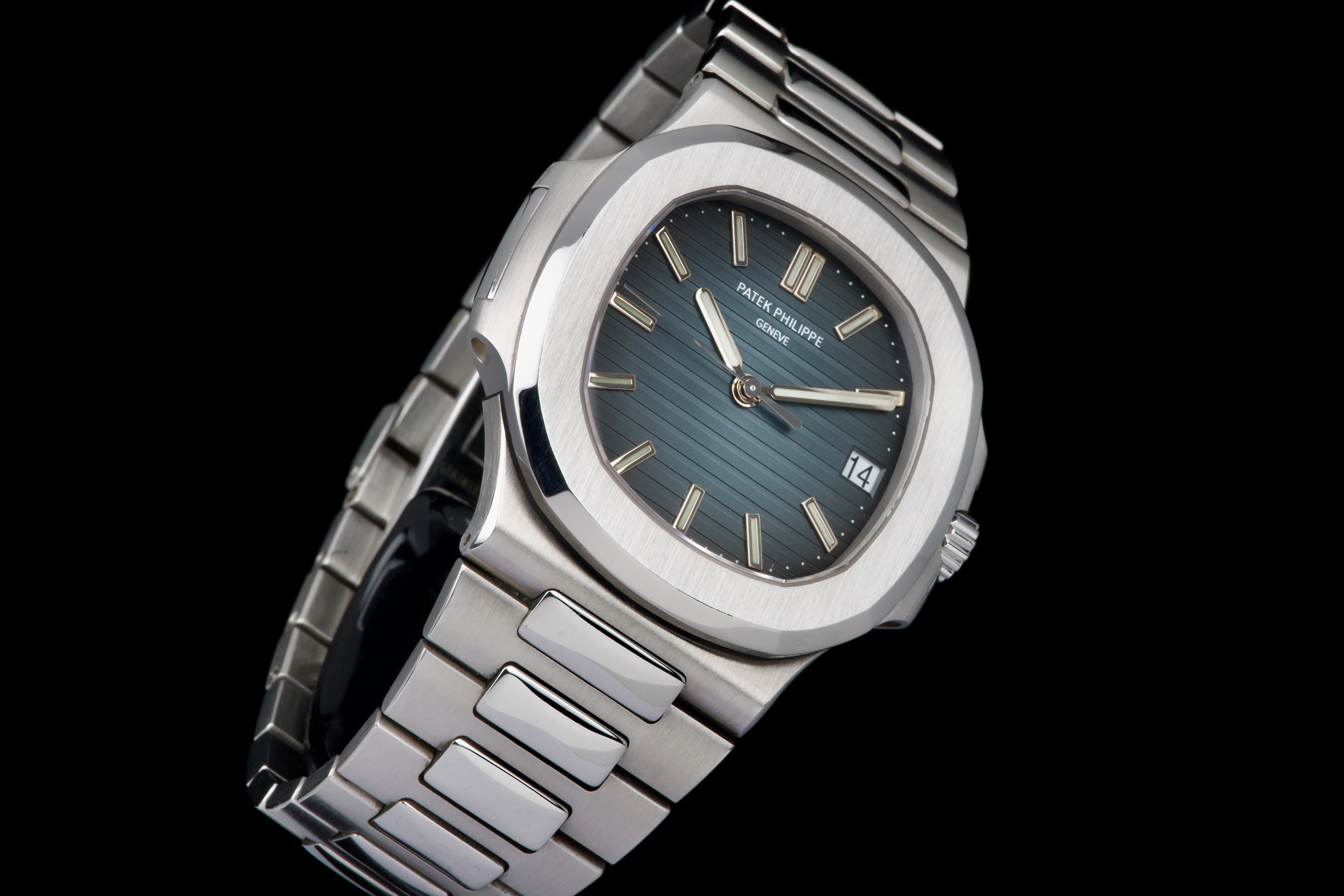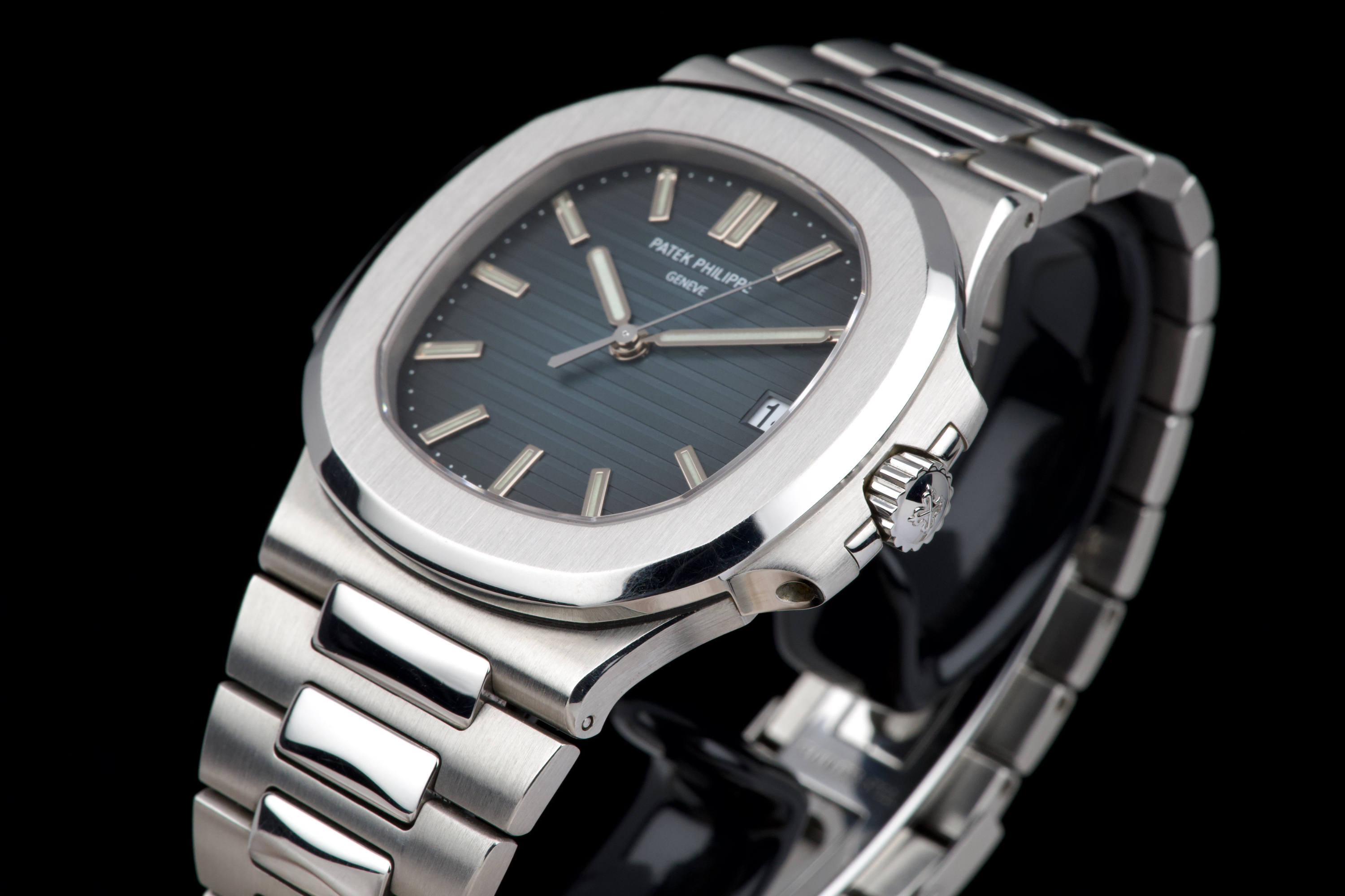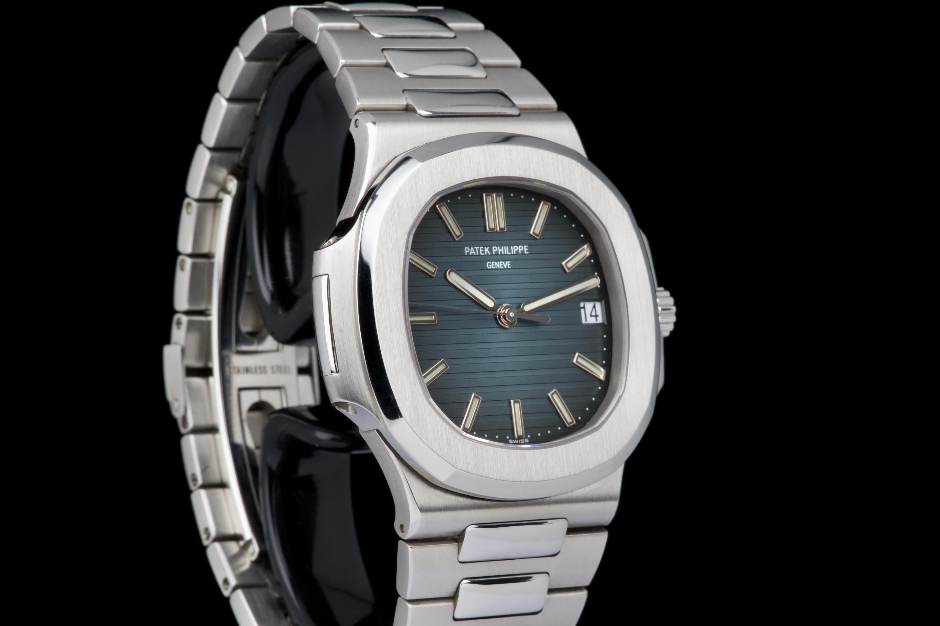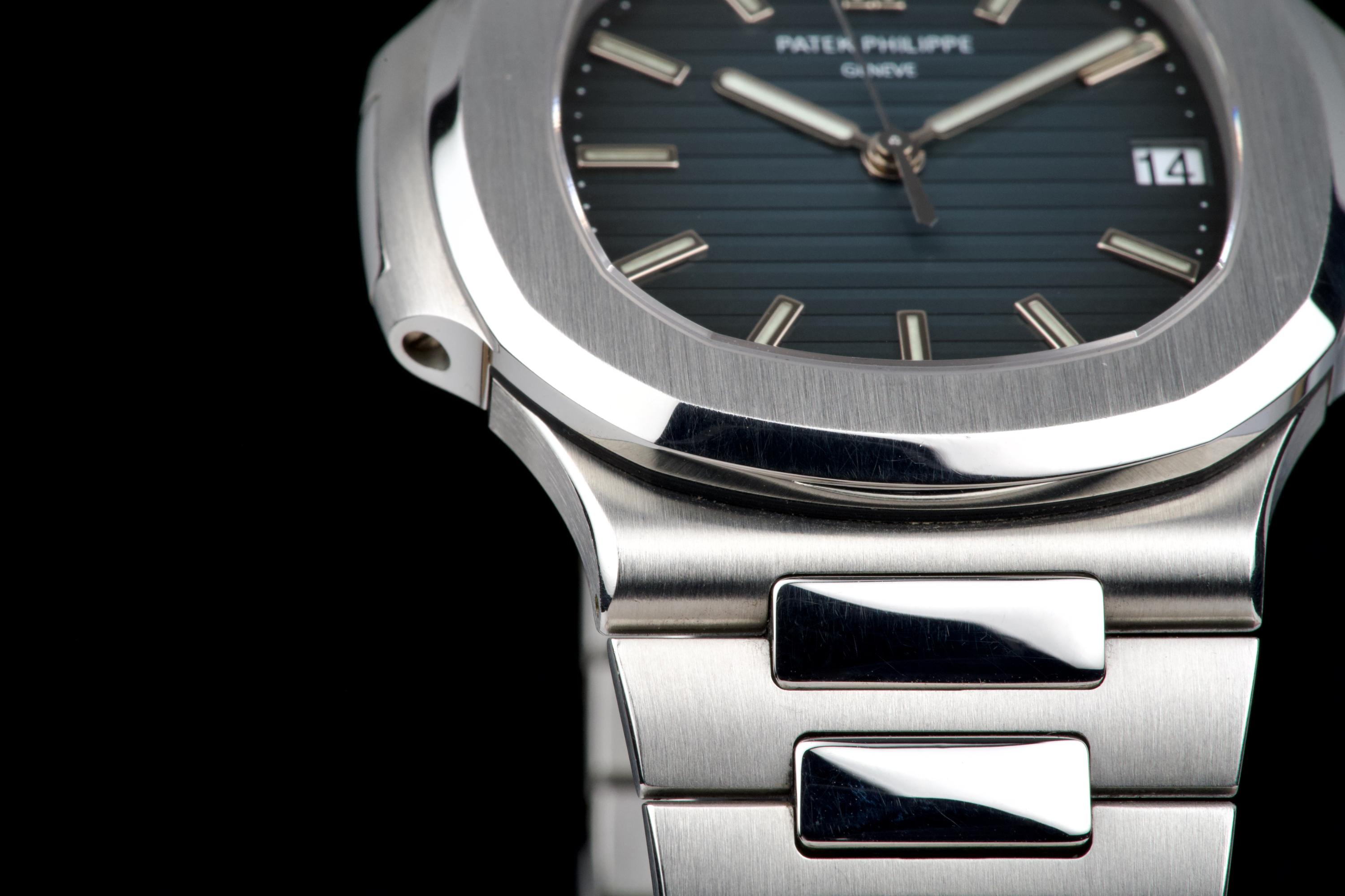 A very early and highly collectible example of the Patek Philippe Nautilus 5711/1A, featuring the first-generation MK1 dial and powered by the caliber 315 SC. Originally sold at the Patek Philippe Salons in Geneva in 2006 — the very first year of production for the reference. The watch was serviced and polished by Patek Philippe in 2019 and now shows only light wear from careful use. The iconic horizontally embossed blue dial is flawless, displaying its rich tone and perfect texture. The stainless steel bracelet shows extremely light stretch and remains tight and well preserved. Complete with its original box, certificate of origin, booklets, and accessories. A rare and historically significant first-series Nautilus 5711, representing the earliest production run of this modern icon.