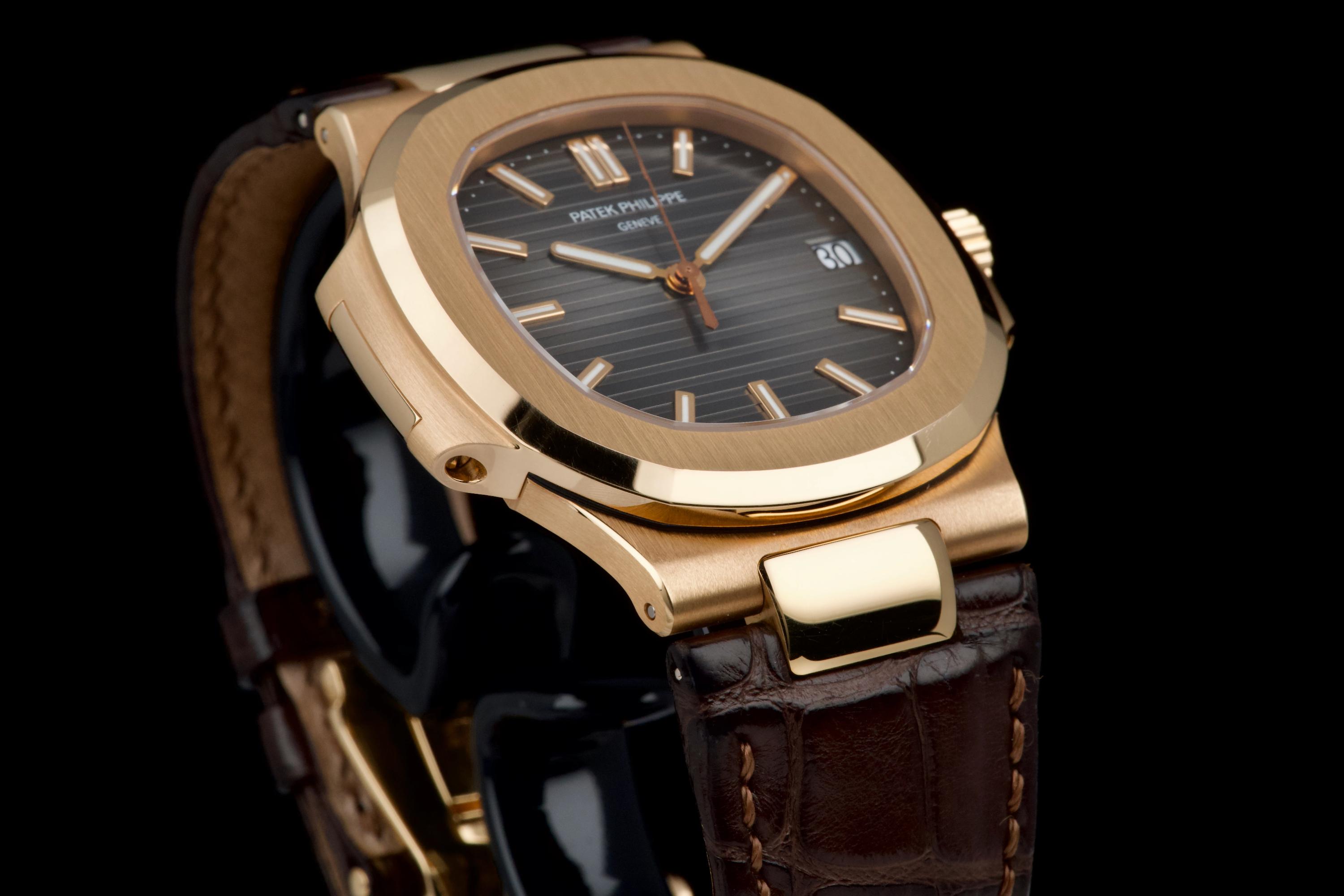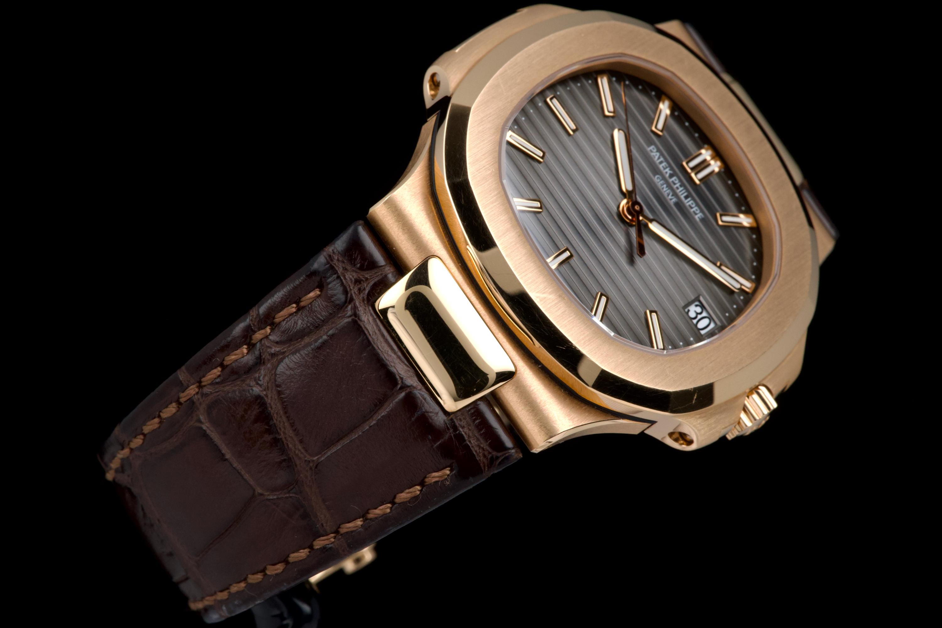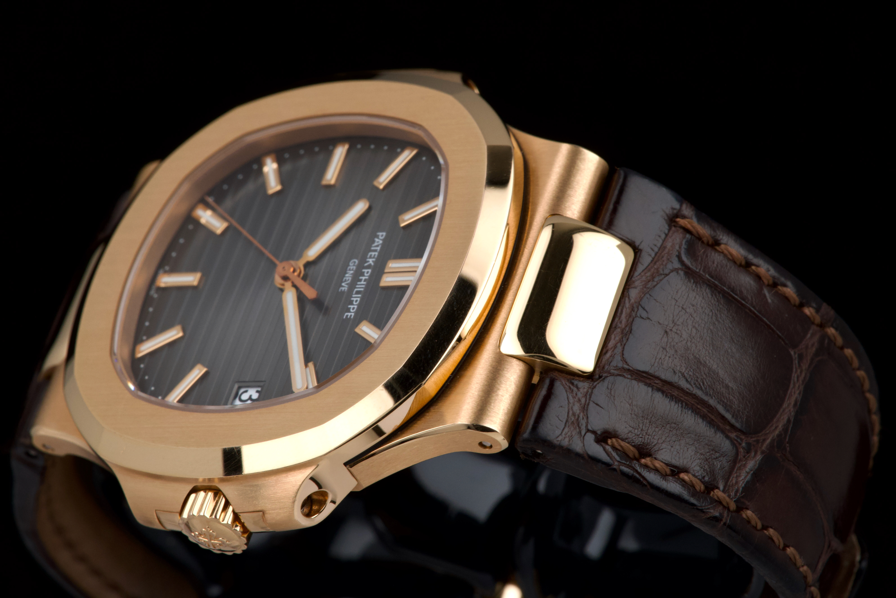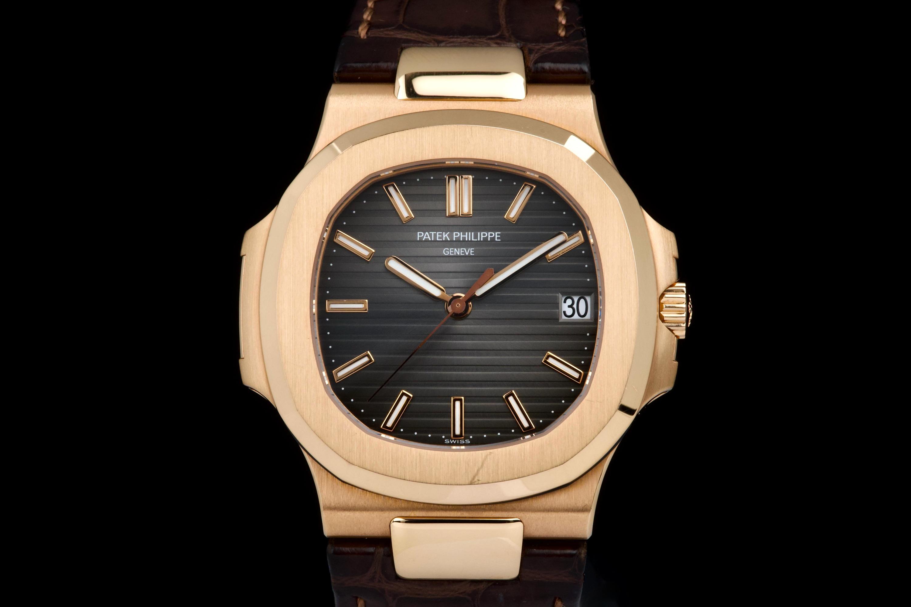The present Patek Philippe Nautilus reference 5711R, dating to 2008, is an elegant and highly desirable example of the iconic model executed in 18K rose gold, offered with its original papers. Renowned for its timeless Gérald Genta design and refined proportions, the 5711R remains one of the most coveted modern Nautilus configurations. The rose-gold case appears to be unpolished and is preserved in excellent overall condition for its age, retaining crisp lines and strong definition throughout. The original brown luminova dial is likewise in outstanding condition, displaying rich depth and perfect clarity, with matching hands that create a harmonious and coherent aesthetic. The watch is fitted with its original brown Patek Philippe crocodile leather strap, which remains in excellent condition, and is paired with the correct original rose-gold deployant clasp, completing the ensemble with full period coherence. While no service history accompanies the watch, it is functioning correctly at the time of cataloguing. Combining an unpolished case, superb dial, and desirable rose-gold execution, this Nautilus 5711R from 2008 represents a compelling opportunity to acquire one of Patek Philippe’s most iconic modern sports watches in highly attractive and original condition