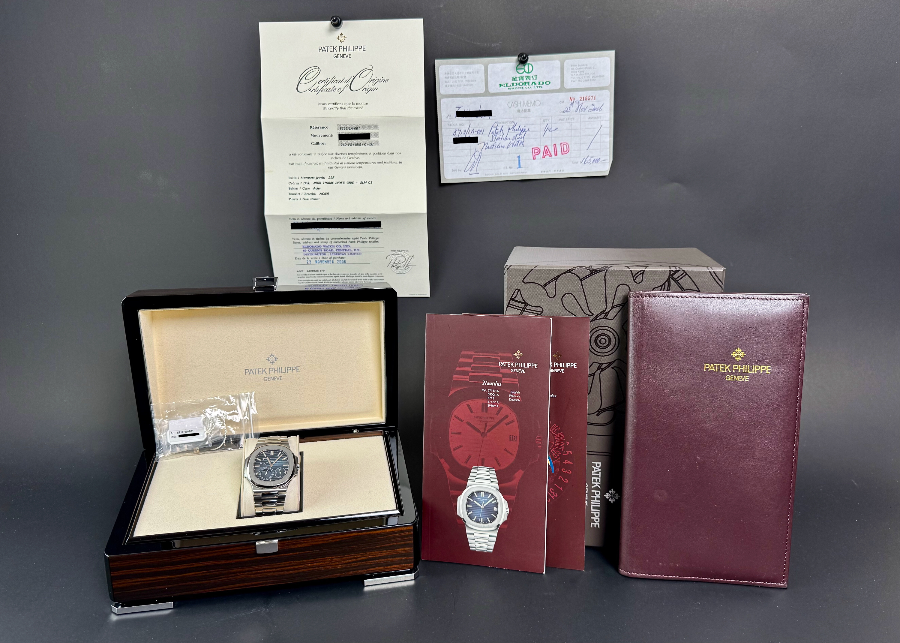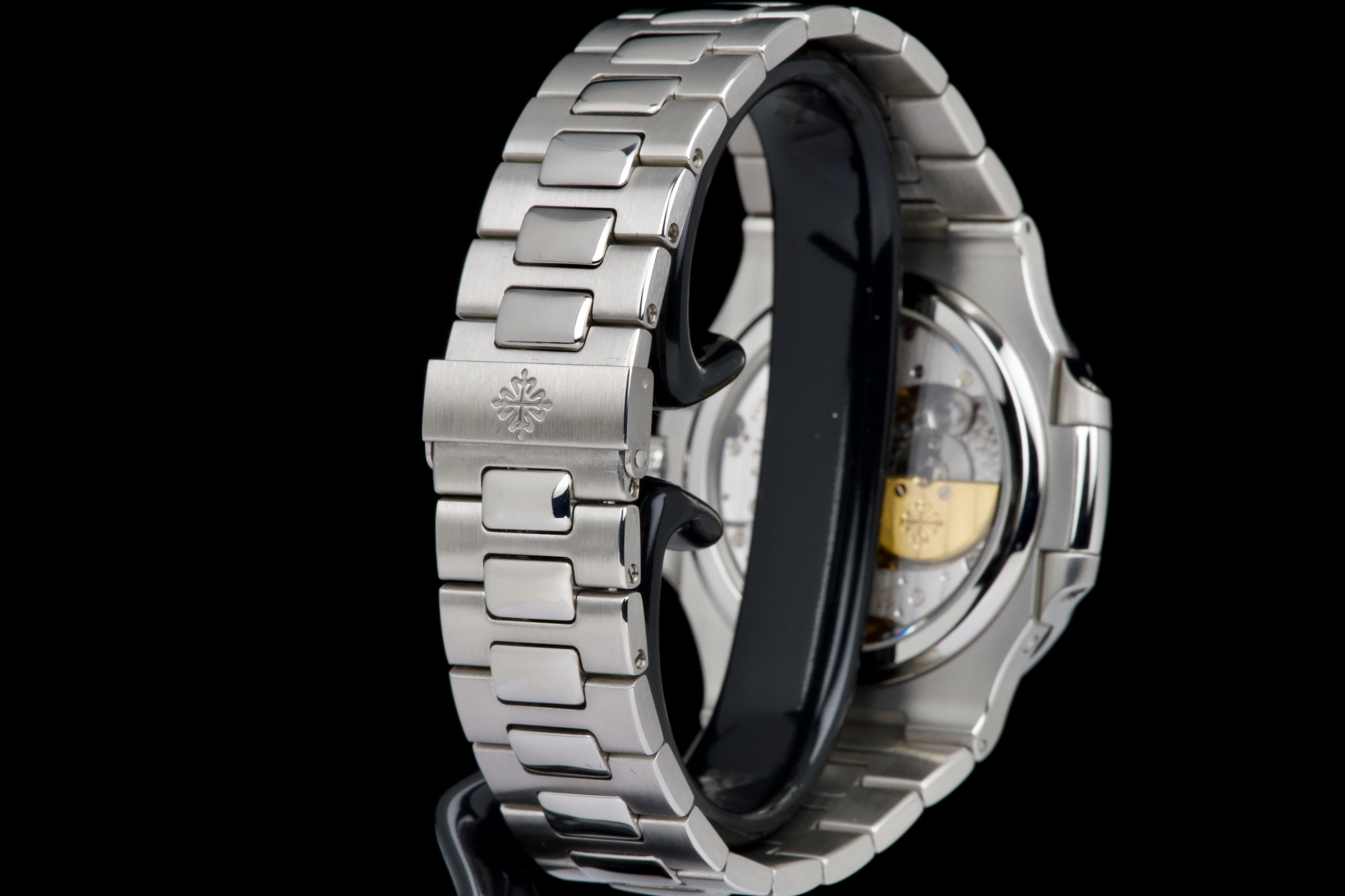 An early and highly collectible example of the Patek Philippe Nautilus 5712/1A, featuring the desirable MK1 dial with the single dot under the “48” of the power reserve indicator — a detail found only on the earliest production pieces. The watch has been recently polished and is presented in very good overall condition, with a strong case, excellent dial (showing only two discreet marks near the 9 o’clock index), and a bracelet with minimal stretch. Powered by the automatic Patek Philippe caliber 240 PS IRM C LU, displaying power reserve, date, and moonphase. Sold new in 2006 and accompanied by its complete full set, including original invoice, certificate, box, and booklets. A superb and rare early Nautilus 5712 MK1 — elegant, historically significant, and beautifully preserved.
