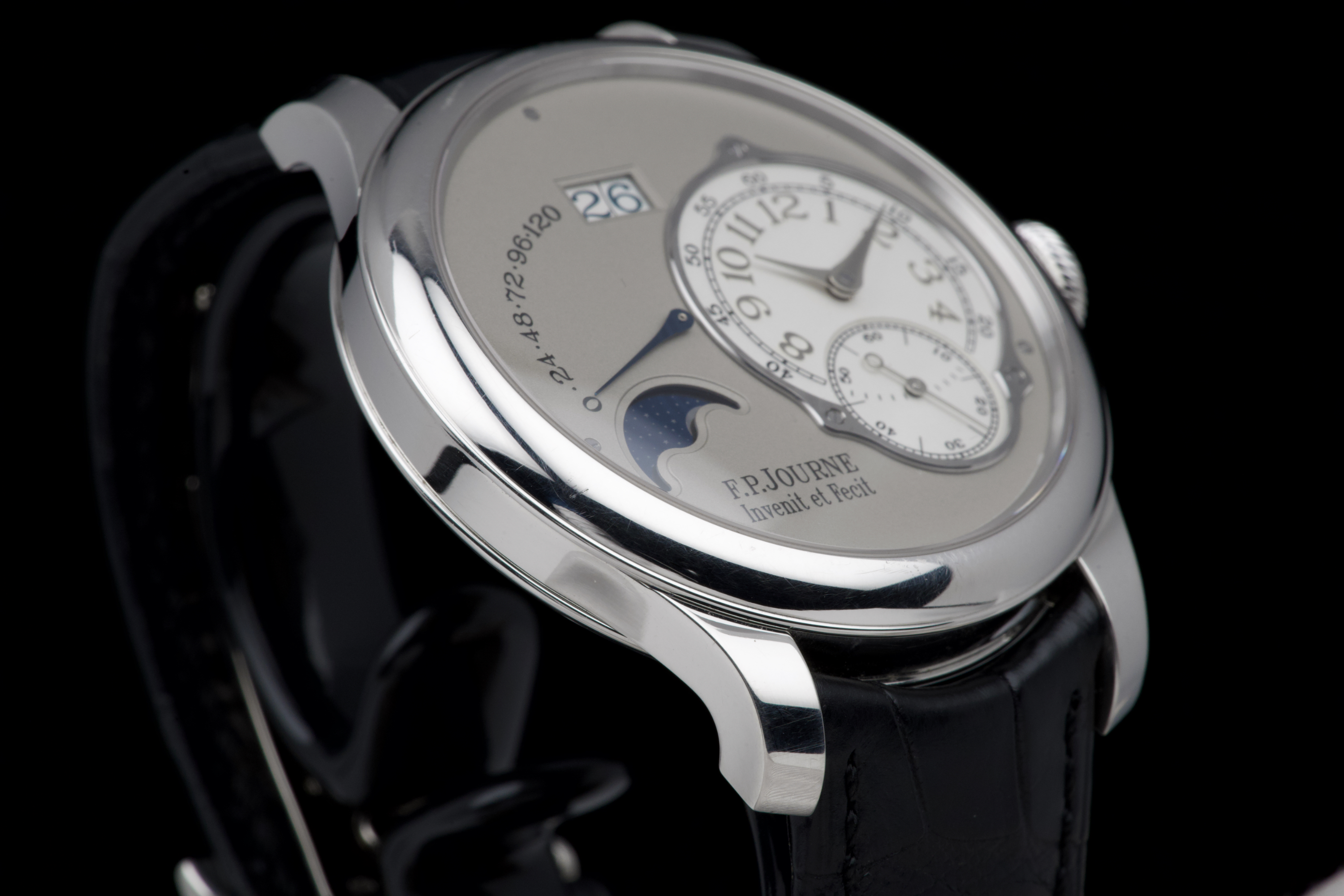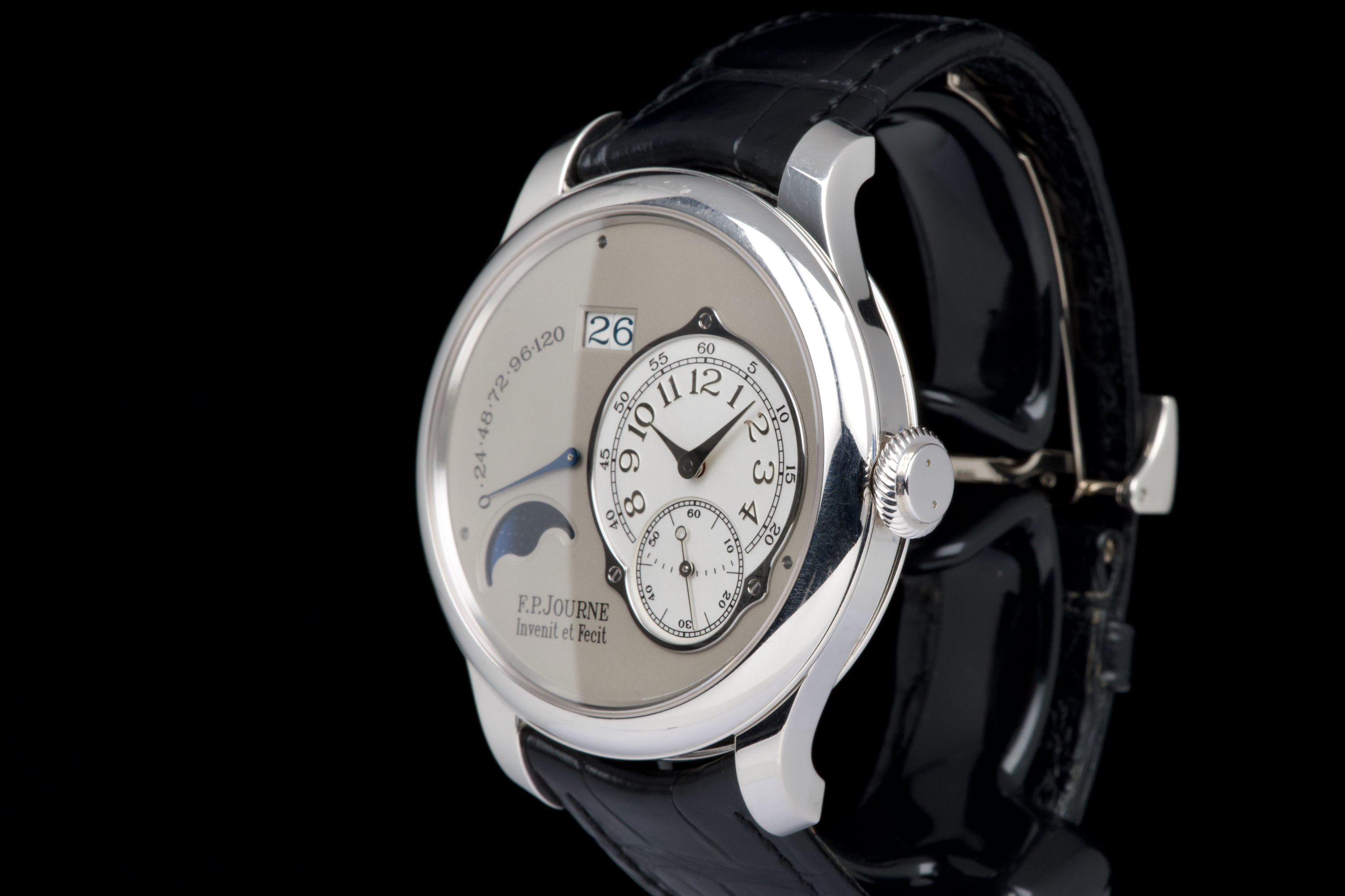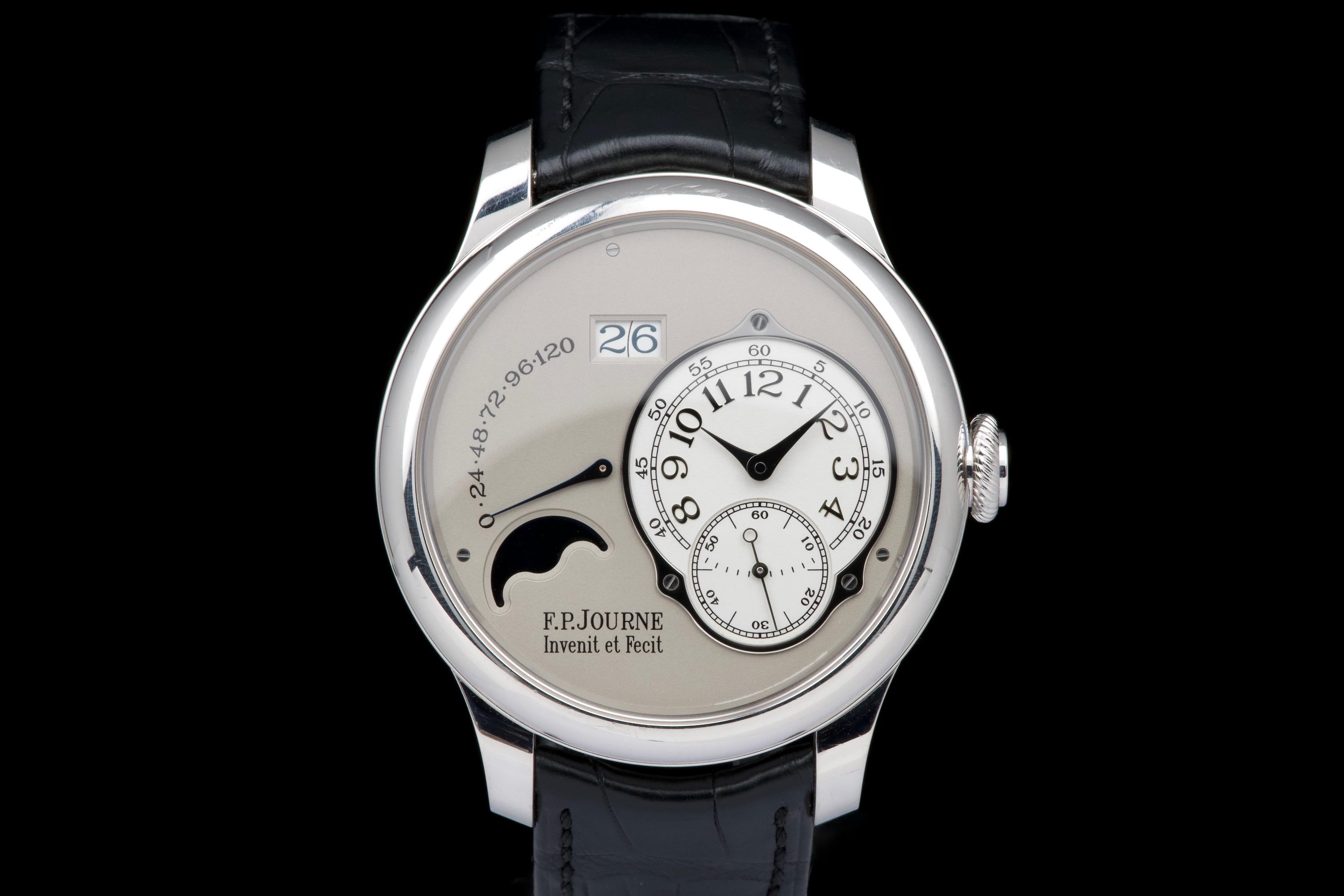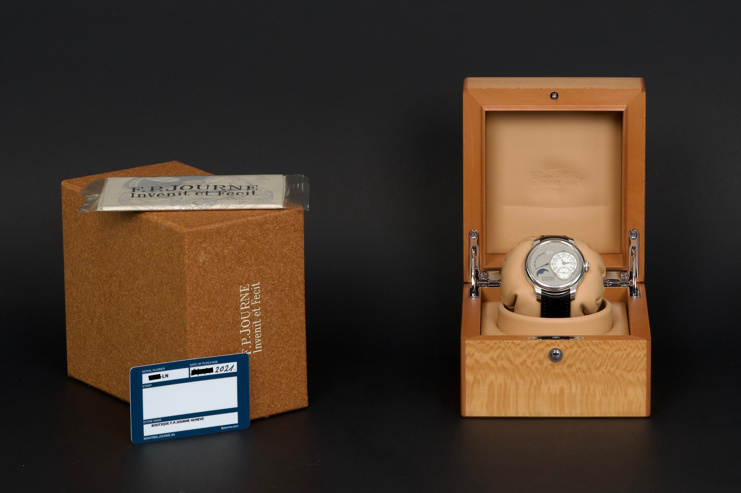 A beautiful example of the F.P. Journe Octa Lune in platinum, coming from its second owner and complete with its full 2021 set. The watch remains unpolished, showing light wear and small marks from use, consistent with careful ownership. The 42 mm platinum case houses the automatic F.P. Journe caliber 1300.3, crafted in solid 18K rose gold and visible through the sapphire caseback. Fitted with a platinum deployant clasp, this Octa Lune combines refined proportions with the perfect balance of practicality and elegance. A superb and honest example of the larger 42 mm Octa Lune — understated, luxurious, and powered by one of F.P. Journe’s most celebrated automatic movements.