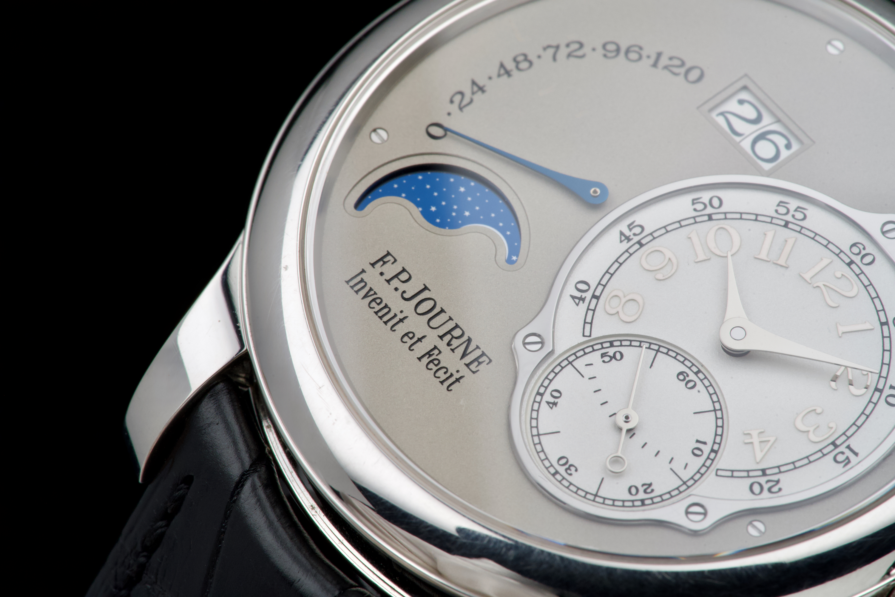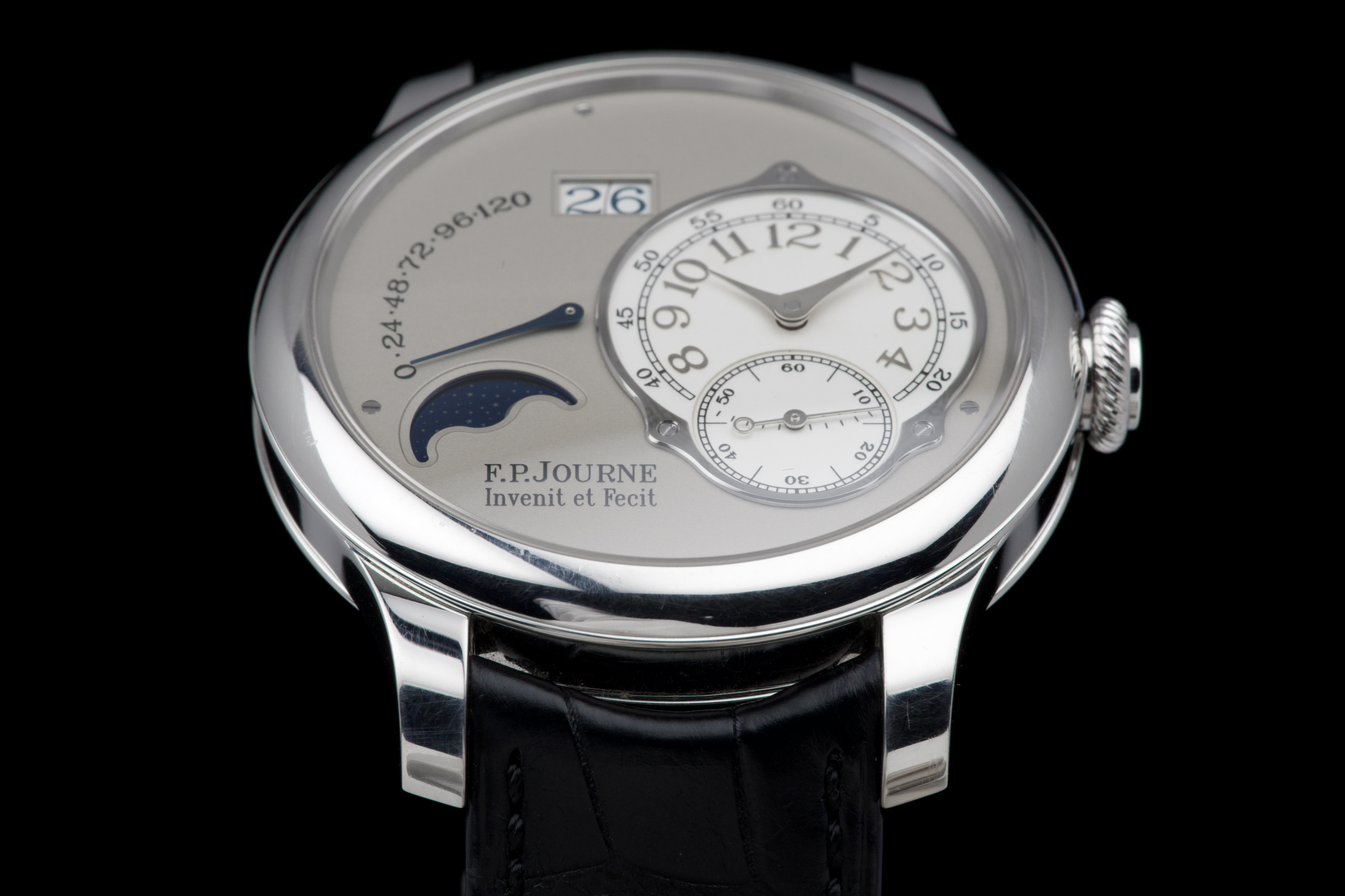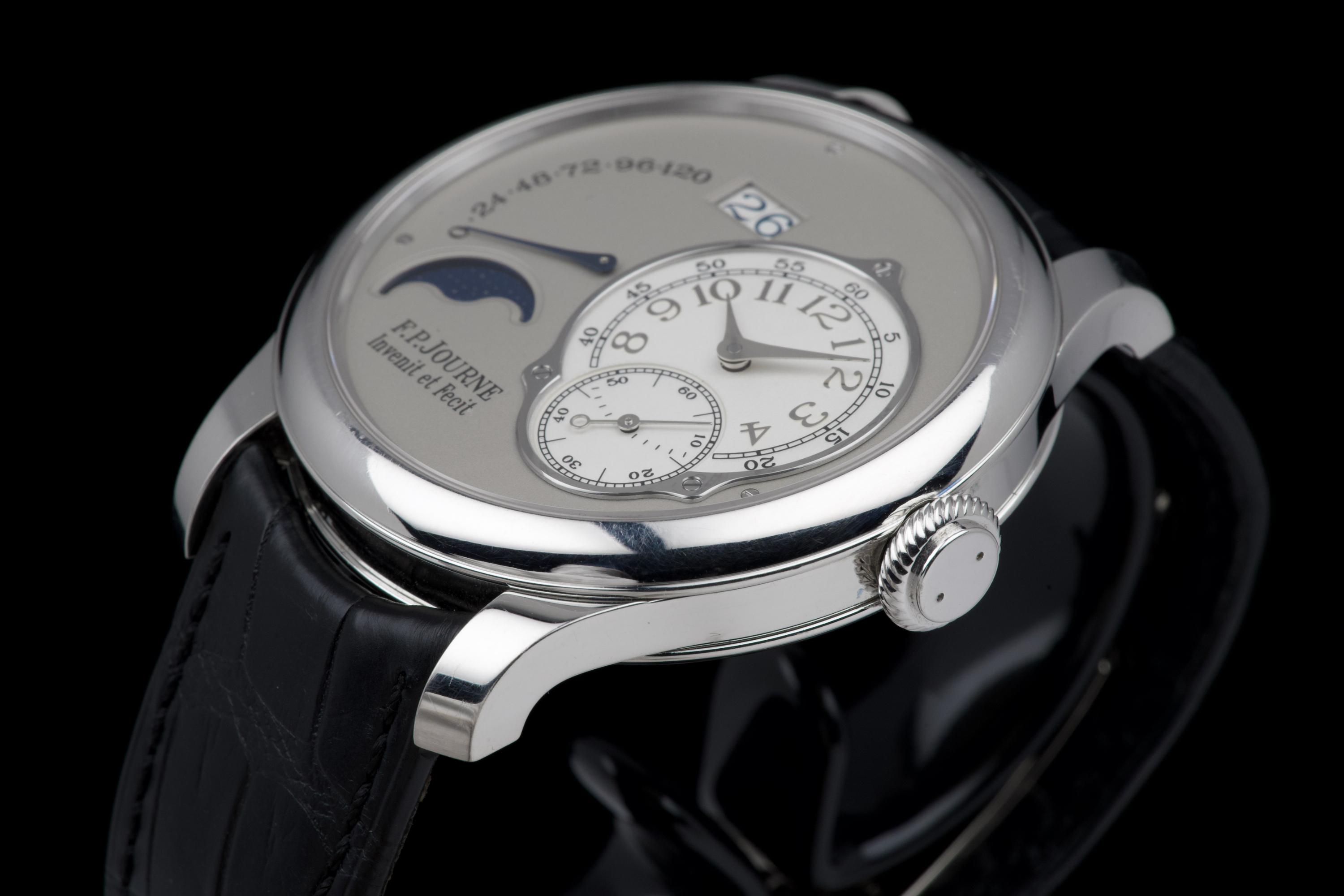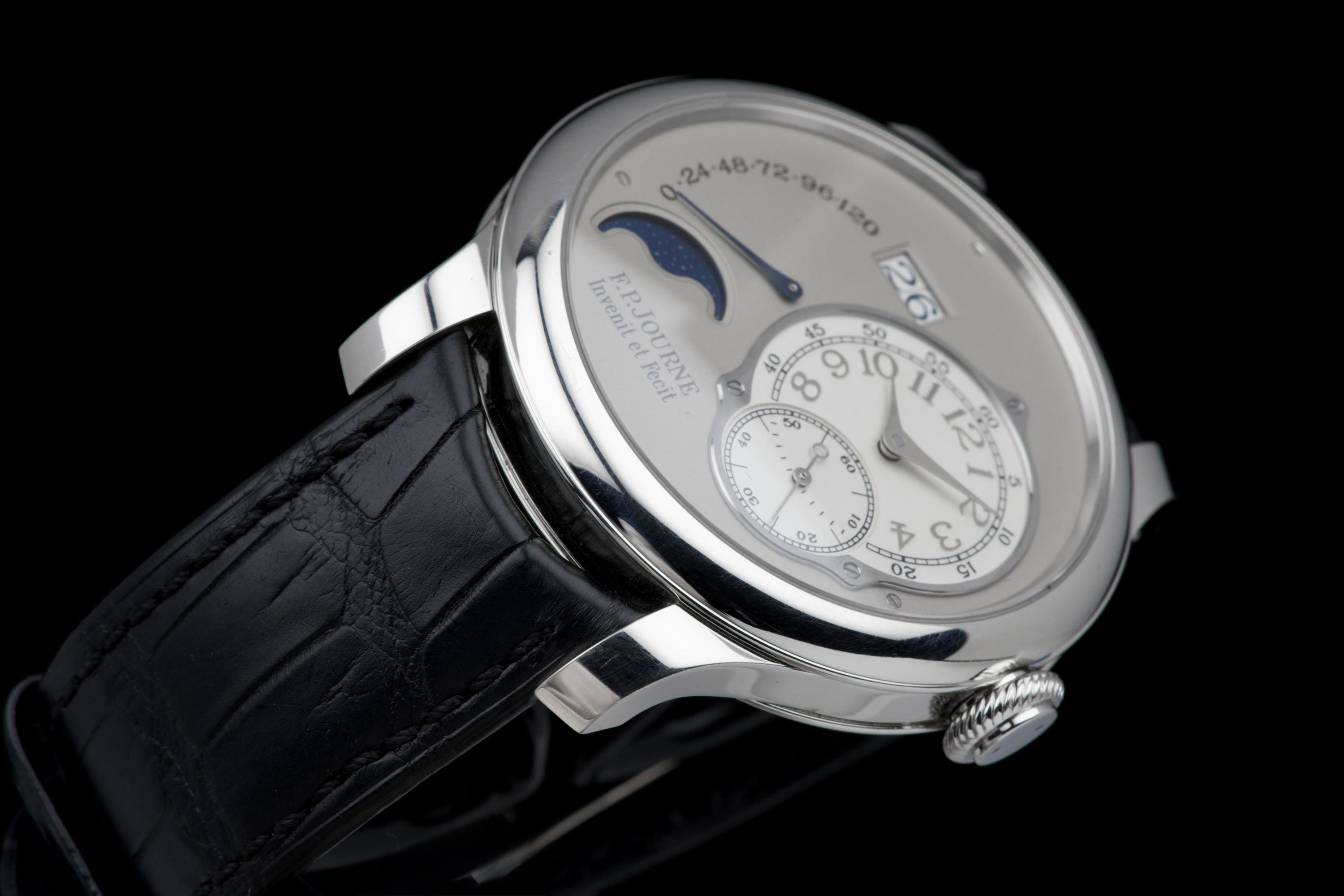 A beautiful example of the F.P. Journe Octa Lune in platinum, coming from its second owner and complete with its full 2021 set. The watch remains unpolished, showing light wear and small marks from use, consistent with careful ownership. The 42 mm platinum case houses the automatic F.P. Journe caliber 1300.3, crafted in solid 18K rose gold and visible through the sapphire caseback. Fitted with a platinum deployant clasp, this Octa Lune combines refined proportions with the perfect balance of practicality and elegance. A superb and honest example of the larger 42 mm Octa Lune — understated, luxurious, and powered by one of F.P. Journe’s most celebrated automatic movements.