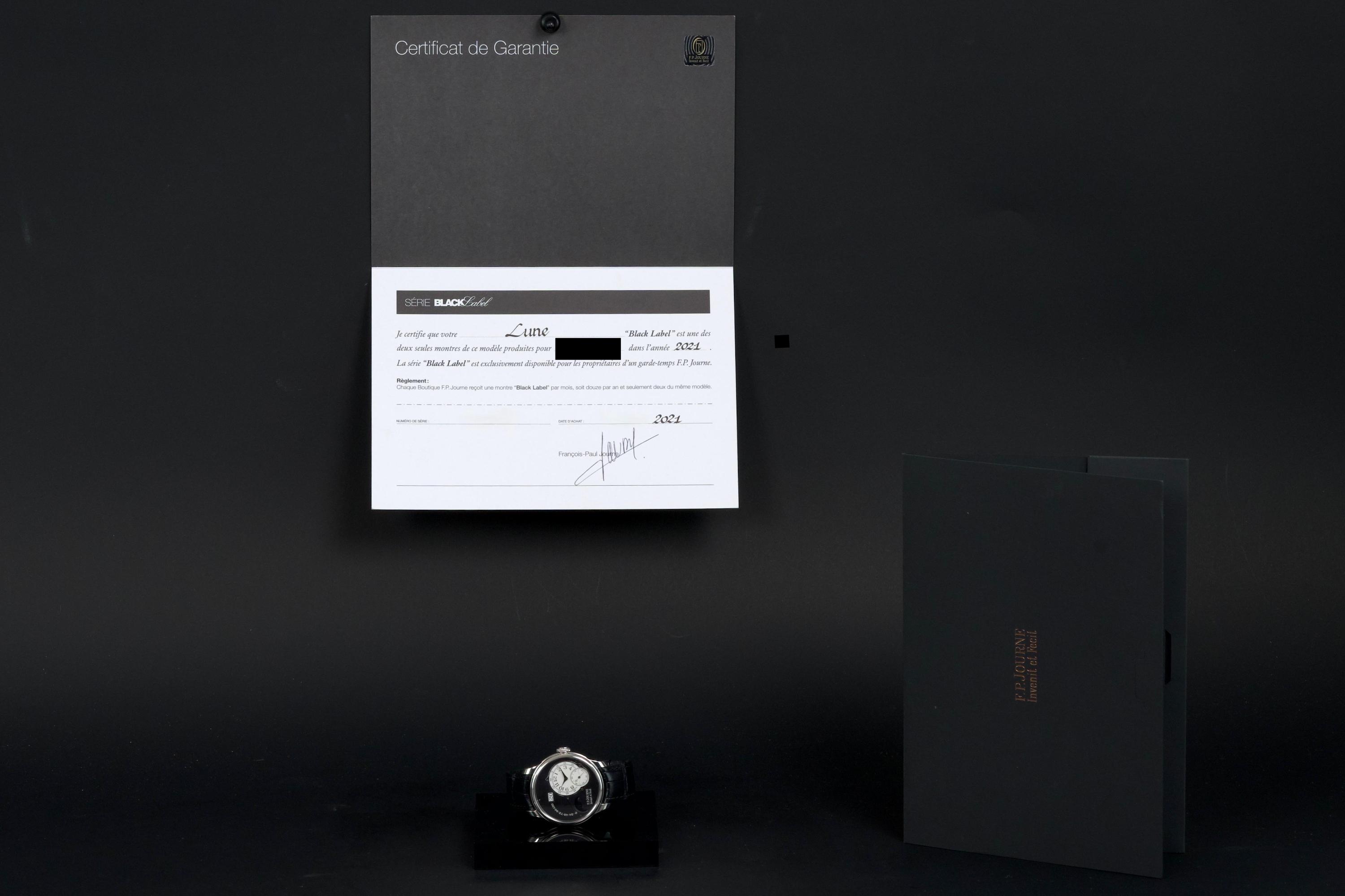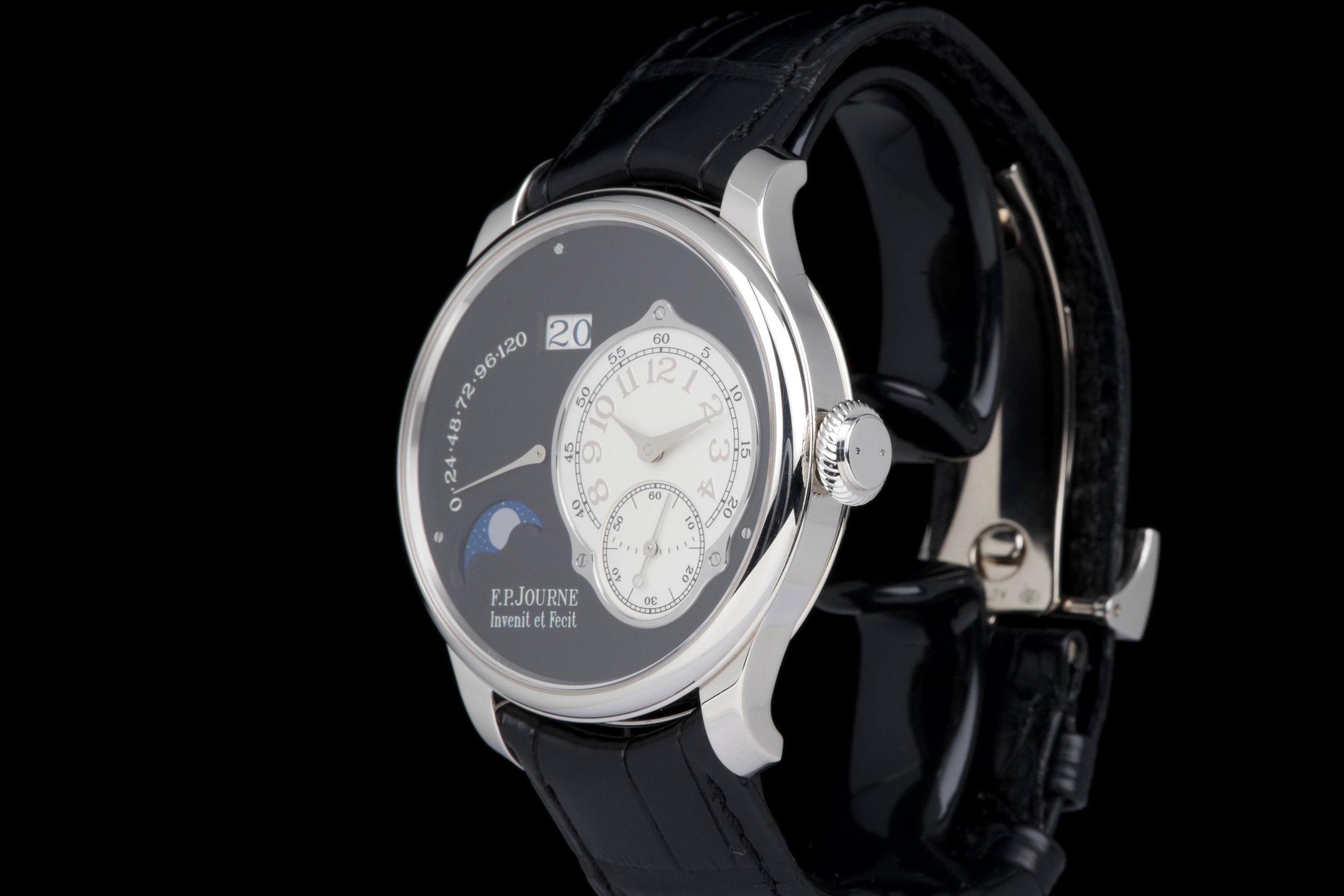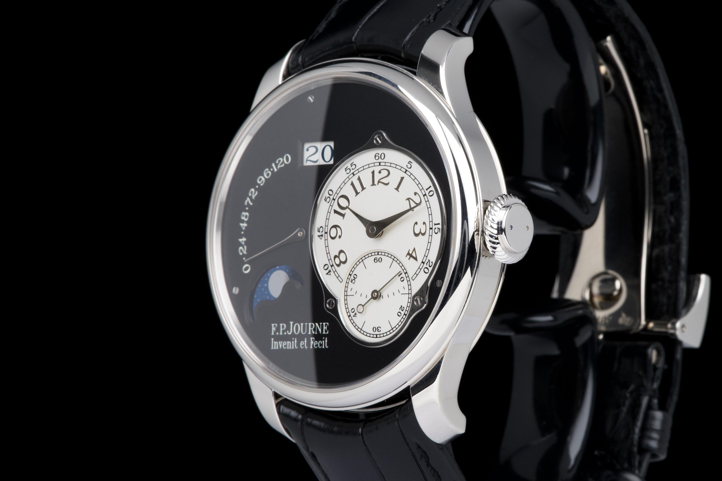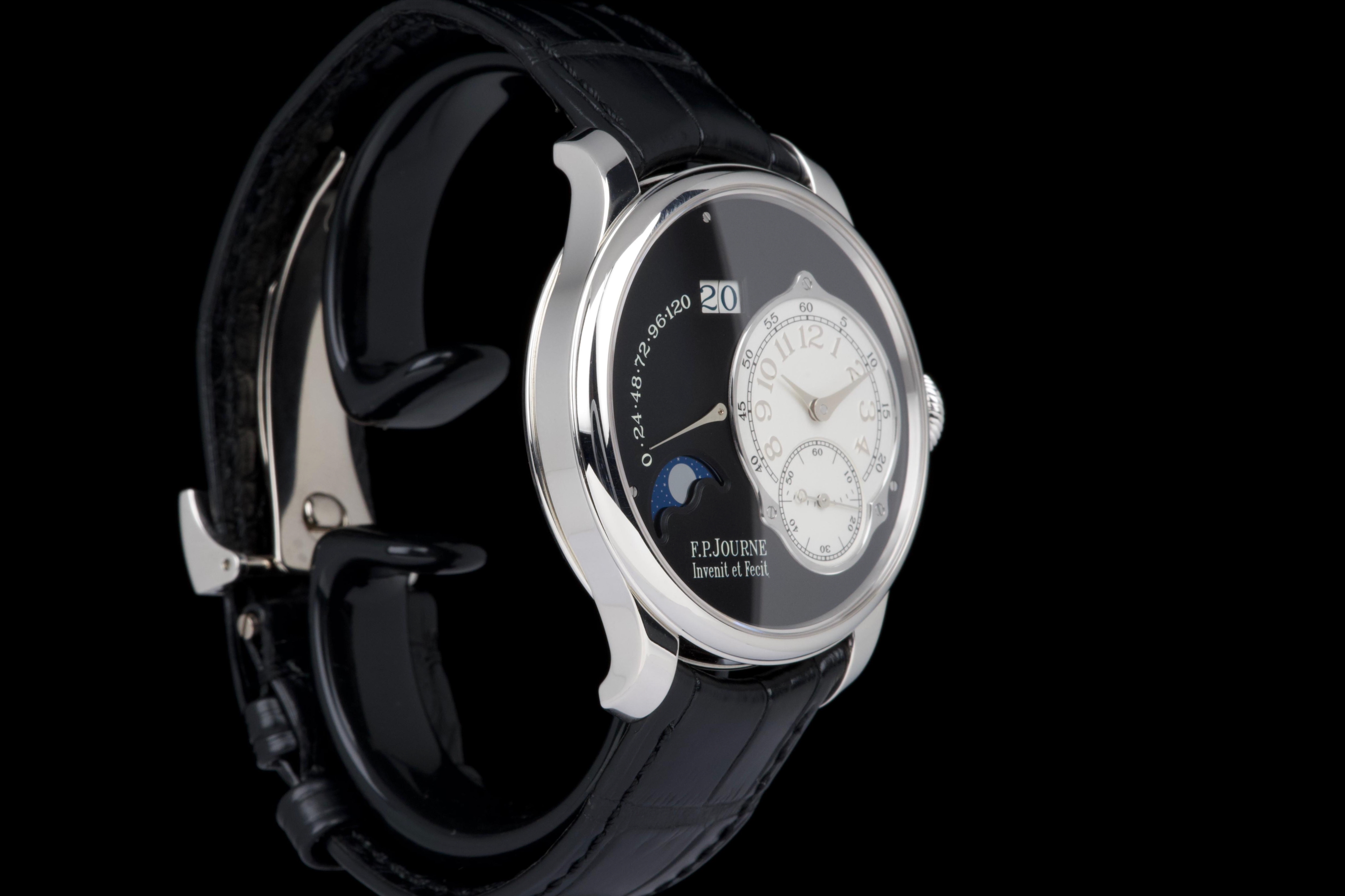 A superb example of the highly exclusive F.P. Journe Octa Lune Black Label, crafted in platinum and available only to existing F.P. Journe owners. The watch remains unpolished and shows very light wear from careful use. The deep black lacquer dialcontrasts beautifully with the white gold hands and applied numerals, while the moonphase and power reserve displays preserve perfect legibility and balance. Powered by the automatic F.P. Journe caliber 1300.3 in solid 18K rose gold, visible through the sapphire caseback. Complete with its original box, warranty card, and accessories. A rare opportunity to acquire one of the most coveted variants of the Octa Lune — elegant, exclusive, and beautifully preserved.