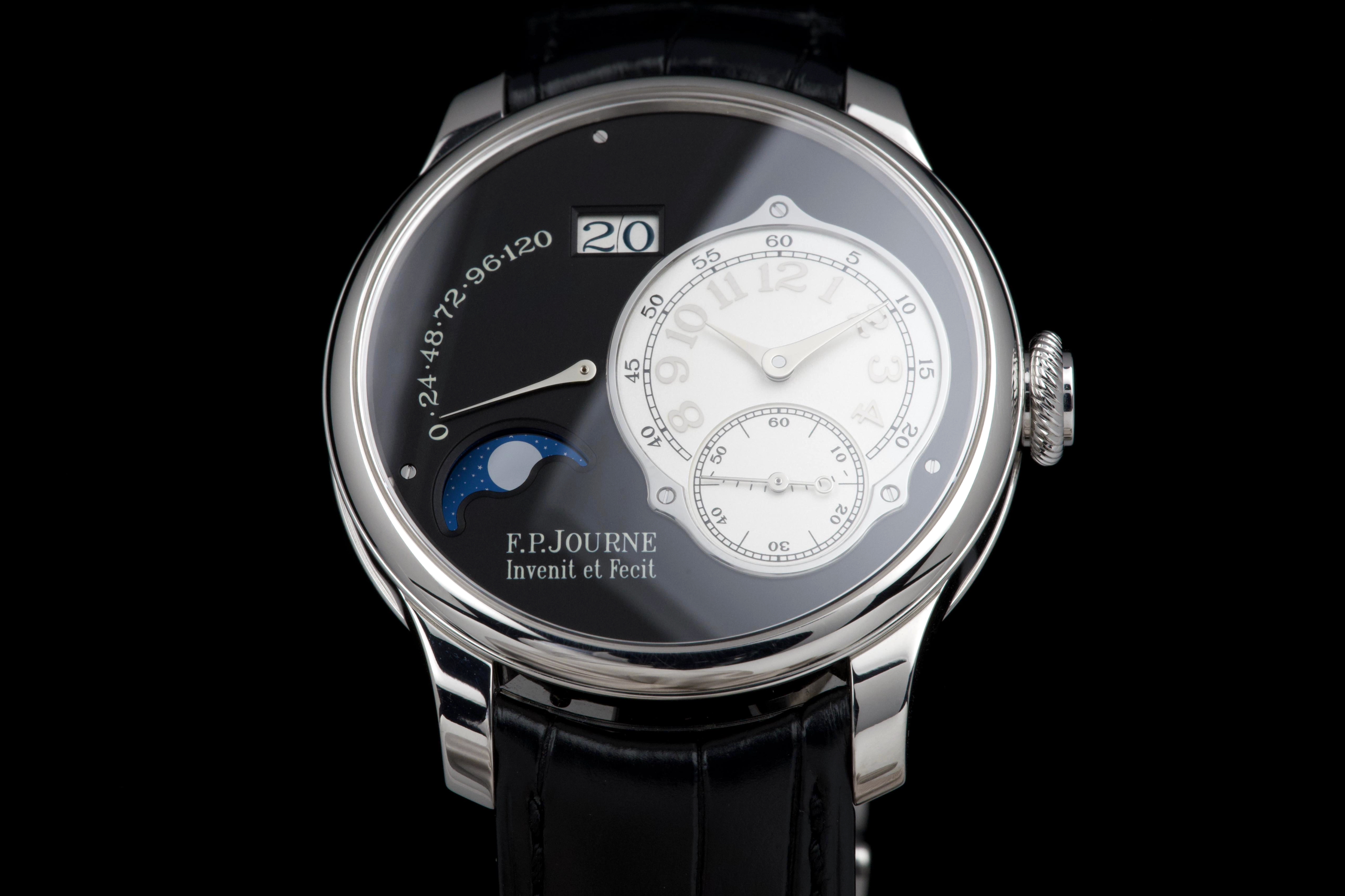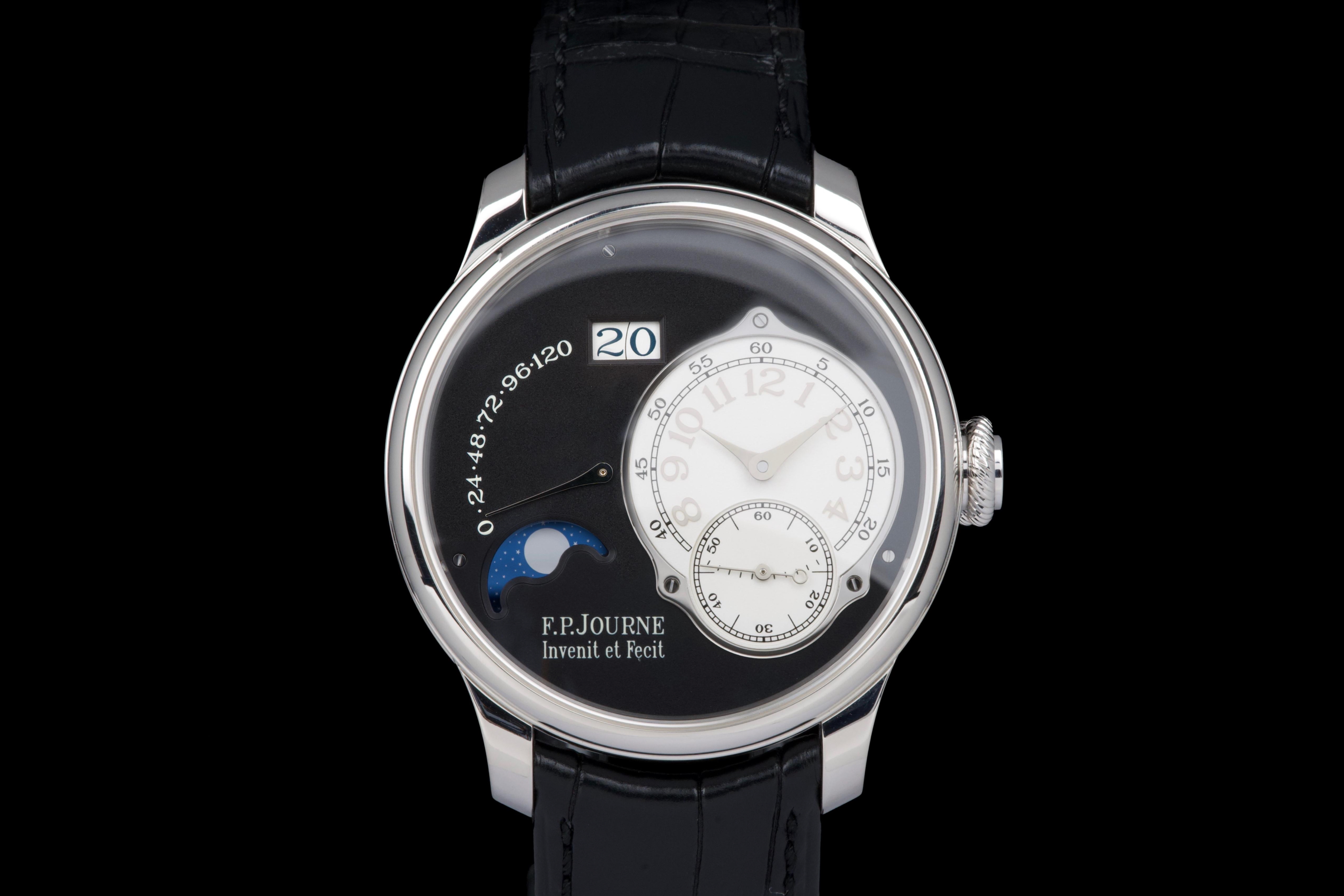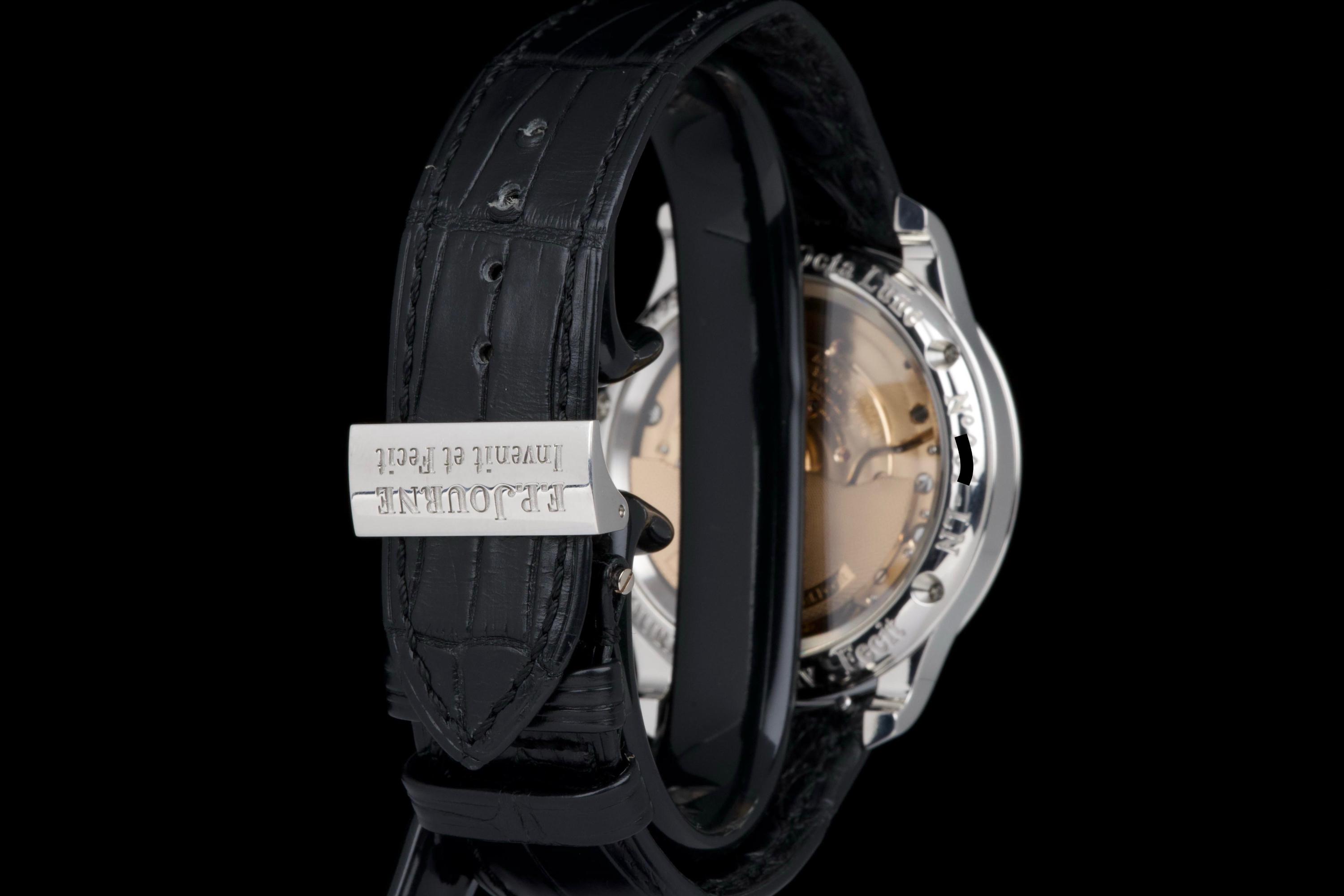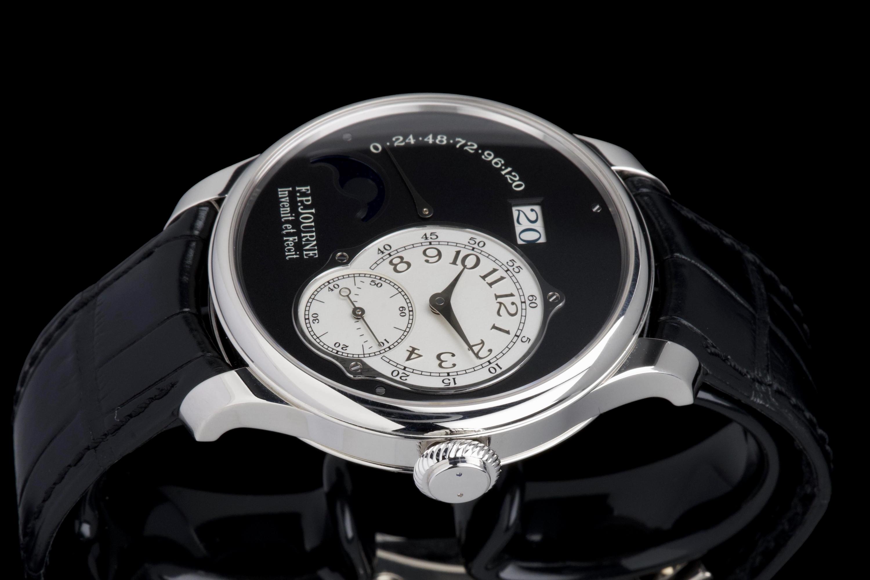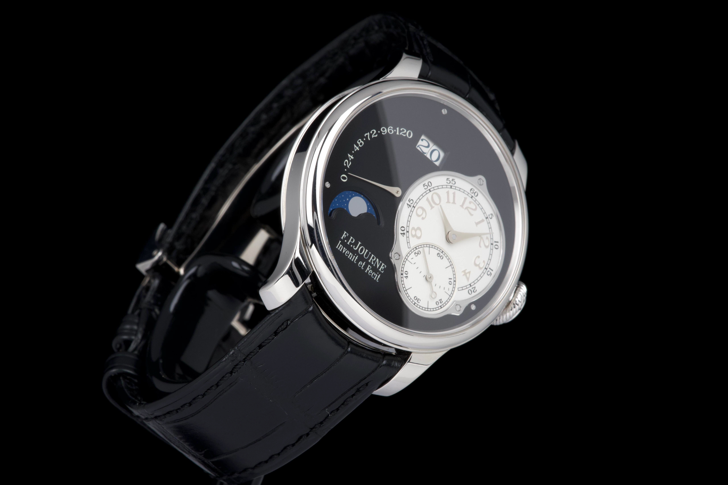 A superb example of the highly exclusive F.P. Journe Octa Lune Black Label, crafted in platinum and available only to existing F.P. Journe owners. The watch remains unpolished and shows very light wear from careful use. The deep black lacquer dialcontrasts beautifully with the white gold hands and applied numerals, while the moonphase and power reserve displays preserve perfect legibility and balance. Powered by the automatic F.P. Journe caliber 1300.3 in solid 18K rose gold, visible through the sapphire caseback. Complete with its original box, warranty card, and accessories. A rare opportunity to acquire one of the most coveted variants of the Octa Lune — elegant, exclusive, and beautifully preserved.