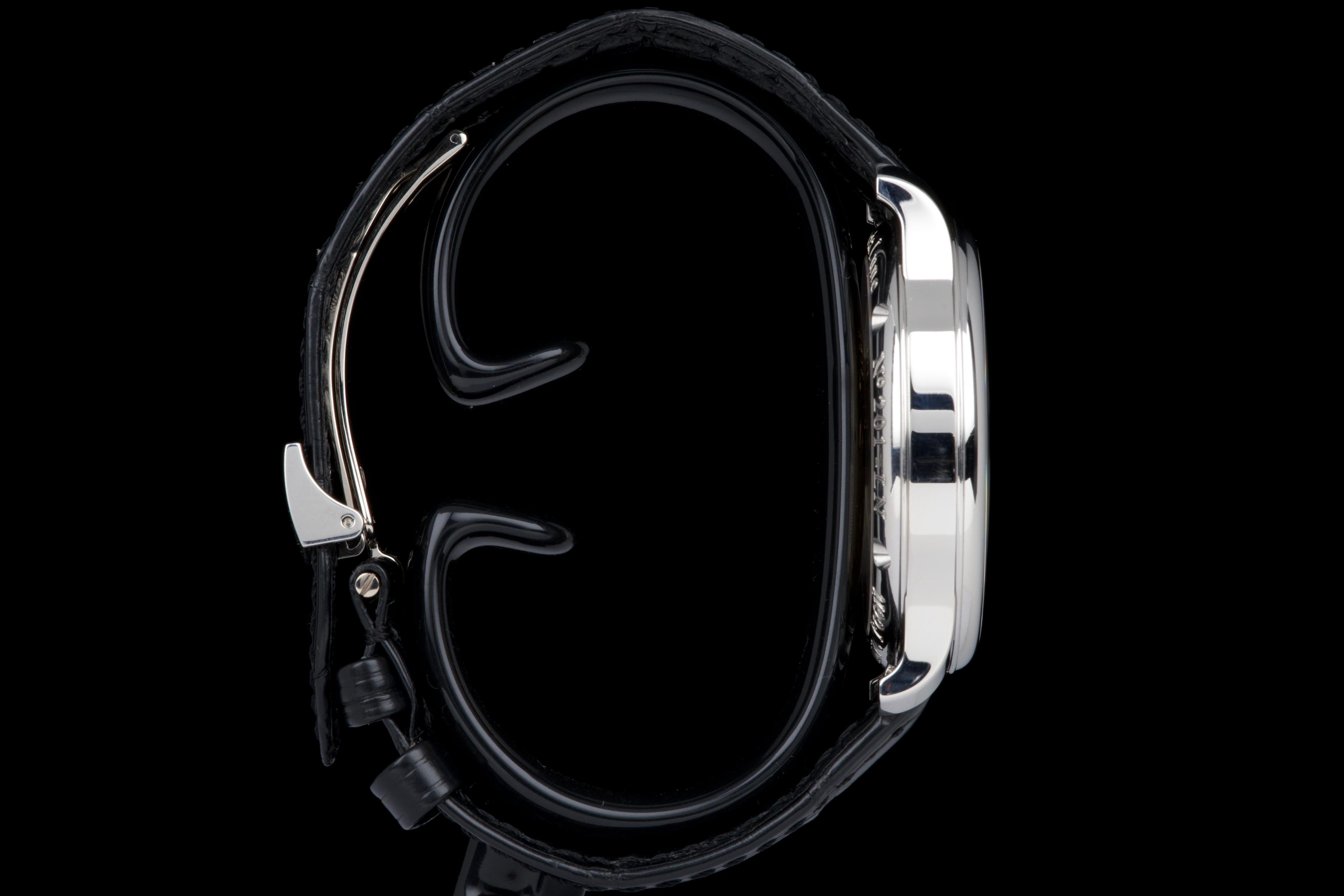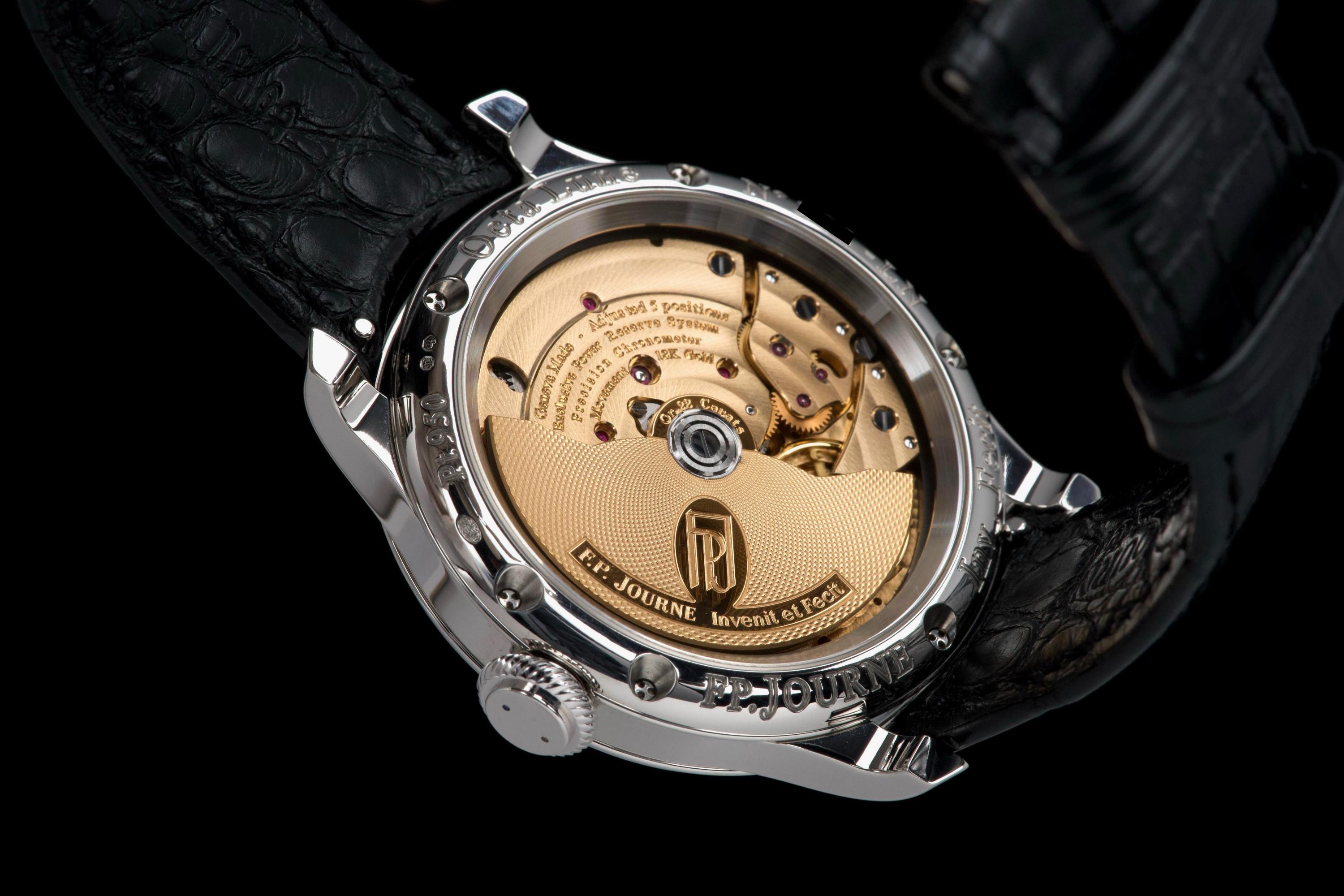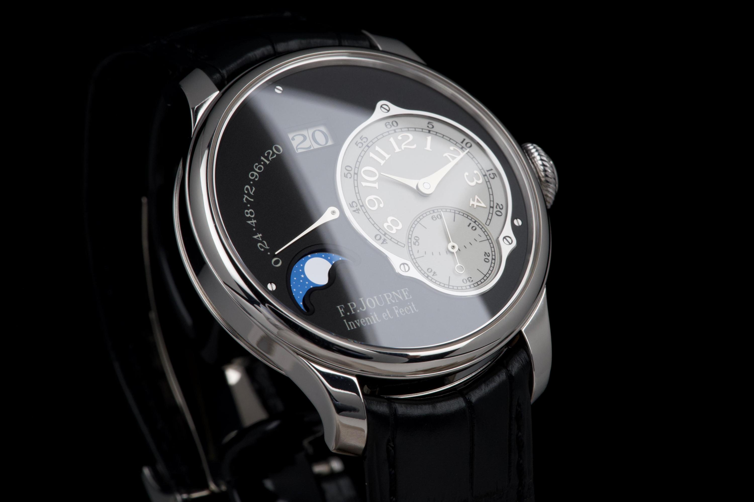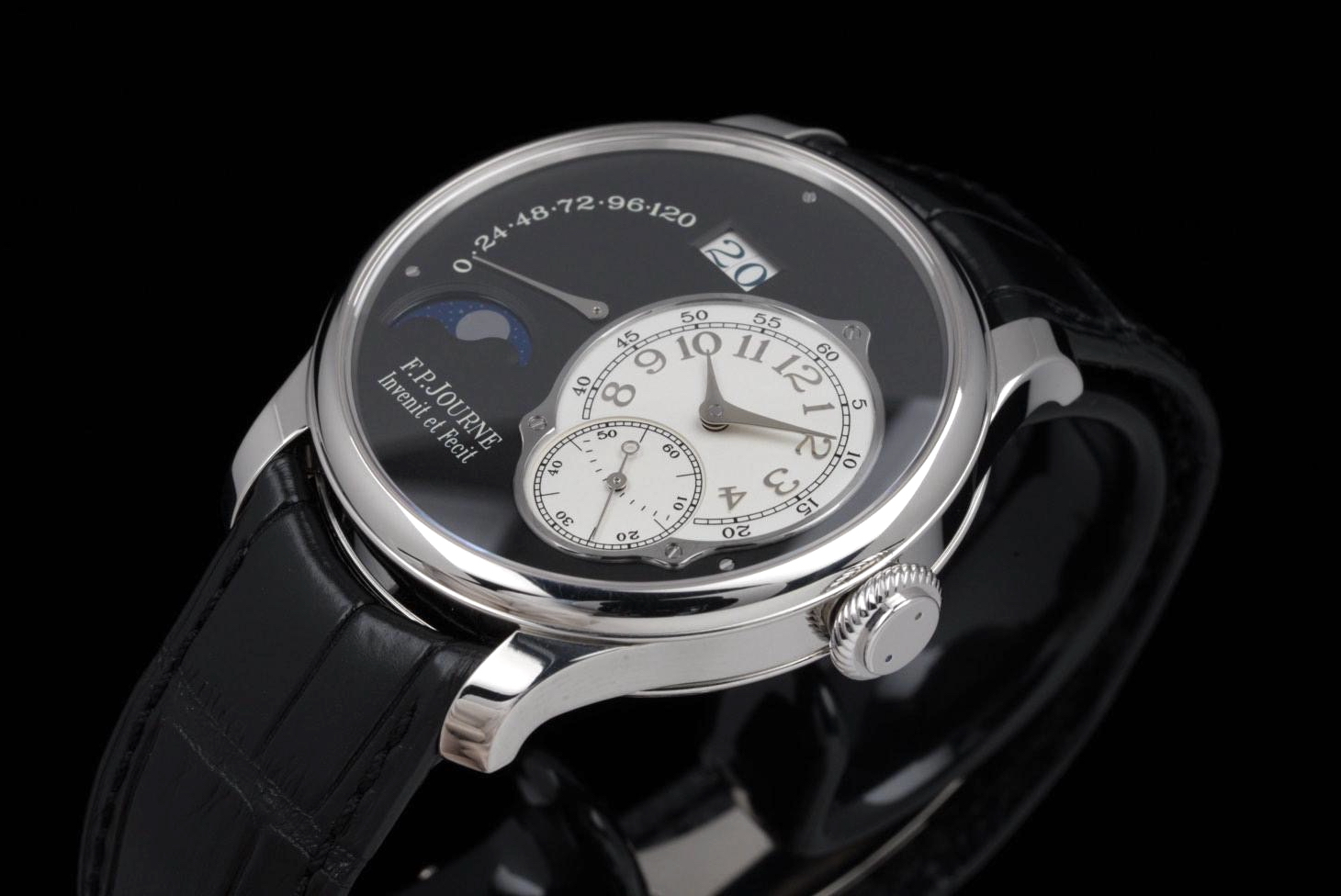 A superb example of the highly exclusive F.P. Journe Octa Lune Black Label, crafted in platinum and available only to existing F.P. Journe owners. The watch remains unpolished and shows very light wear from careful use. The deep black lacquer dialcontrasts beautifully with the white gold hands and applied numerals, while the moonphase and power reserve displays preserve perfect legibility and balance. Powered by the automatic F.P. Journe caliber 1300.3 in solid 18K rose gold, visible through the sapphire caseback. Complete with its original box, warranty card, and accessories. A rare opportunity to acquire one of the most coveted variants of the Octa Lune — elegant, exclusive, and beautifully preserved.
