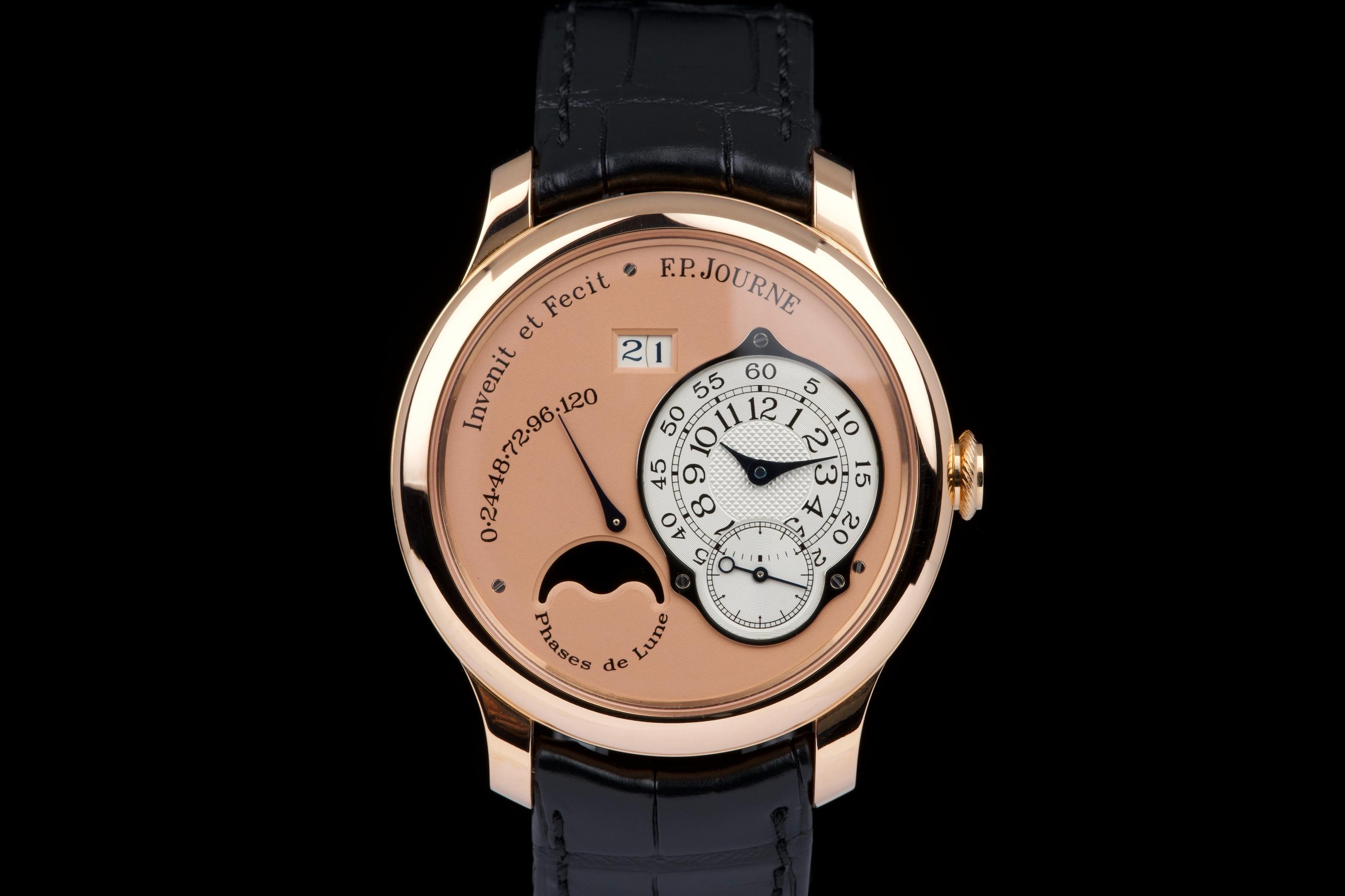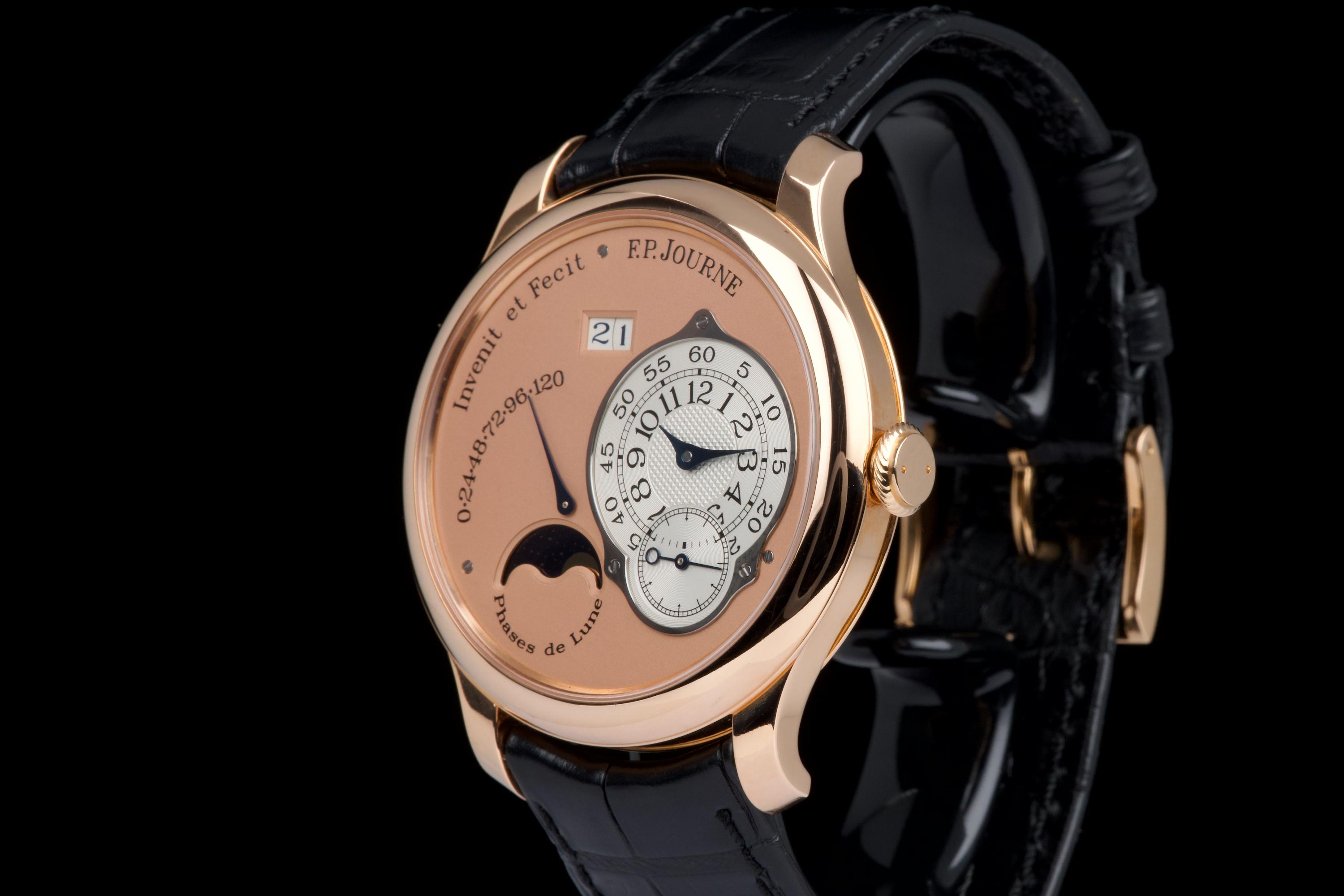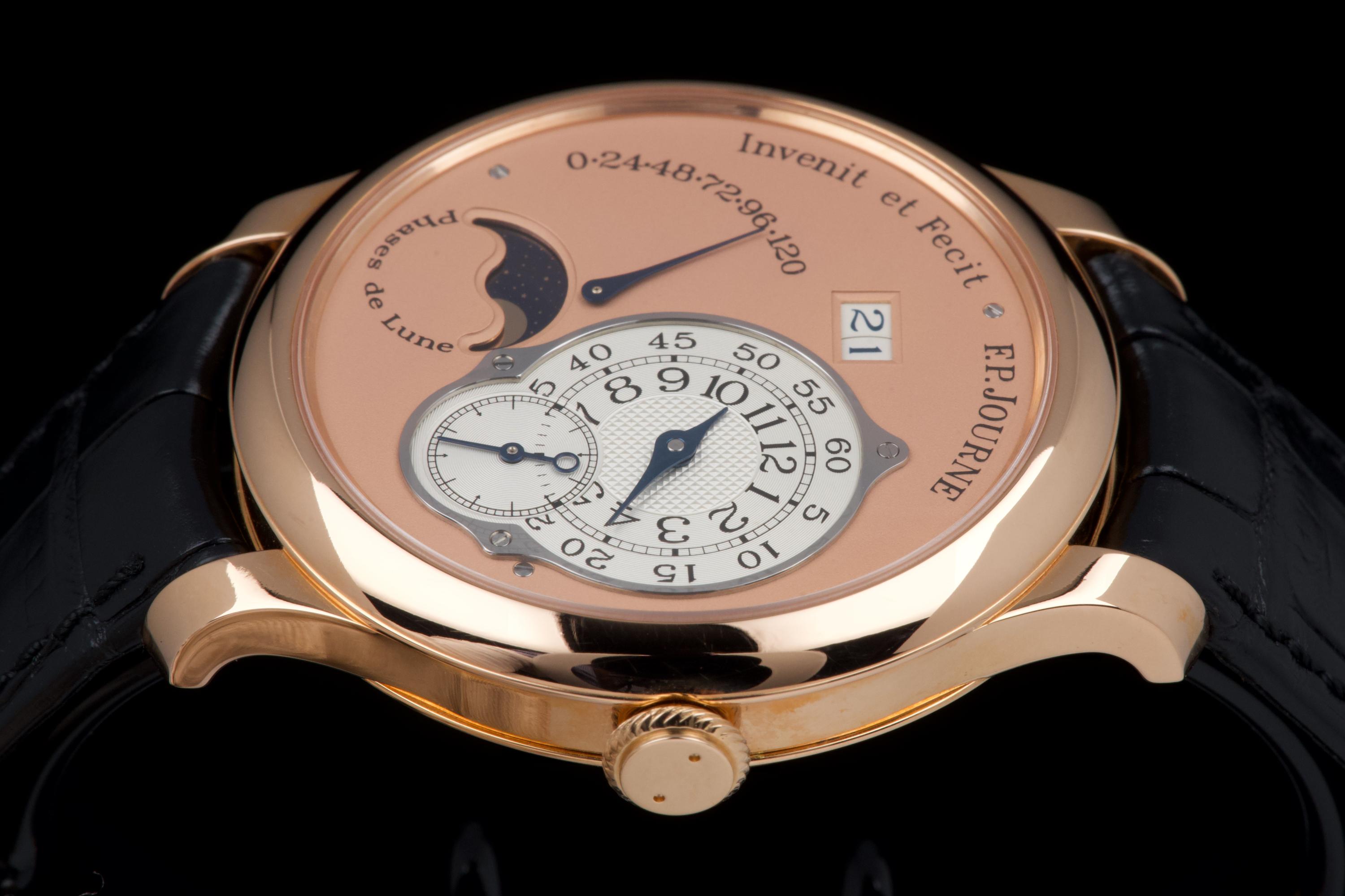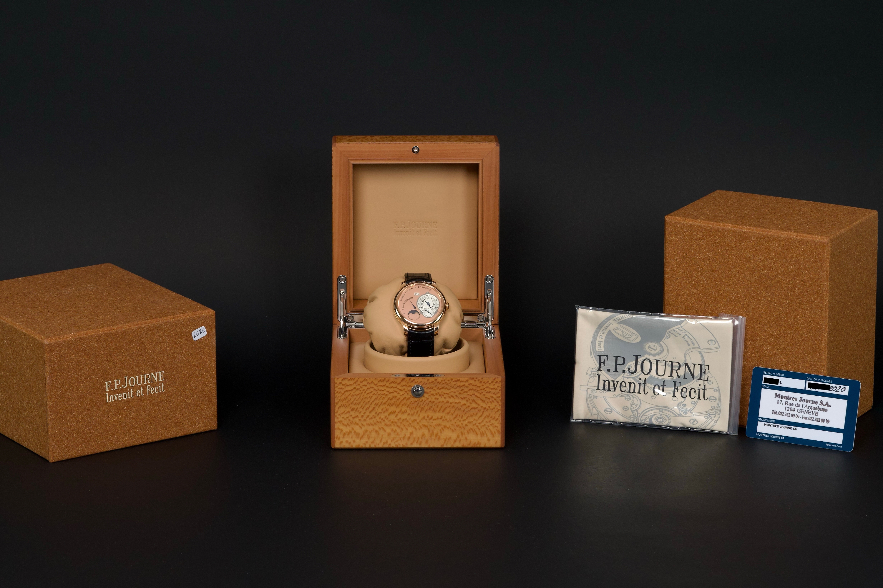 A rare and beautifully preserved example of the F.P. Journe Octa Lune in 18K pink gold, featuring the highly sought-after rose dial. Originally sold in 2011, this watch was later acquired and resold by F.P. Journe’s Patrimoine Department in 2020, accompanied by its Patrimoine box and warranty certificate (the original 2011 guarantee card is not included). The watch was fully serviced and refinished by F.P. Journe at that time and appears to have been hardly, if ever, worn since. It remains in superb overall condition, with crisp hallmarks and a pristine dial. Fitted with a black crocodile strap and pink gold tang buckle, this 40 mm Octa Lune houses F.P. Journe’s automatic movement in solid 18K rose gold, visible through the sapphire display back. A rare and elegant piece — combining technical excellence, aesthetic harmony, and the exclusivity of the F.P. Journe Patrimoine collection.