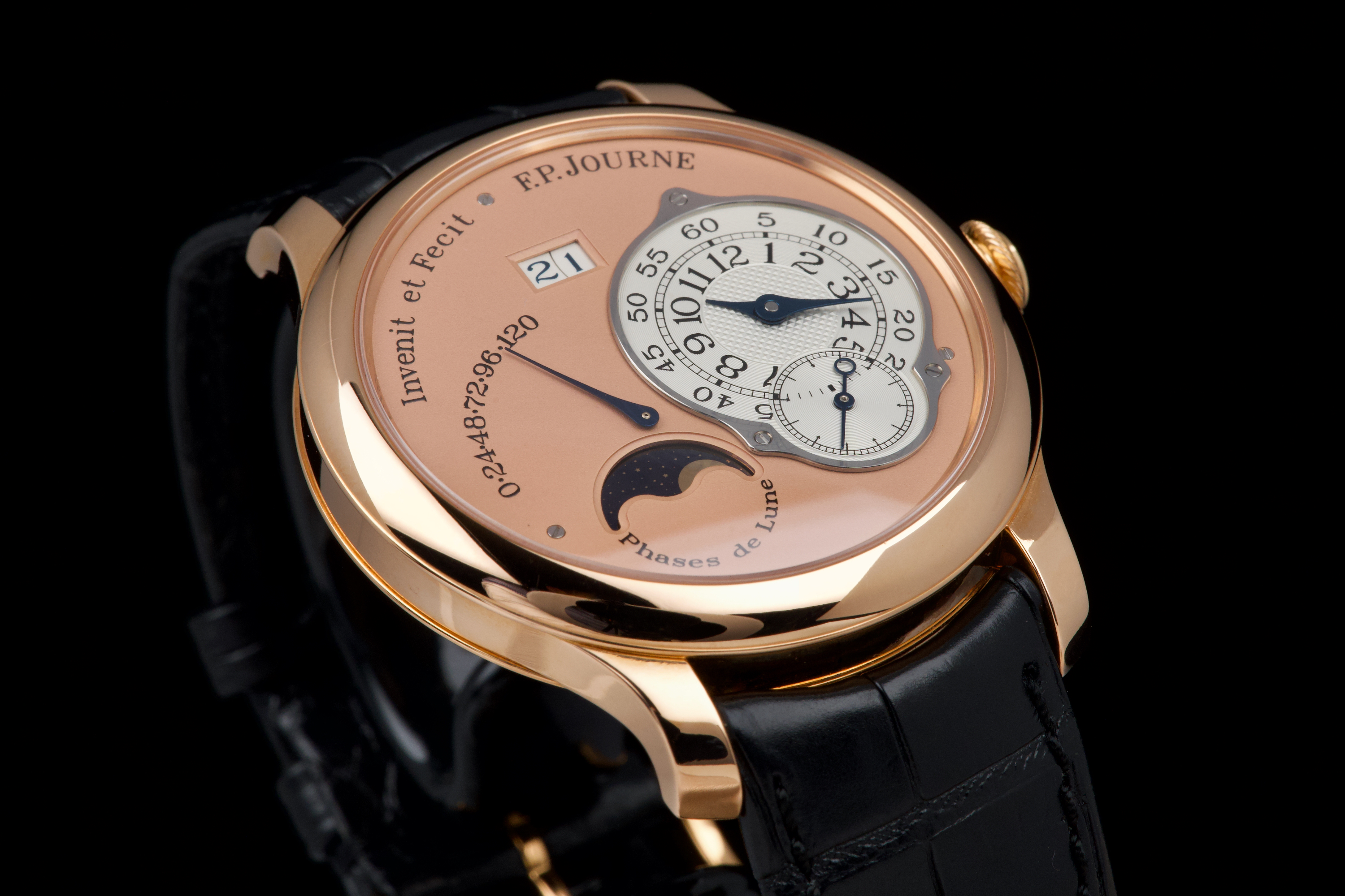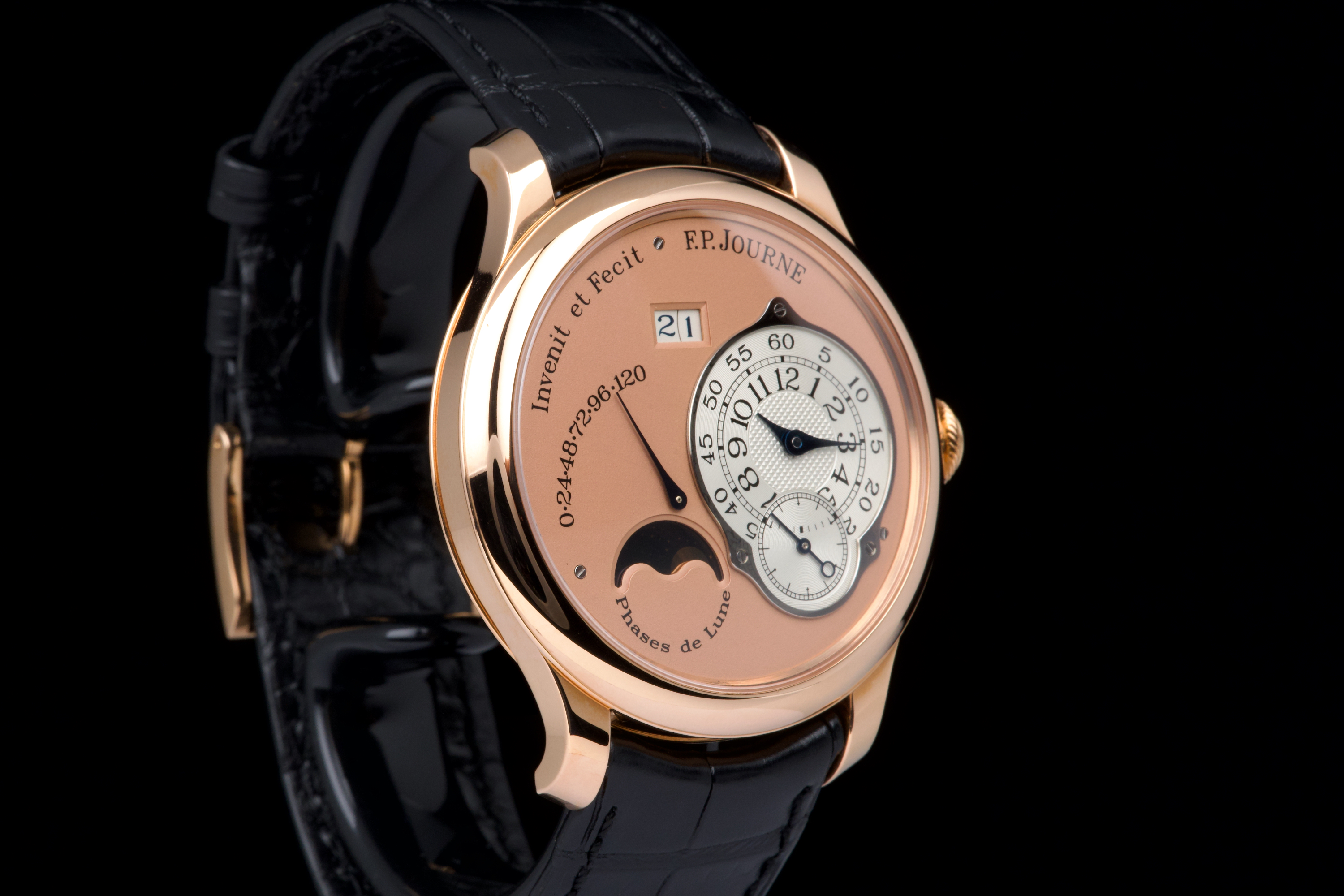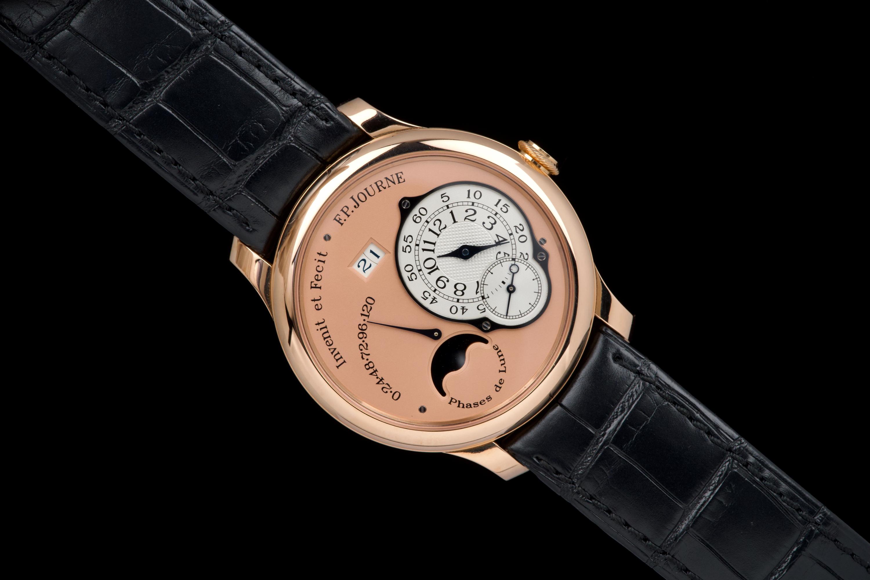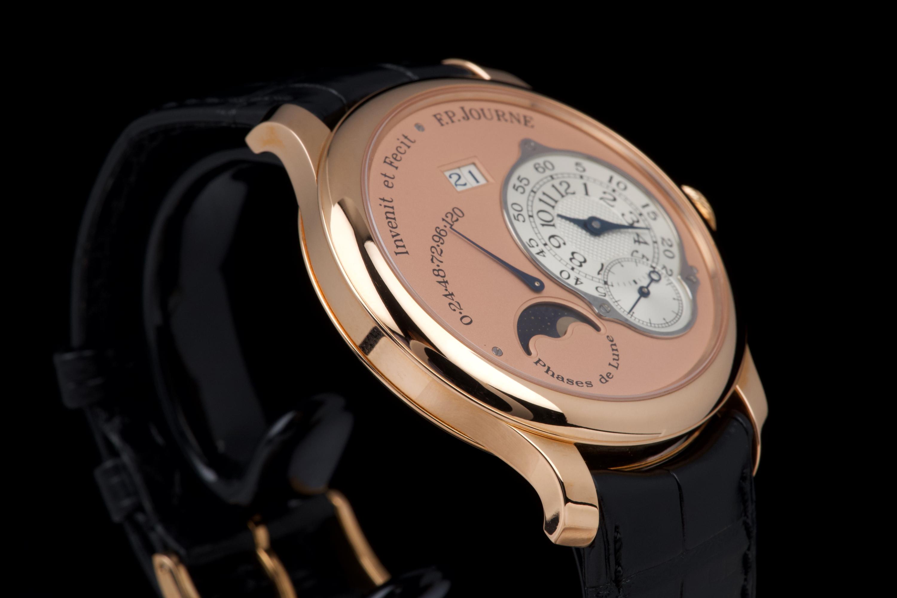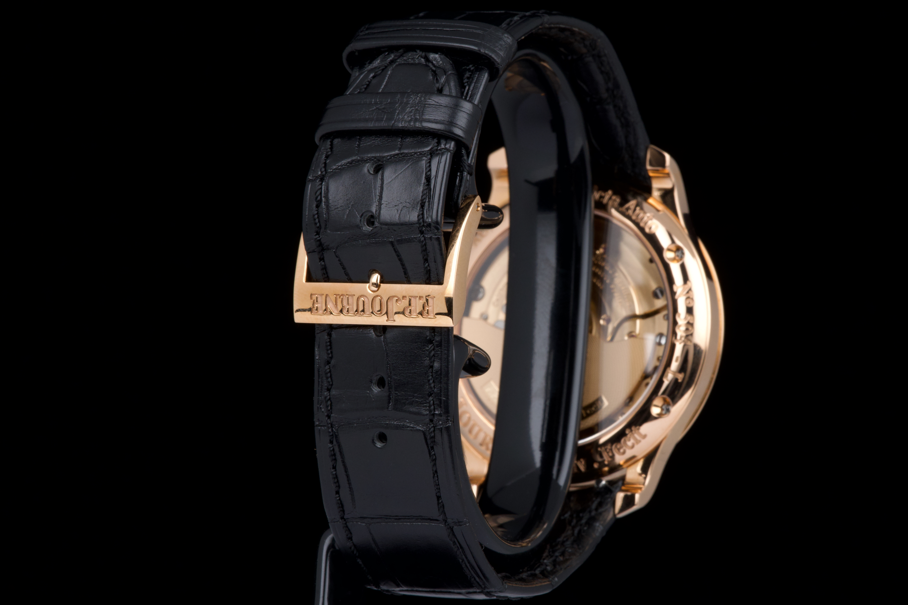 A rare and beautifully preserved example of the F.P. Journe Octa Lune in 18K pink gold, featuring the highly sought-after rose dial. Originally sold in 2011, this watch was later acquired and resold by F.P. Journe’s Patrimoine Department in 2020, accompanied by its Patrimoine box and warranty certificate (the original 2011 guarantee card is not included). The watch was fully serviced and refinished by F.P. Journe at that time and appears to have been hardly, if ever, worn since. It remains in superb overall condition, with crisp hallmarks and a pristine dial. Fitted with a black crocodile strap and pink gold tang buckle, this 40 mm Octa Lune houses F.P. Journe’s automatic movement in solid 18K rose gold, visible through the sapphire display back. A rare and elegant piece — combining technical excellence, aesthetic harmony, and the exclusivity of the F.P. Journe Patrimoine collection.
