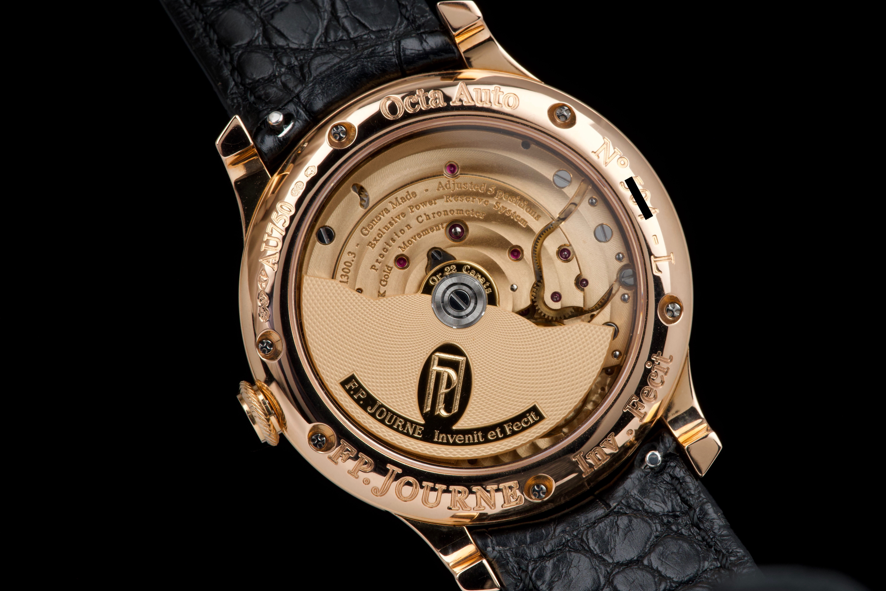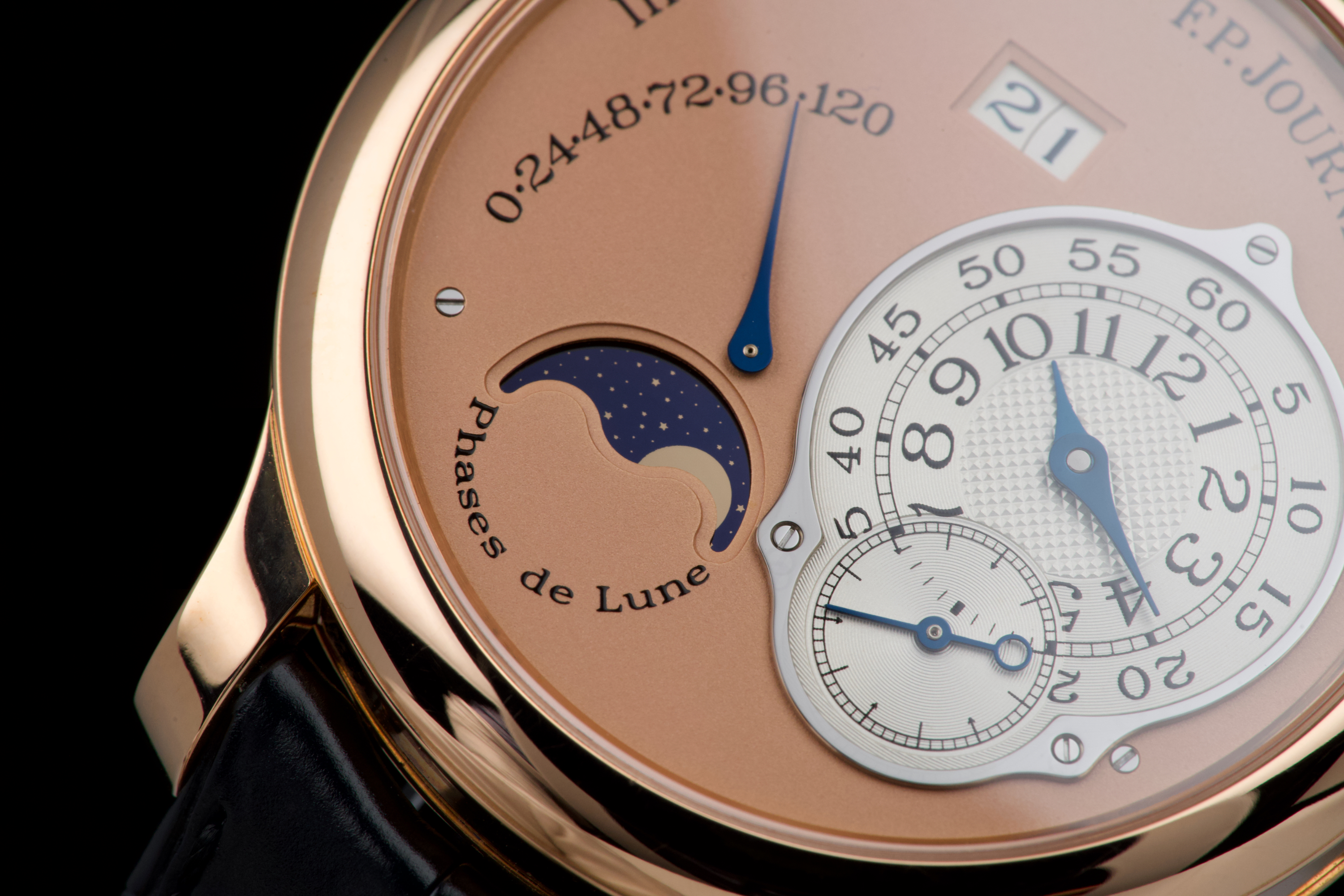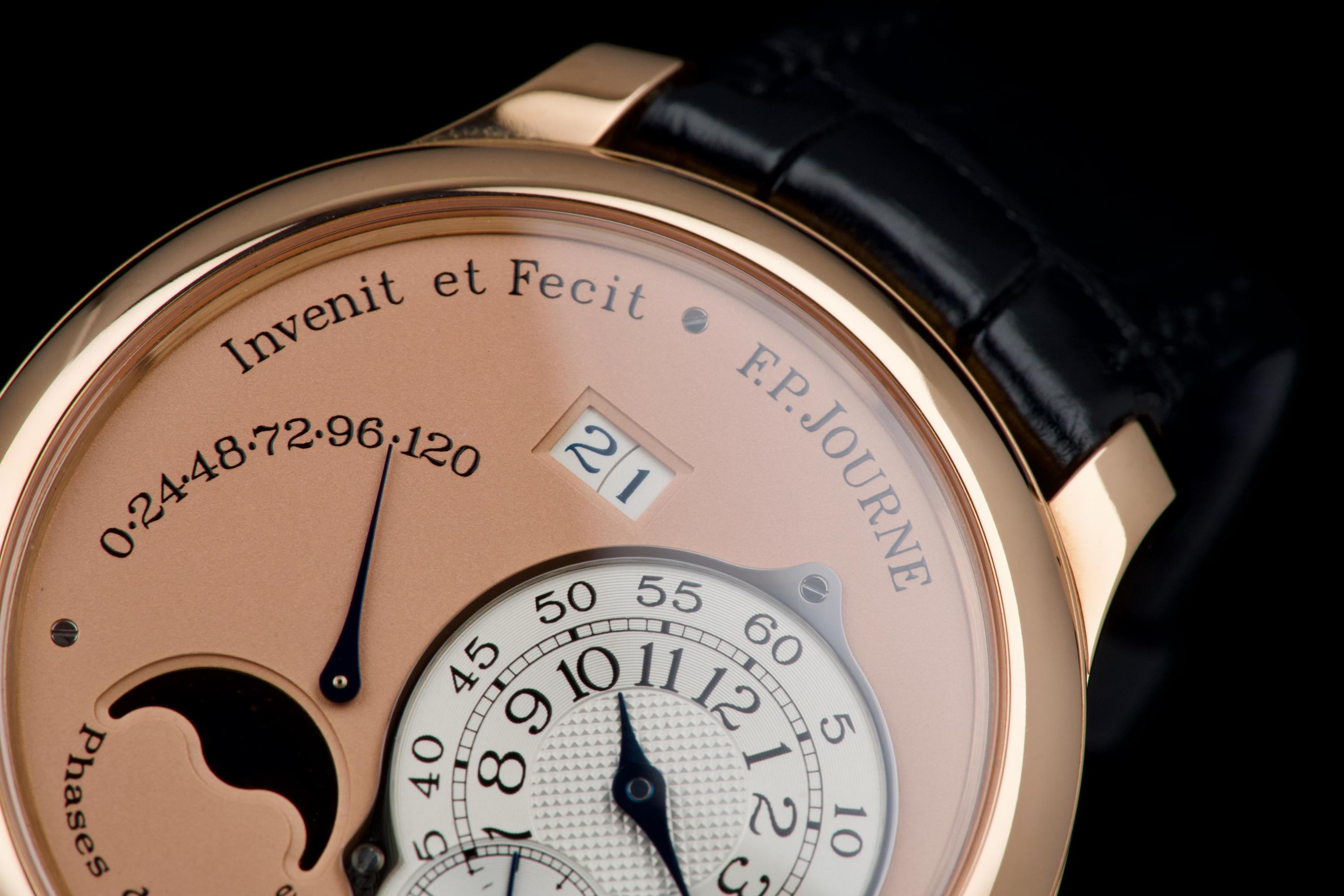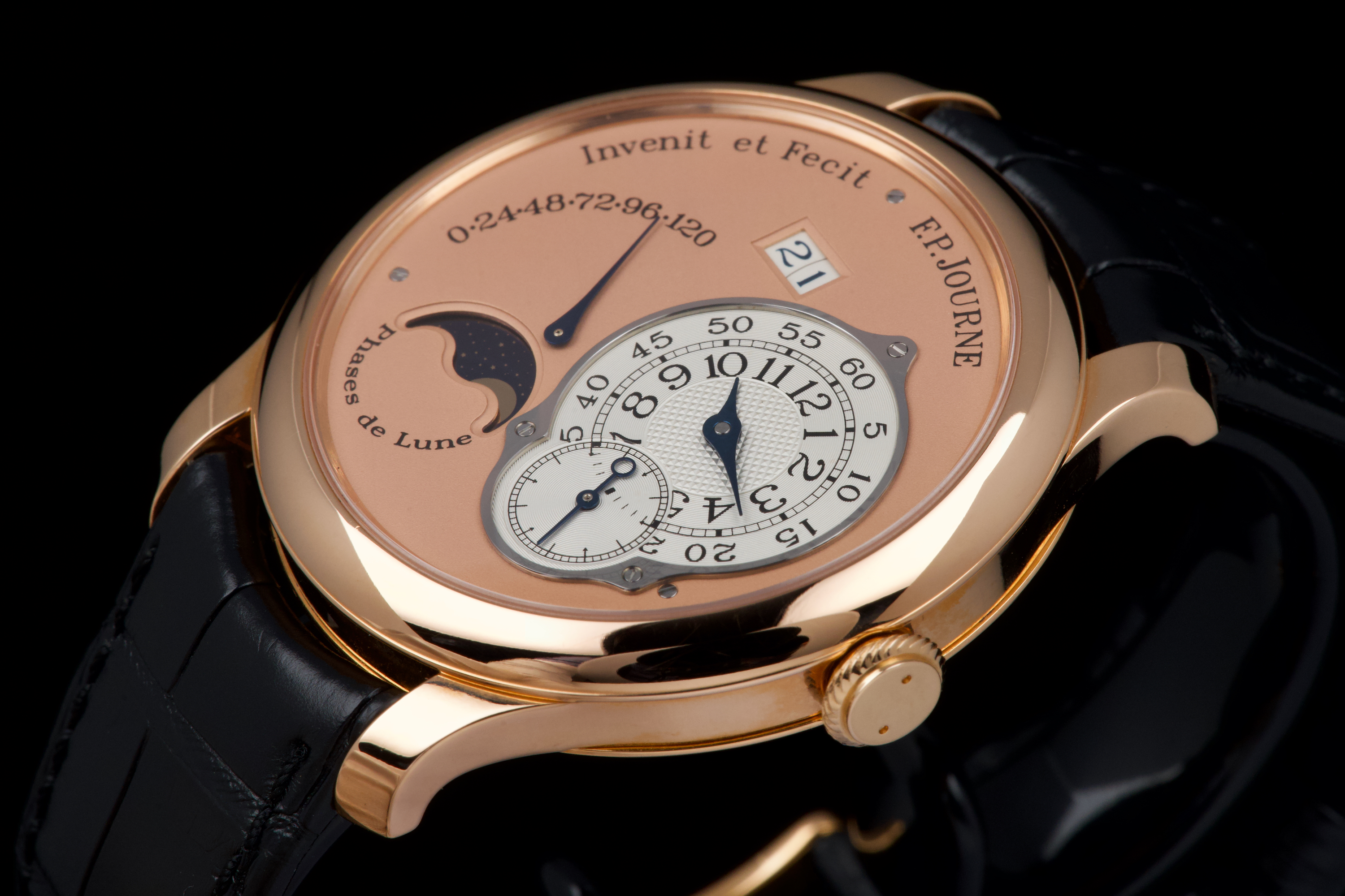 A rare and beautifully preserved example of the F.P. Journe Octa Lune in 18K pink gold, featuring the highly sought-after rose dial. Originally sold in 2011, this watch was later acquired and resold by F.P. Journe’s Patrimoine Department in 2020, accompanied by its Patrimoine box and warranty certificate (the original 2011 guarantee card is not included). The watch was fully serviced and refinished by F.P. Journe at that time and appears to have been hardly, if ever, worn since. It remains in superb overall condition, with crisp hallmarks and a pristine dial. Fitted with a black crocodile strap and pink gold tang buckle, this 40 mm Octa Lune houses F.P. Journe’s automatic movement in solid 18K rose gold, visible through the sapphire display back. A rare and elegant piece — combining technical excellence, aesthetic harmony, and the exclusivity of the F.P. Journe Patrimoine collection.