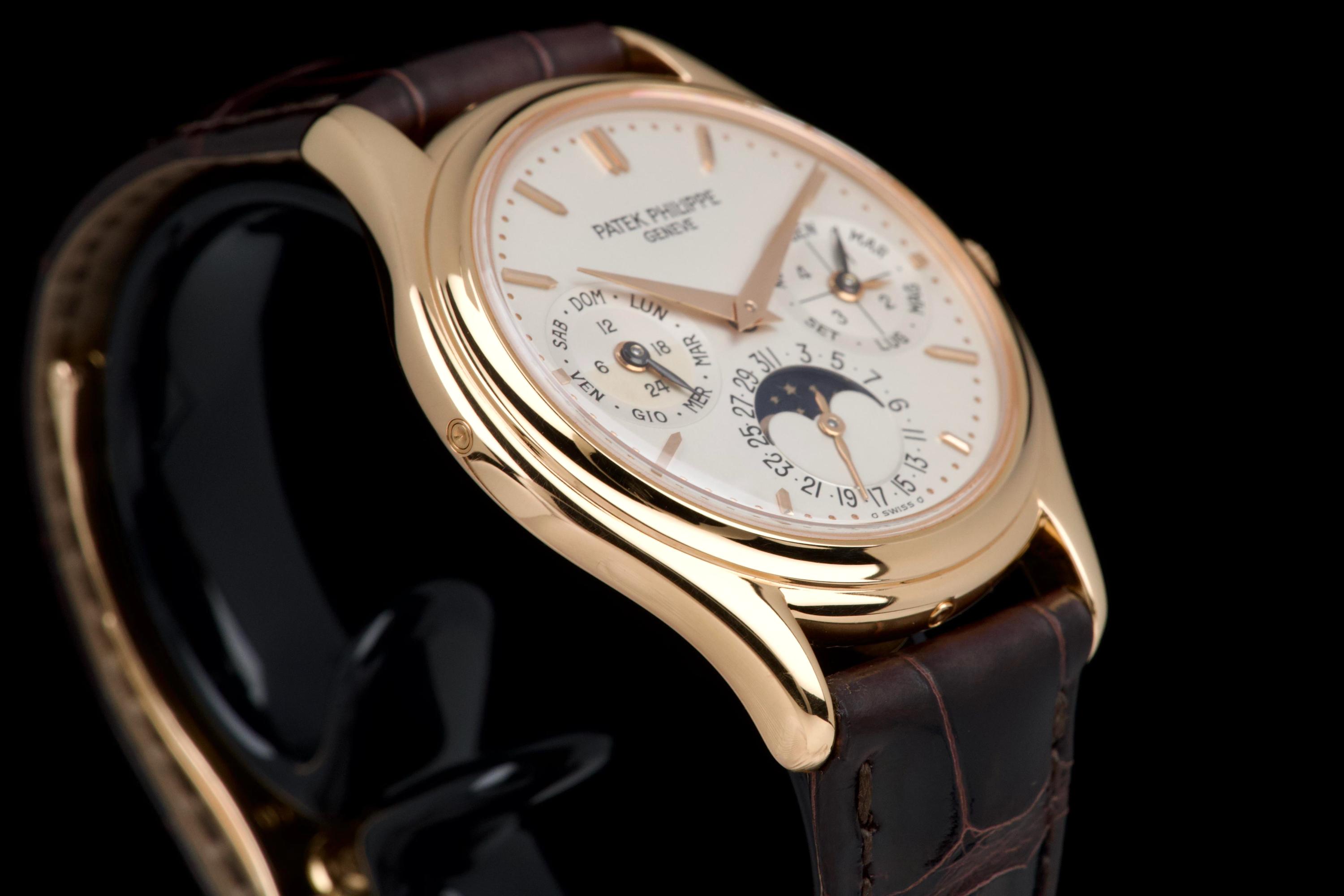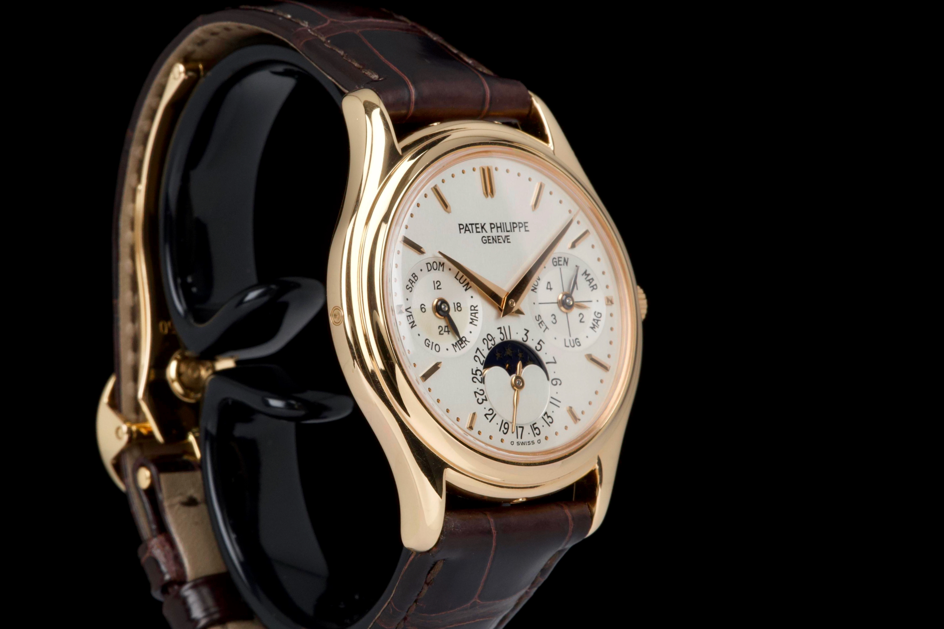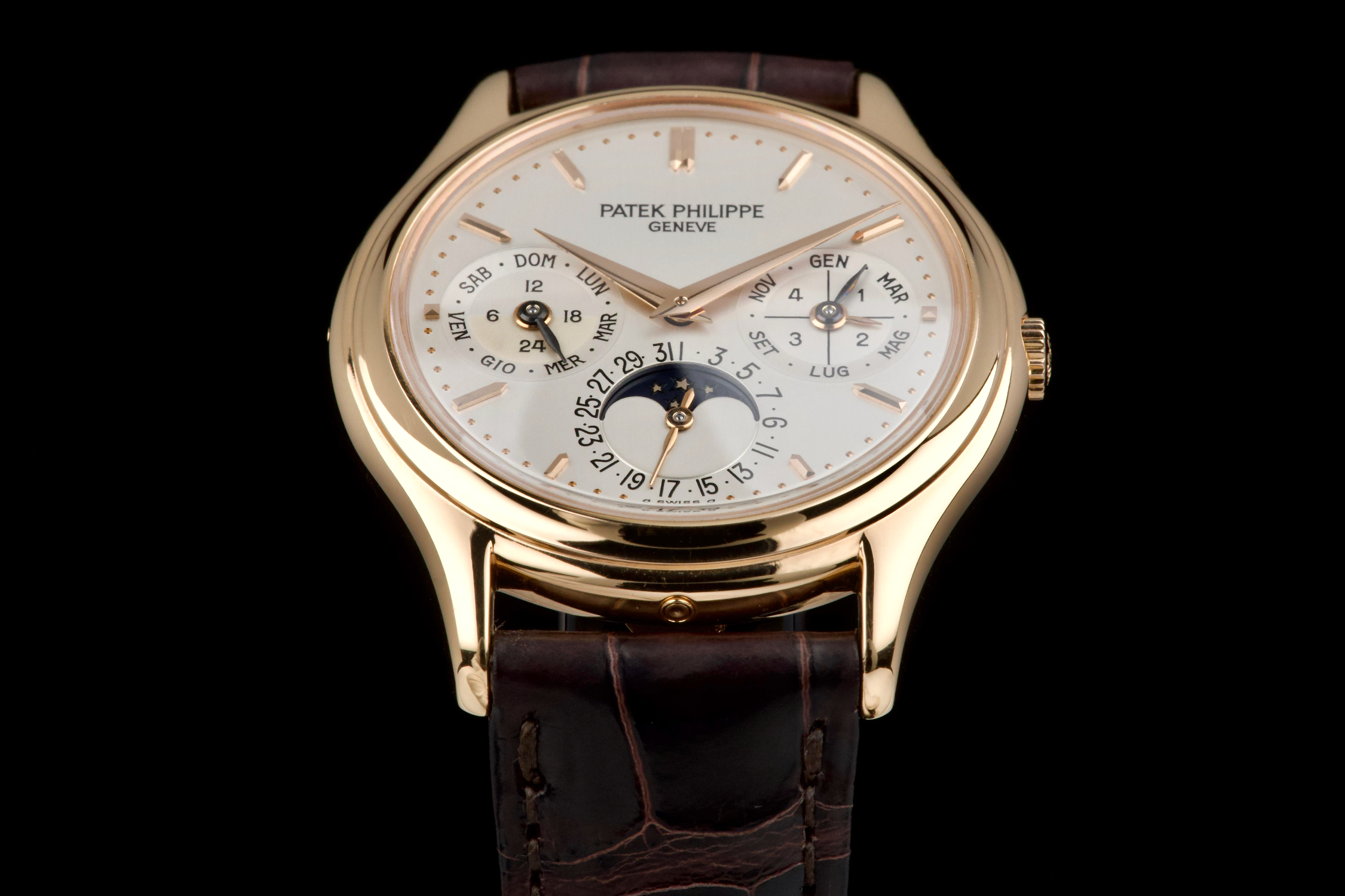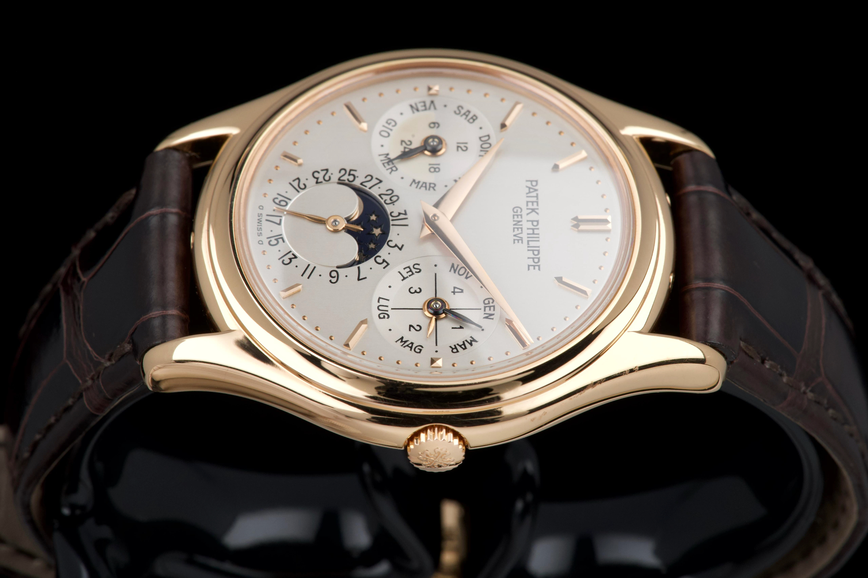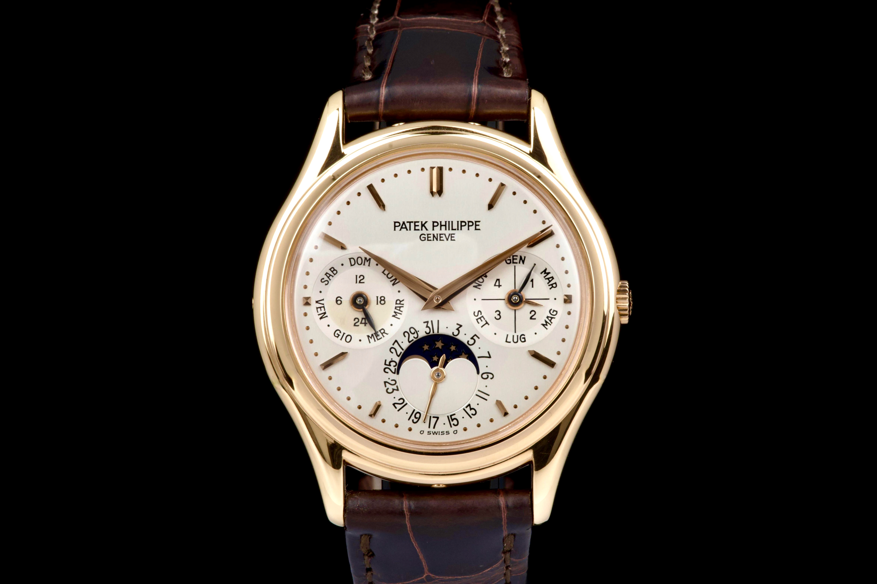 The present Patek Philippe Perpetual Calendar reference 3940R, dating to 2007, is a refined and highly desirable example of one of the most iconic perpetual calendar wristwatches of the modern era. Offered with its original papers and accessories, this watch represents a third-series production of the reference, combining classical aesthetics with the most evolved execution of the model. The rose-gold case has been lightly polished in the past and is preserved in excellent overall condition, showing only minor wear and superficial marks consistent with careful use. The proportions remain elegant and well balanced, and importantly, the hallmarks are present beneath the case, confirming the integrity and authenticity of the precious-metal construction. The dial is in perfect condition and features calendar indications in Italian, a charming and desirable detail that reflects its original point of sale. The watch was originally delivered by Hausmann in Rome in 2007, adding attractive provenance. The display is harmoniously arranged with day, date, month, leap year, moon phase, and 24-hour indication, exemplifying the refined clarity for which the reference is renowned. The watch is fitted with a brand-new semi-gloss brown crocodile strap, paired with its original rose-gold Patek Philippe deployant clasp, ensuring both comfort and full material coherence. It is accompanied by its original box (without outer box), second solid caseback, corrector stylus, white tag with serial number, original papers, and the original leather document holder. While no service history accompanies the watch, it is running correctly at the time of cataloguing. Elegant, complete, and representing the most mature execution of the reference, this third-series 3940R offers a compelling opportunity to acquire one of Patek Philippe’s most important perpetual calendar wristwatches in an attractive late example with strong provenance and desirable details.