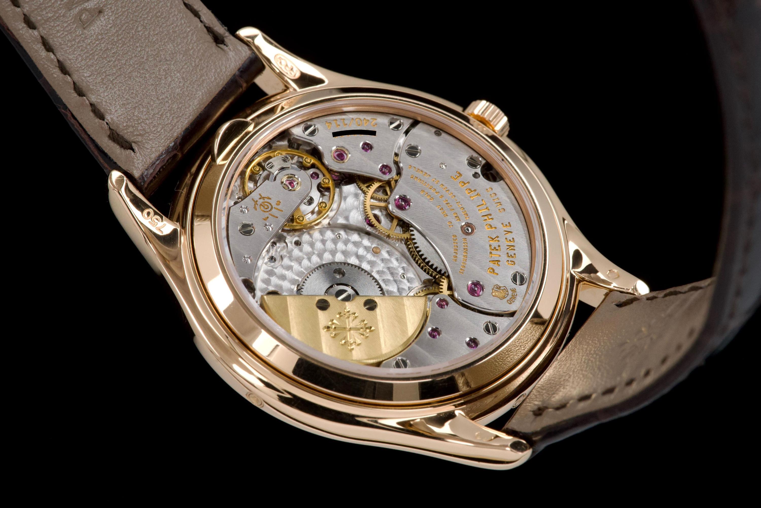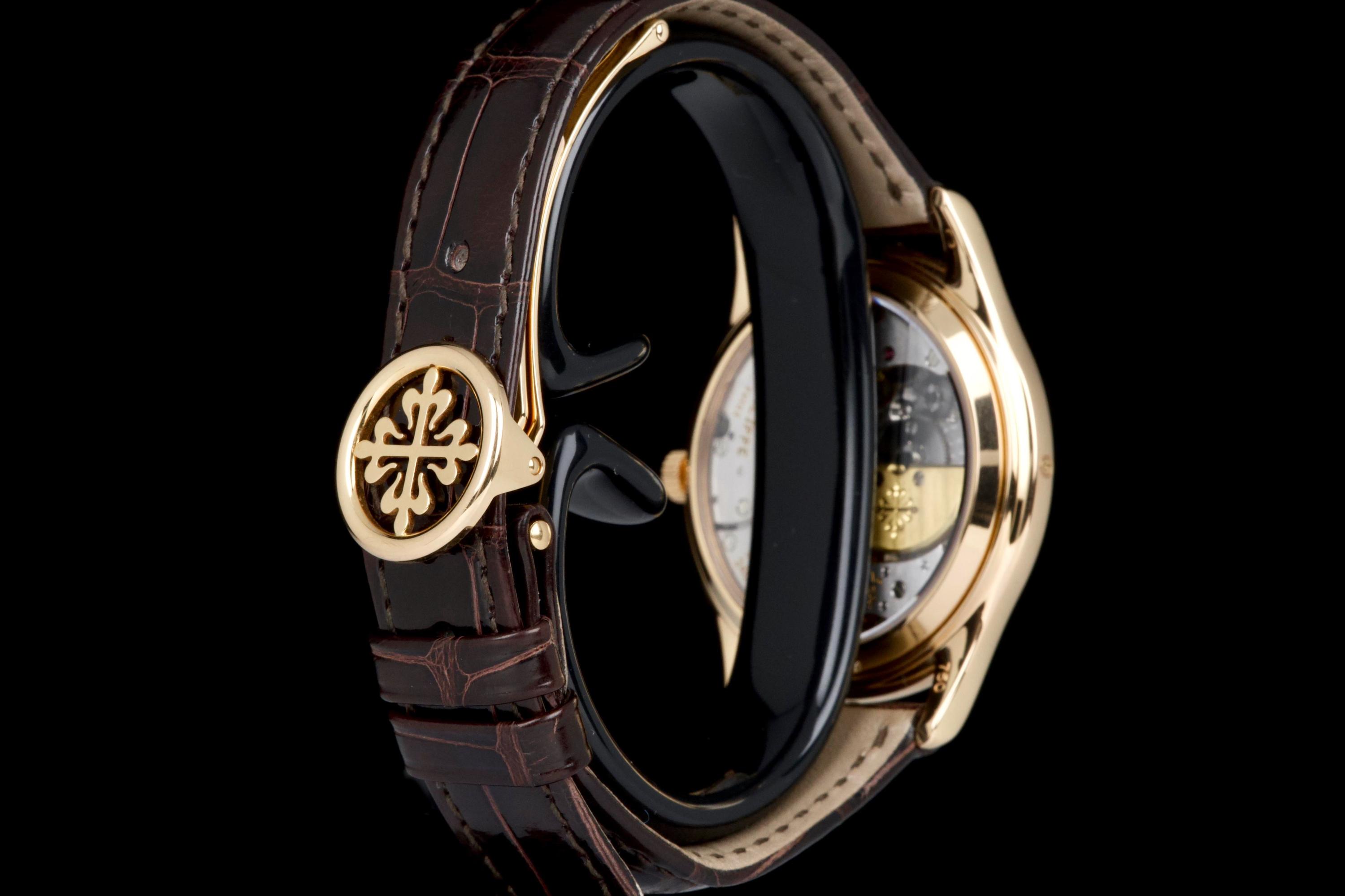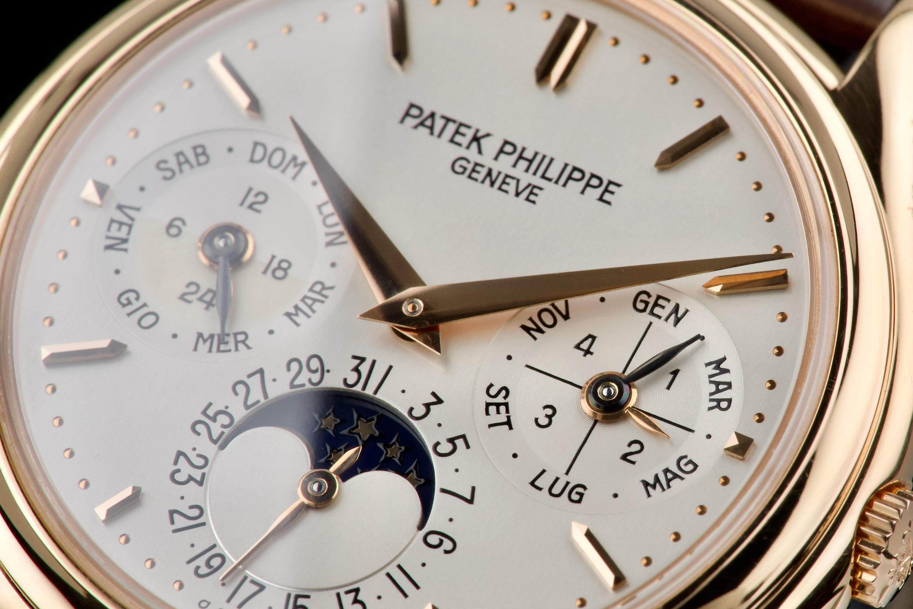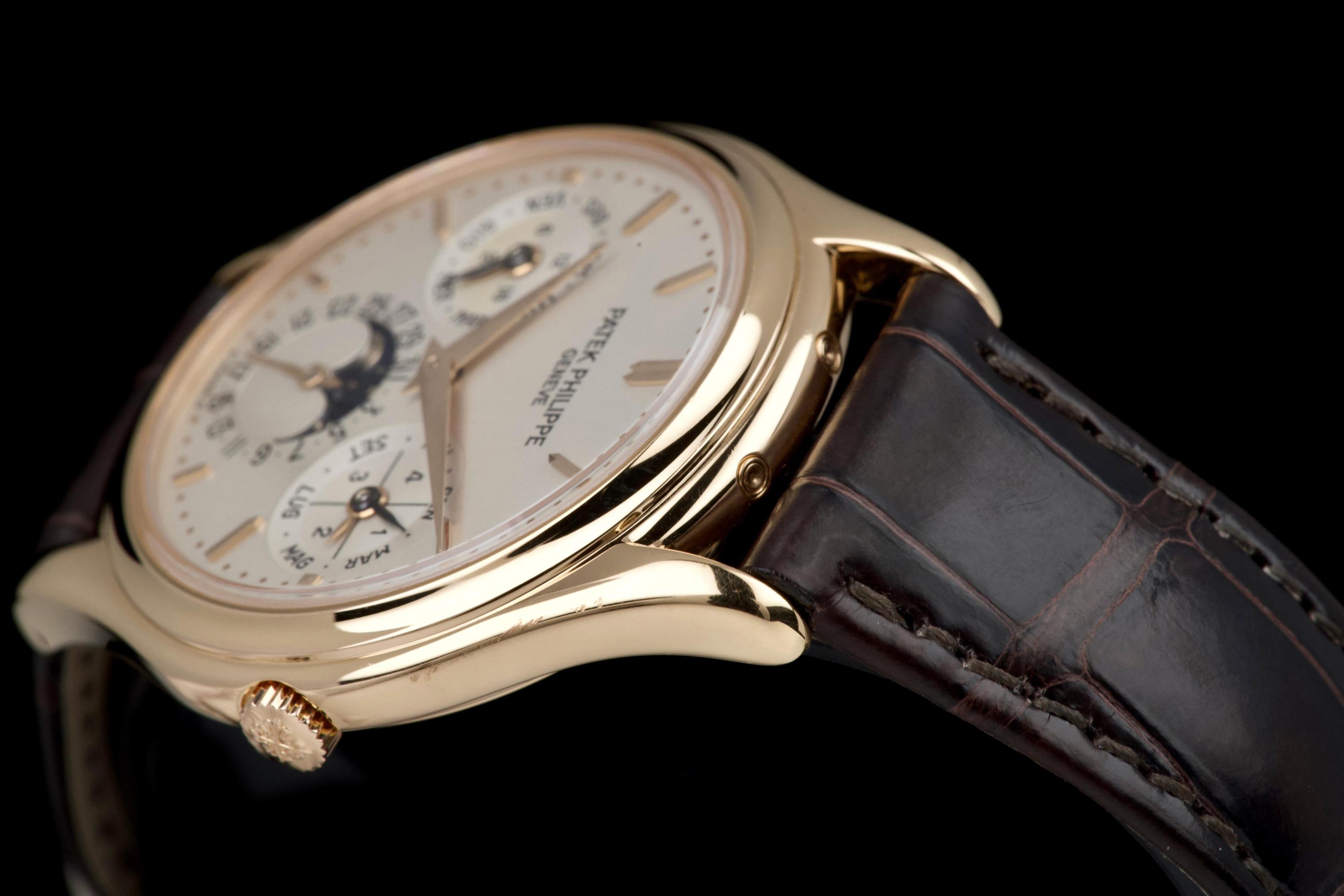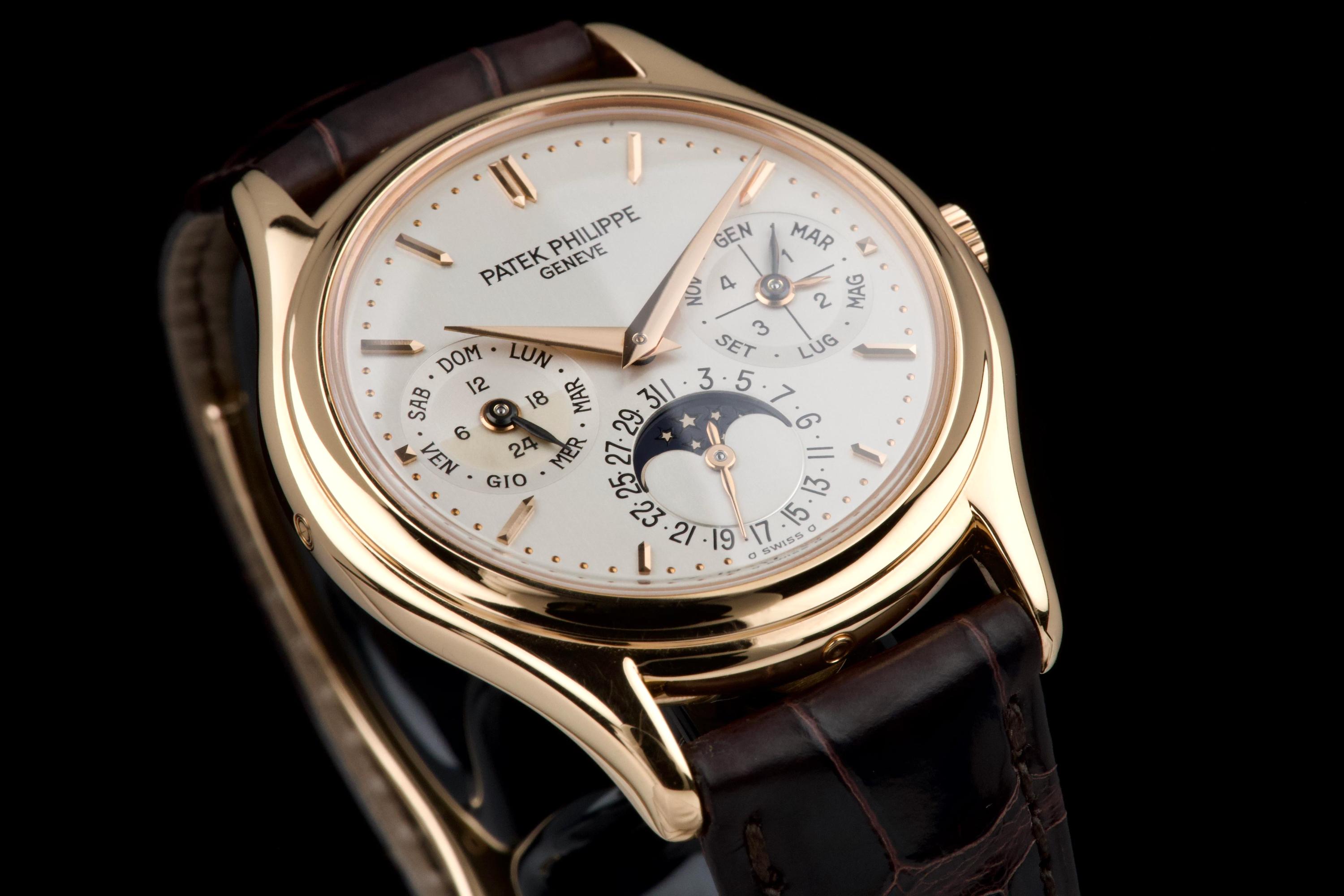 The present Patek Philippe Perpetual Calendar reference 3940R, dating to 2007, is a refined and highly desirable example of one of the most iconic perpetual calendar wristwatches of the modern era. Offered with its original papers and accessories, this watch represents a third-series production of the reference, combining classical aesthetics with the most evolved execution of the model. The rose-gold case has been lightly polished in the past and is preserved in excellent overall condition, showing only minor wear and superficial marks consistent with careful use. The proportions remain elegant and well balanced, and importantly, the hallmarks are present beneath the case, confirming the integrity and authenticity of the precious-metal construction. The dial is in perfect condition and features calendar indications in Italian, a charming and desirable detail that reflects its original point of sale. The watch was originally delivered by Hausmann in Rome in 2007, adding attractive provenance. The display is harmoniously arranged with day, date, month, leap year, moon phase, and 24-hour indication, exemplifying the refined clarity for which the reference is renowned. The watch is fitted with a brand-new semi-gloss brown crocodile strap, paired with its original rose-gold Patek Philippe deployant clasp, ensuring both comfort and full material coherence. It is accompanied by its original box (without outer box), second solid caseback, corrector stylus, white tag with serial number, original papers, and the original leather document holder. While no service history accompanies the watch, it is running correctly at the time of cataloguing. Elegant, complete, and representing the most mature execution of the reference, this third-series 3940R offers a compelling opportunity to acquire one of Patek Philippe’s most important perpetual calendar wristwatches in an attractive late example with strong provenance and desirable details.