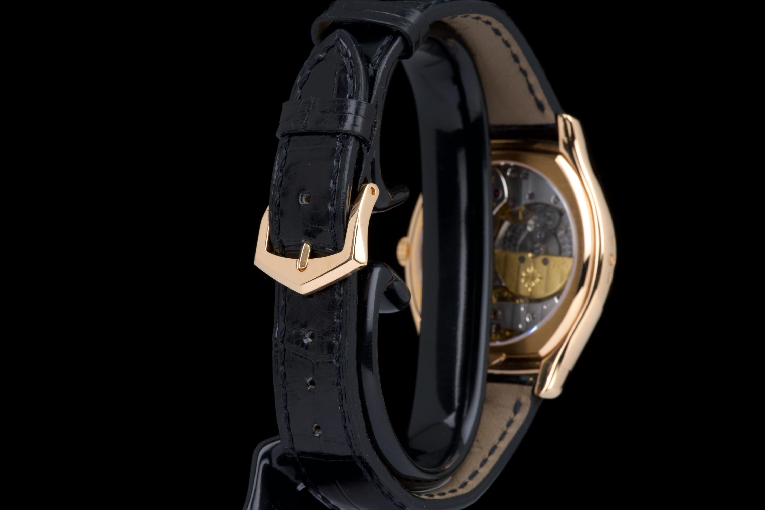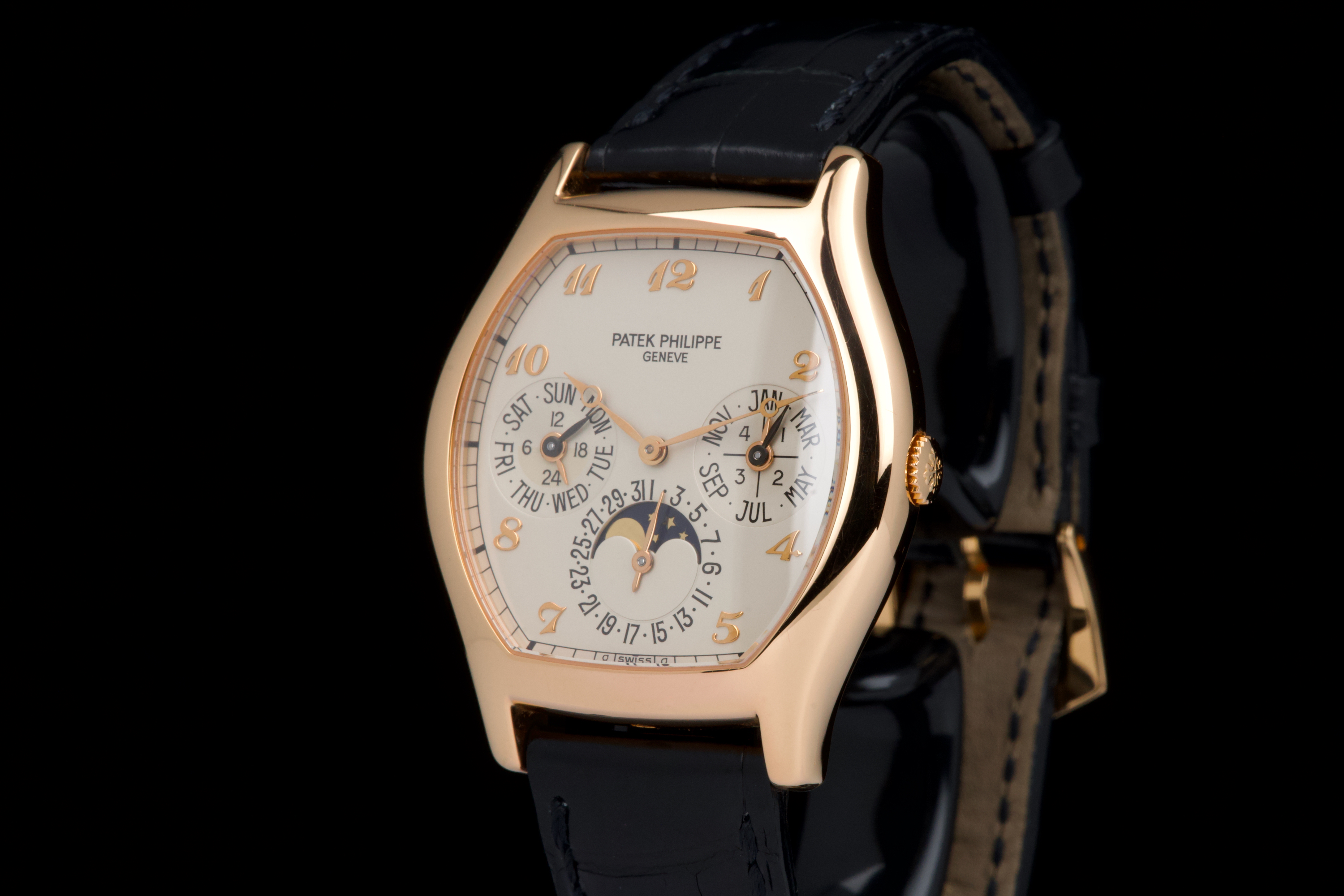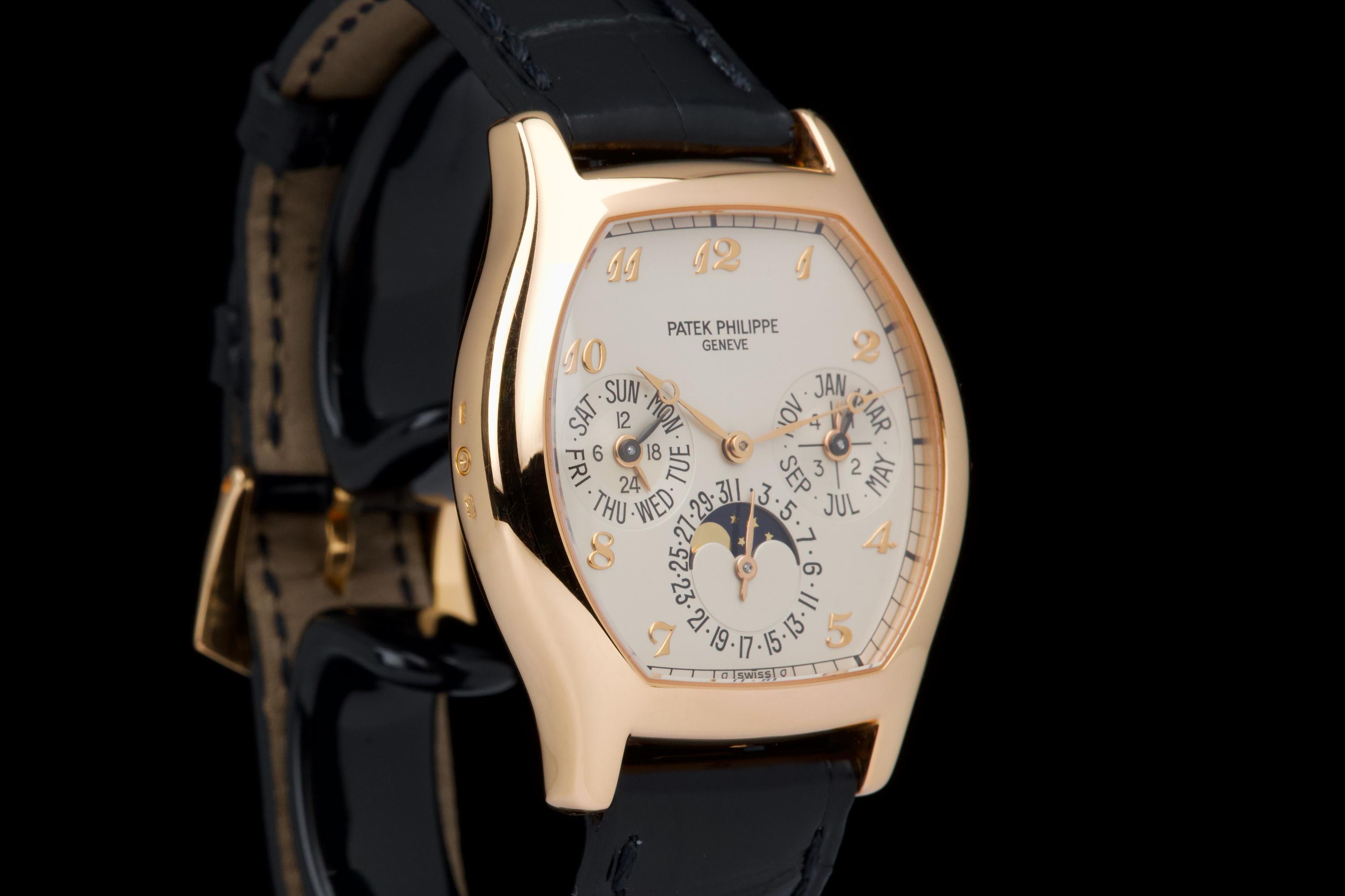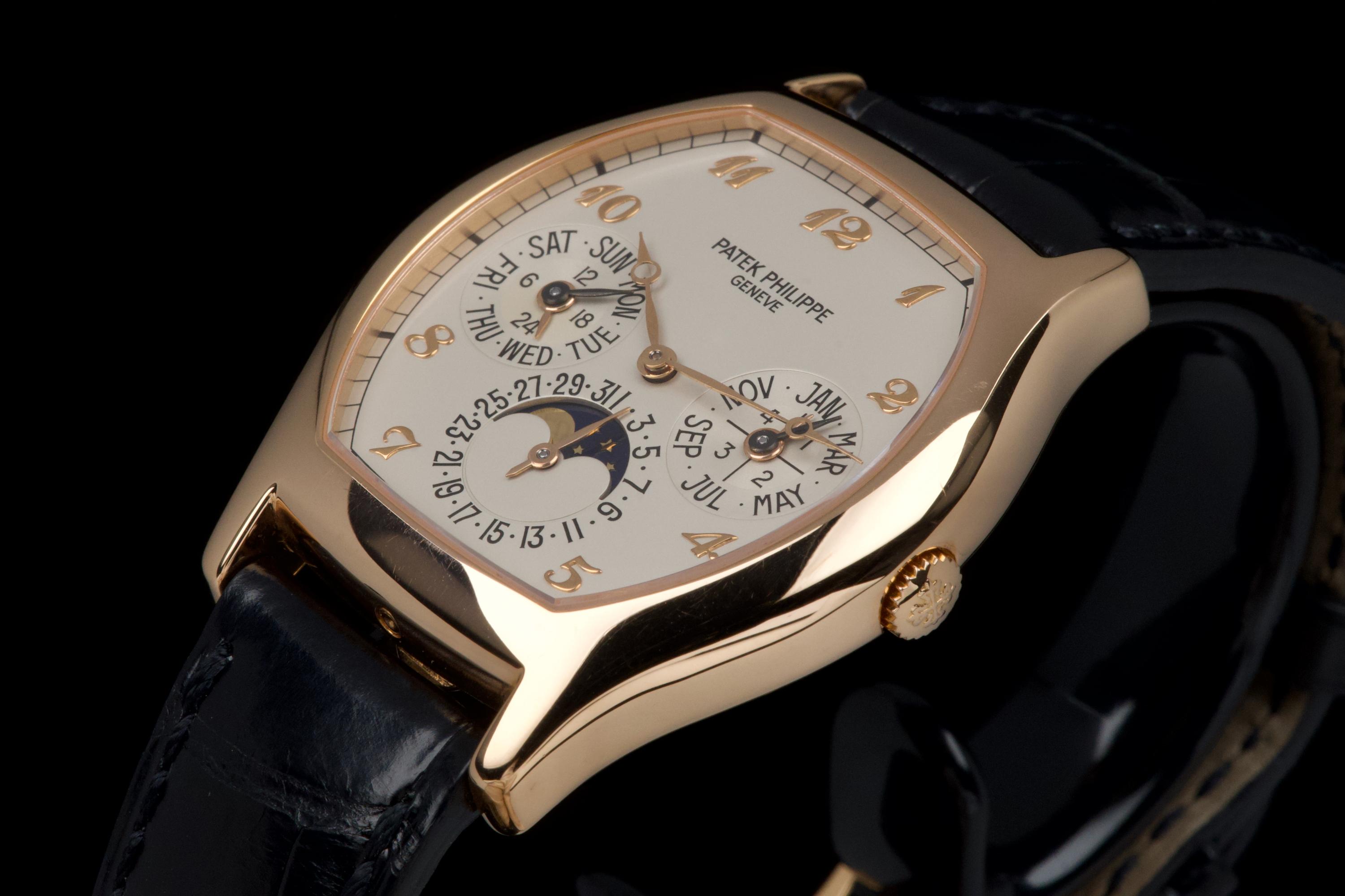 An exceptional and beautifully preserved example of the Patek Philippe Perpetual Calendar reference 5040R in 18k rose gold, sold new in Germany in 1995 and accompanied by an outstanding and historically rich full set. The watch appears to be completely unpolished, with the hallmarks on the left case flank remaining as crisp and deep as the day they left the atelier — a clear indication that no polishing has ever softened the edges or compromised the original geometry. The rose-gold tonneau case retains its perfect definition and elegant proportions. This 5040R comes with a complete full set, including the original box, rotating stand, second solid caseback, stylus, and all documents. Importantly, the watch is accompanied by two Patek Philippe Japan service papers, dated 2012 and 2019, confirming that the watch has been impeccably maintained over the years. Adding to its provenance, the set includes a signed congratulatory letter from Henri Stern, addressed to the original buyer — a rare and meaningful historical detail. The black Patek Philippe crocodile strap is in excellent condition, fitted with a Patek Philippe rose-gold buckle. The iconic silver dial with applied Breguet numerals is flawless, and the hands match perfectly, completing the elegant aesthetic of this perpetual calendar. Considering its rarity, condition, and completeness, the 5040R represents remarkable value in the world of Patek Philippe perpetual calendars — especially when compared to the more traditional 3940R, which today commands roughly double the price. A truly exceptional and collector-grade example of the 5040R — unpolished, fully documented, perfectly maintained, and accompanied by an extraordinary provenance.