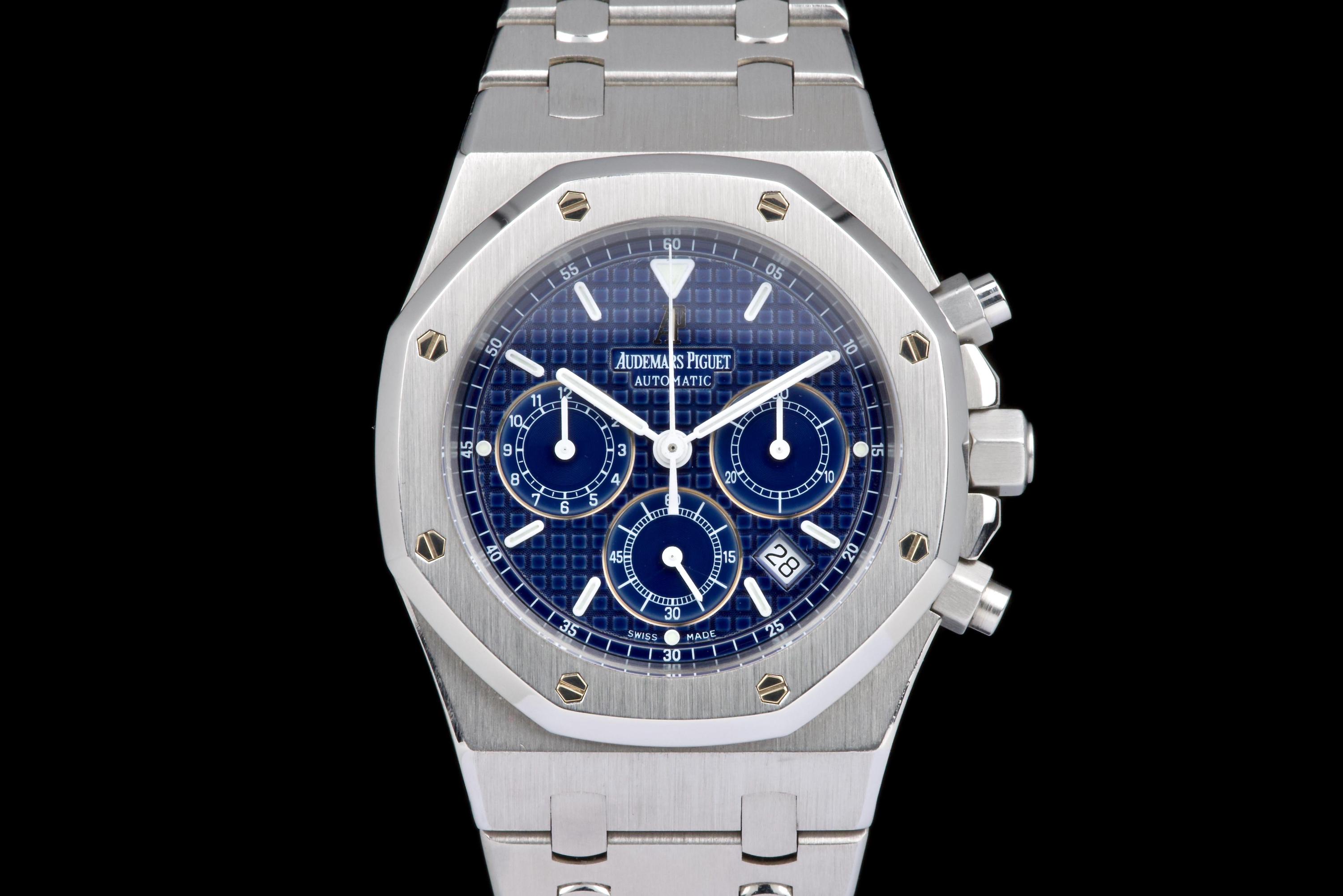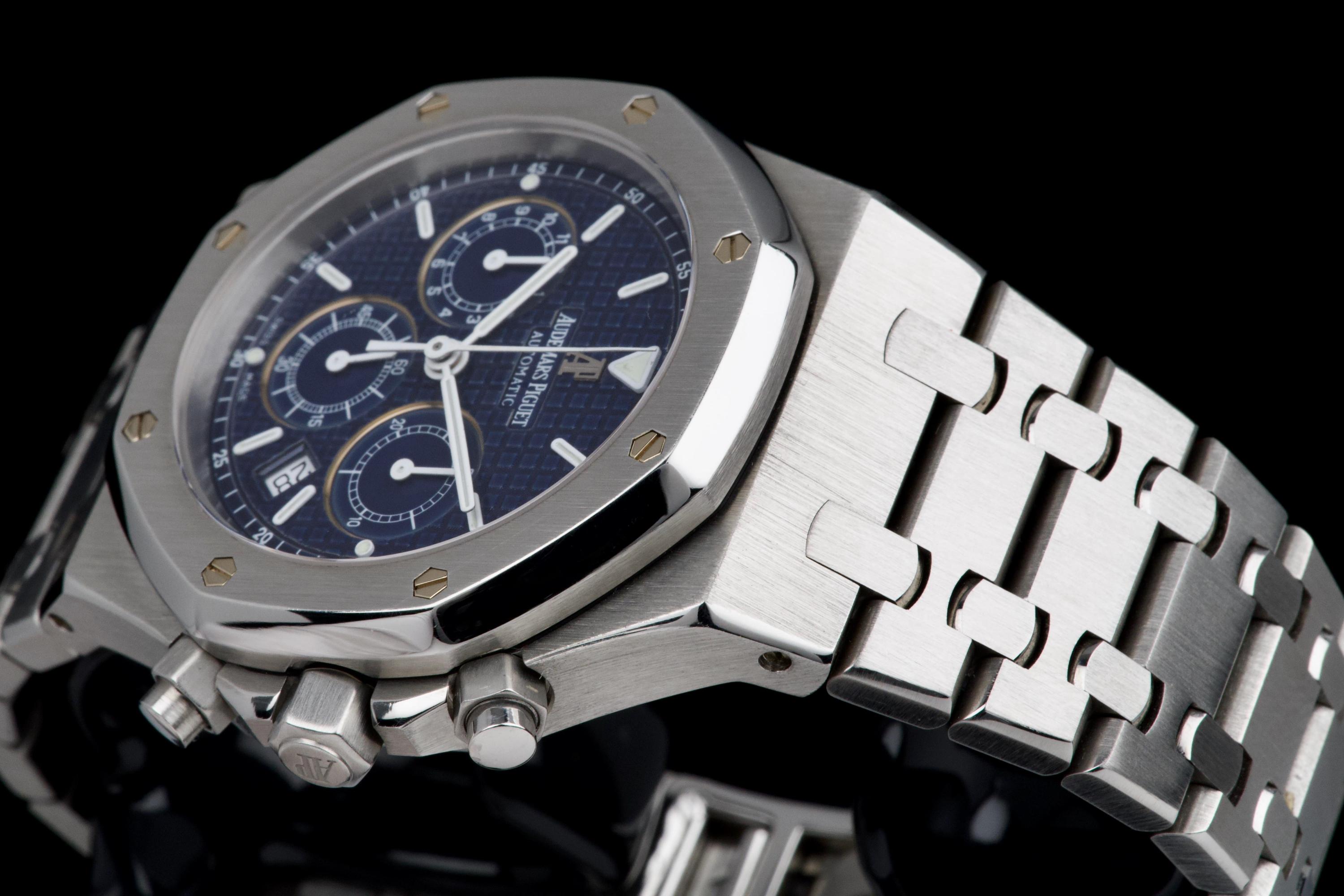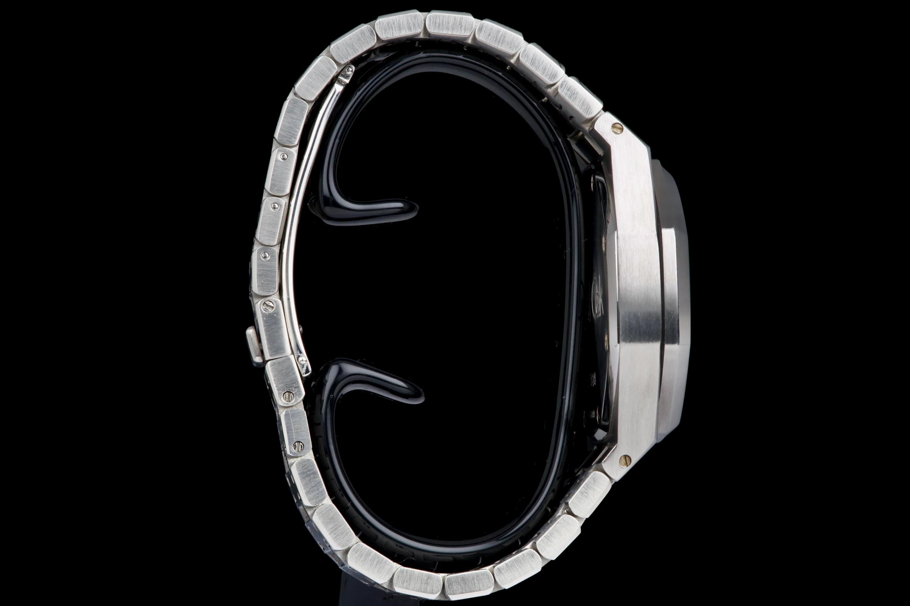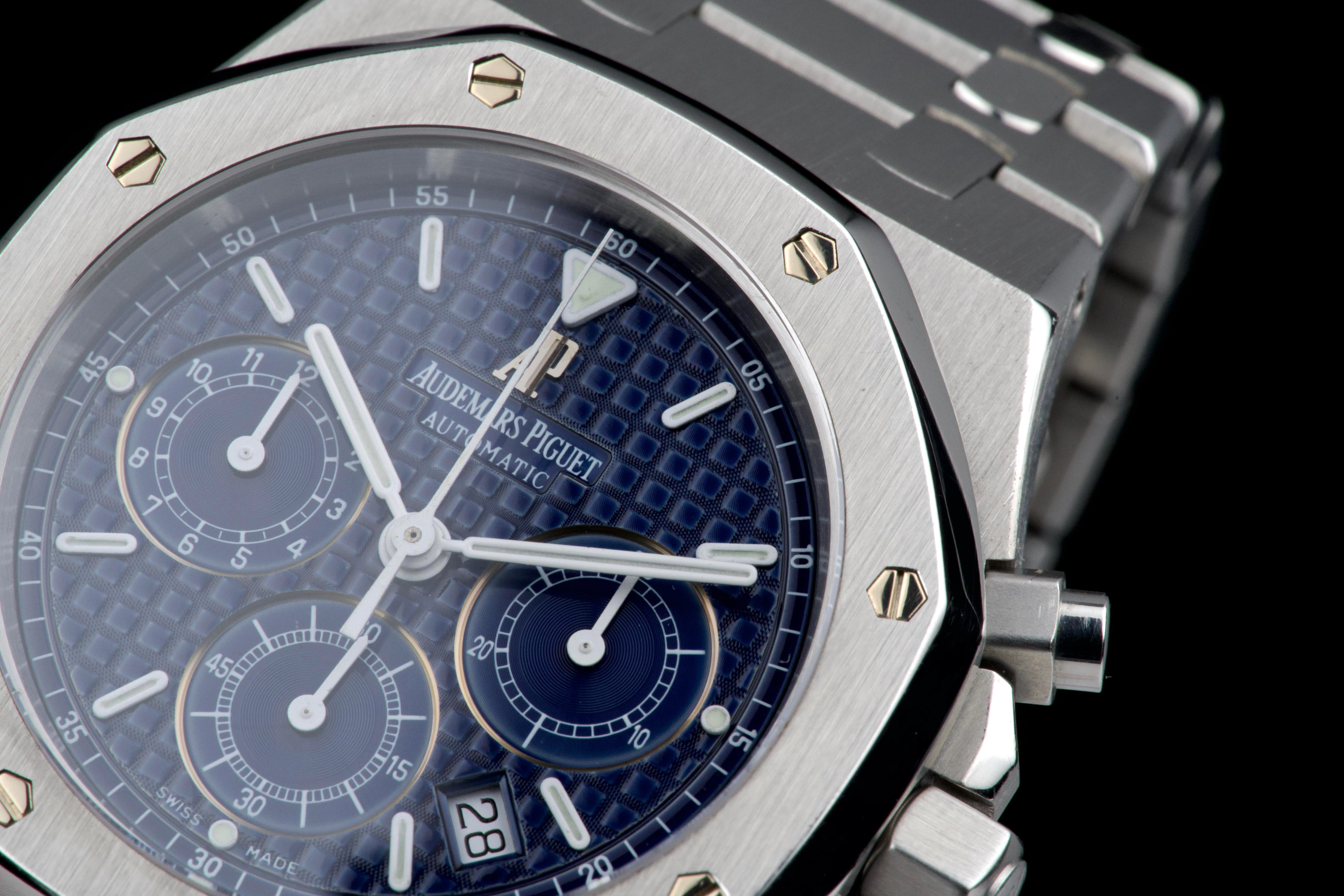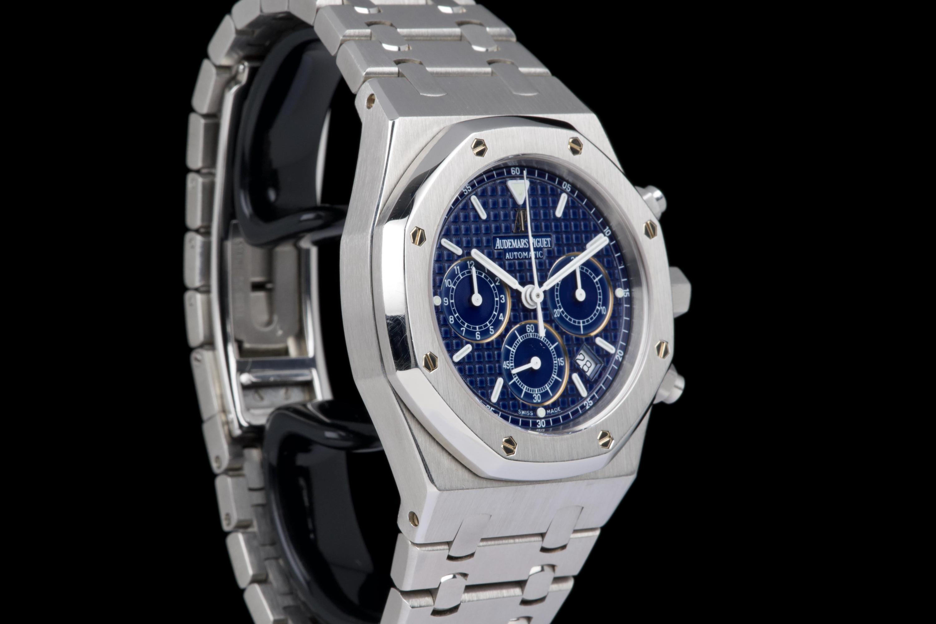 The present Audemars Piguet Royal Oak Chronograph “Kasparov” reference 25860ST.OO.1110ST.01, dating to 2001, is a highly attractive and increasingly sought-after example of the early Royal Oak Chronograph series. Accompanied by an Extract from the Archives confirming its sale on 23 February 2001, this watch combines desirable early-production characteristics with an exceptional dial. The stainless-steel case has been polished in the past and shows light wear consistent with careful use, while retaining strong overall definition. The integrated bracelet is preserved in excellent condition and shows virtually no stretch, a highly desirable attribute for this reference. The watch is fitted with its original Mk1 clasp, further supporting its period correctness. The true highlight of this example is its superb electric blue dial, featuring a rich lacquered surface of remarkable vibrancy. The tone is rare and visually striking, closely resembling Klein blue, and gives the watch a bold and distinctive presence on the wrist. The dial shows very minimal signs of wear and remains in excellent overall condition. The hands match perfectly, maintaining a harmonious and cohesive aesthetic. The sapphire crystal presents a very small surface mark near the 18-hour subdial, barely visible to the naked eye and not detracting from the overall presentation. While no service history accompanies the watch, it is functioning correctly at the time of cataloguing. Combining a rare and captivating dial, archival confirmation, and strong overall condition, this Royal Oak Chronograph “Kasparov” represents a compelling opportunity to acquire an early and charismatic example of one of Audemars Piguet’s most iconic modern chronographs.