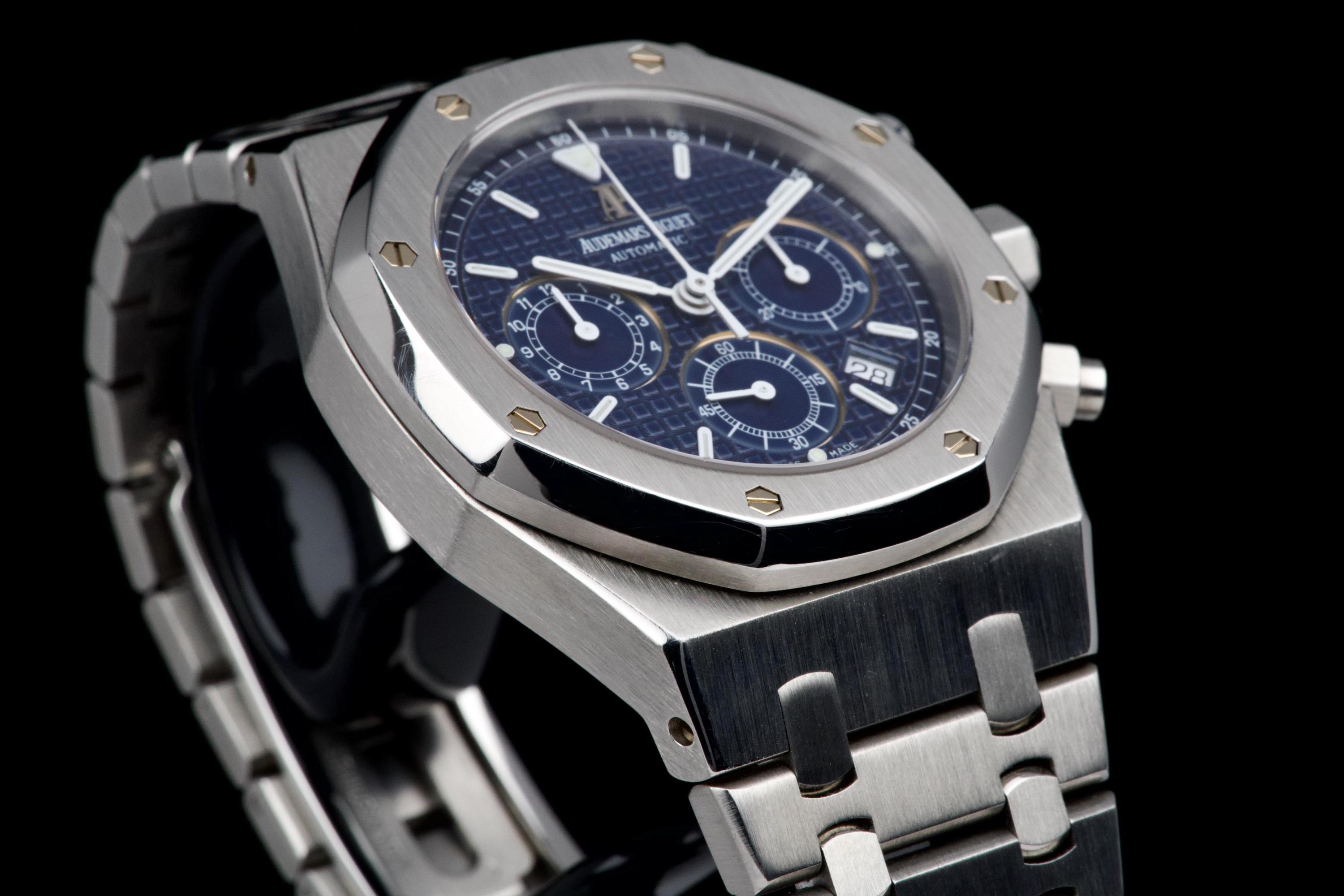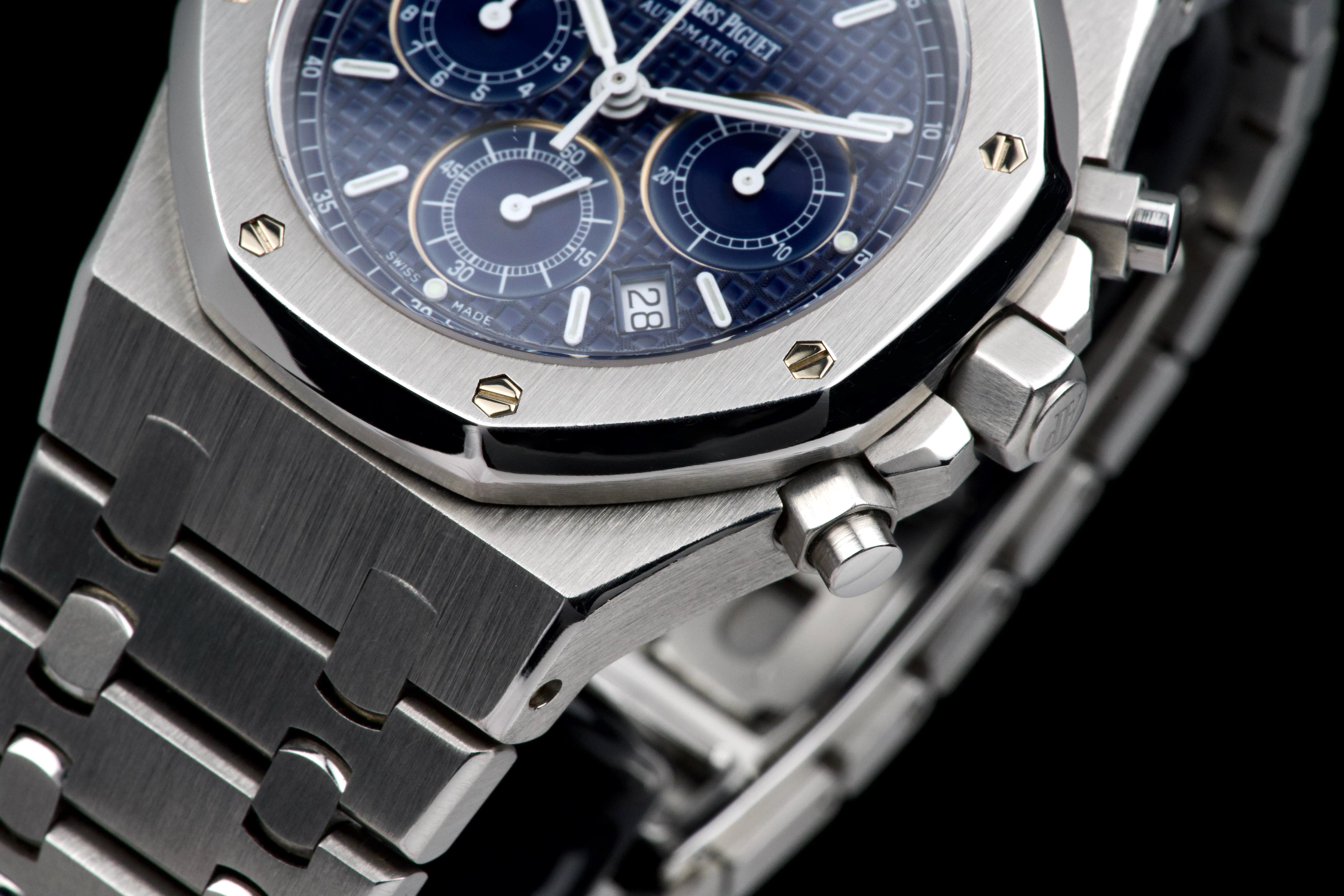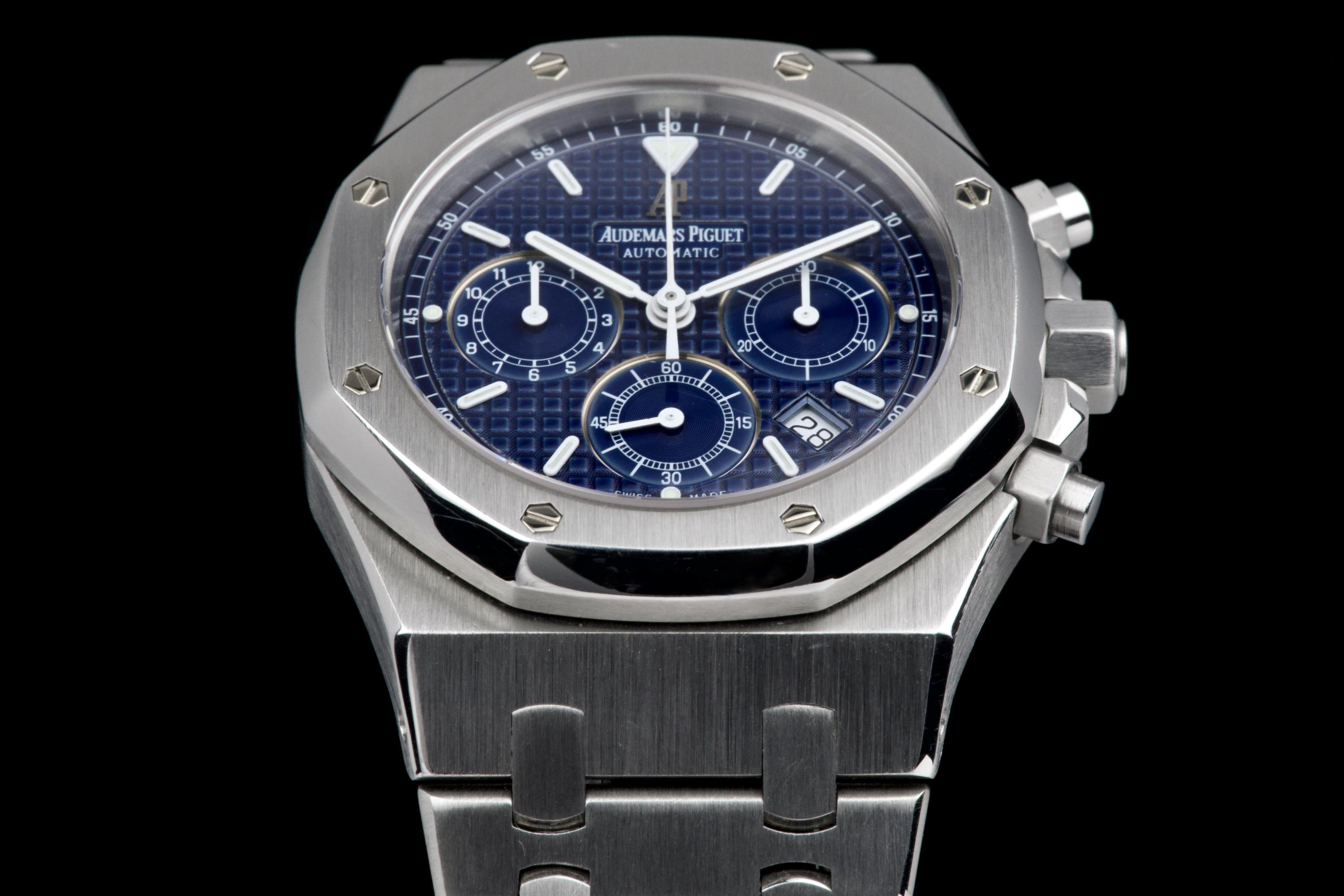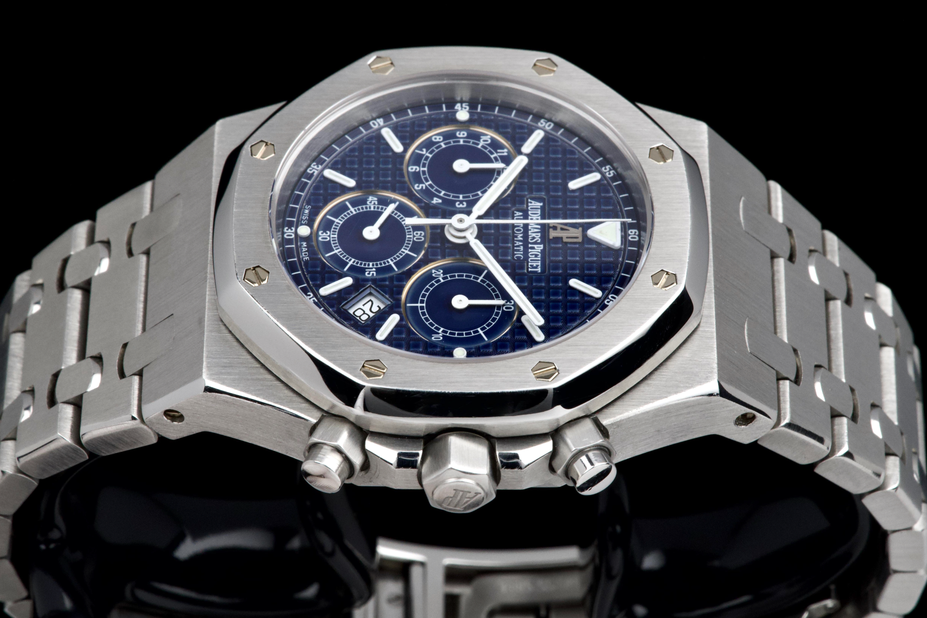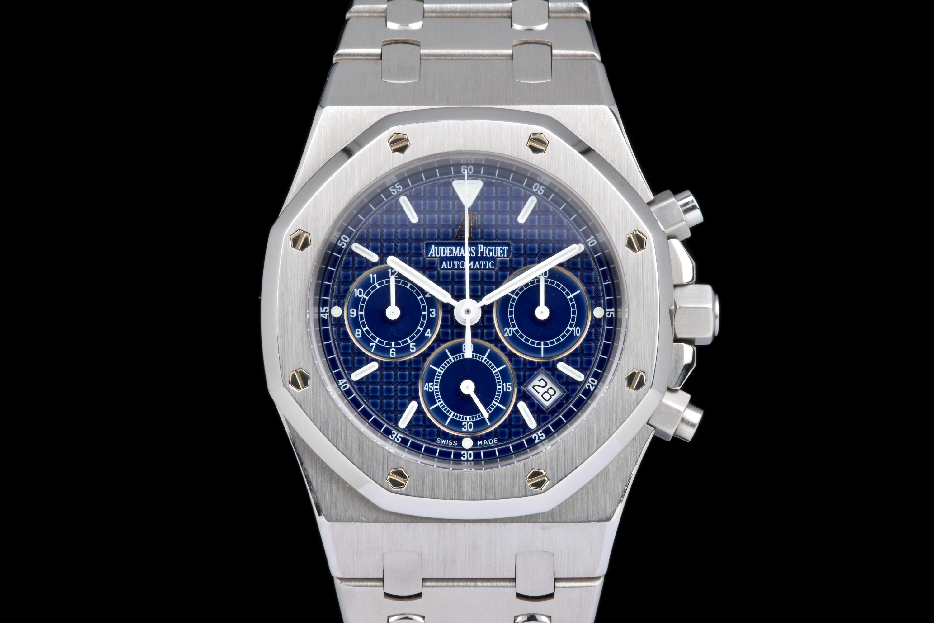 The present Audemars Piguet Royal Oak Chronograph “Kasparov” reference 25860ST.OO.1110ST.01, dating to 2001, is a highly attractive and increasingly sought-after example of the early Royal Oak Chronograph series. Accompanied by an Extract from the Archives confirming its sale on 23 February 2001, this watch combines desirable early-production characteristics with an exceptional dial. The stainless-steel case has been polished in the past and shows light wear consistent with careful use, while retaining strong overall definition. The integrated bracelet is preserved in excellent condition and shows virtually no stretch, a highly desirable attribute for this reference. The watch is fitted with its original Mk1 clasp, further supporting its period correctness. The true highlight of this example is its superb electric blue dial, featuring a rich lacquered surface of remarkable vibrancy. The tone is rare and visually striking, closely resembling Klein blue, and gives the watch a bold and distinctive presence on the wrist. The dial shows very minimal signs of wear and remains in excellent overall condition. The hands match perfectly, maintaining a harmonious and cohesive aesthetic. The sapphire crystal presents a very small surface mark near the 18-hour subdial, barely visible to the naked eye and not detracting from the overall presentation. While no service history accompanies the watch, it is functioning correctly at the time of cataloguing. Combining a rare and captivating dial, archival confirmation, and strong overall condition, this Royal Oak Chronograph “Kasparov” represents a compelling opportunity to acquire an early and charismatic example of one of Audemars Piguet’s most iconic modern chronographs.