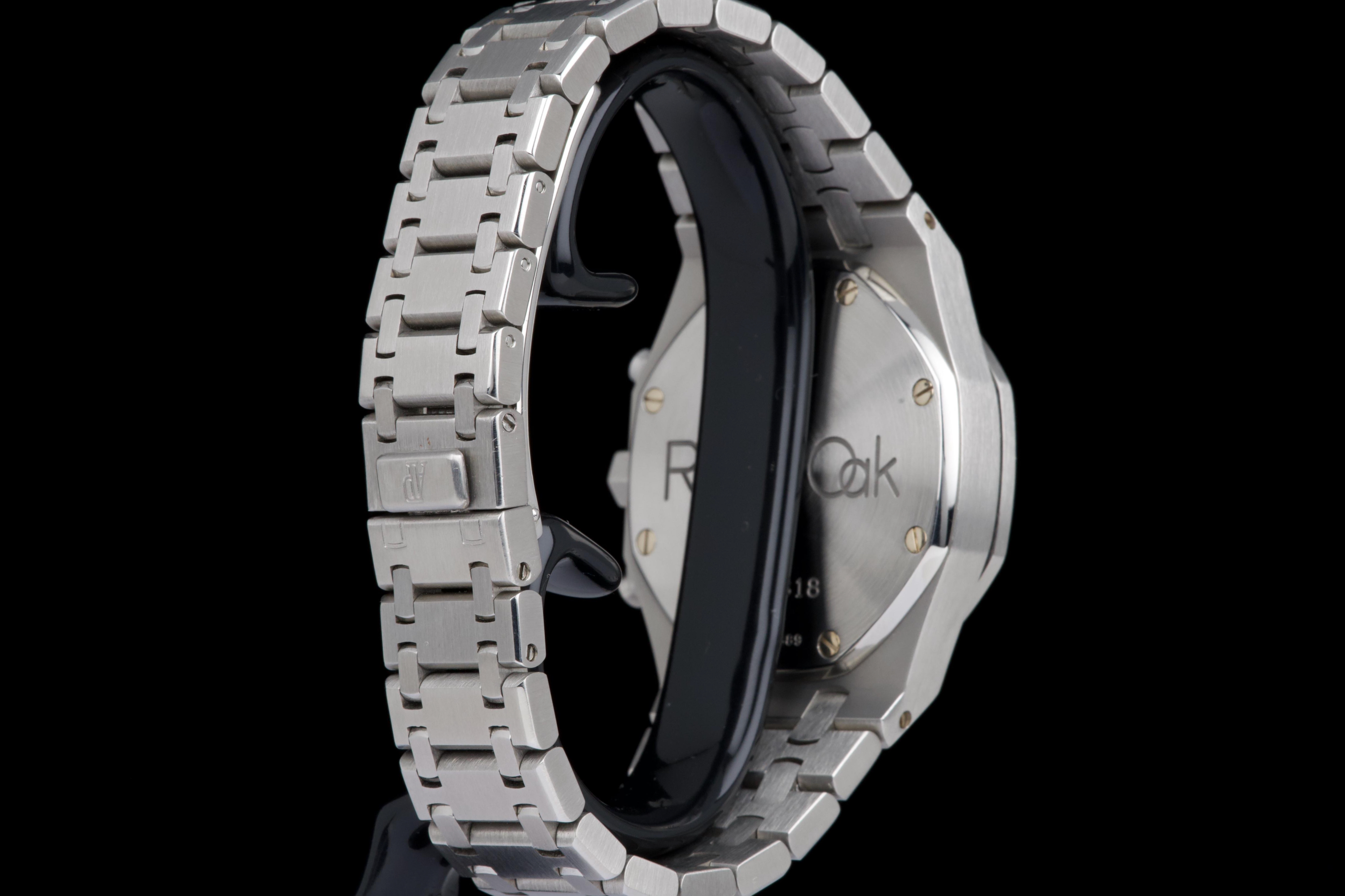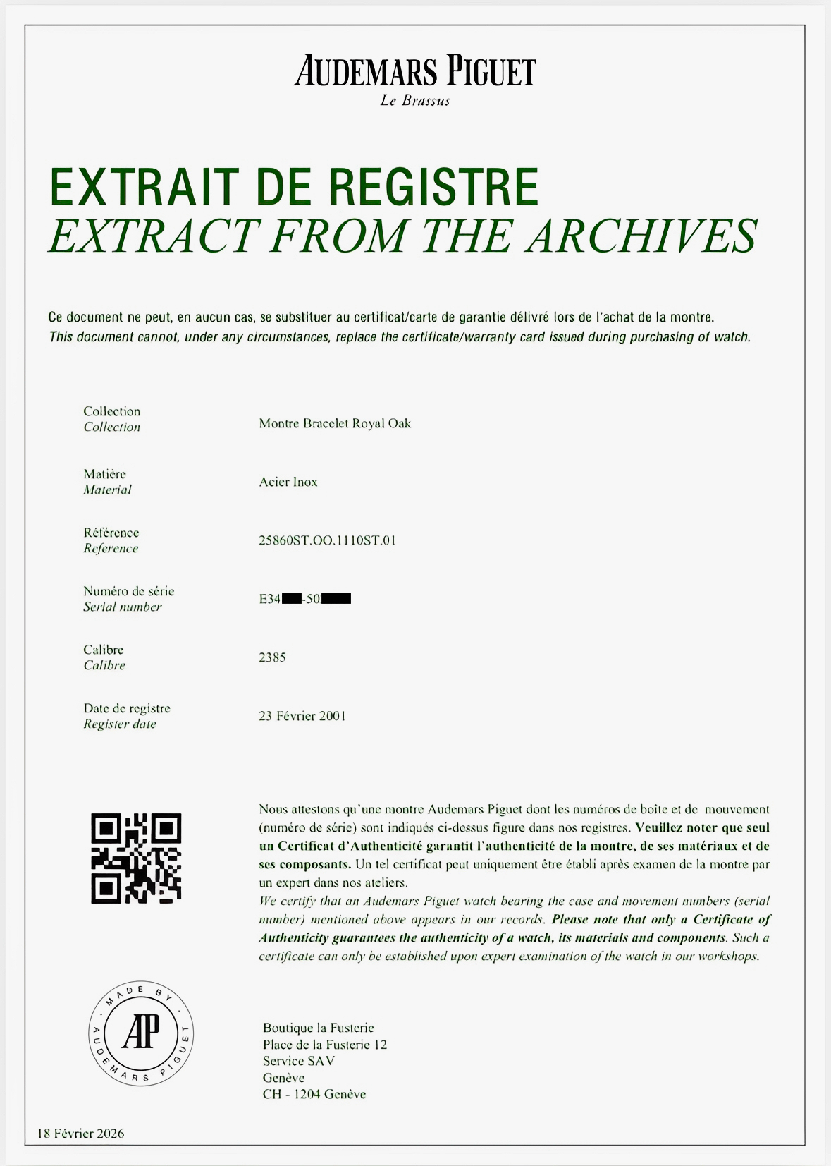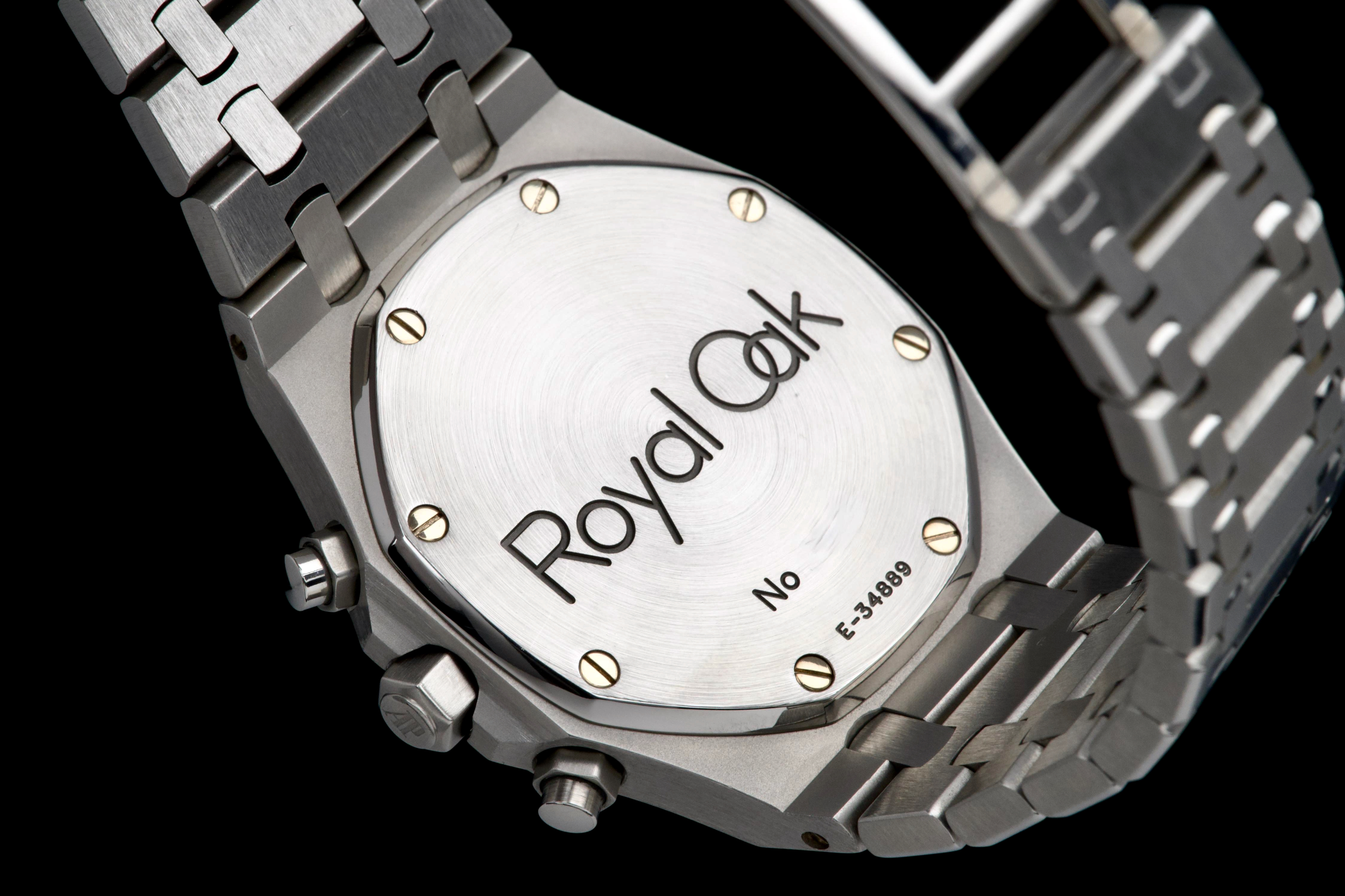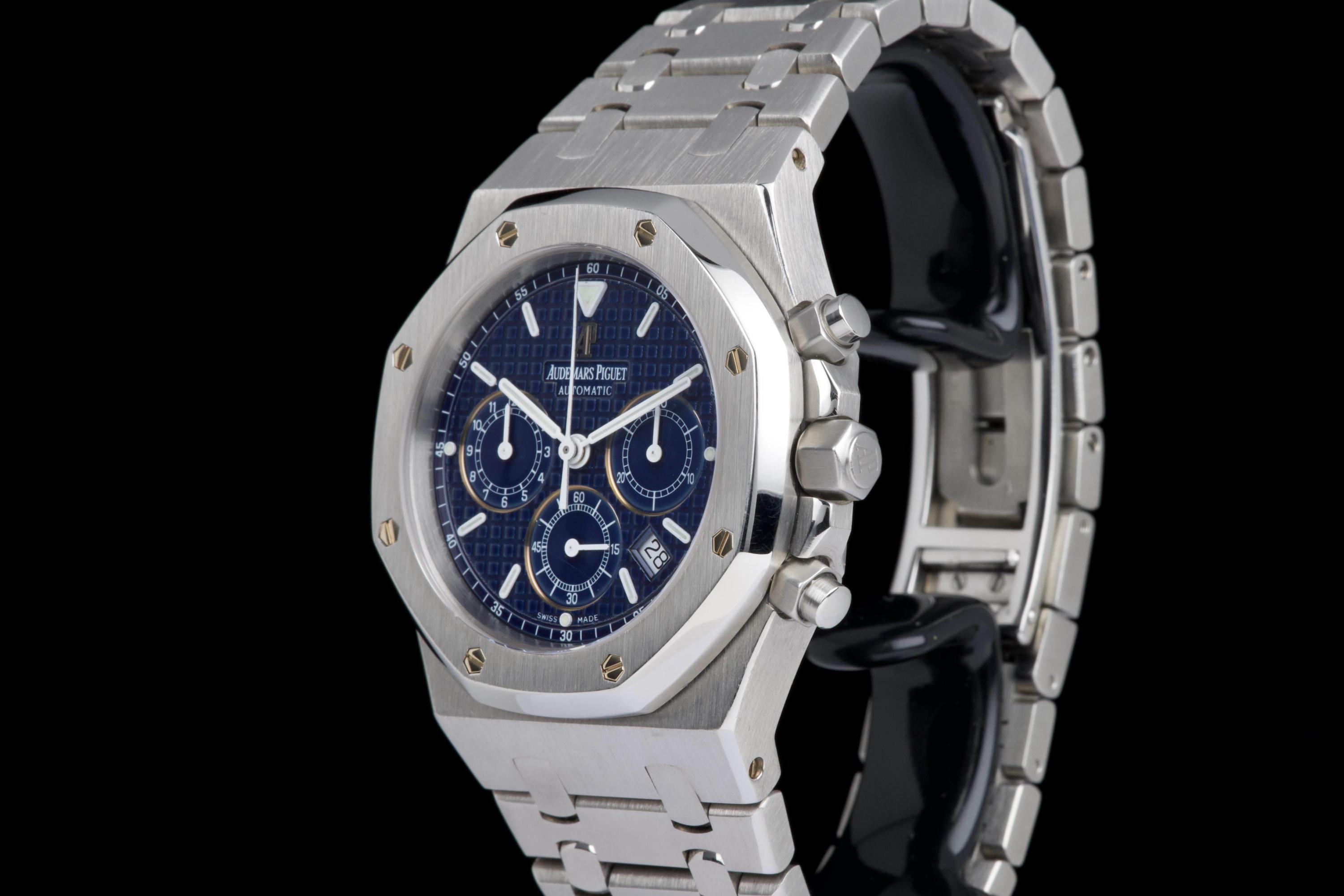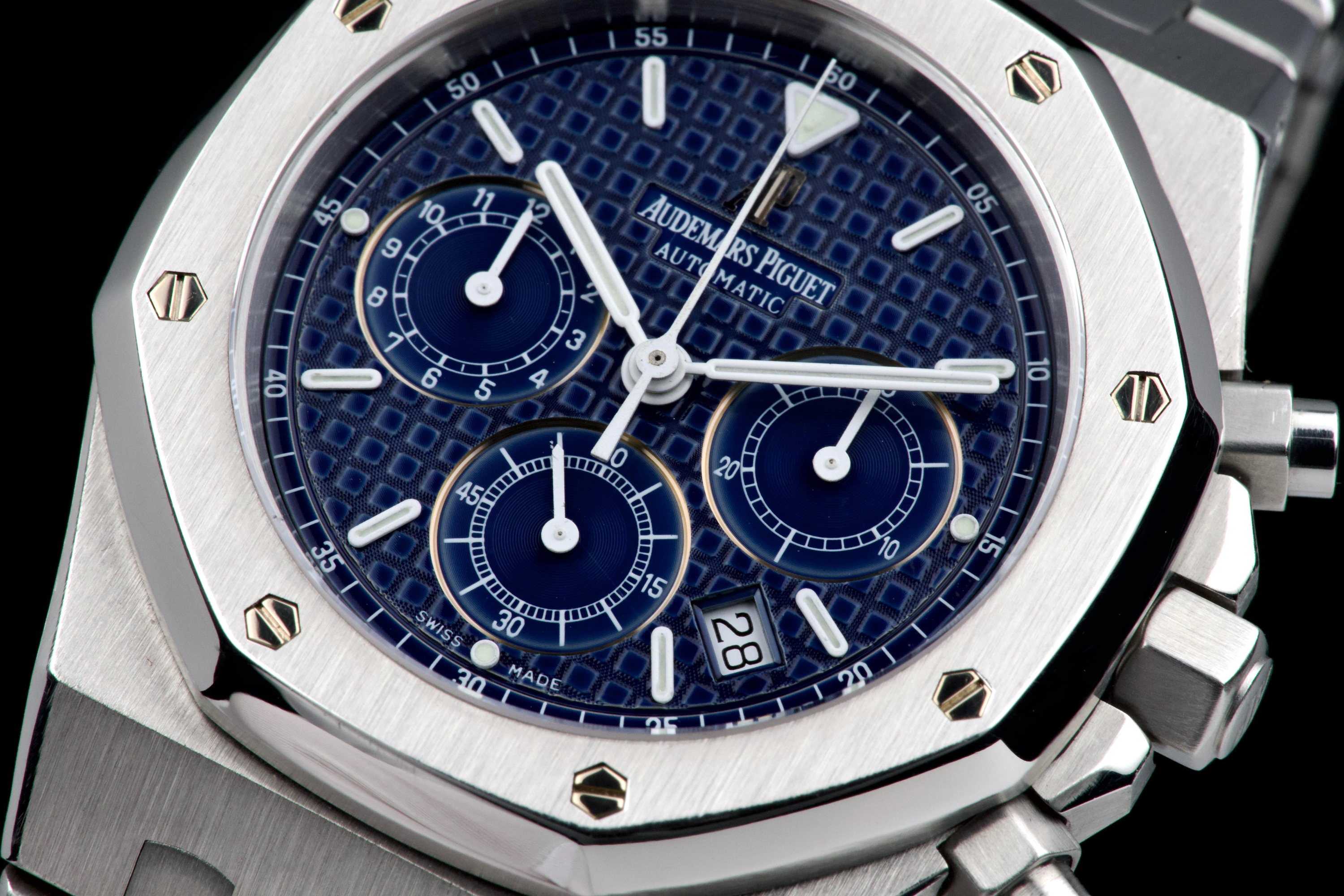 The present Audemars Piguet Royal Oak Chronograph “Kasparov” reference 25860ST.OO.1110ST.01, dating to 2001, is a highly attractive and increasingly sought-after example of the early Royal Oak Chronograph series. Accompanied by an Extract from the Archives confirming its sale on 23 February 2001, this watch combines desirable early-production characteristics with an exceptional dial. The stainless-steel case has been polished in the past and shows light wear consistent with careful use, while retaining strong overall definition. The integrated bracelet is preserved in excellent condition and shows virtually no stretch, a highly desirable attribute for this reference. The watch is fitted with its original Mk1 clasp, further supporting its period correctness. The true highlight of this example is its superb electric blue dial, featuring a rich lacquered surface of remarkable vibrancy. The tone is rare and visually striking, closely resembling Klein blue, and gives the watch a bold and distinctive presence on the wrist. The dial shows very minimal signs of wear and remains in excellent overall condition. The hands match perfectly, maintaining a harmonious and cohesive aesthetic. The sapphire crystal presents a very small surface mark near the 18-hour subdial, barely visible to the naked eye and not detracting from the overall presentation. While no service history accompanies the watch, it is functioning correctly at the time of cataloguing. Combining a rare and captivating dial, archival confirmation, and strong overall condition, this Royal Oak Chronograph “Kasparov” represents a compelling opportunity to acquire an early and charismatic example of one of Audemars Piguet’s most iconic modern chronographs.