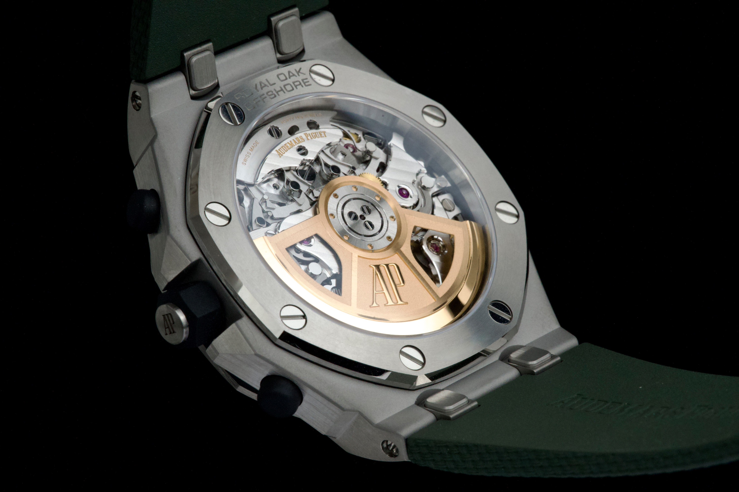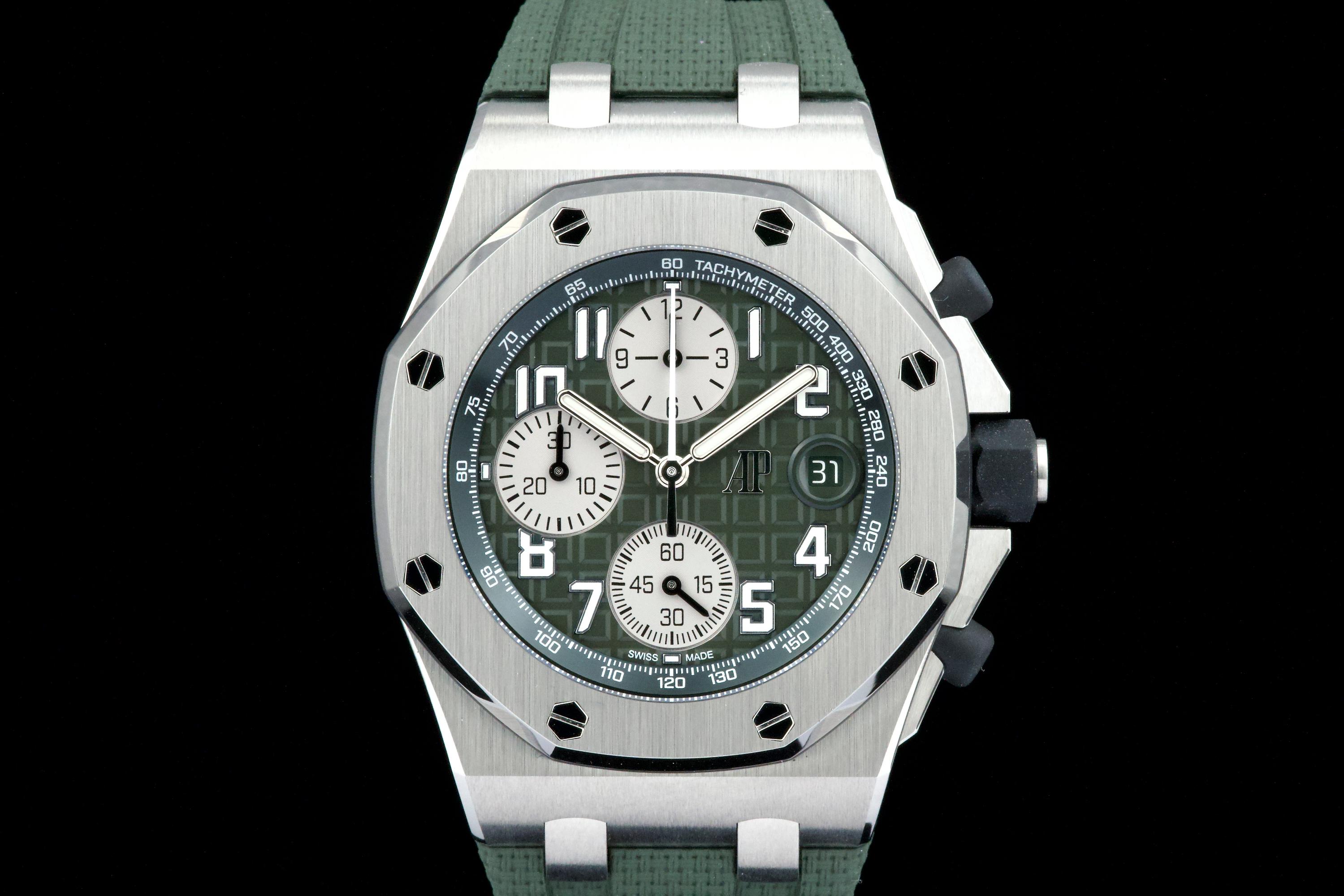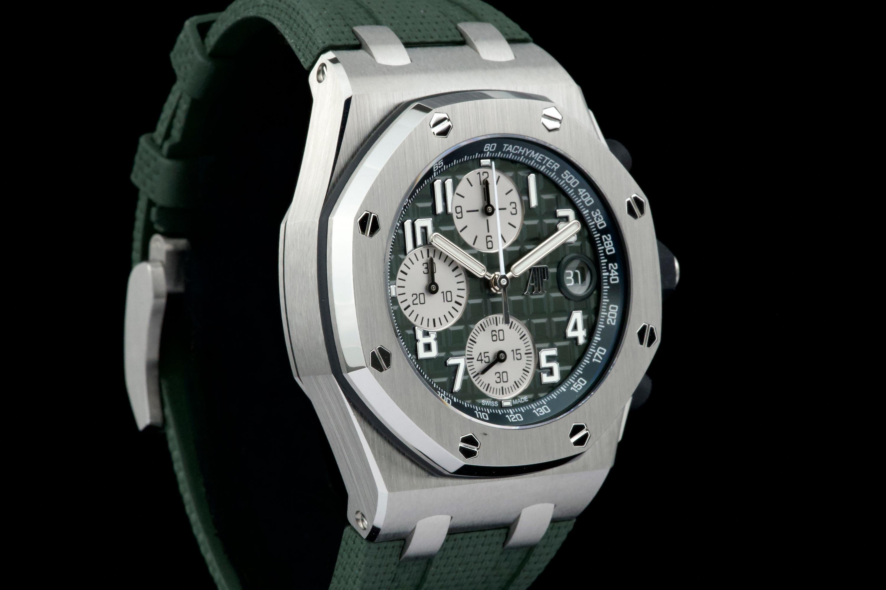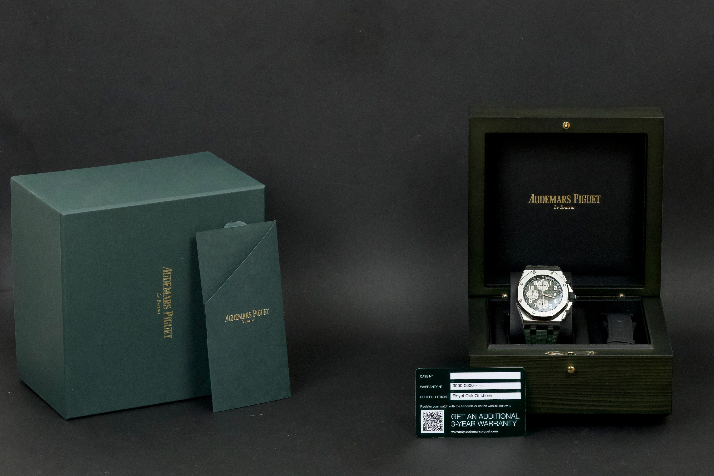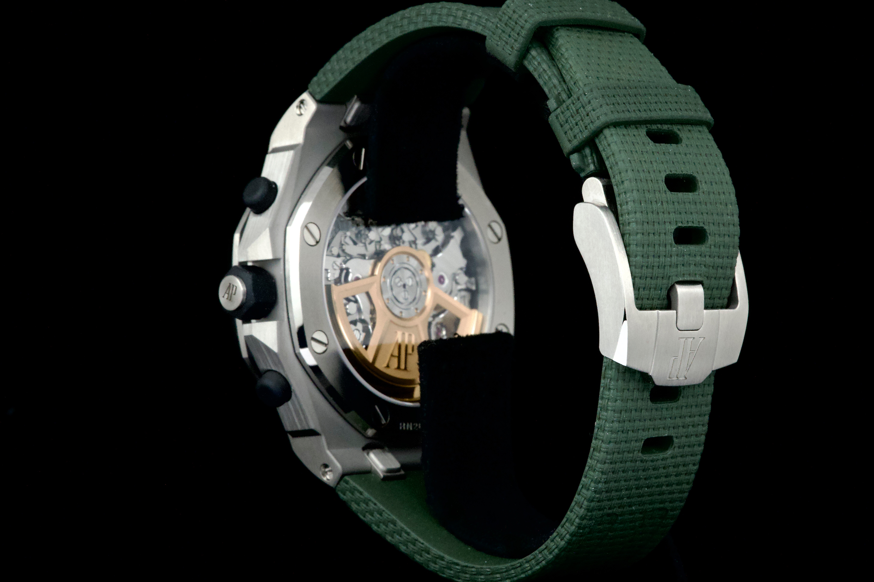 A stunning Audemars Piguet Royal Oak Offshore Chronograph Ref. 26238TI, crafted in lightweight titanium and sold in 2023, offered as a Full Set with box and papers. This example is in mint, unpolished condition and features a striking green “Méga Tapisserie” dial paired with a matching green rubber strap and titanium pin buckle. The 42mm case blends sportiness with modern AP design language, delivering both presence and comfort on the wrist. Powered by the in-house calibre 4404 automatic flyback chronograph movement, visible through the sapphire caseback. A bold and contemporary Offshore in a highly sought-after configuration — fresh, clean, and collector-ready.