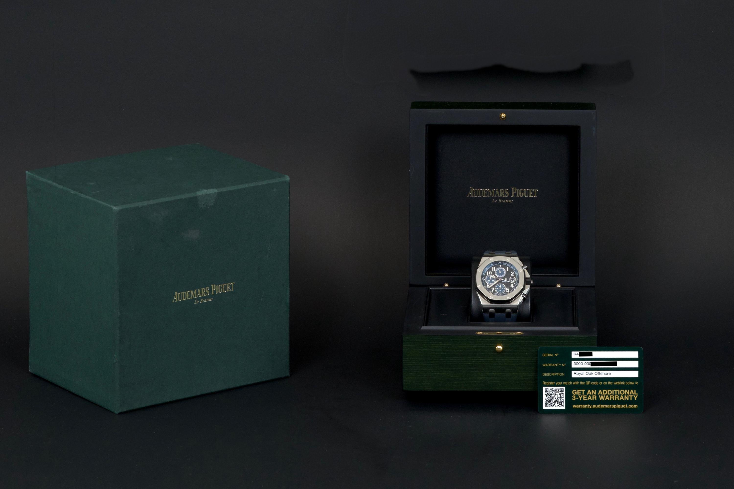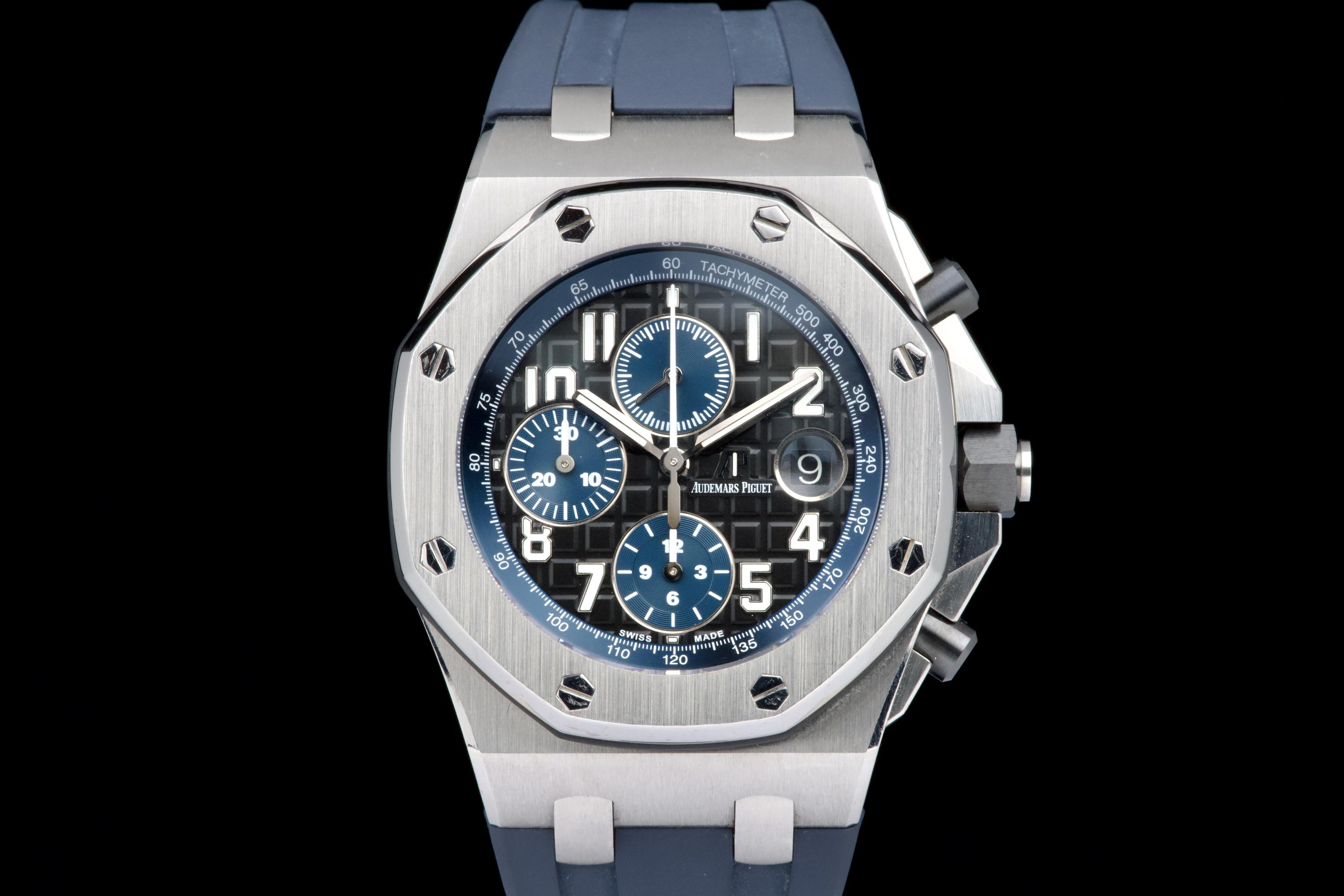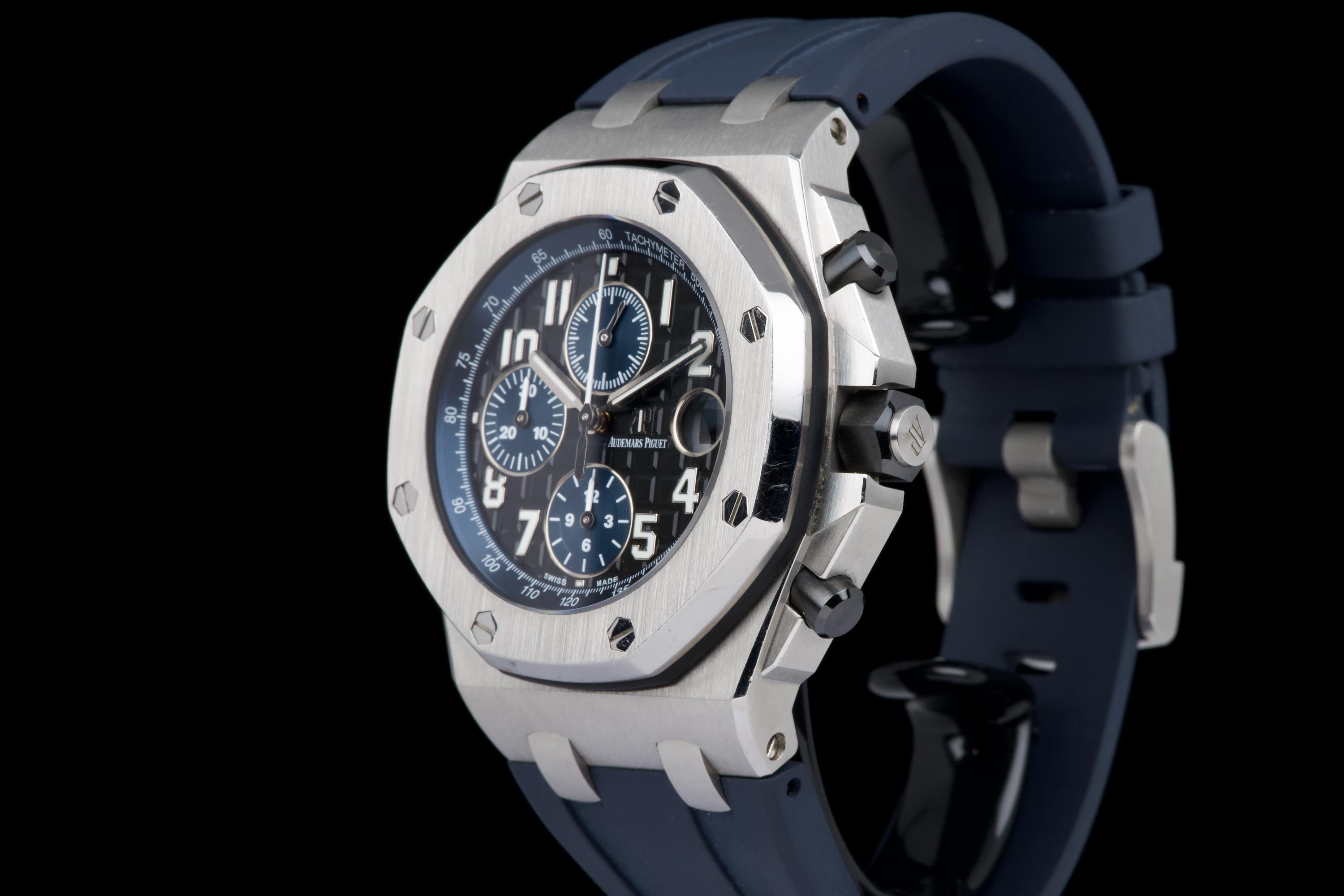 A very nice example of the Audemars Piguet Royal Oak Offshore reference 26470ST.OO.A028CR.01, featuring the striking black dial with blue subdials and matching blue rubber strap. The watch appears to be unpolished and is presented in overall very good condition, showing only light wear consistent with careful use. The case retains strong lines, and the iconic Mega Tapisserie dial remains crisp and vibrant. Powered by the Audemars Piguet caliber 3126/3840, offering robust chronograph performance and visible through the sapphire caseback. Complete with its original box and papers. A bold and desirable Royal Oak Offshore — sporty, modern, and beautifully preserved.