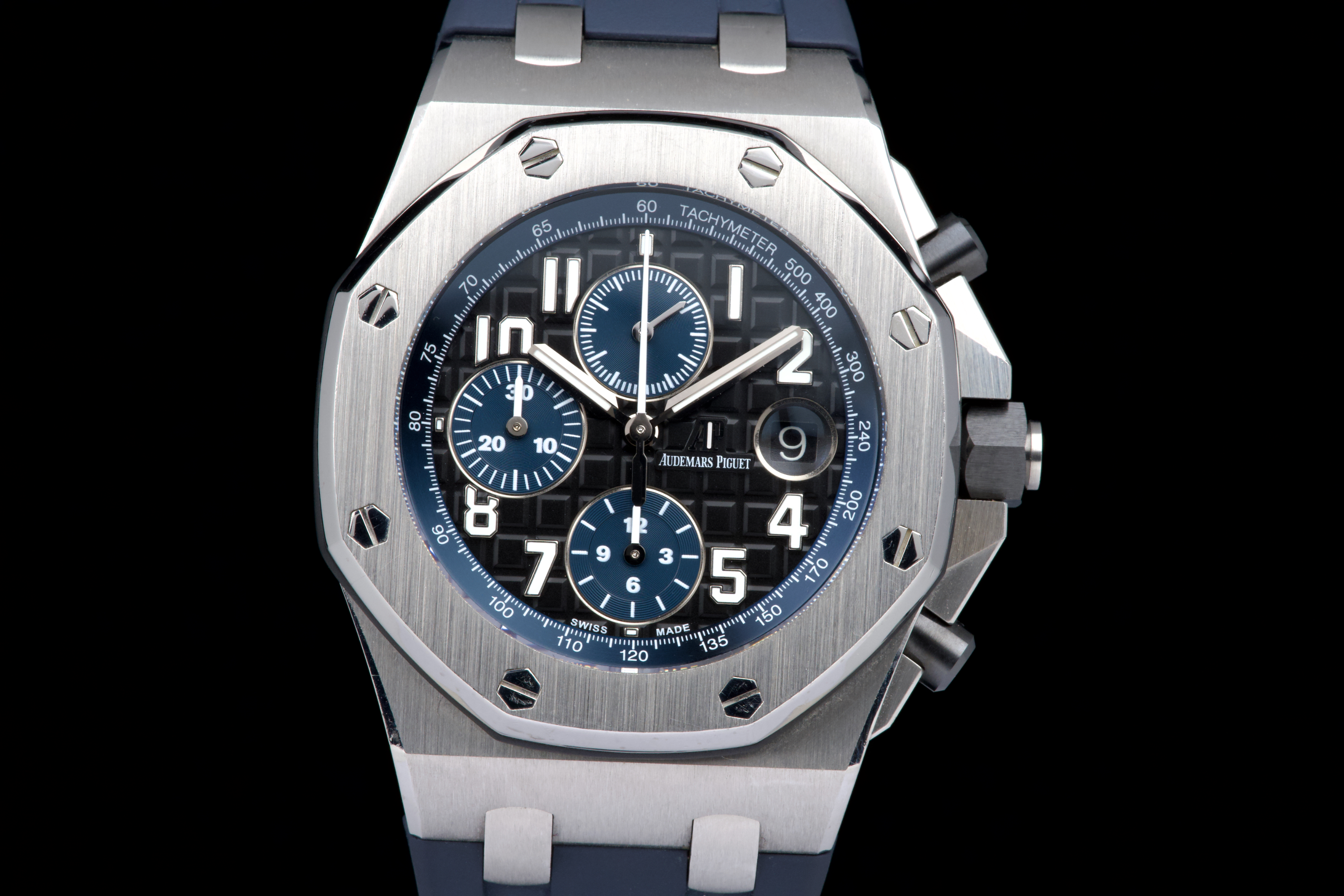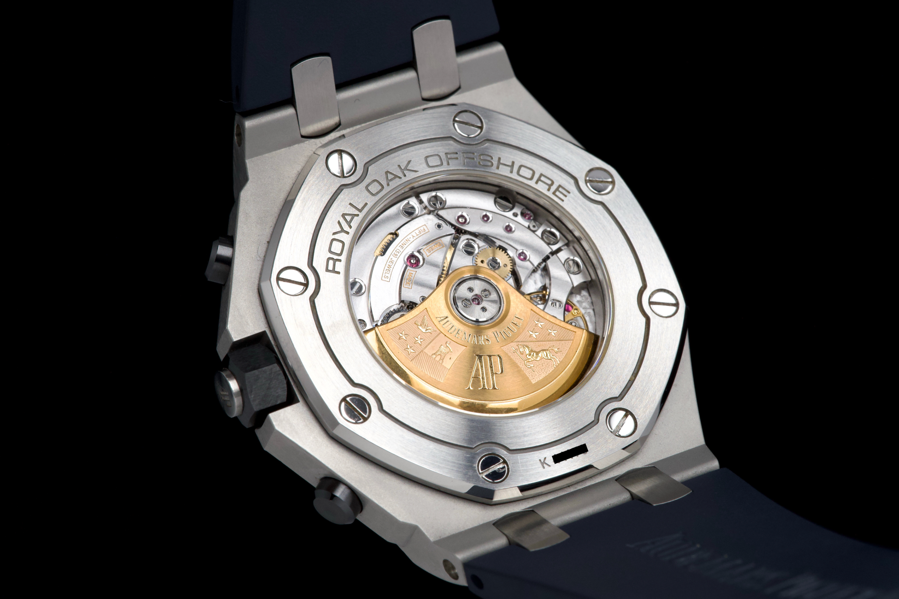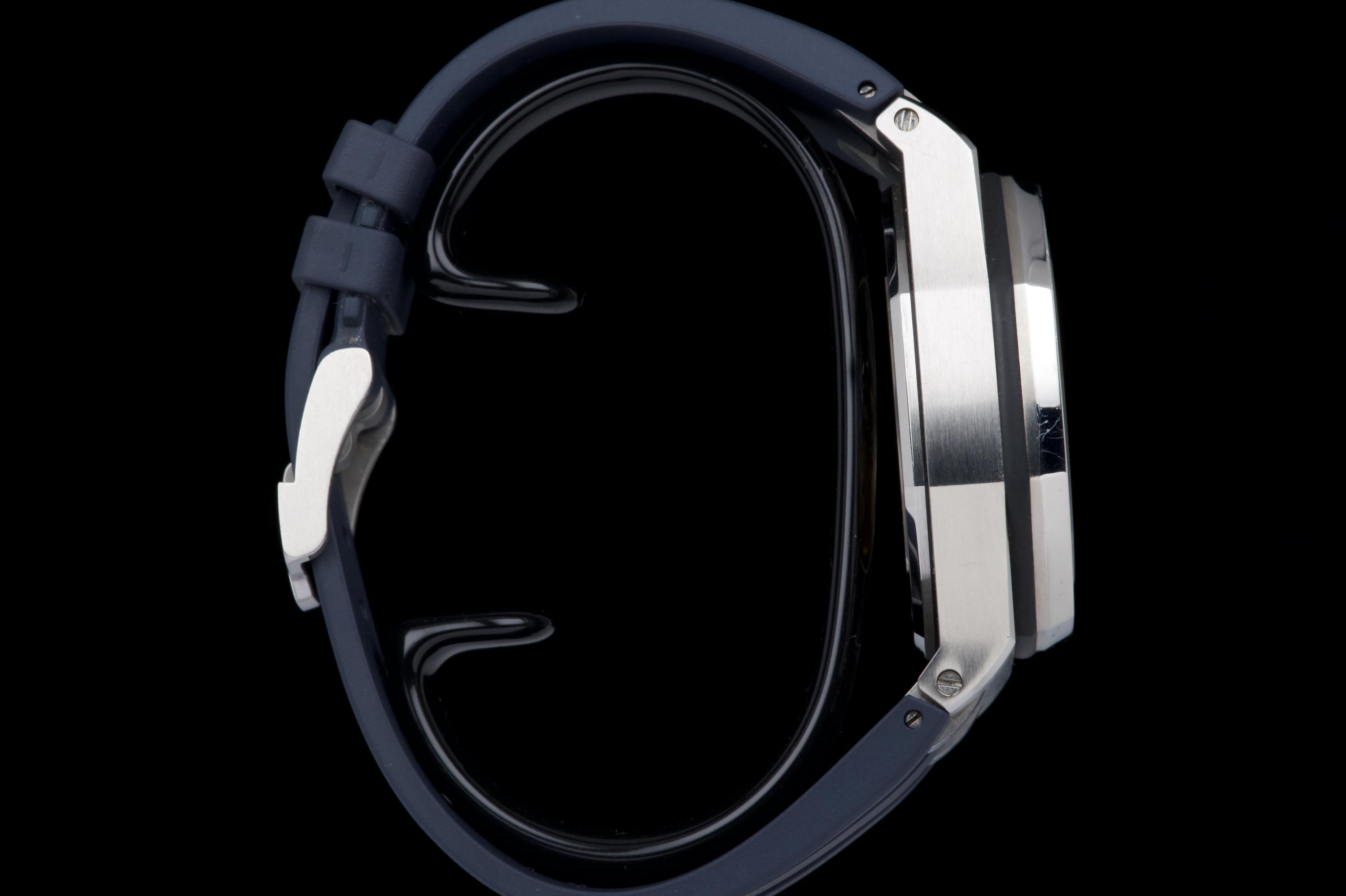 A very nice example of the Audemars Piguet Royal Oak Offshore reference 26470ST.OO.A028CR.01, featuring the striking black dial with blue subdials and matching blue rubber strap. The watch appears to be unpolished and is presented in overall very good condition, showing only light wear consistent with careful use. The case retains strong lines, and the iconic Mega Tapisserie dial remains crisp and vibrant. Powered by the Audemars Piguet caliber 3126/3840, offering robust chronograph performance and visible through the sapphire caseback. Complete with its original box and papers. A bold and desirable Royal Oak Offshore — sporty, modern, and beautifully preserved.