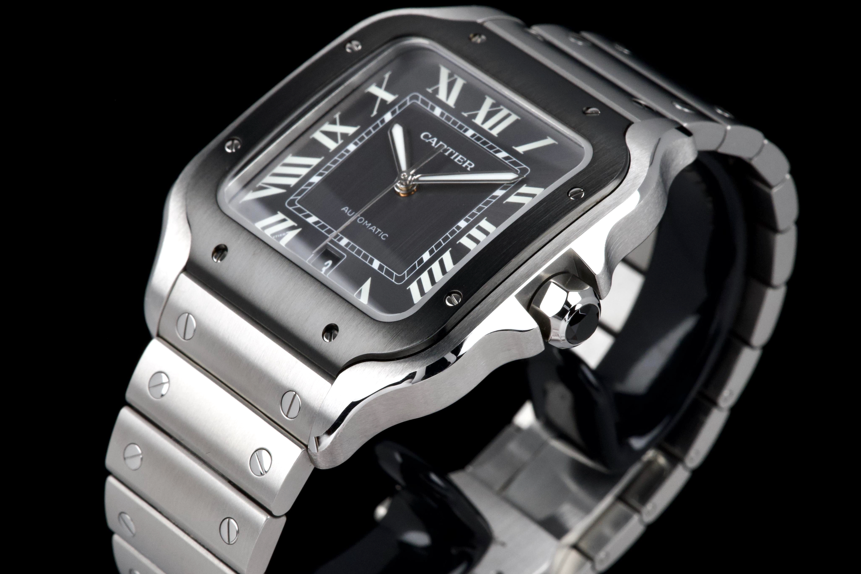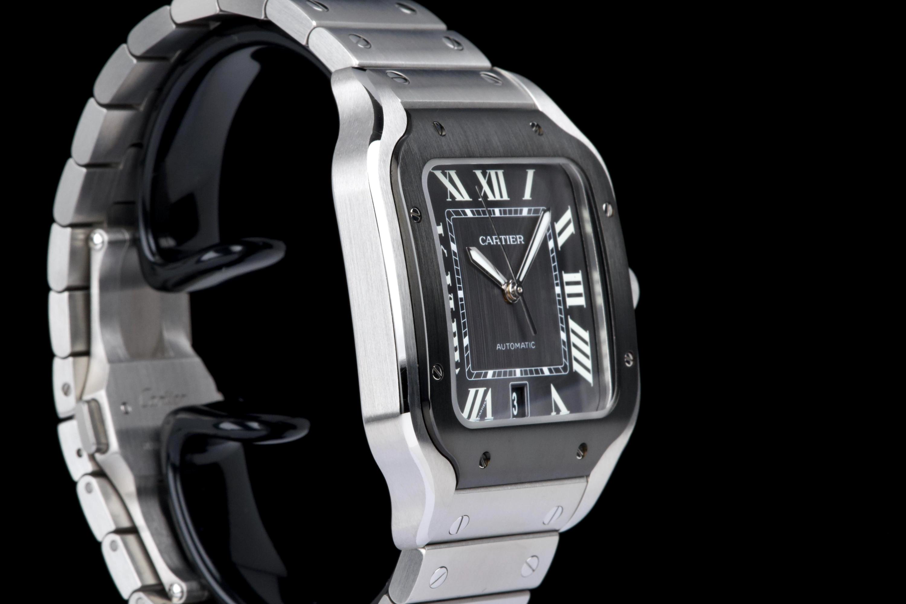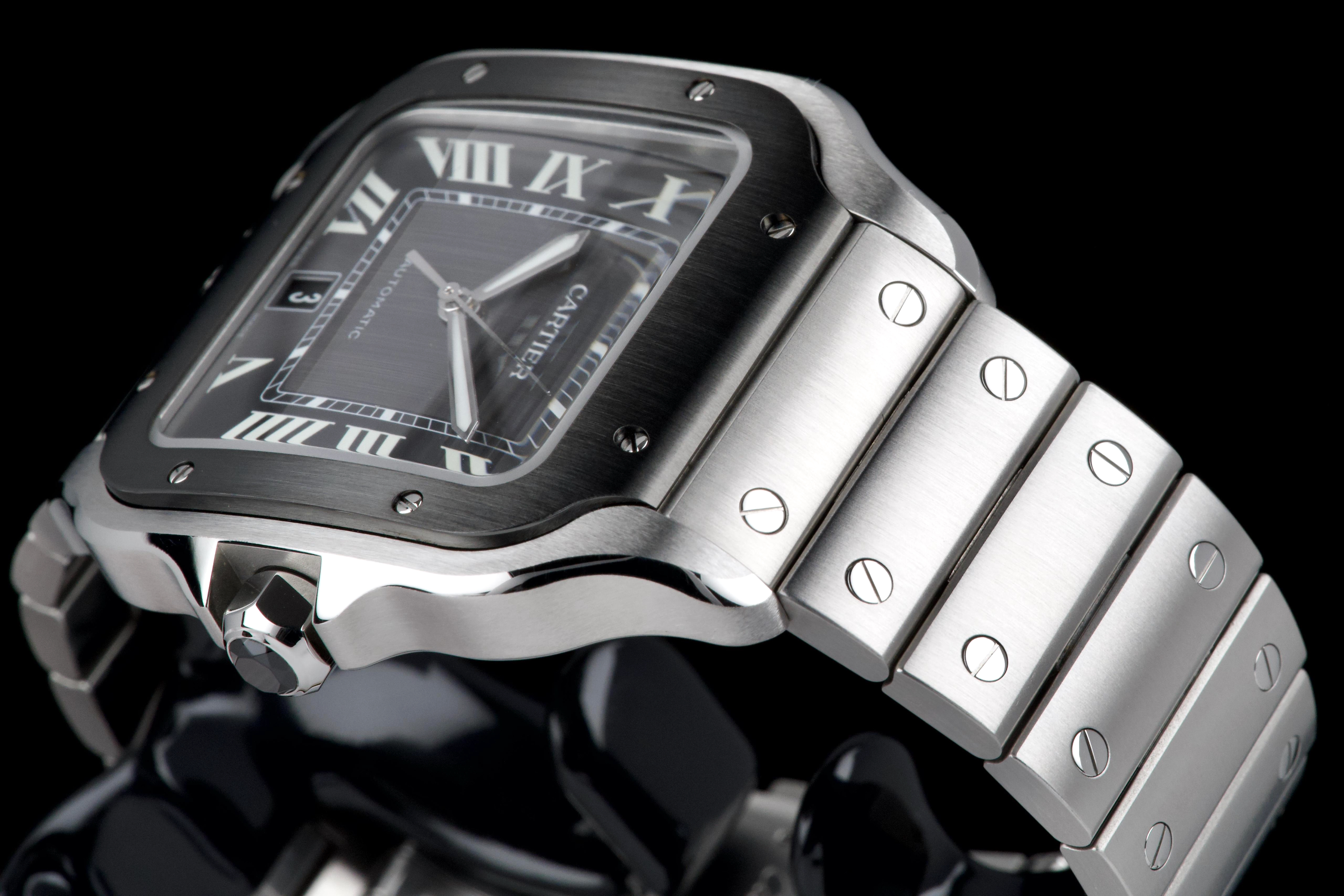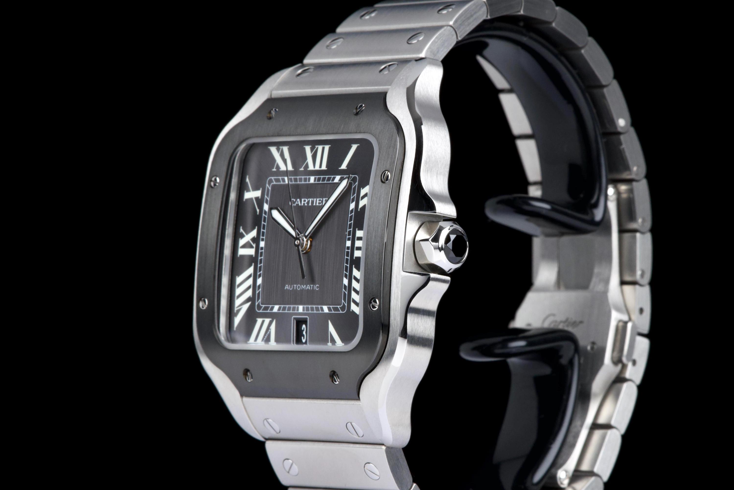 The present Cartier Santos reference WSSA0037, offered as a complete full set and dating to 2022, is an elegant and contemporary example of one of Cartier’s most iconic and historically significant designs. Presented in the Large size and powered by an automatic movement, this model combines modern versatility with the unmistakable character of the Santos line. This example comes directly from its original owner and has been gently used, remaining in very attractive overall condition. The stainless-steel case and bracelet display only light signs of wear consistent with careful use, while retaining the clean lines and refined finishing that define the model. The distinctive grey dial adds a sophisticated and modern touch to the classic Santos aesthetic, offering excellent legibility and a subtle contrast to the polished bezel and integrated bracelet. The watch benefits from Cartier’s quick-change bracelet system, enhancing everyday practicality and ease of wear. Delivered as a full set from 2022, this Santos WSSA0037 represents a compelling opportunity to acquire a modern Cartier icon with clear provenance, timeless design, and immediate wearability.